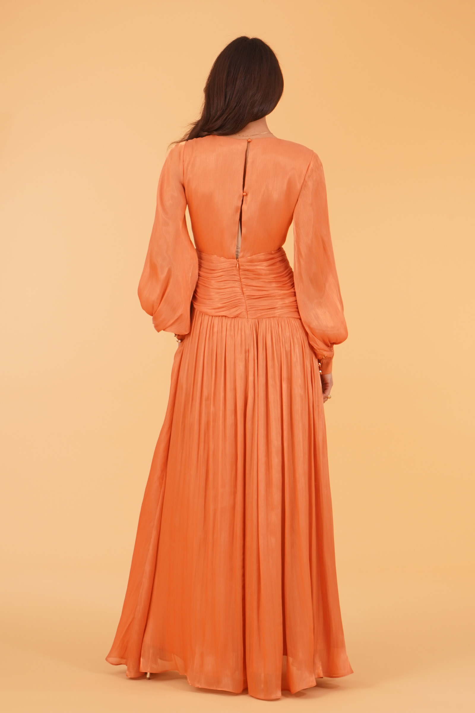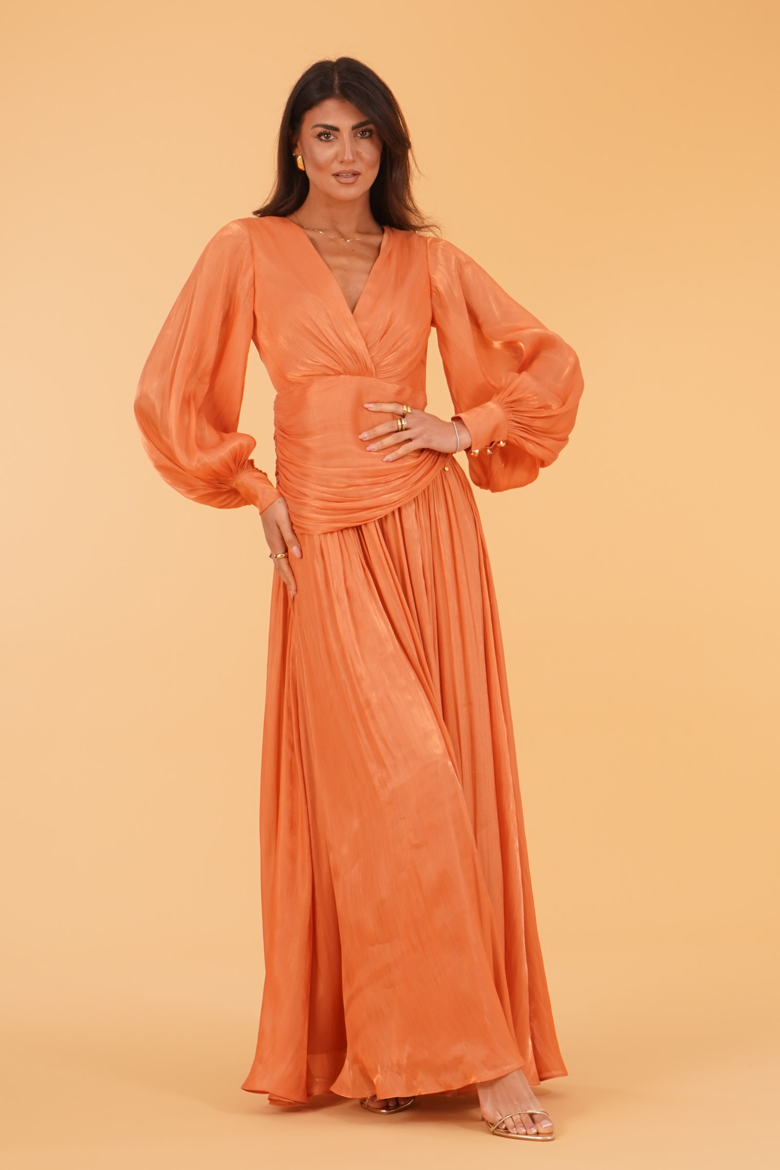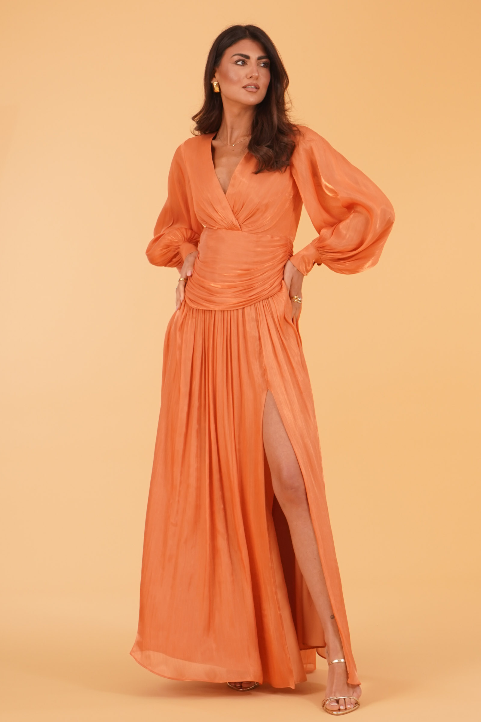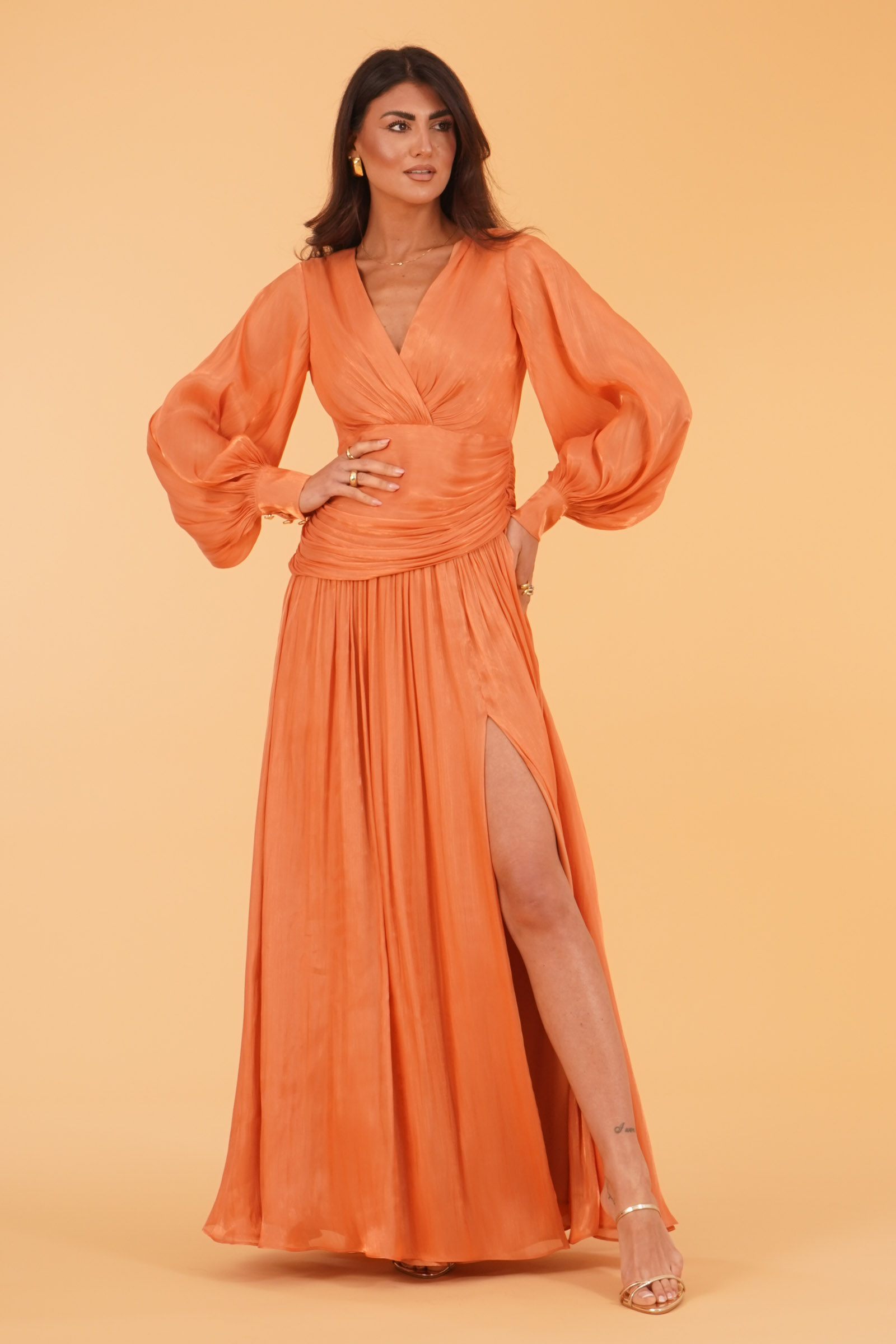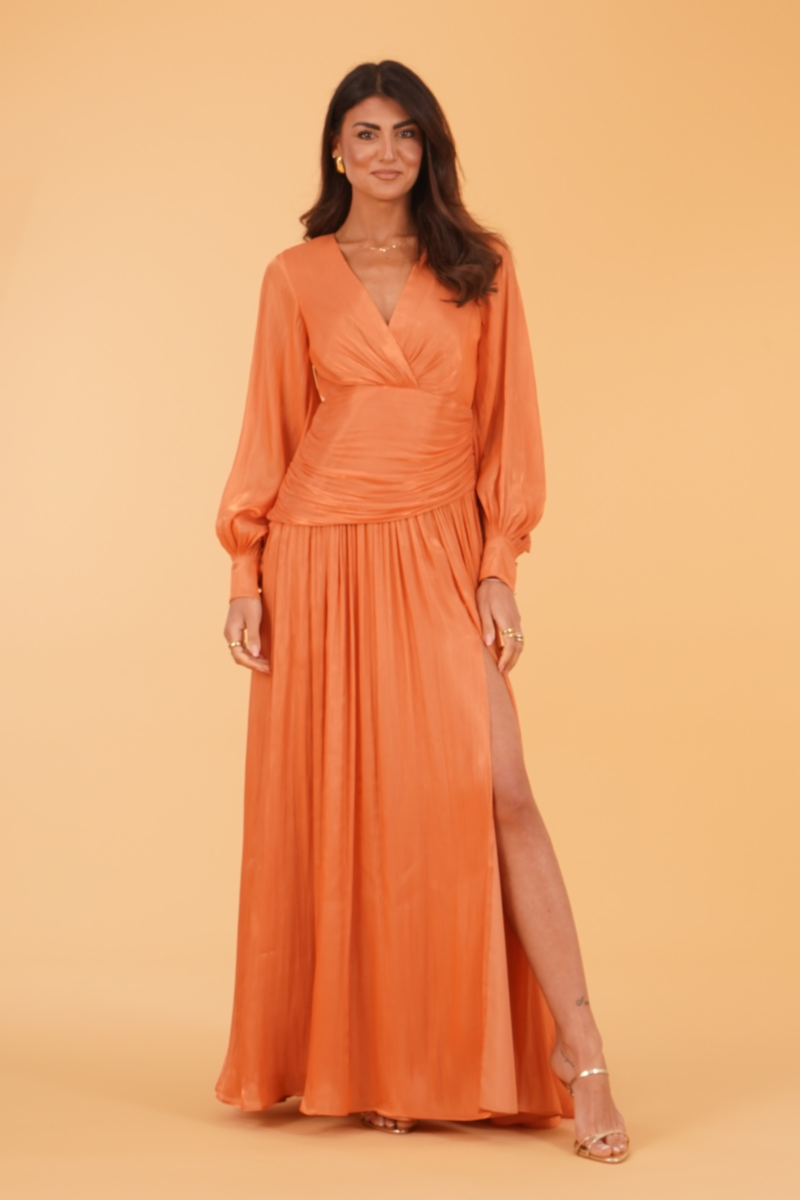 Vestibilita' regolare. Gonna vita alta con ampio spacco. Faschia morbida in vita. Scollo a punta. Maniche a sbuffo con dettaglio gioiello sui polsi. Chiusura con zip piu' bottoni. Altezza modella 1,80. Indossa la taglia 40. Composizione: 100% Poliestere. Brand: Allure Evening