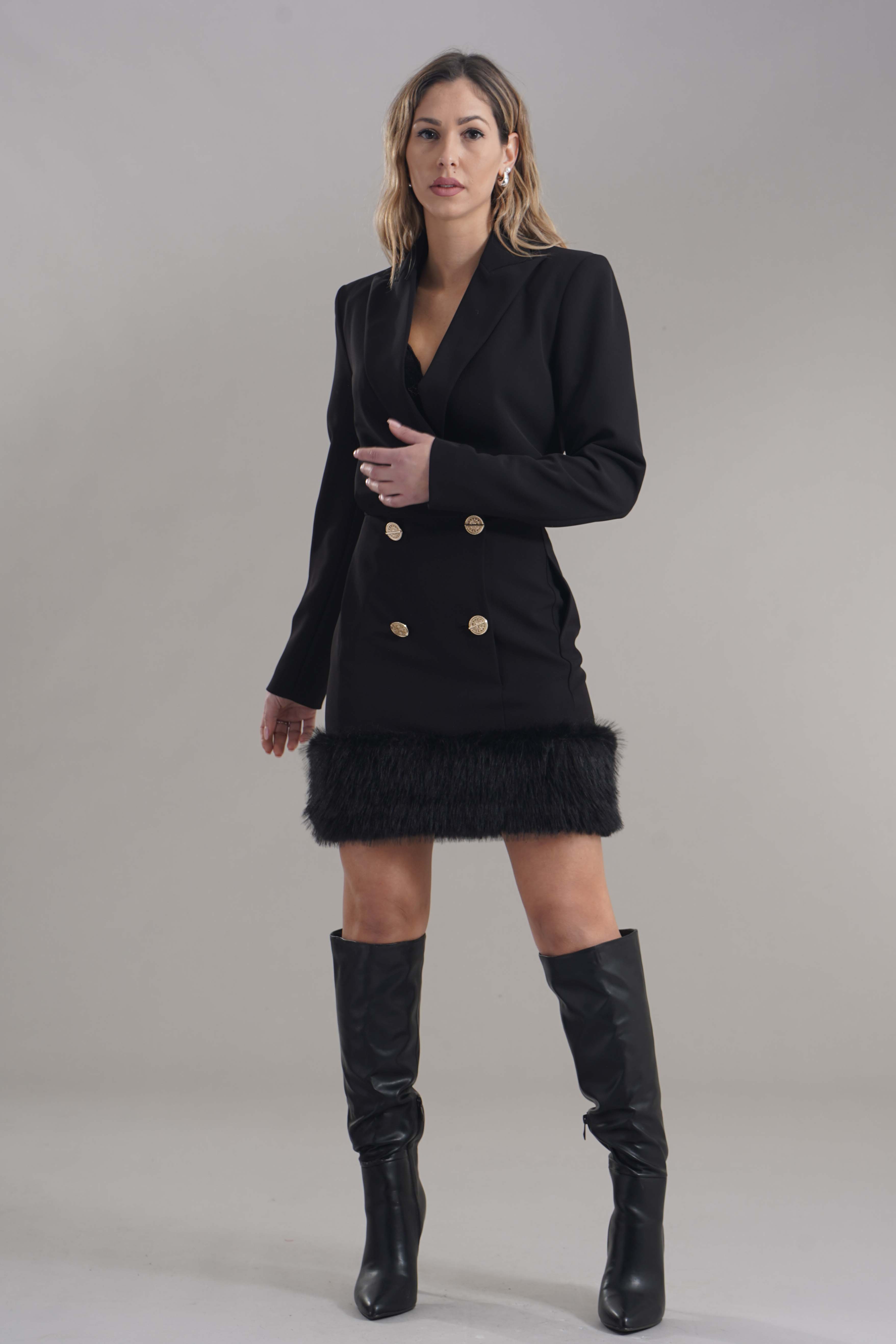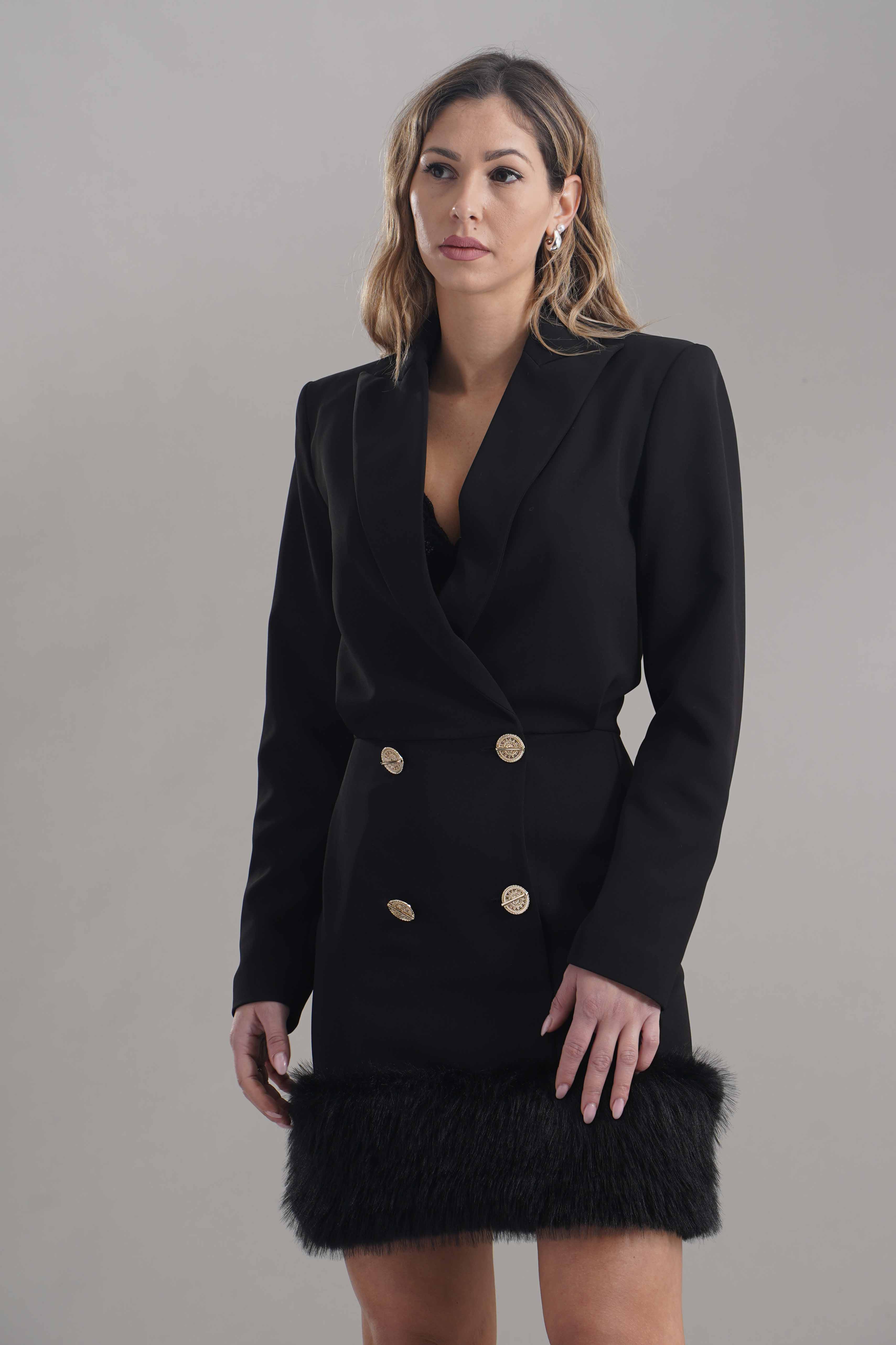 Vestibilita' regolare. Chiusura doppio petto con bottoni colr oro. Dettaglio di ecopelliccia sul fondo. Tasche a filo. Altezza modella 1,78. Nella foto indossa la taglia 40. Composizione: 95% Poliammide, 5% Elastane. Brand: Babylon