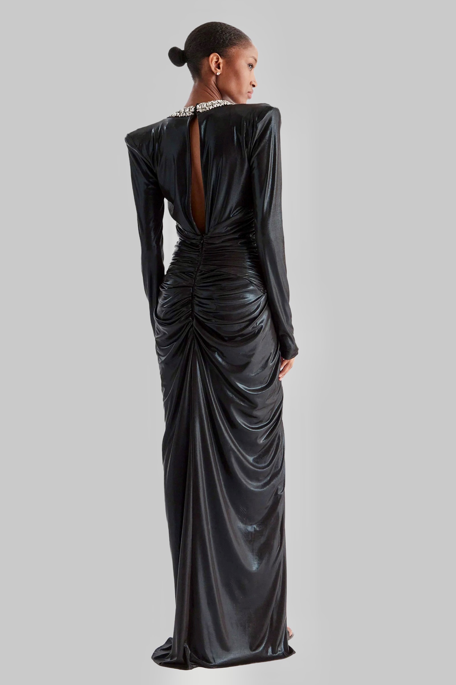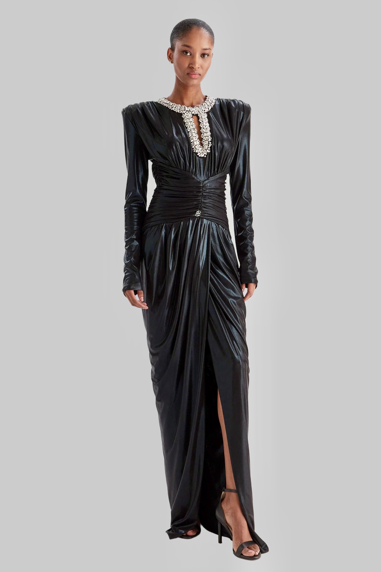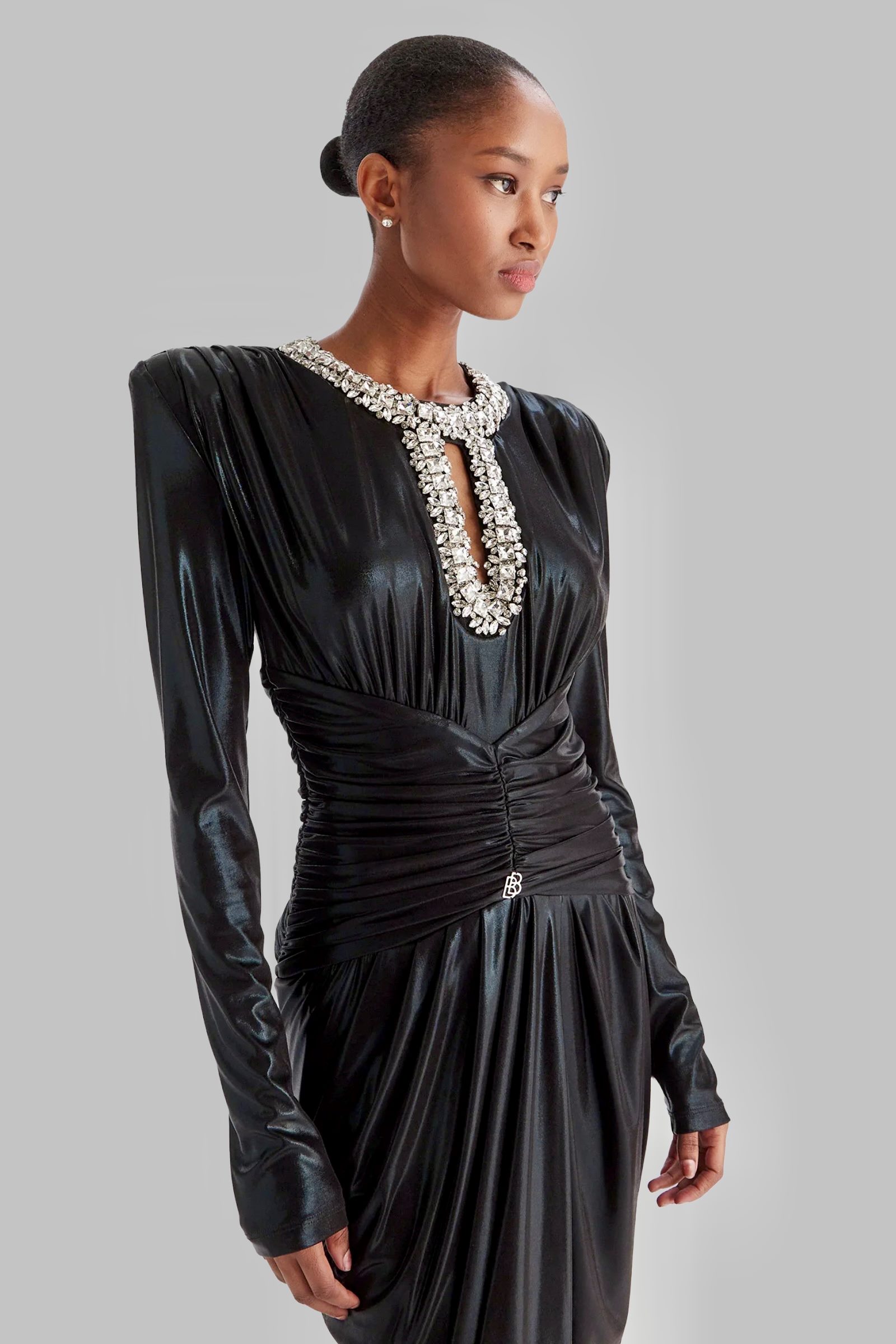 Vestibilita' regolare. Scollo con apertura piu dettaglio di strass applicati. Spalline strutturate. Ampio spacco anteriore. Dettaglio di drappeggio sul davanti. Altezza modella 1,79. Nella foto indossa la taglia 42. Composizione: 96% Poliammide, 4% Elastane. Brand: Babylon