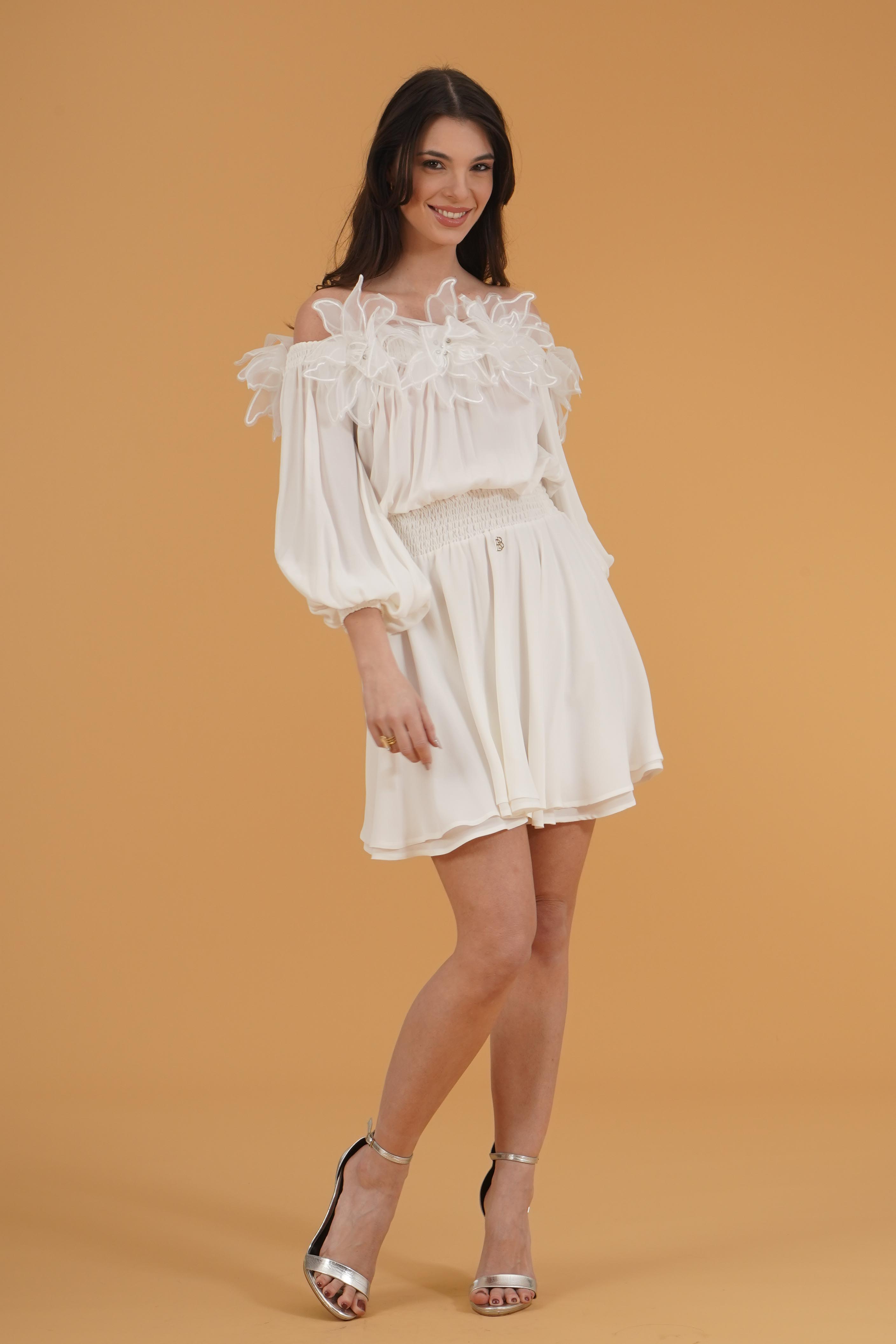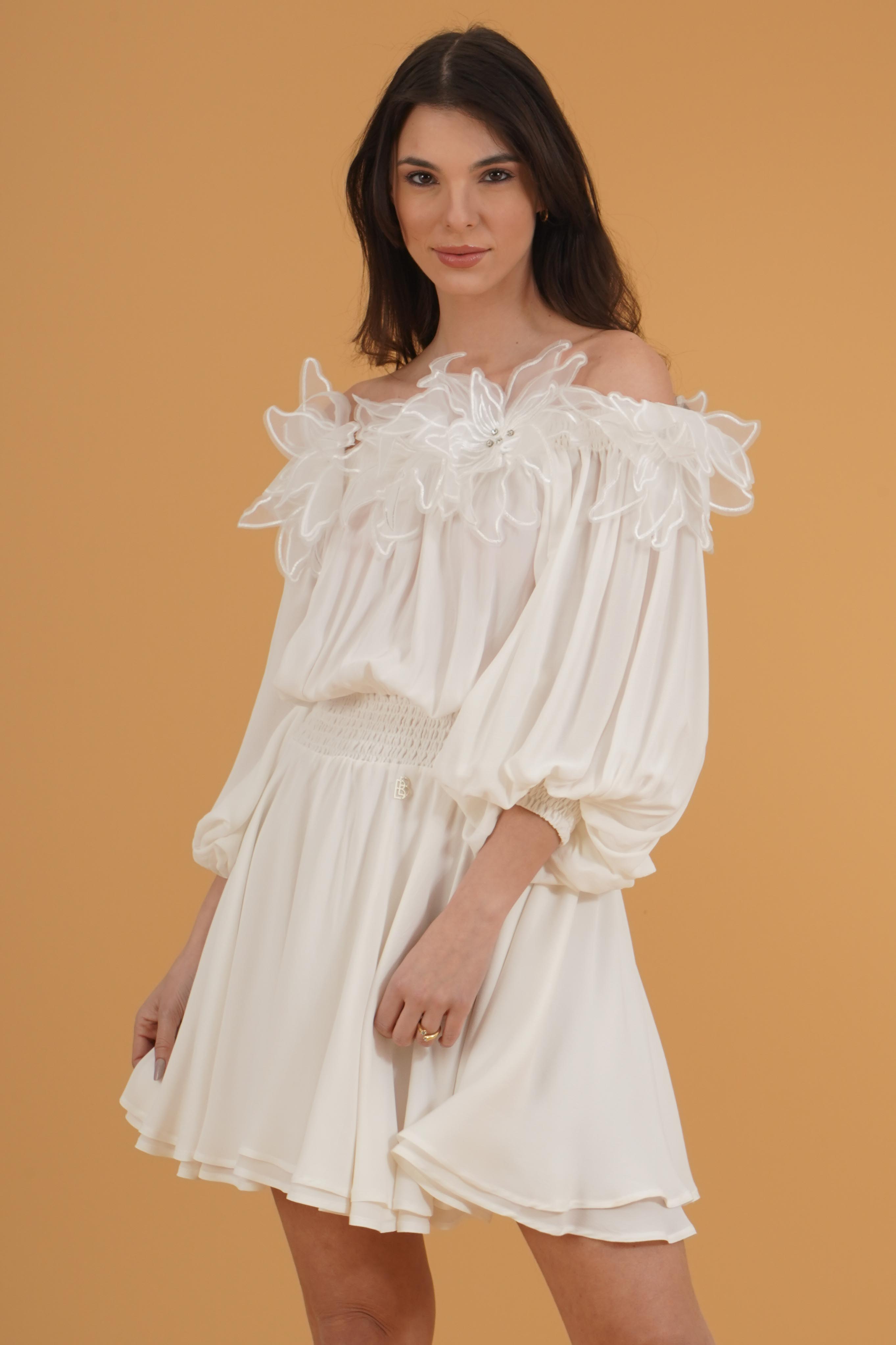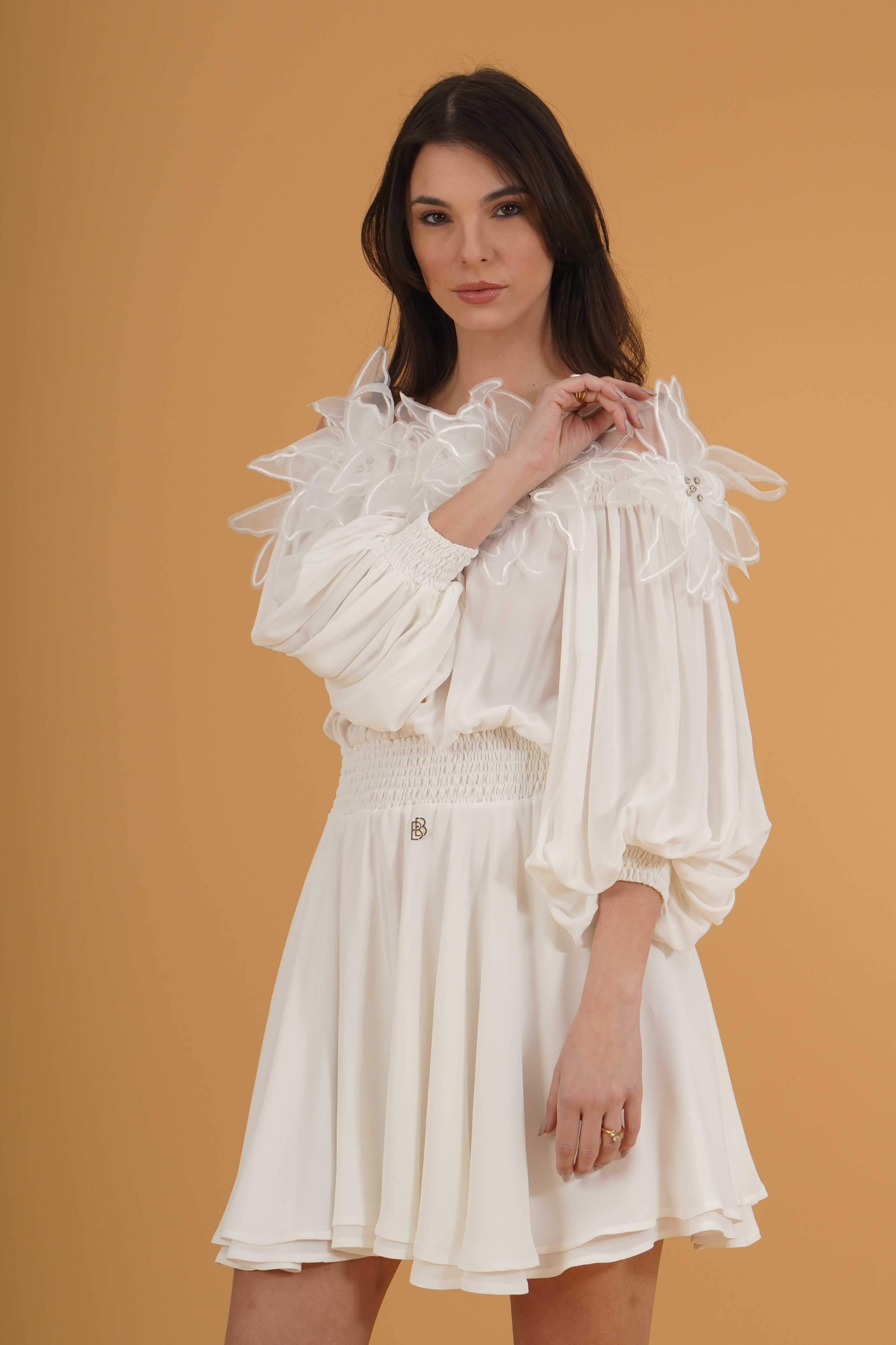 Vestibilita' regolare. Scollo a barca. Maniche a sbuffo con polsino elastico. Elastico in vita. Dettaglio di fiori cuciti con strass. Altezza modella 1,78. Nella foto indossa la taglia 40. Composizione: 100% Viscosa. Brand: Babylon