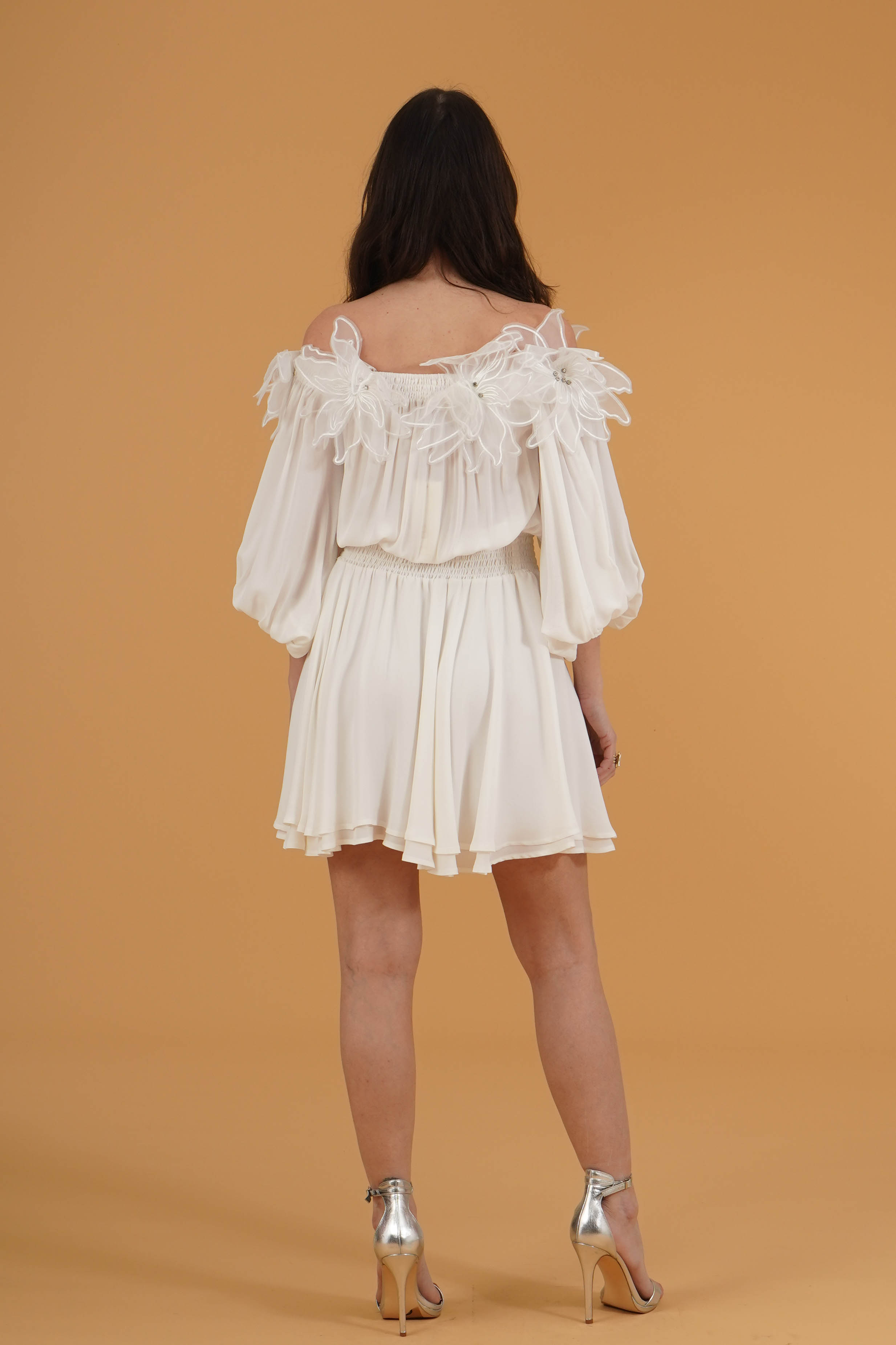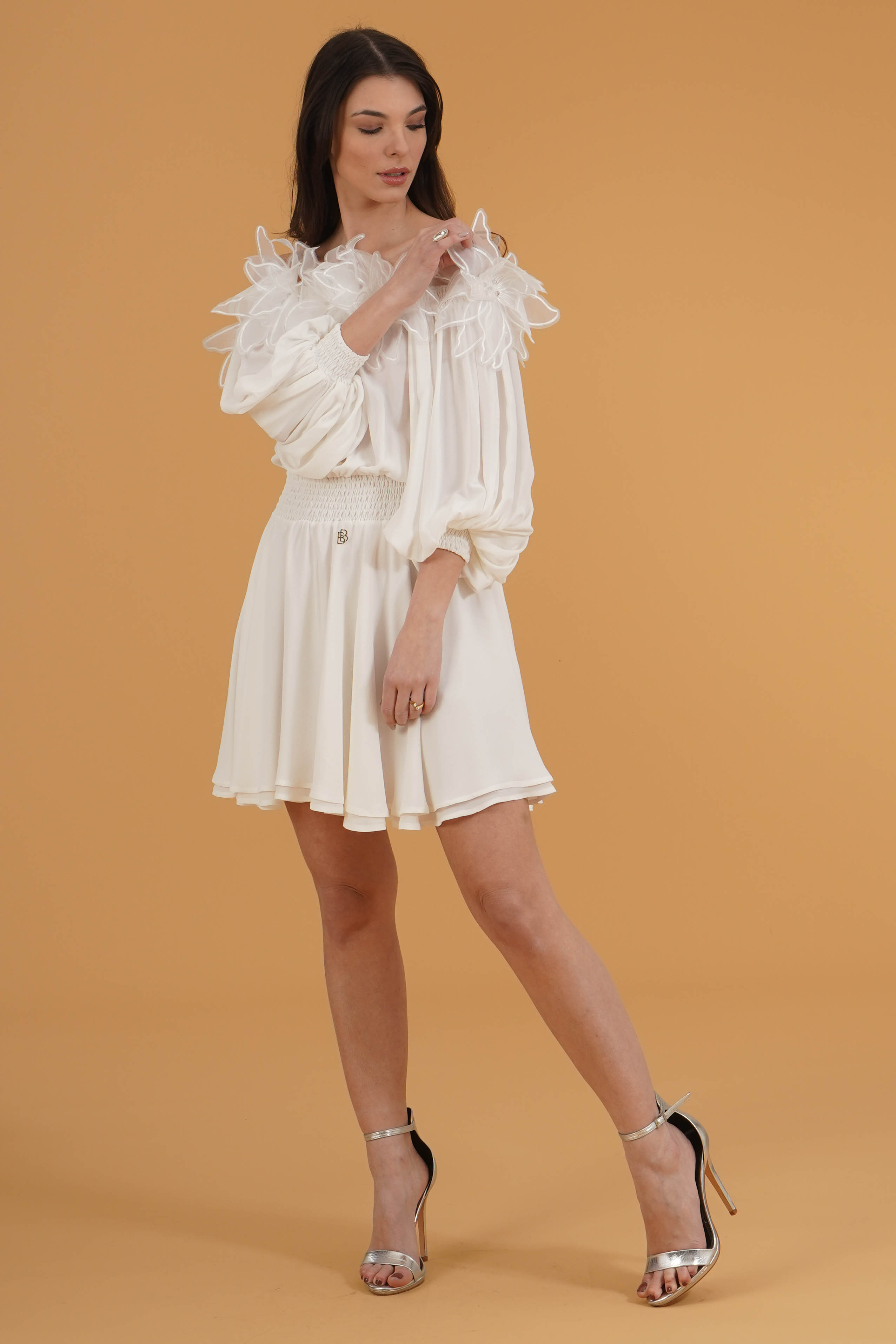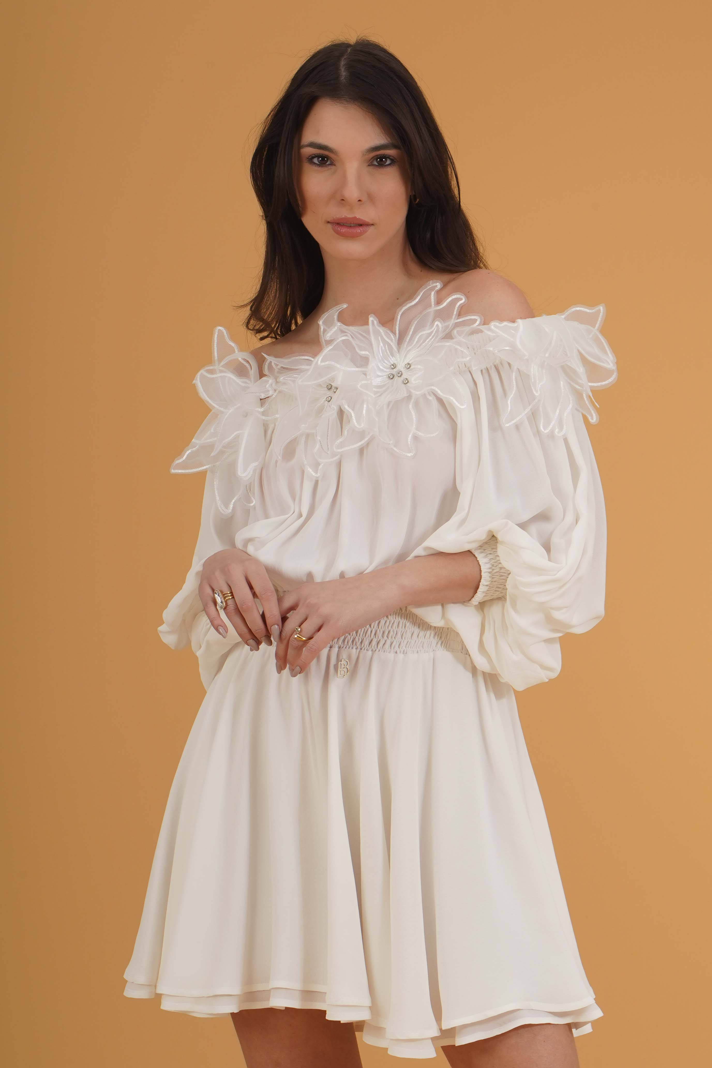 Vestibilita' regolare. Scollo a barca. Maniche a sbuffo con polsino elastico. Elastico in vita. Dettaglio di fiori cuciti con strass. Altezza modella 1,78. Nella foto indossa la taglia 40. Composizione: 100% Viscosa. Brand: Babylon