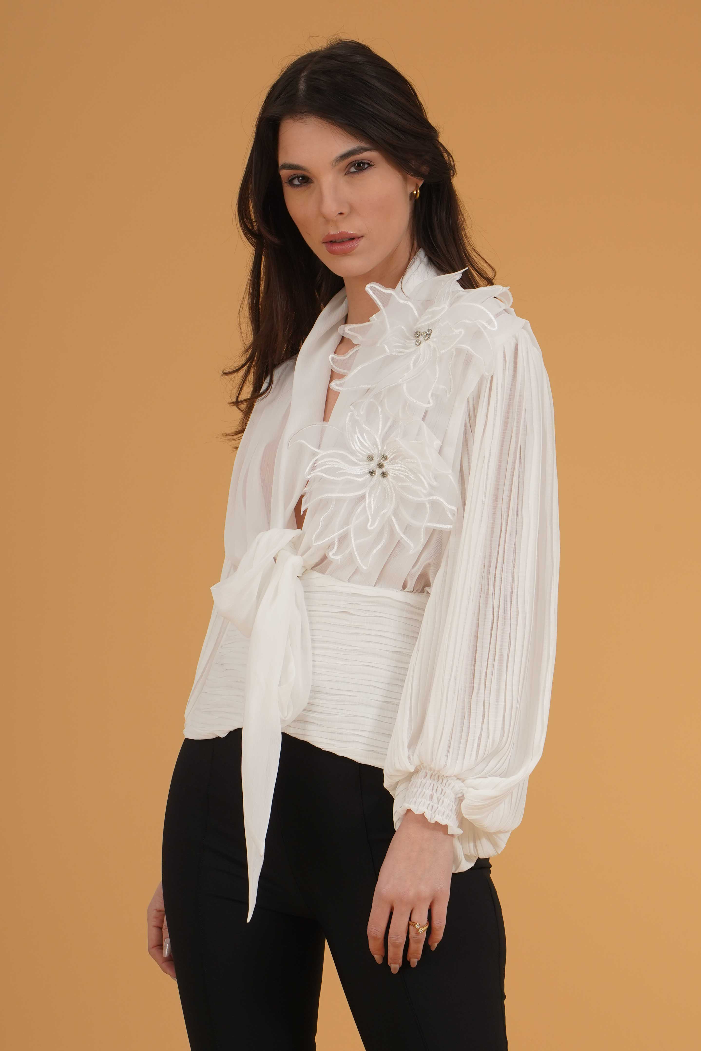 Vestibilita' regolare. Chiusura con ciappe e fusciacca. Maniche tre quarti plissettate con elastico sul polso. Dettaglio di fiori con strass applicati. Altezza modella 1,78. Nella foto indossa la taglia 40. Composizione: 100% Poliammide. Brand: Babylon