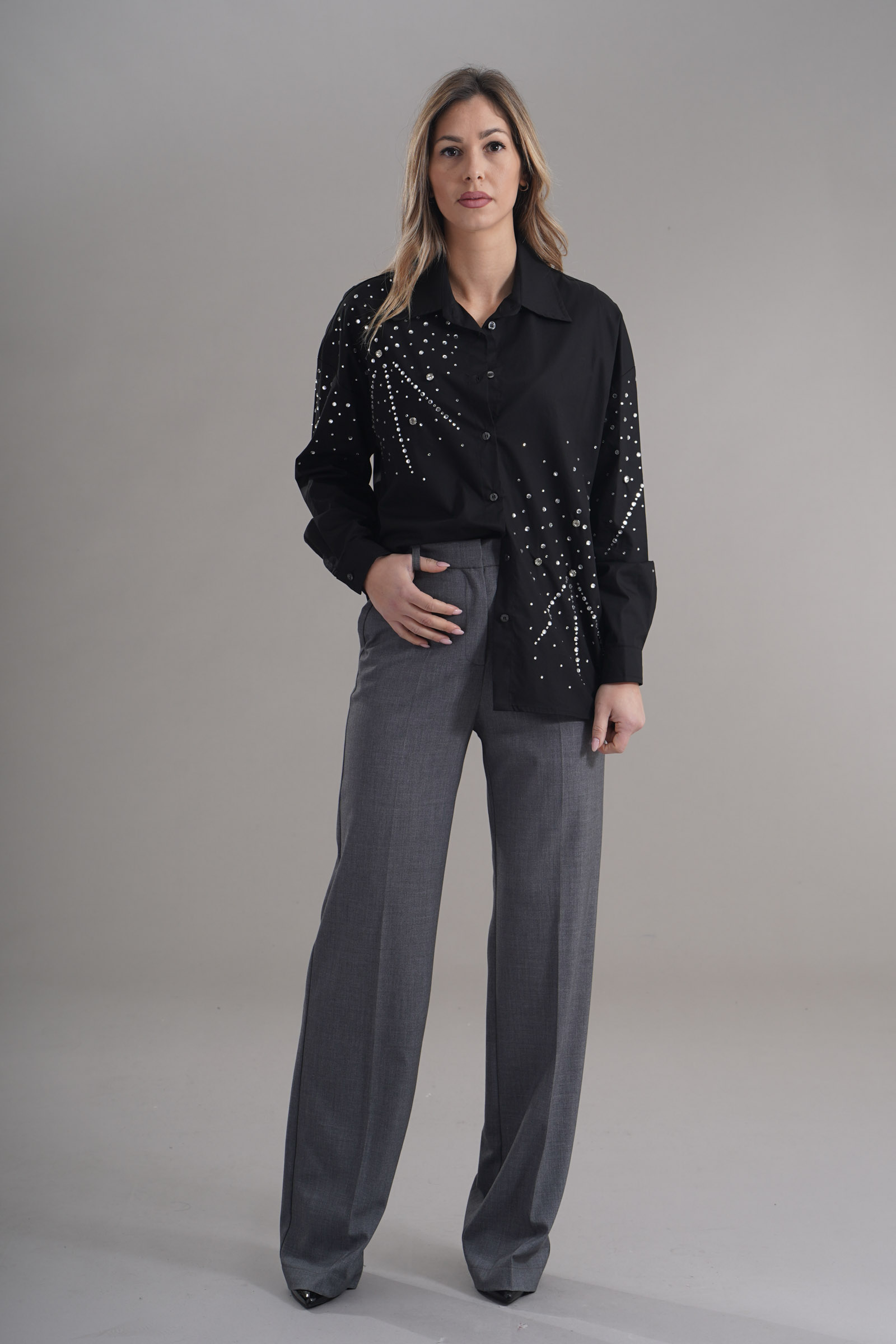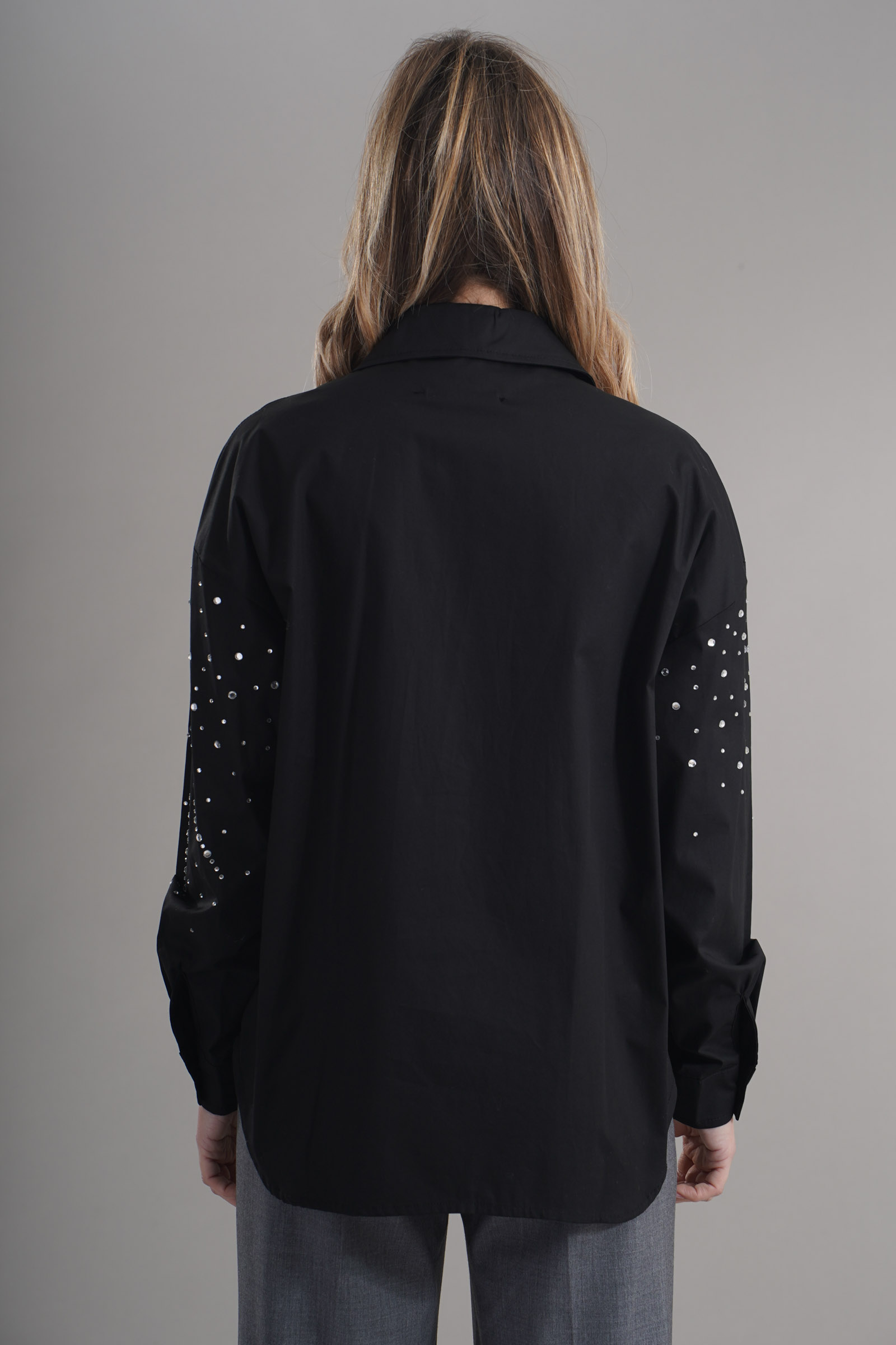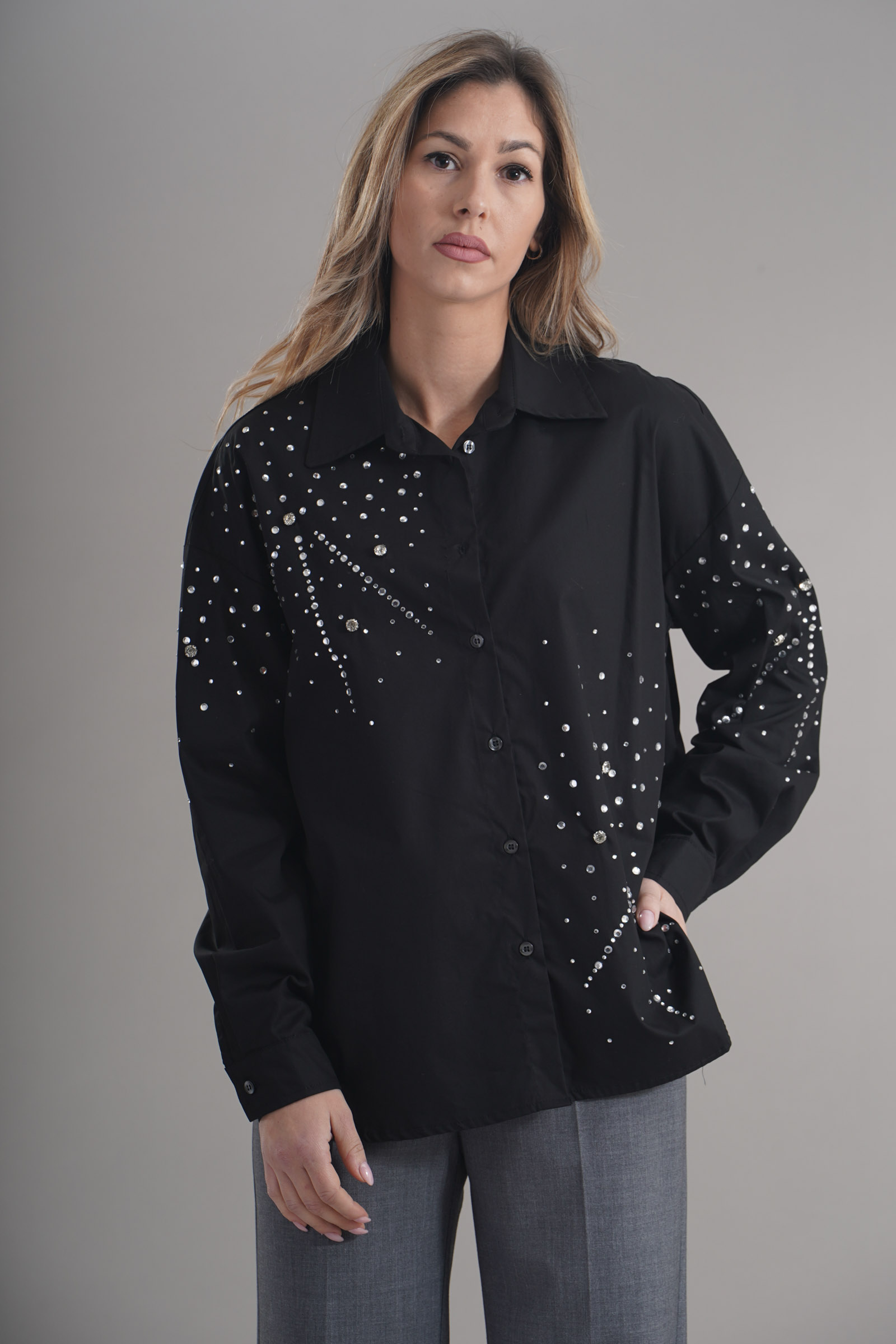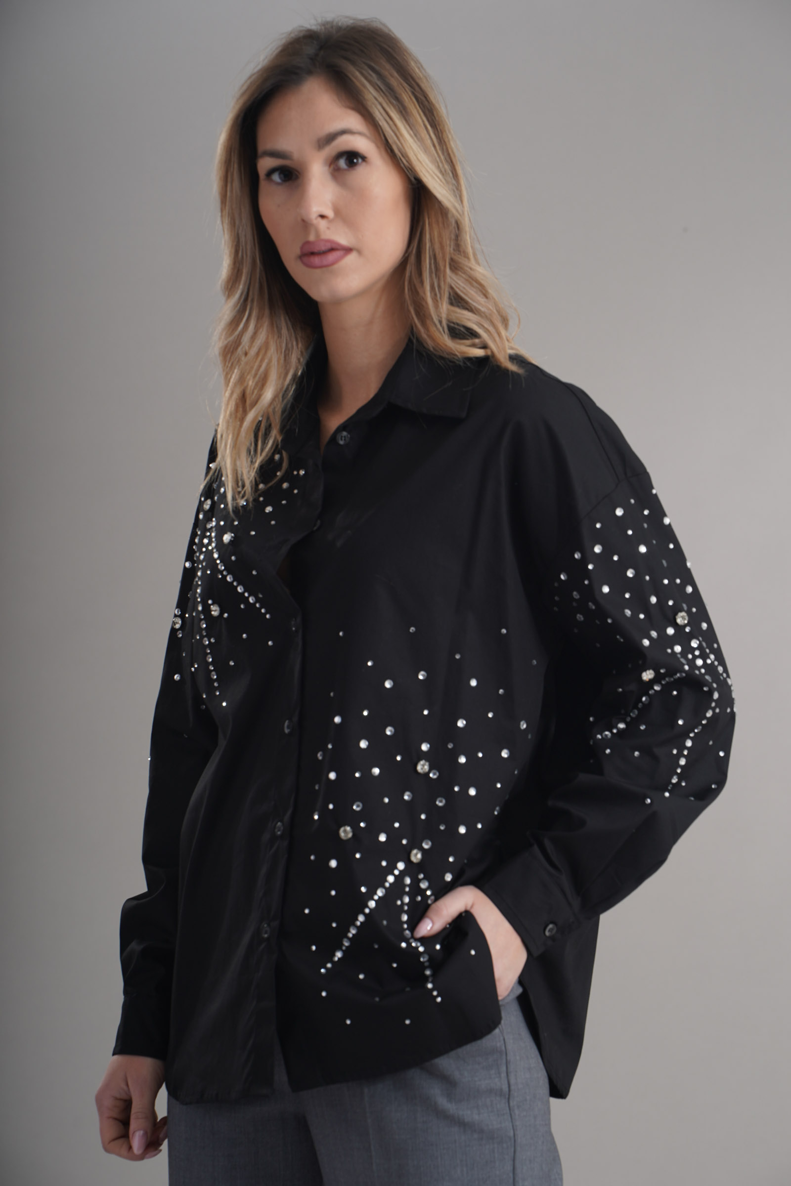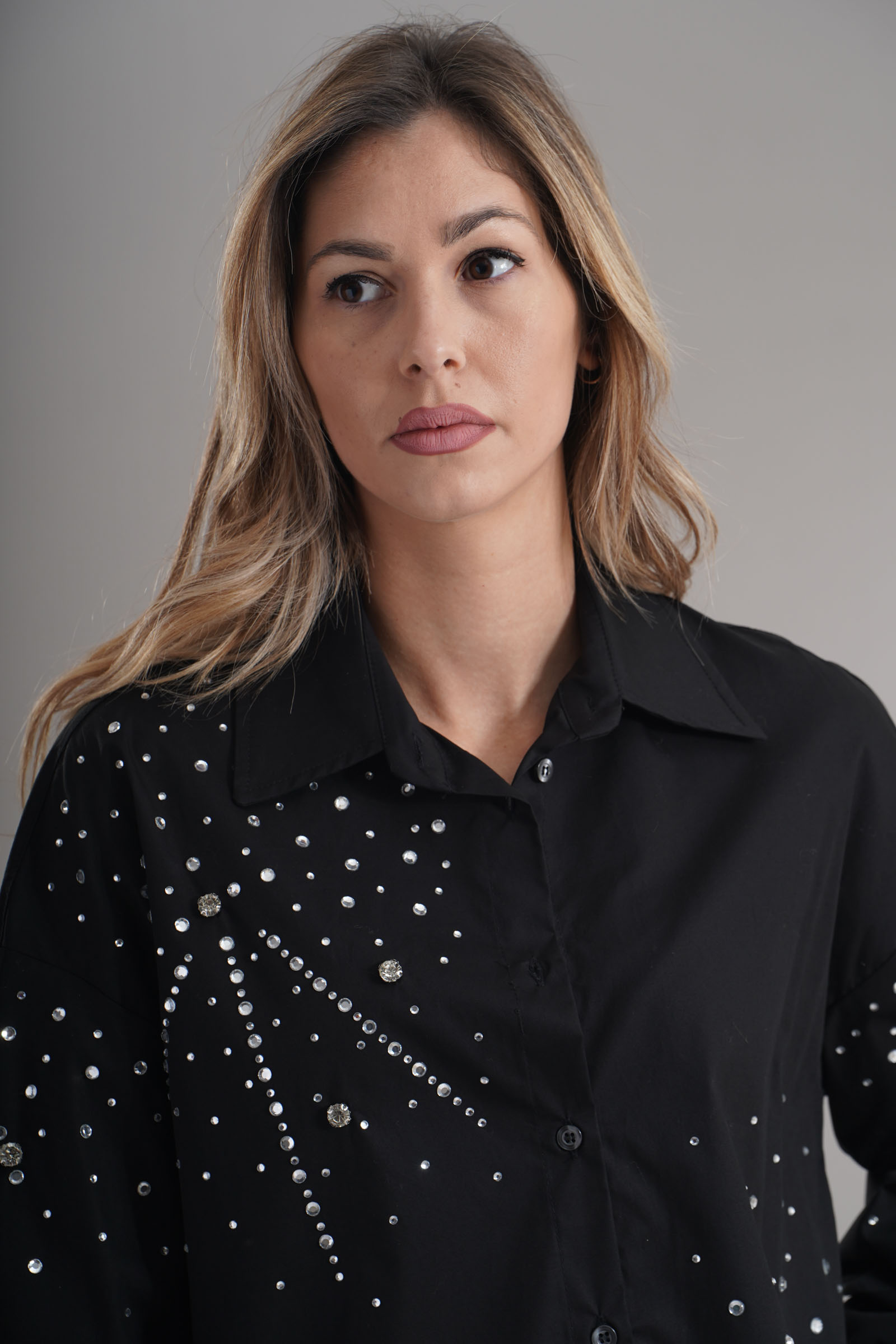 Vestibilita' comoda. Chiusura con bottoni. Maniche ampie. Dettaglio di strass applicati. Altezza modella 1,79. Nella foto indossa la taglia M. Composizione: 100% Cotone. Brand: Brand Unique