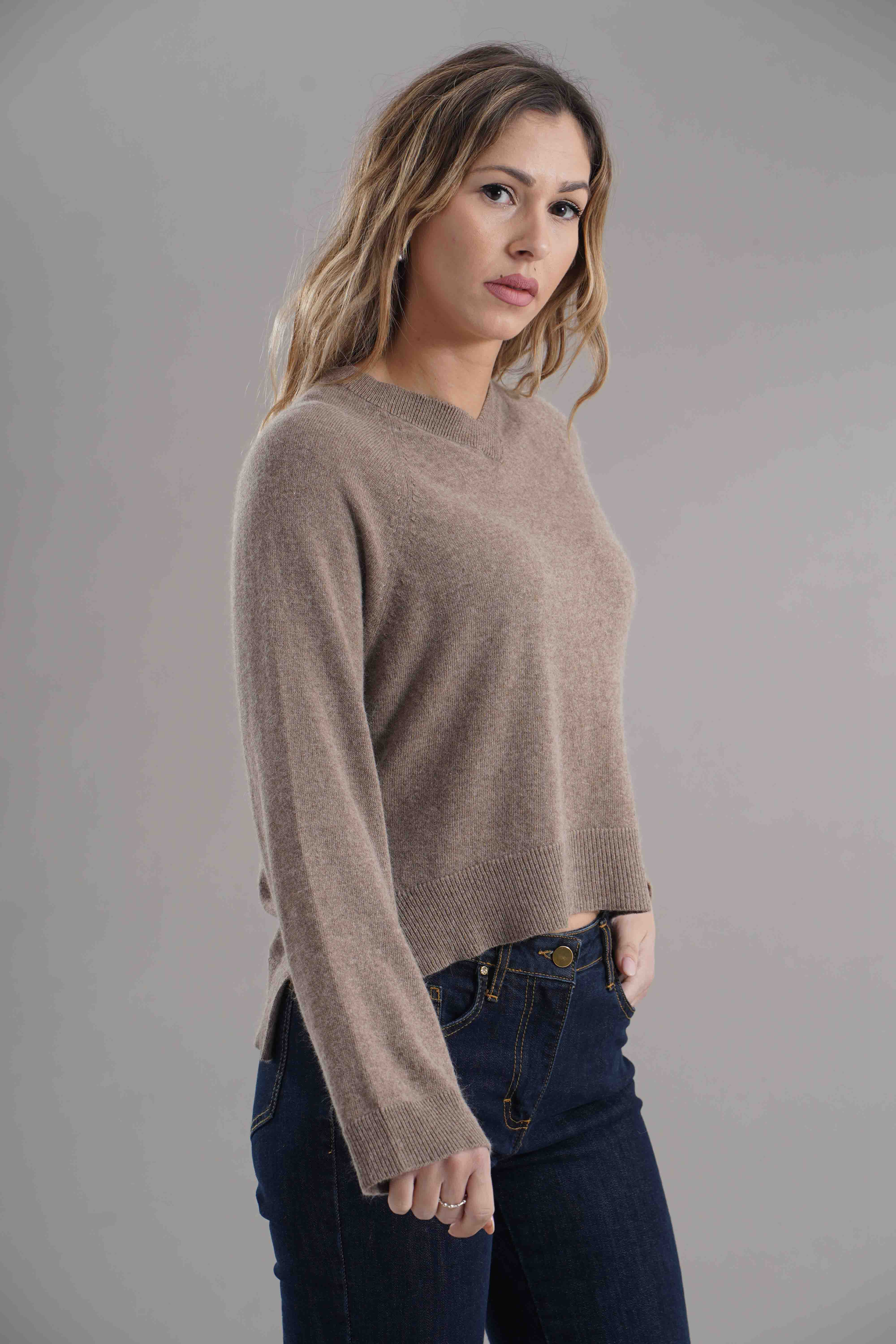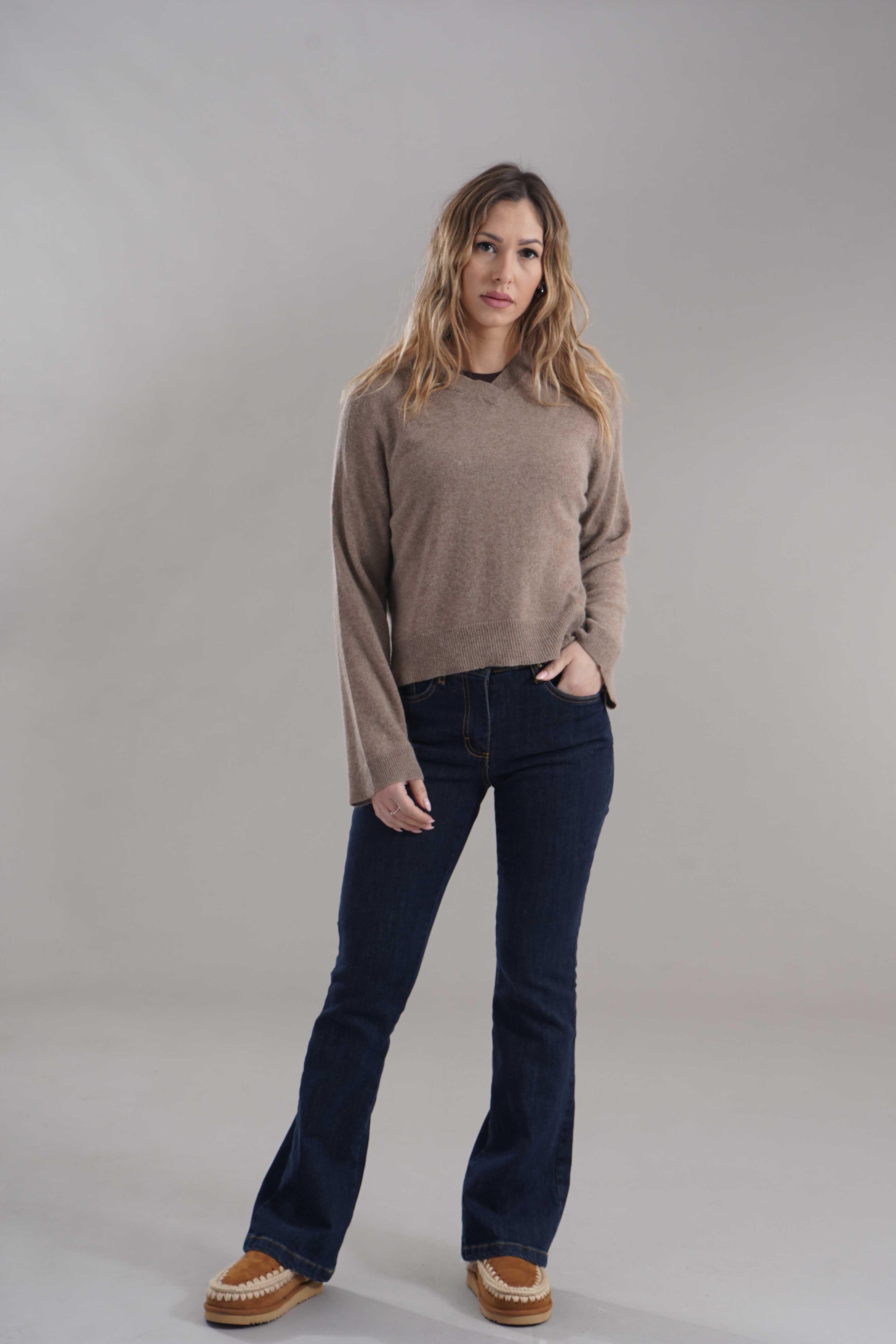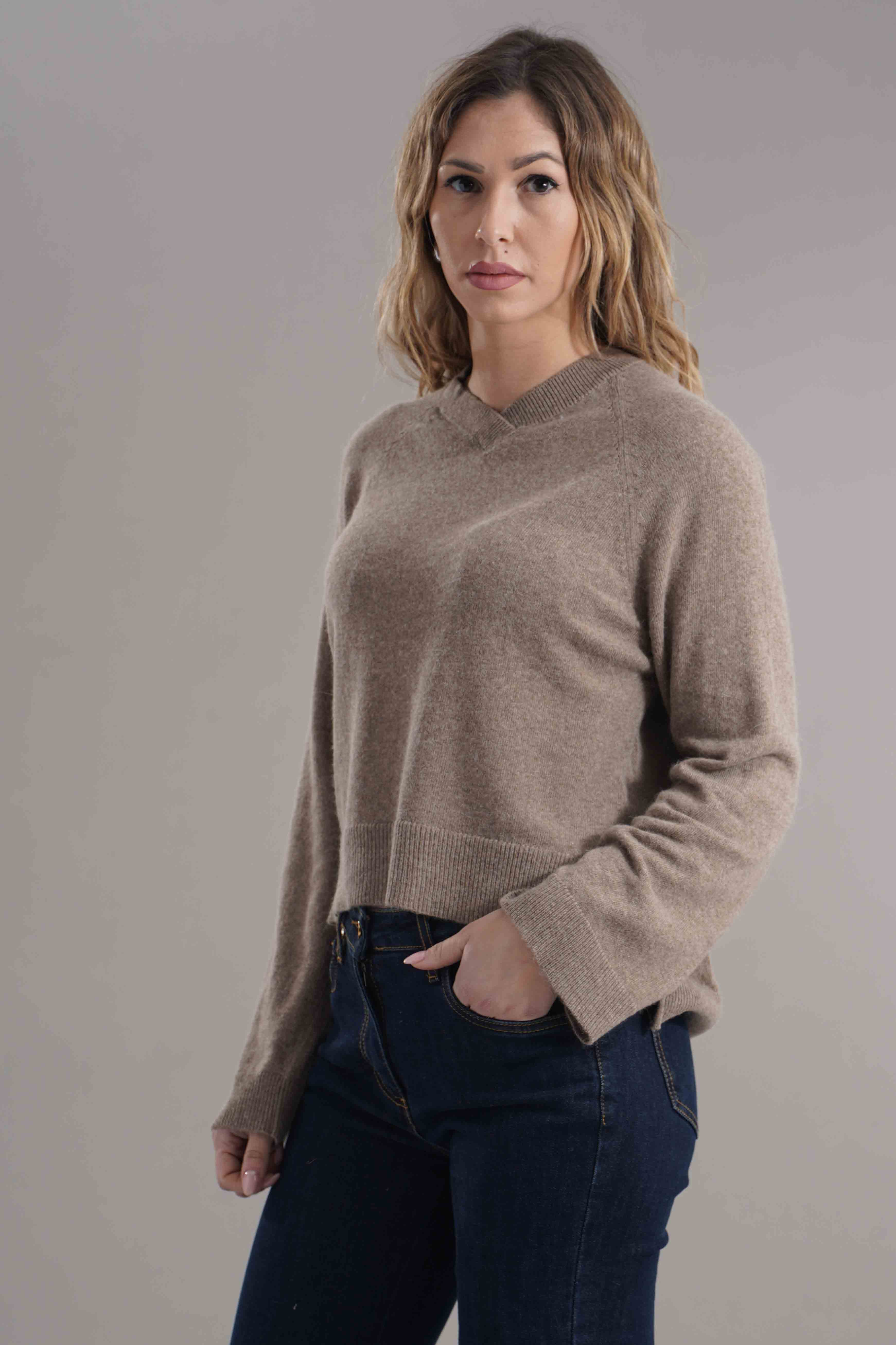 Vestibilita' regolare. Scollo a V. Spacchetti laterali. Altezza modella 1,75. Nella foto indossa la taglia S. Composizione: 35% Poliammide, 30% Viscosa, 30% Lana, 5% Cashmere . Brand: Brand Unique