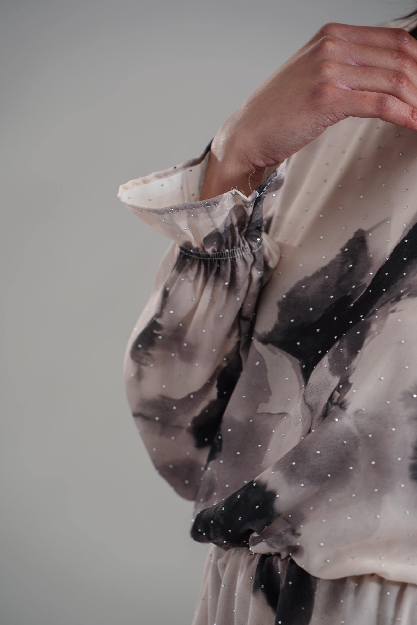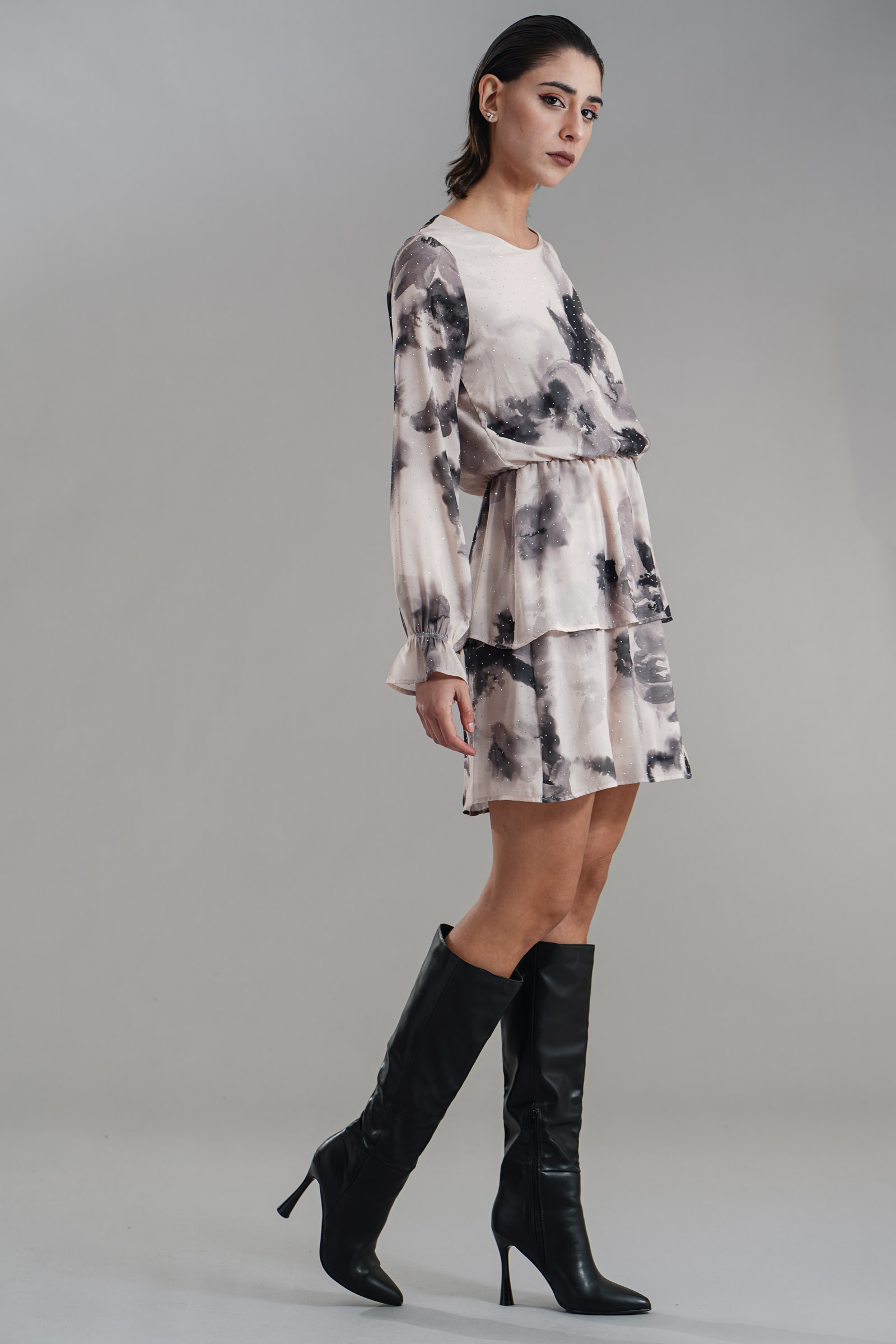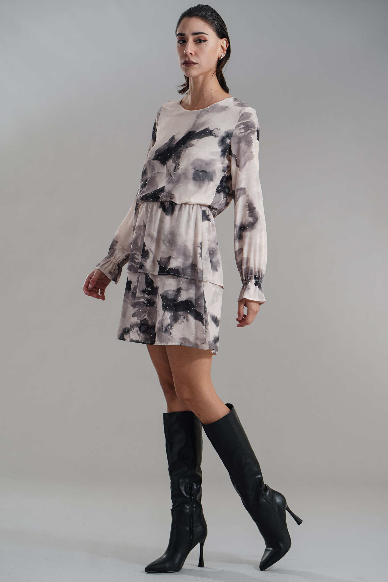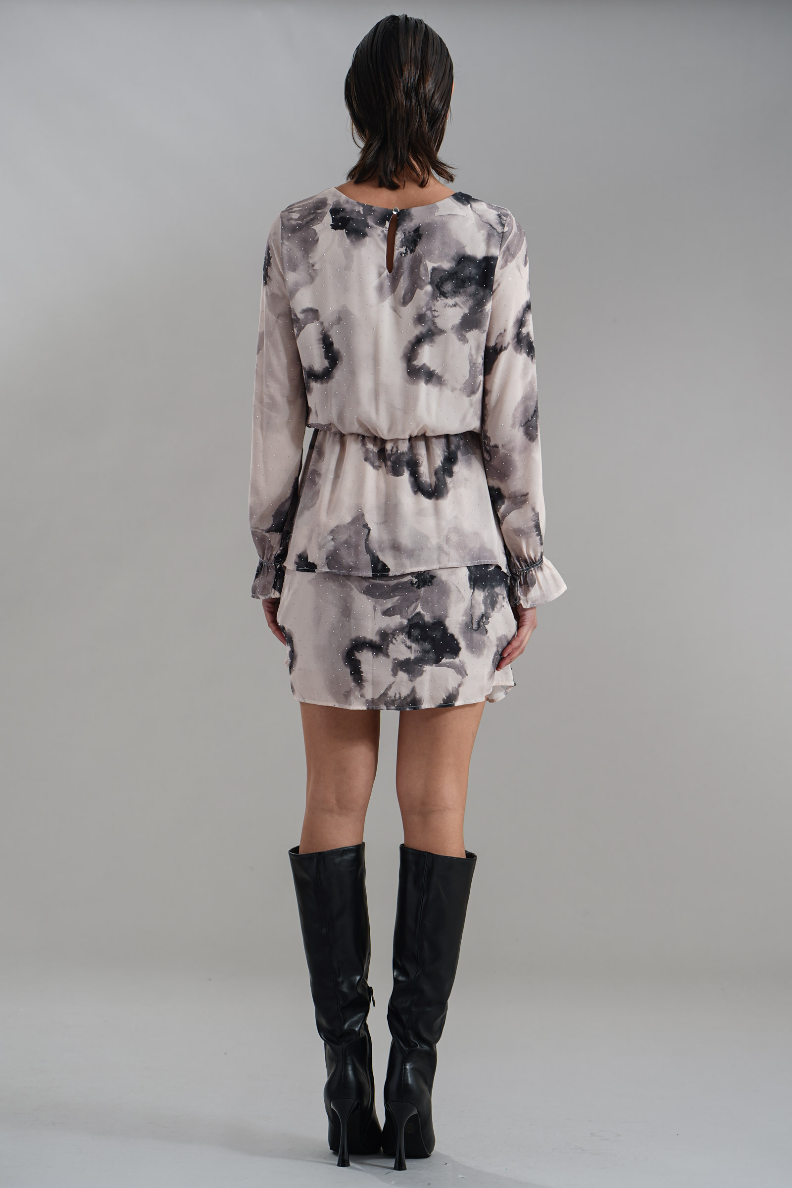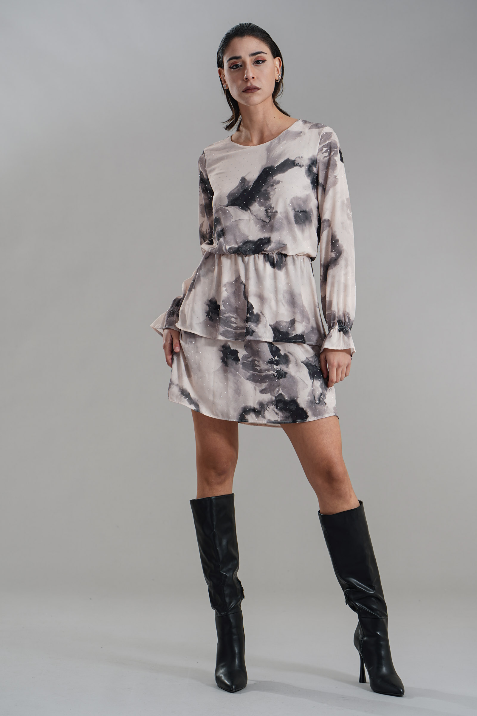 Vestibilita' regolare. Chiusura con bottone posteriore. Elastico in vita. Gonna con balze. Elastico sui polsini. Altezza modella 1,82. Nella foto indossa la taglia S. Composizione: 100% Poliestere. Brand: Celye
