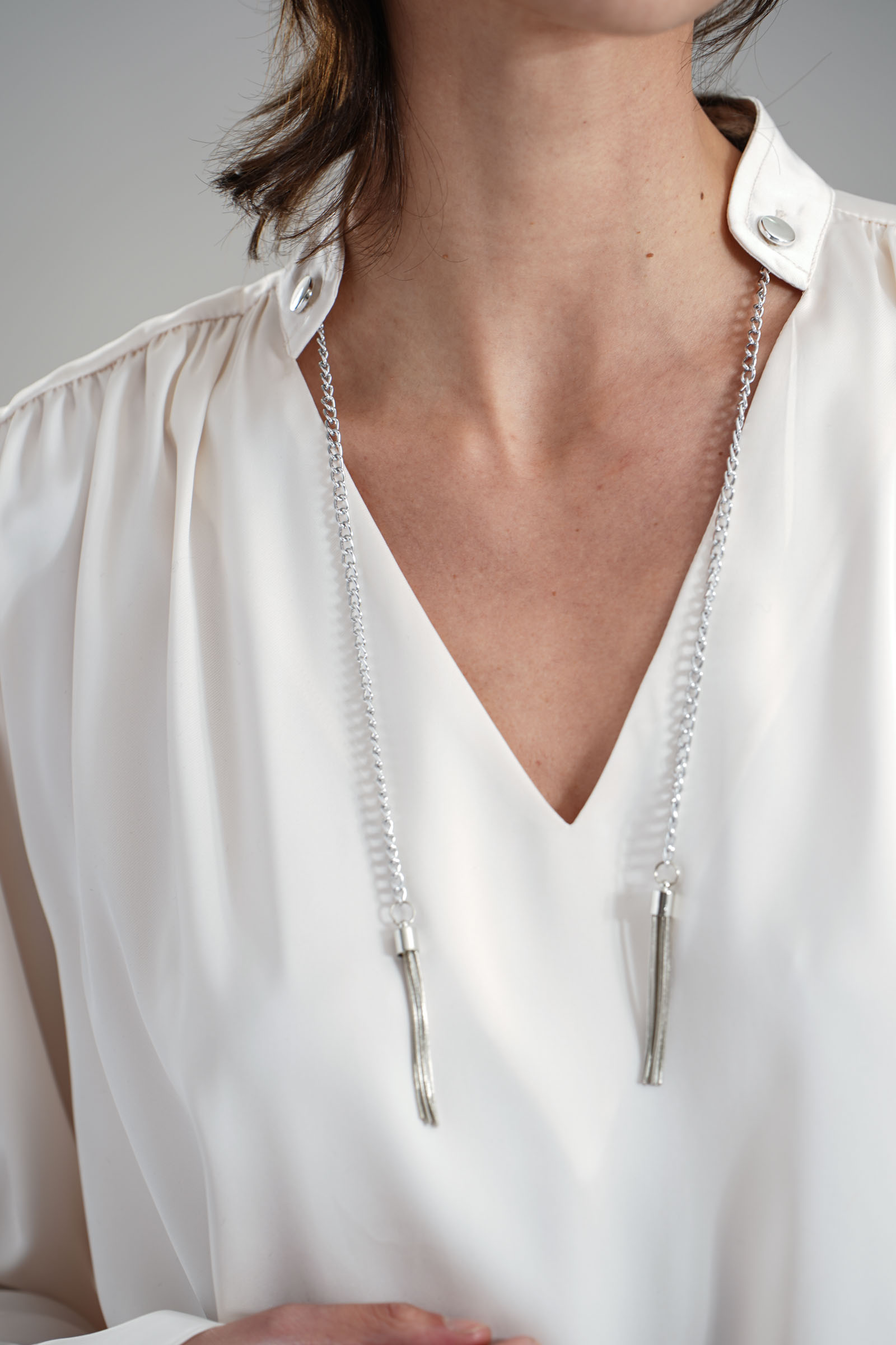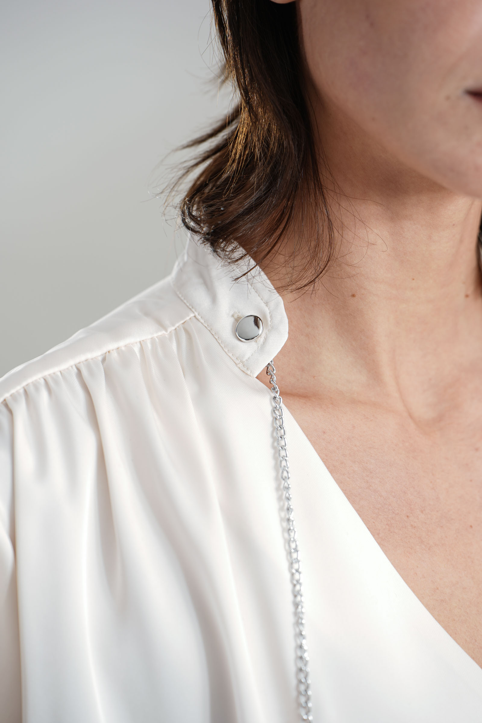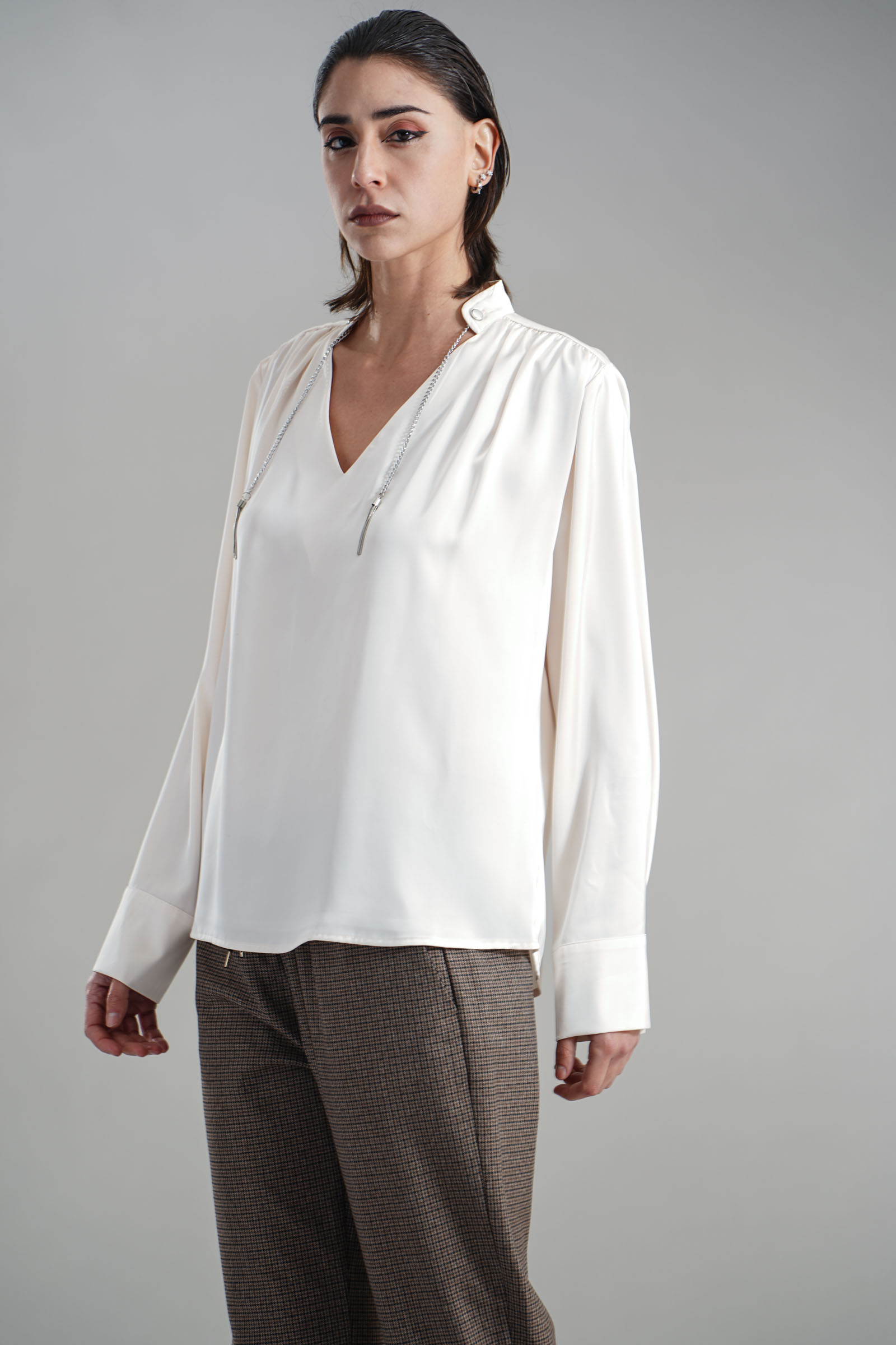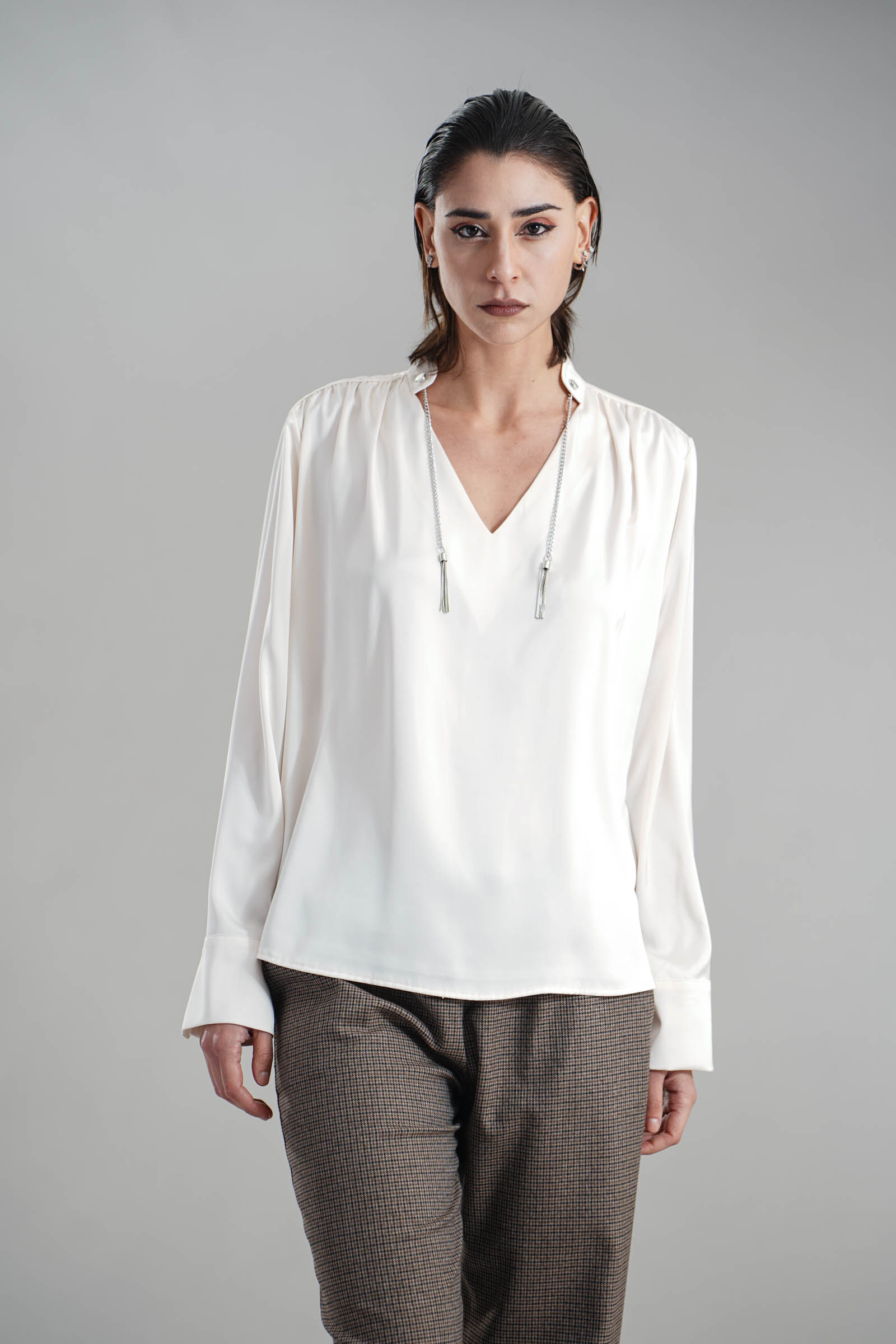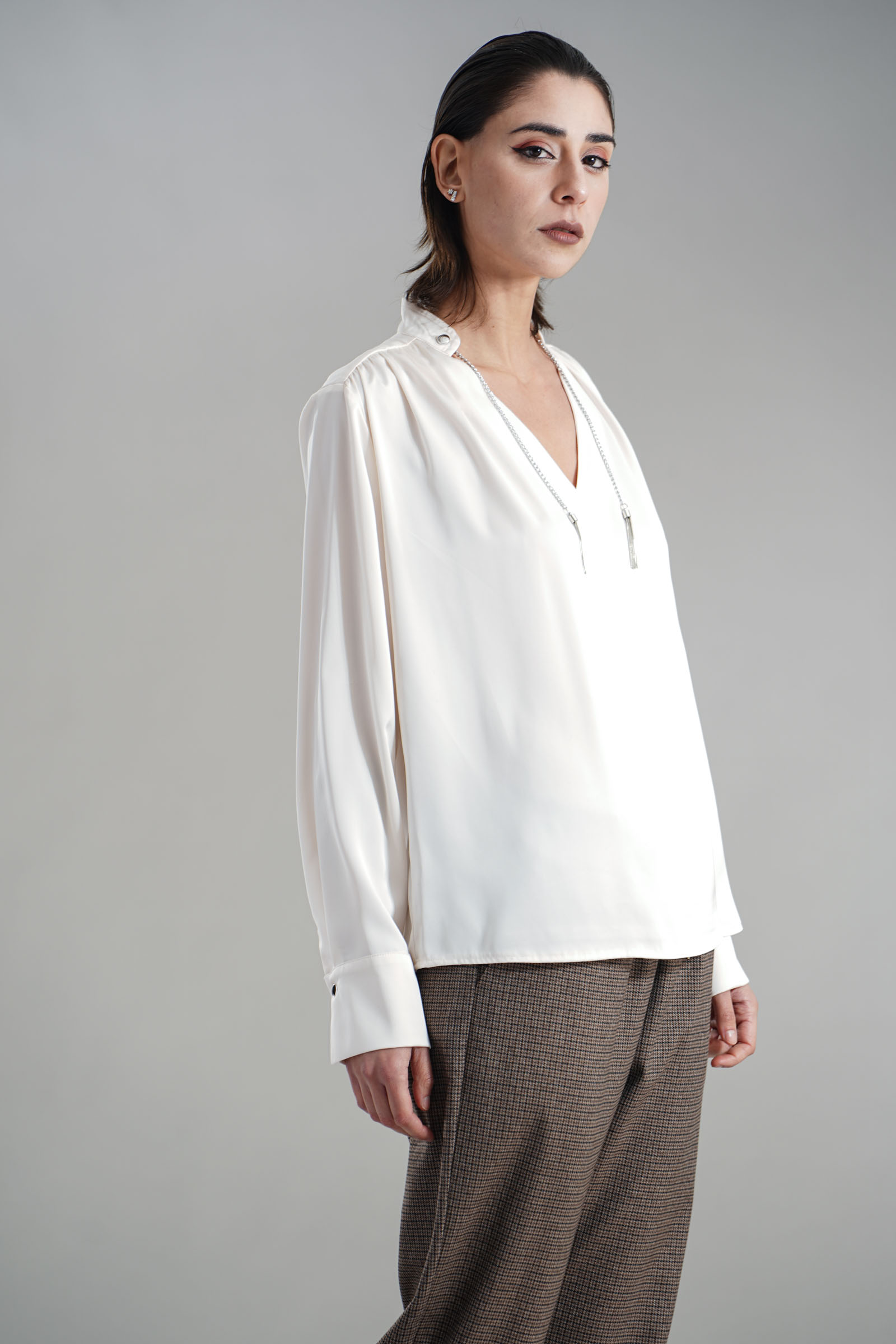 Vestibilita' comoda. Scollo a V con dettaglio di catenine rimovibili. Manica ampia. Altezza modella 1,82. Nella foto indossa la taglia S. Composizione: 100% Poliestere. Brand: Celye