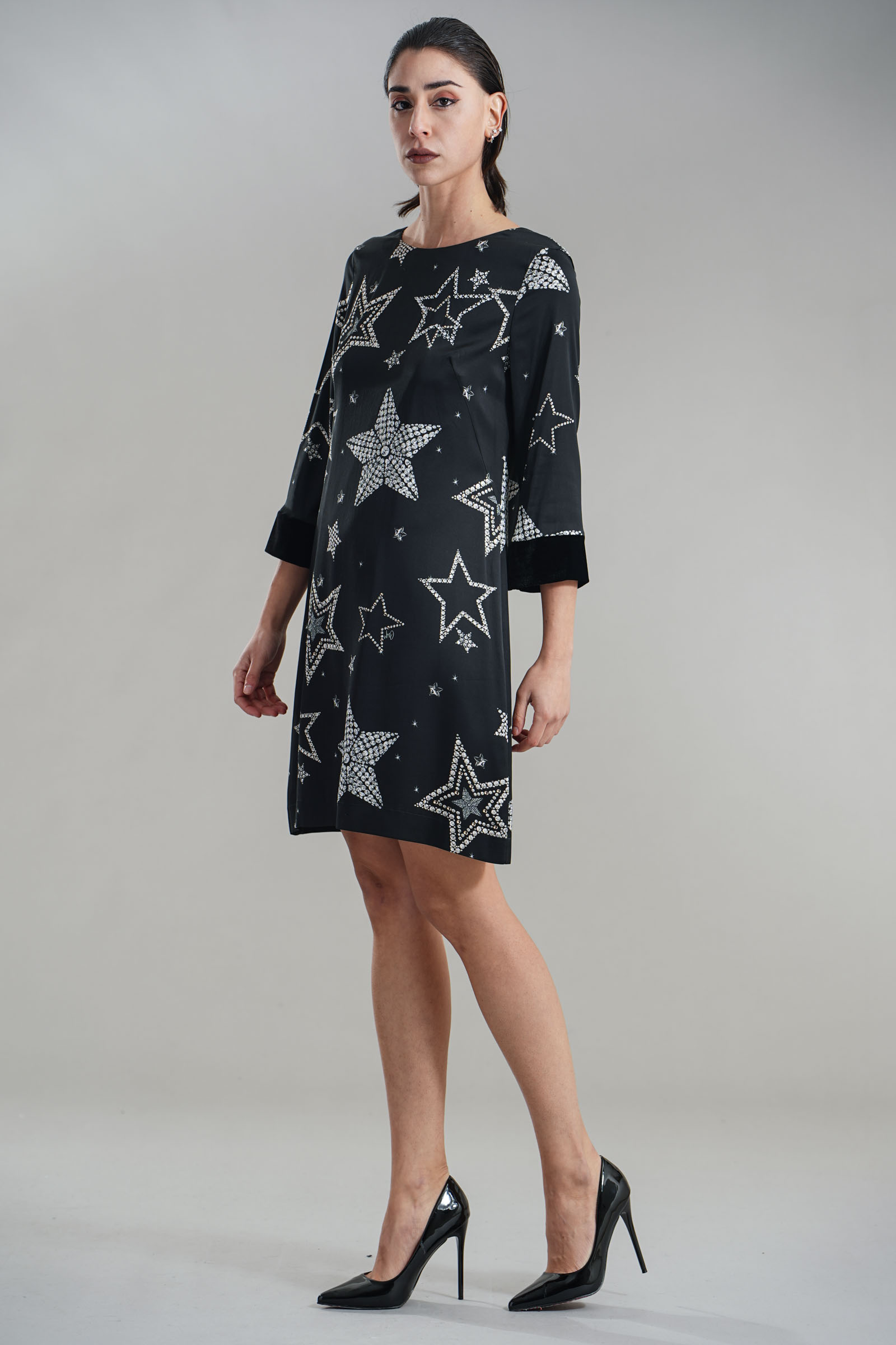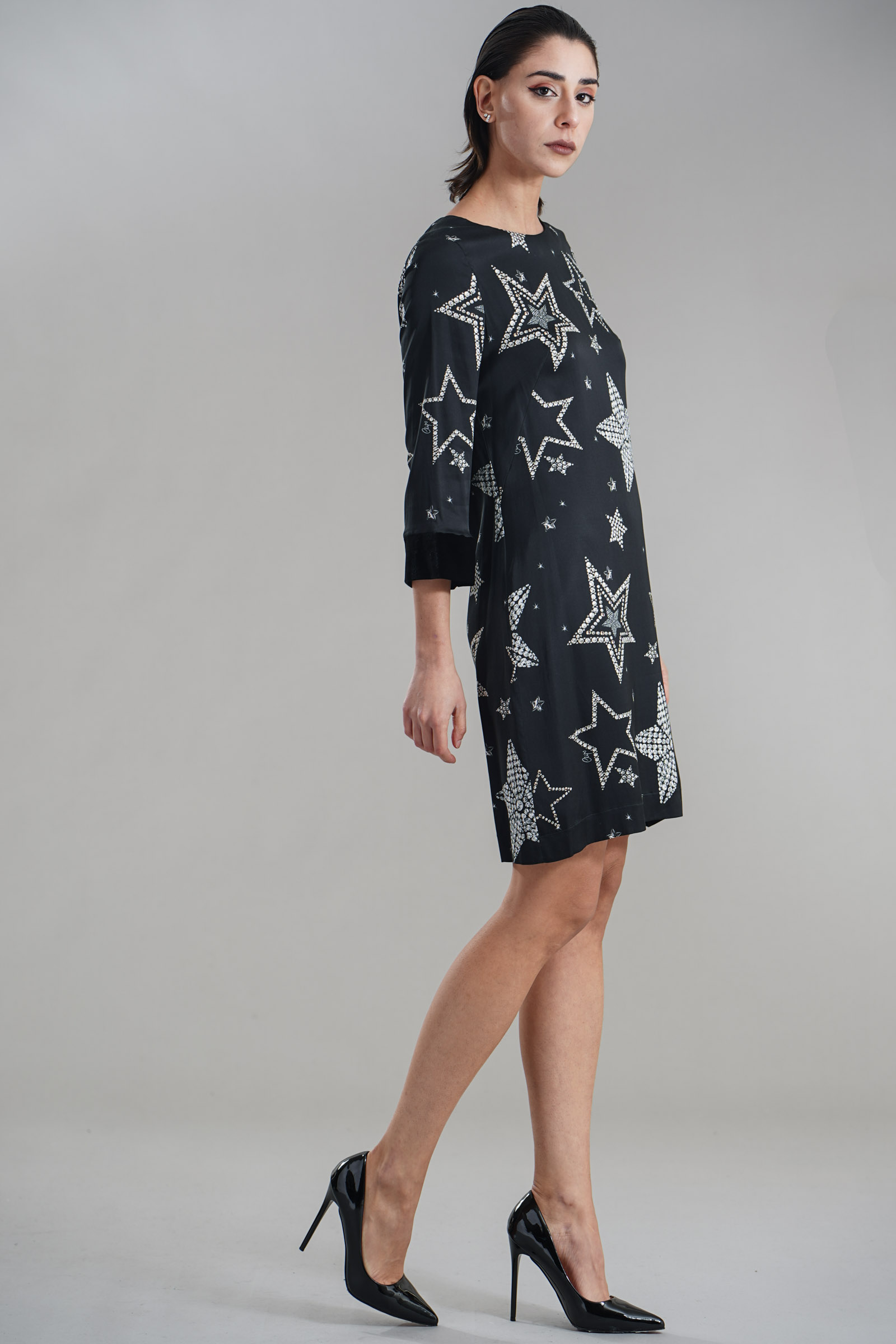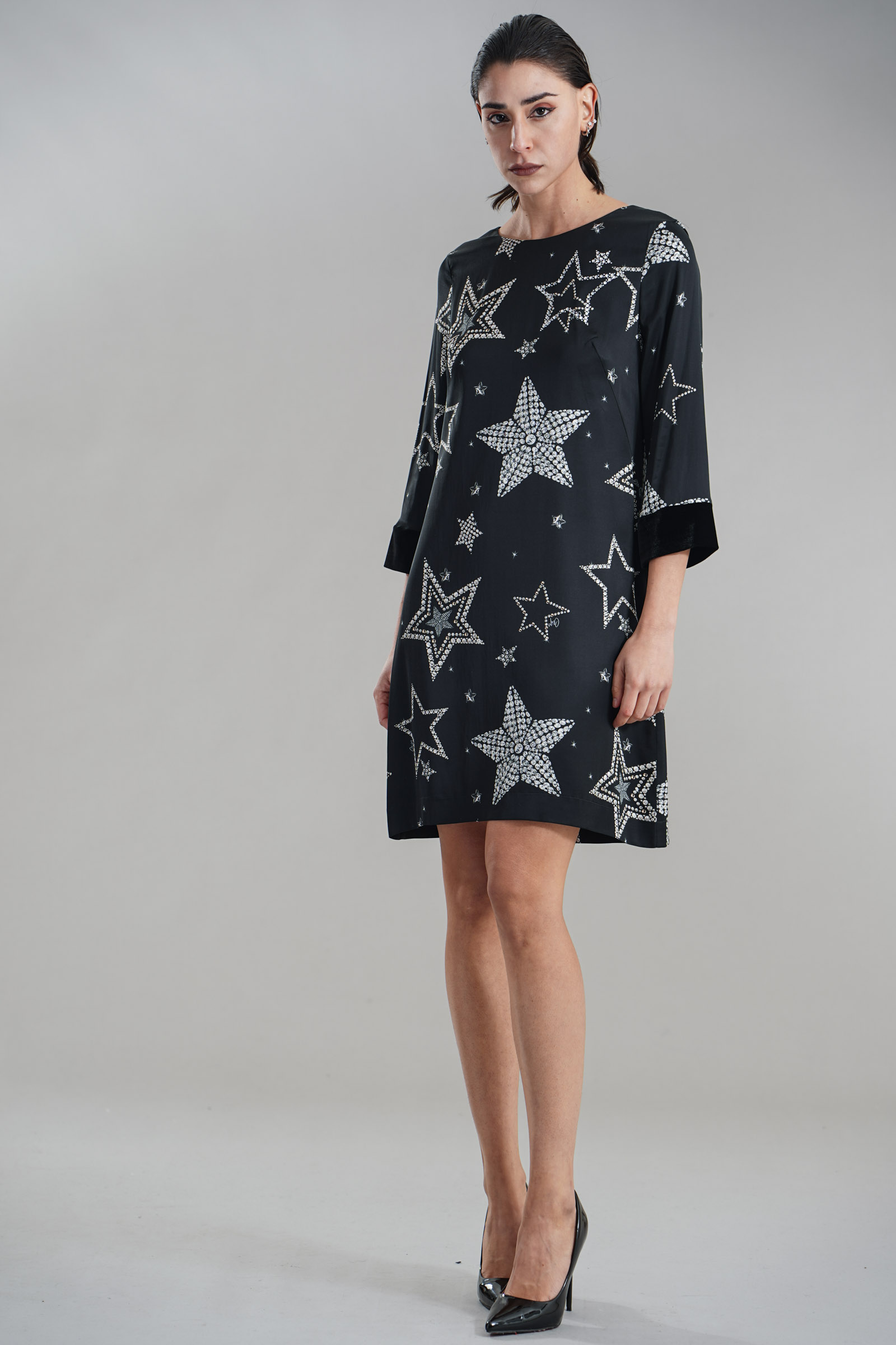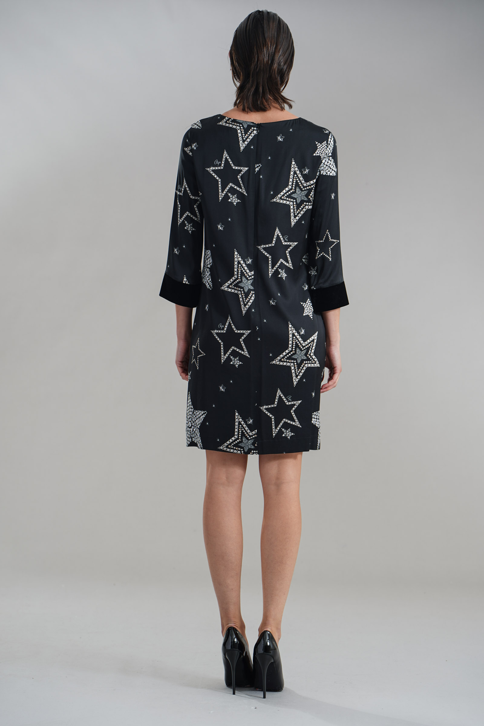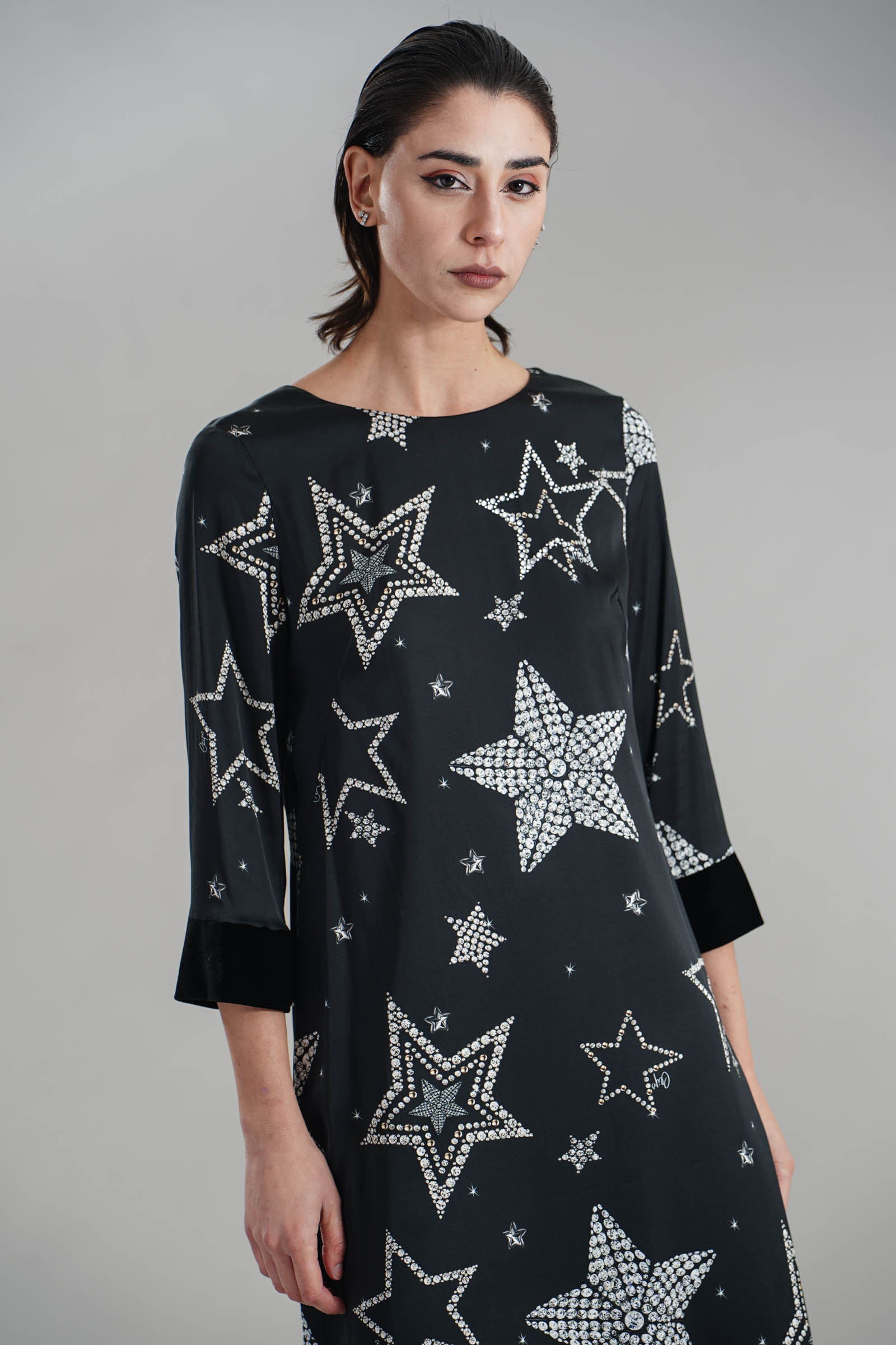 Vestibilita' comoda. Chiusura con zip invisibile. Dettaglio di velluto sui polsini. Strass applicati. Altezza modella 1,82. Nella foto indossa la taglia 40. Composizione: 97% Viscosa, 3% Elastane . Brand: Clips