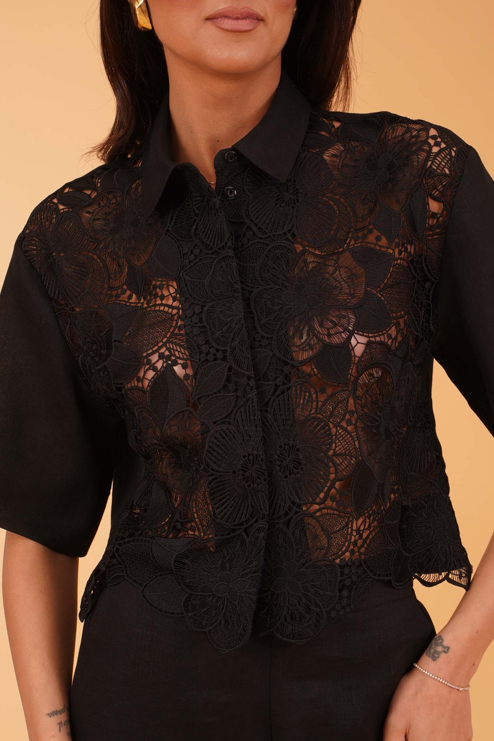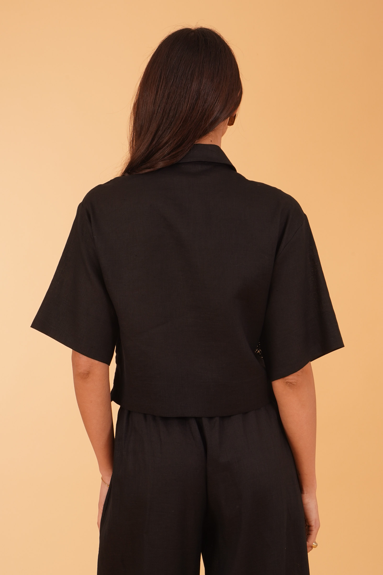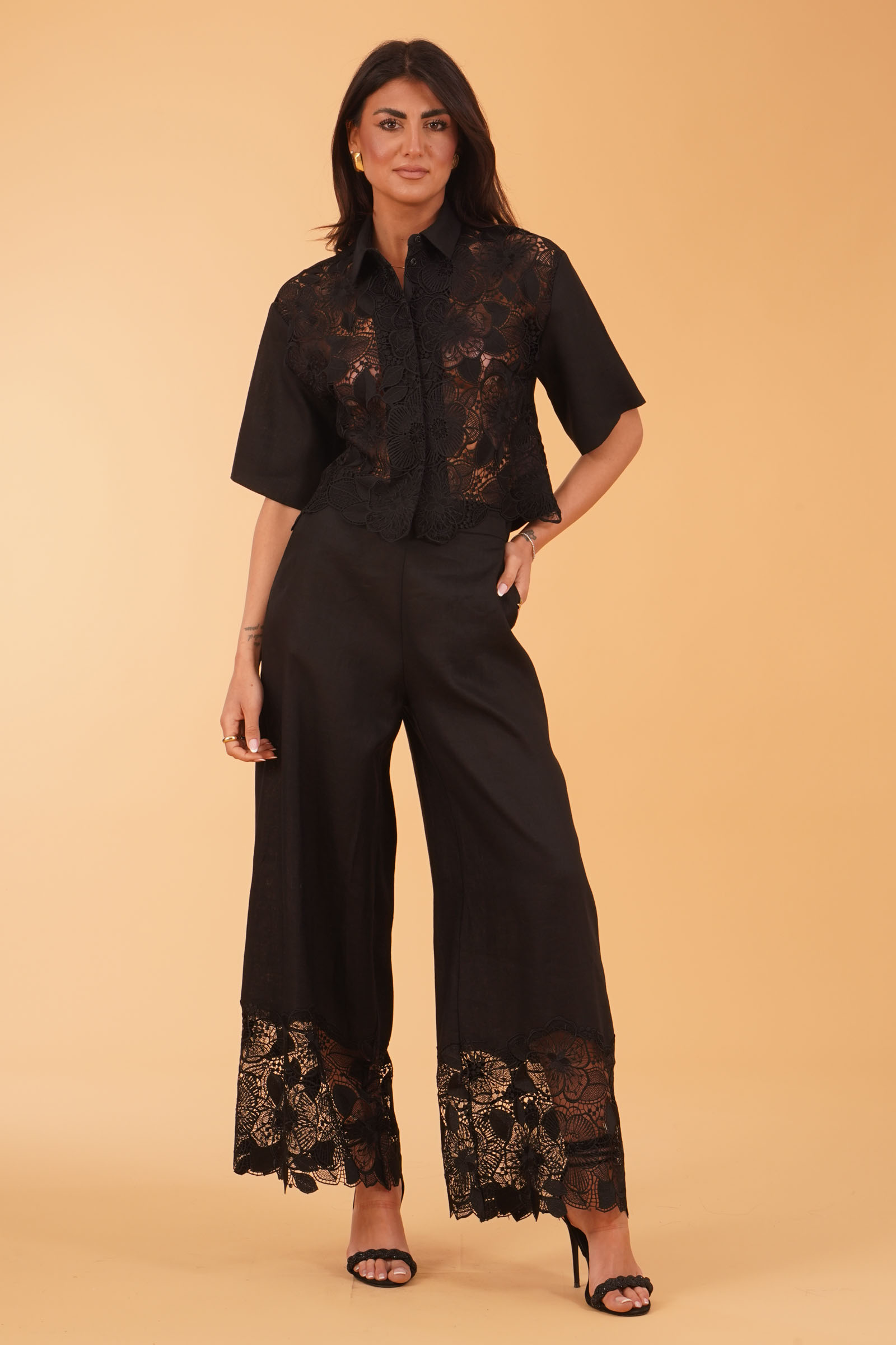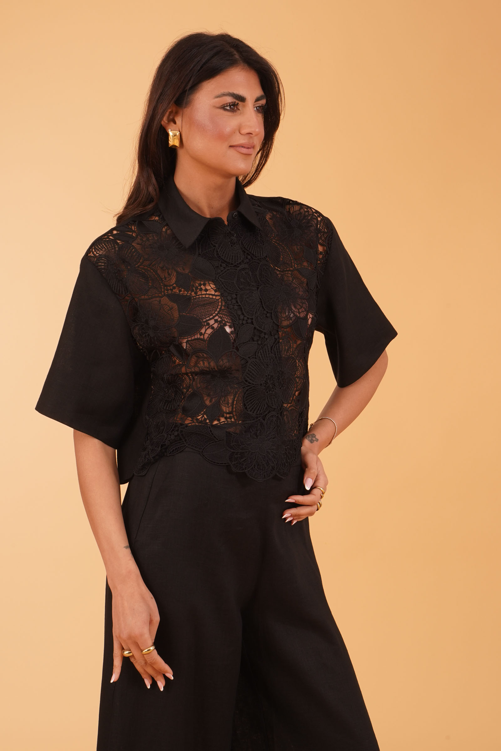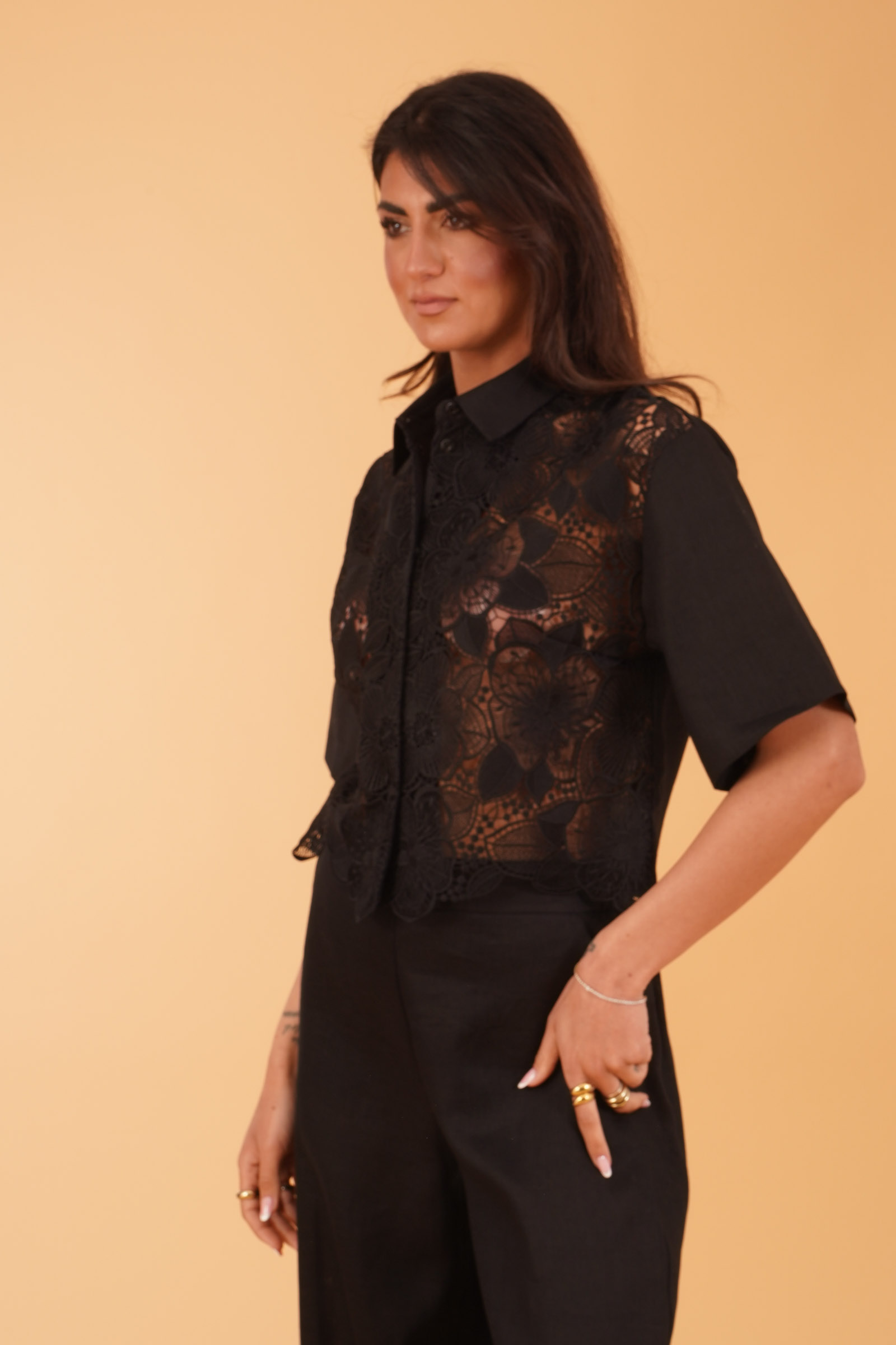 Vestibilita' regolare. Chiusura con bottoni automatici. Dettaglio di macrame'sul davanti. Alezza modella 1,80. Indossa la taglia 42. Composizione: 100% Lino. Brand: Clips