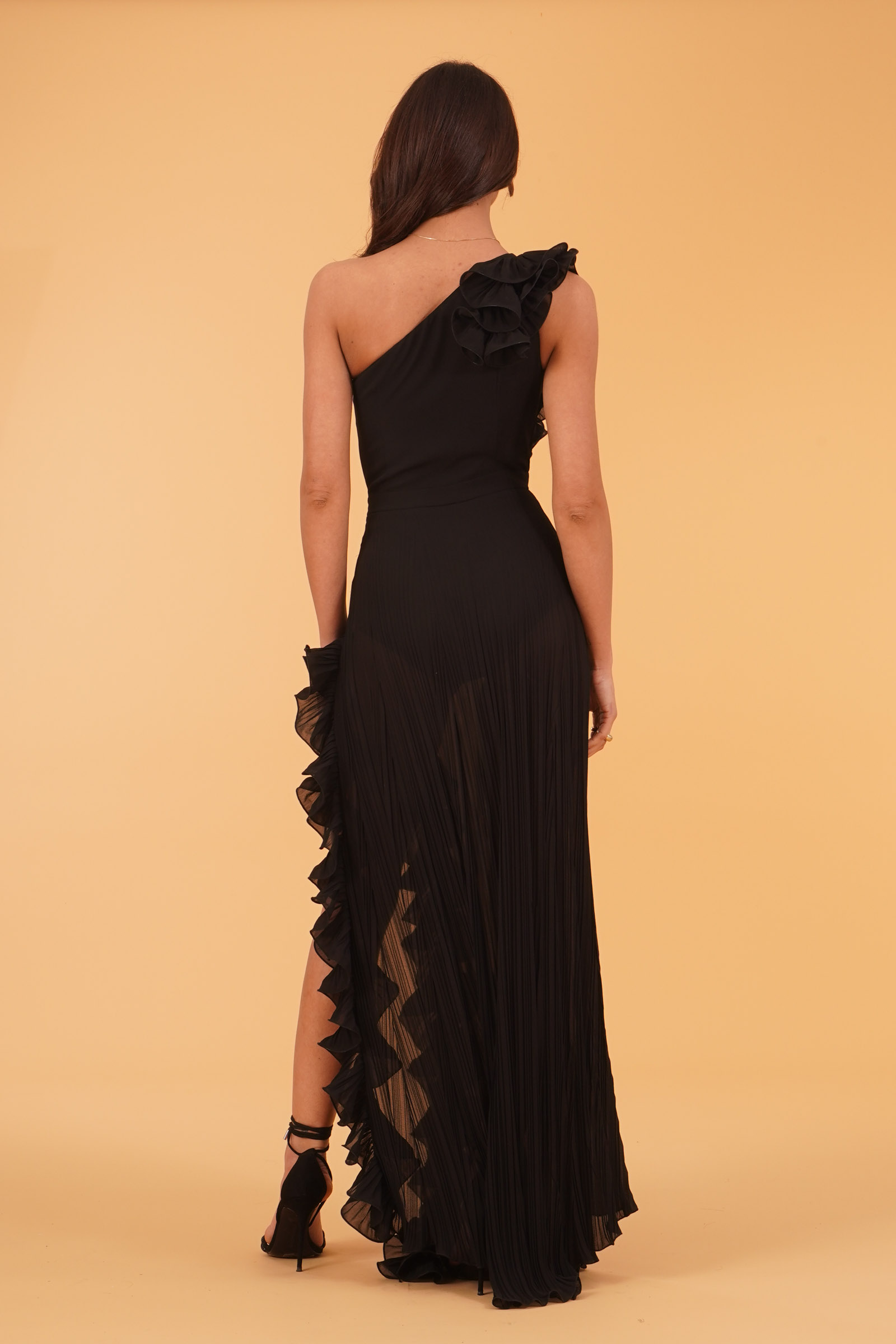 Vestibilita' regolare. Gonna vita alta con ampio spacco piu' dettaglio di rouches- Monospalla con rouches. Chiusura con zip invisibile. Altezza modella 1,80. Nella foto indossa la taglia 40. Composizione: 100% Poliestere. Brand: Divedivine