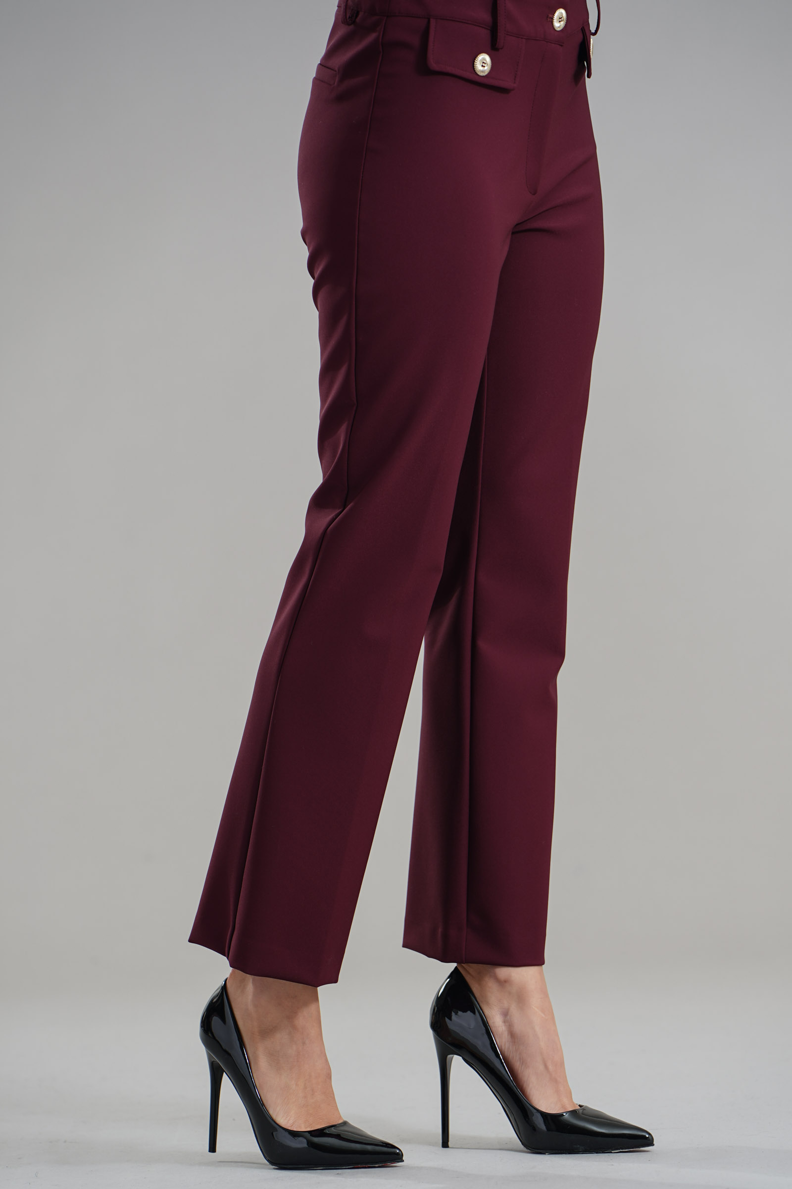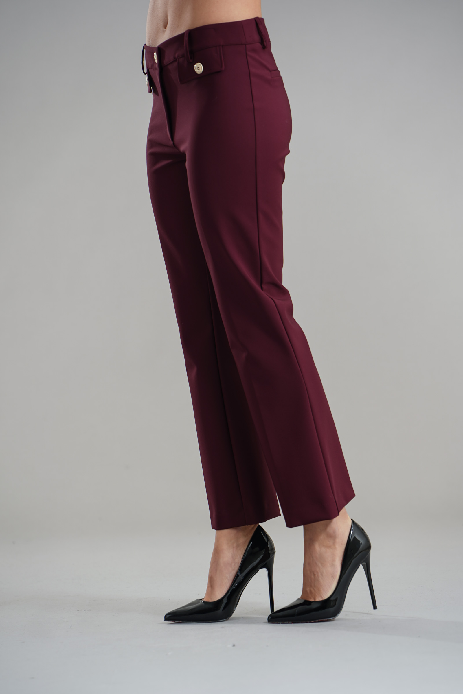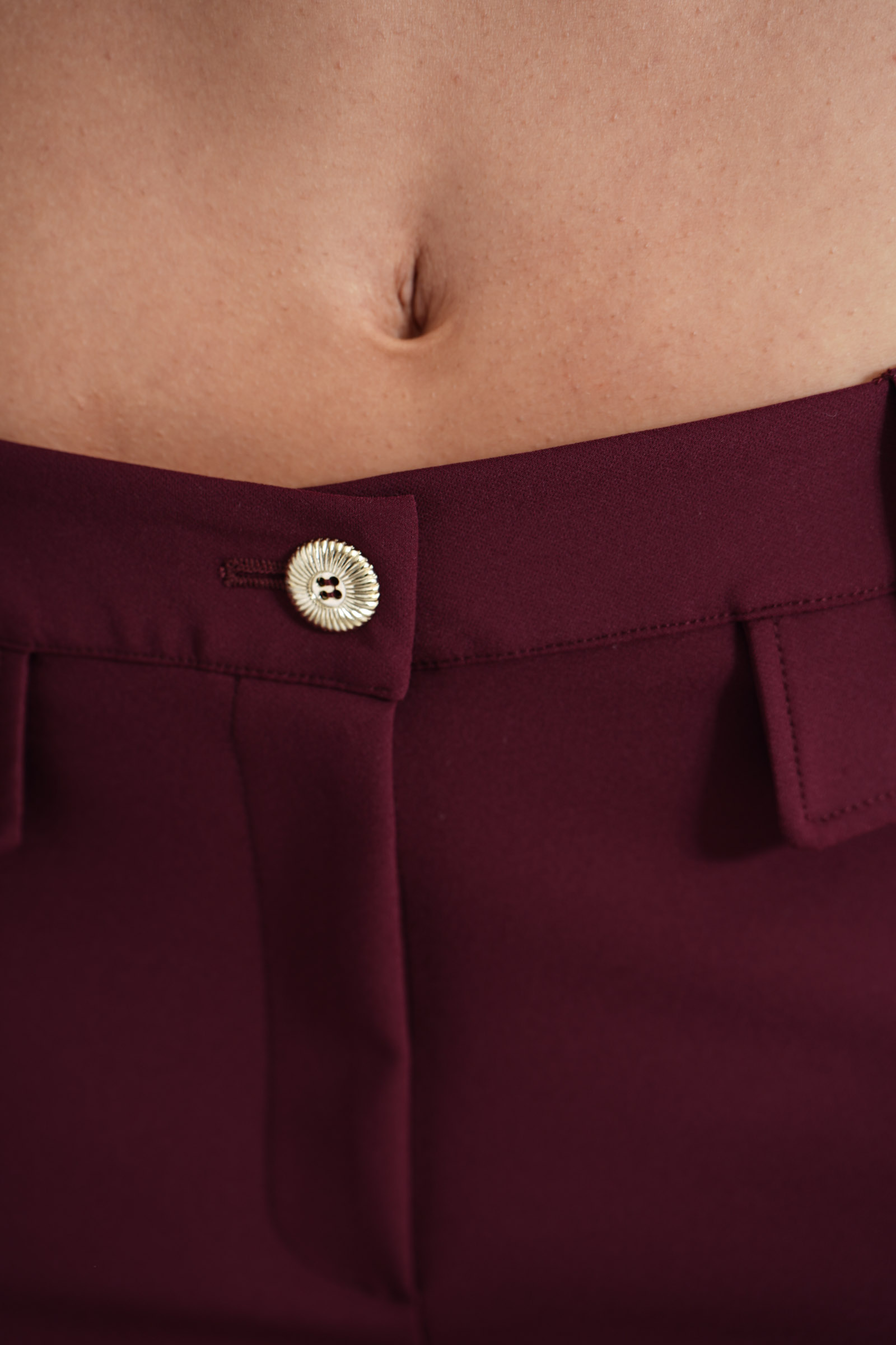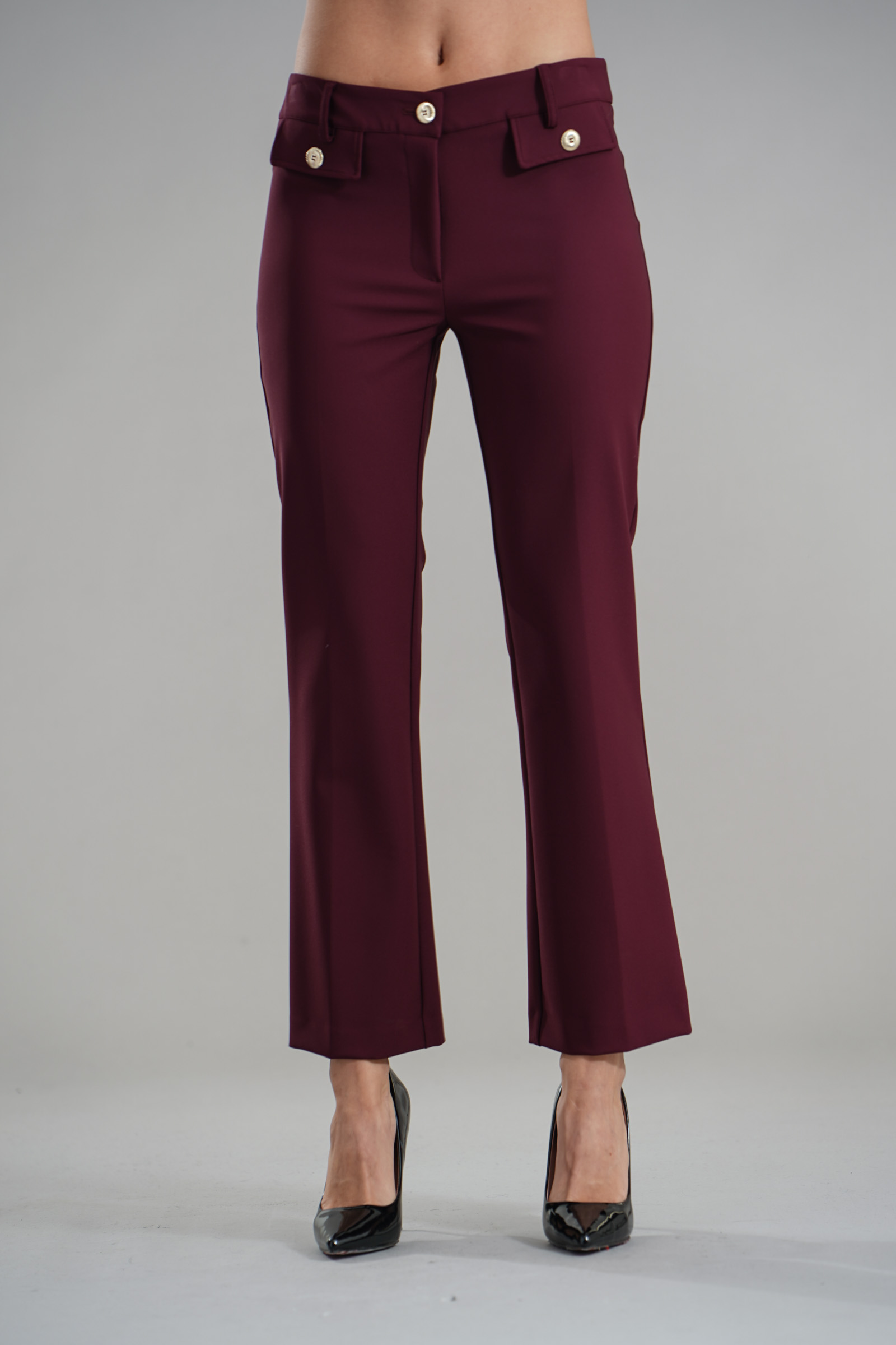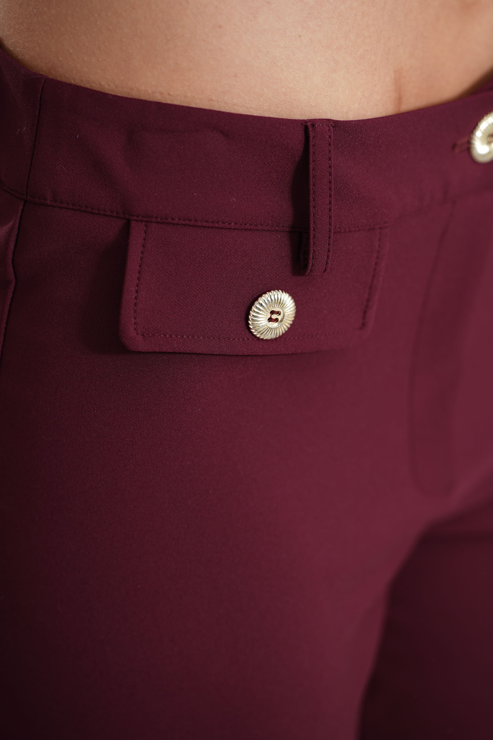 Vestibilita' regolare. Vita alta. Chiusura con bottone piu' zip. Pattine anteriori con dettaglio di bottoni gioiello. Altezza modella 1,79. Nella foto indossa la taglia 40. Composizione: 87% Poliammide, 13% Elastane. Brand: Double C