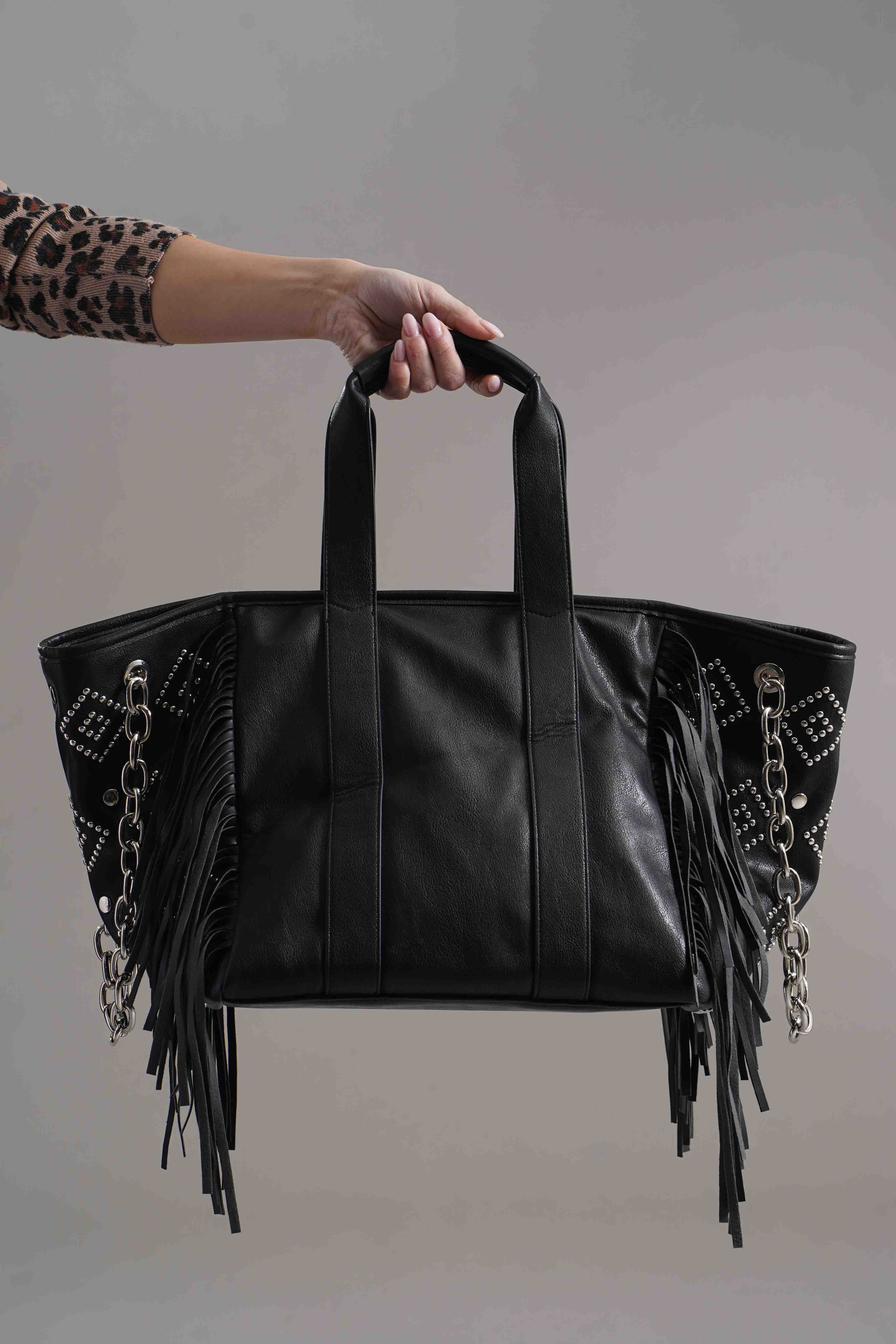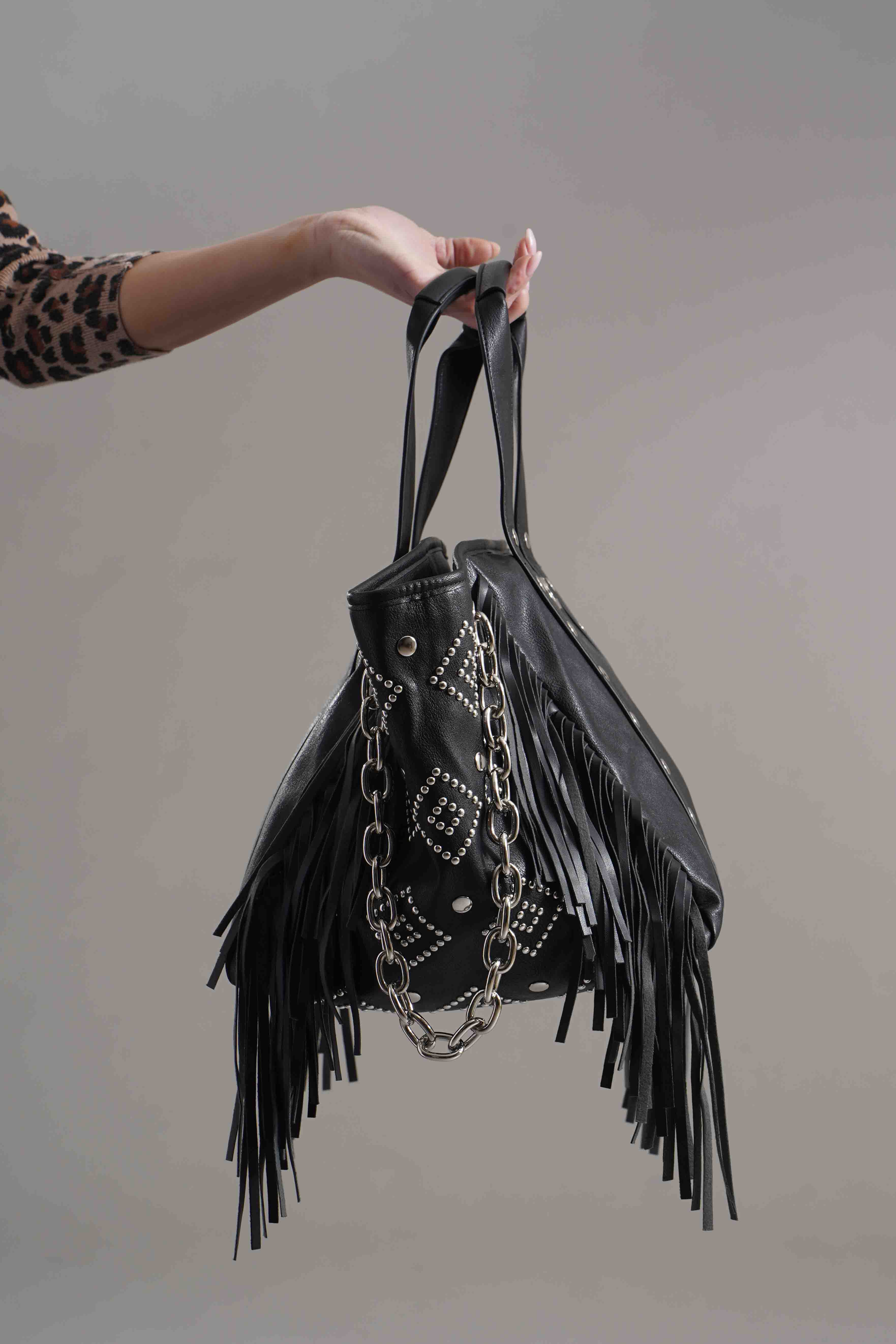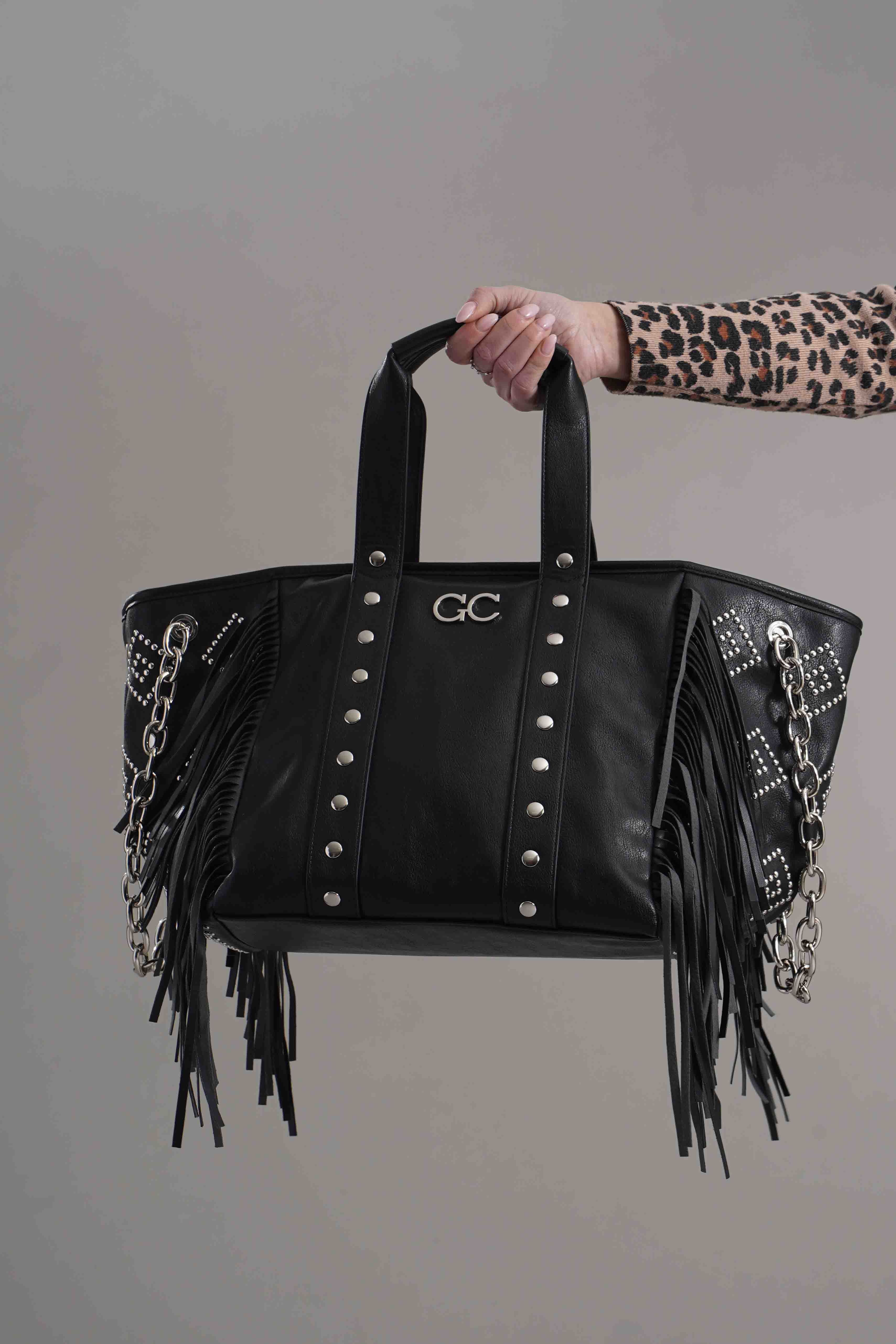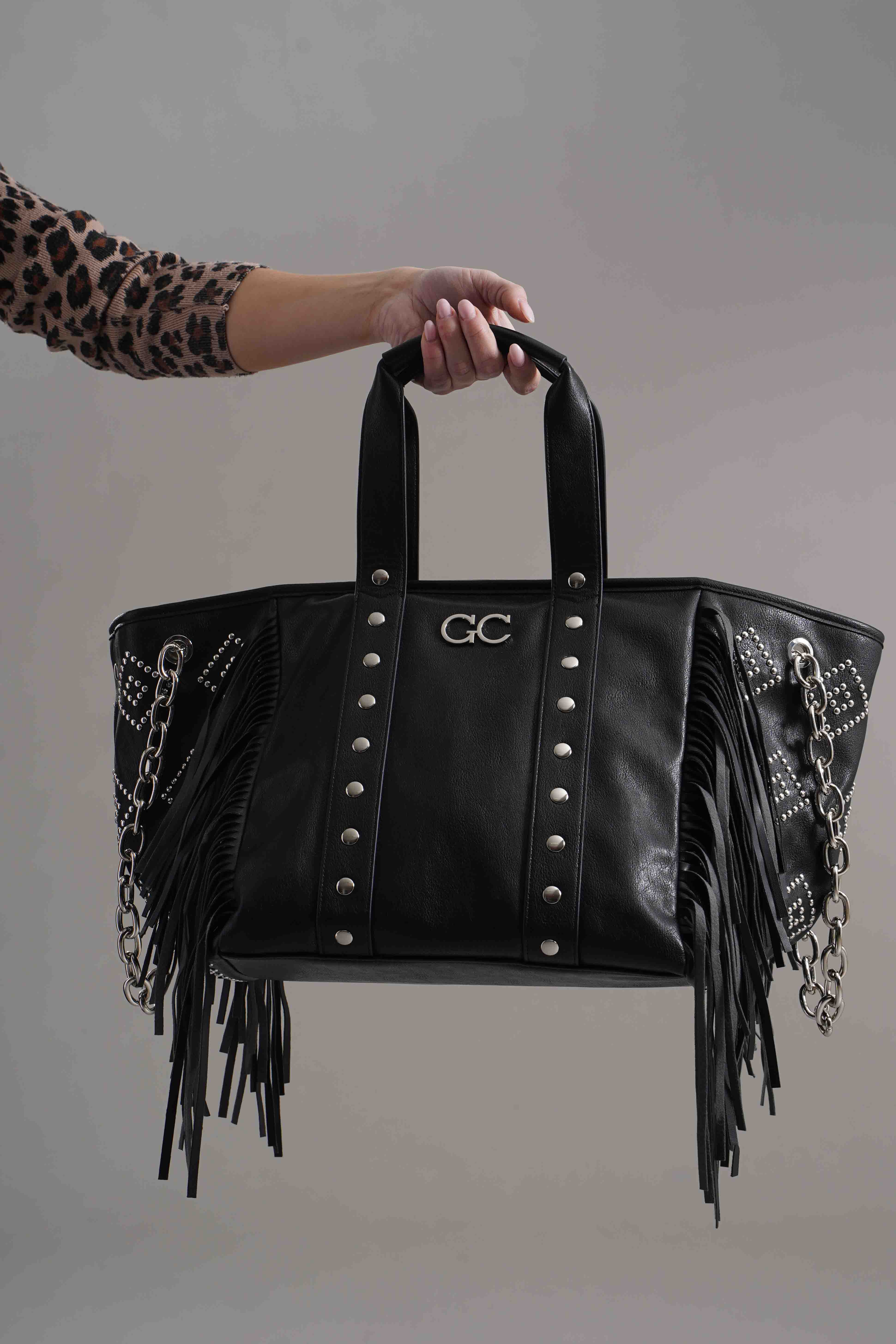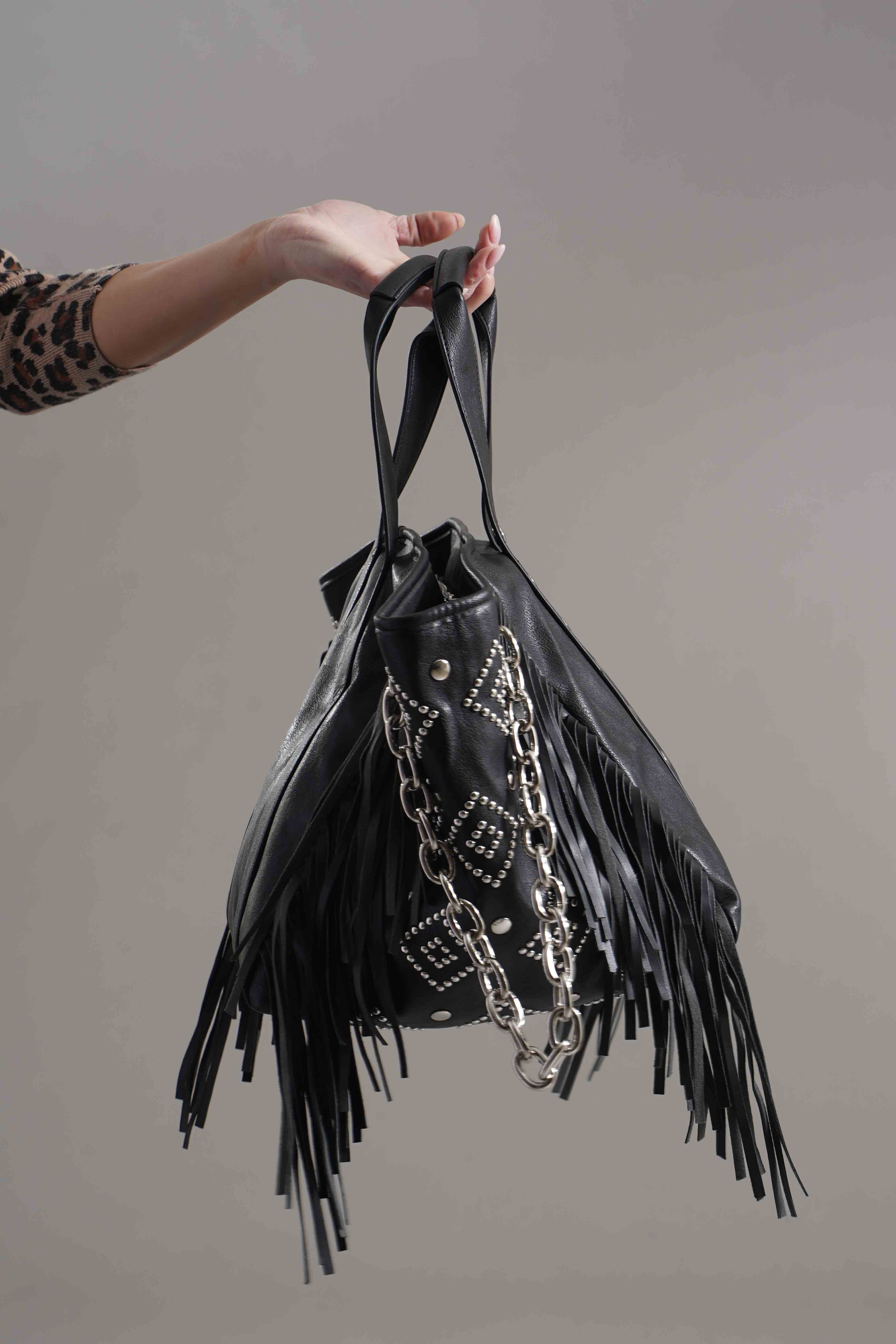 Chiusura con zip piu'scompartimenti interni. Dettagli di borchie piu' frange. Tracolla a mano in metallo. Misure: A cm 29, P cm 128, L cm 32. Brand: Gio Cellini