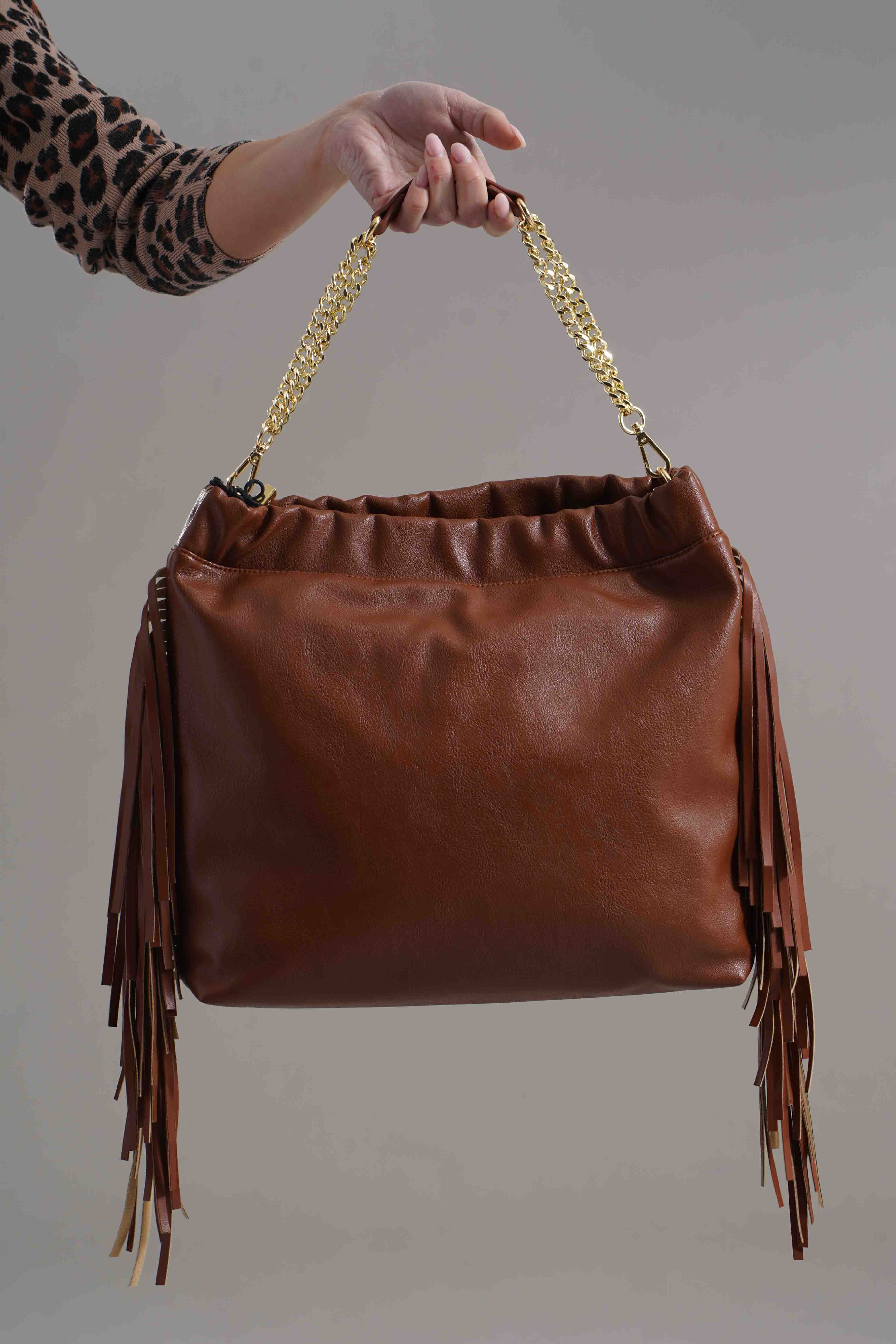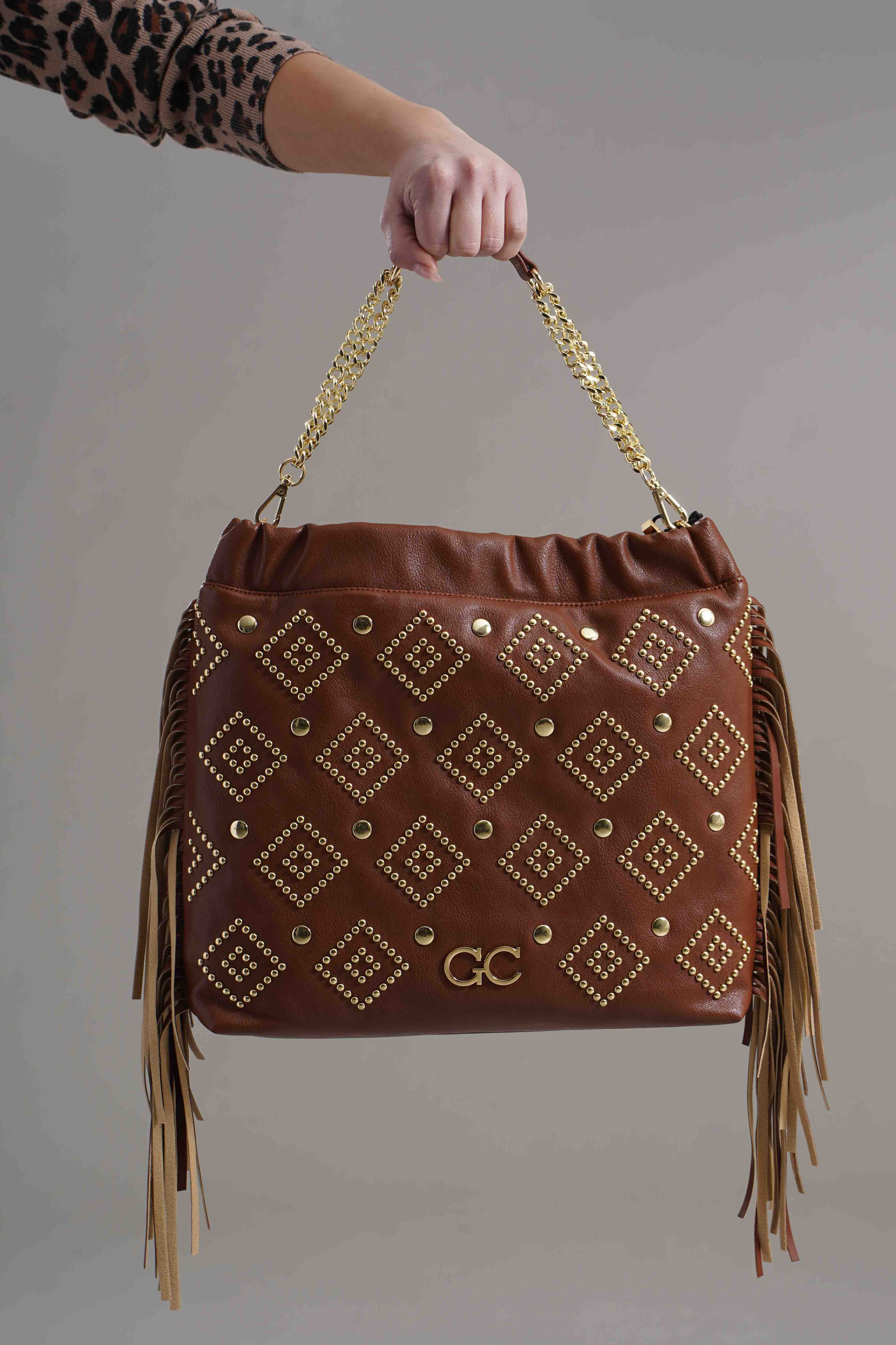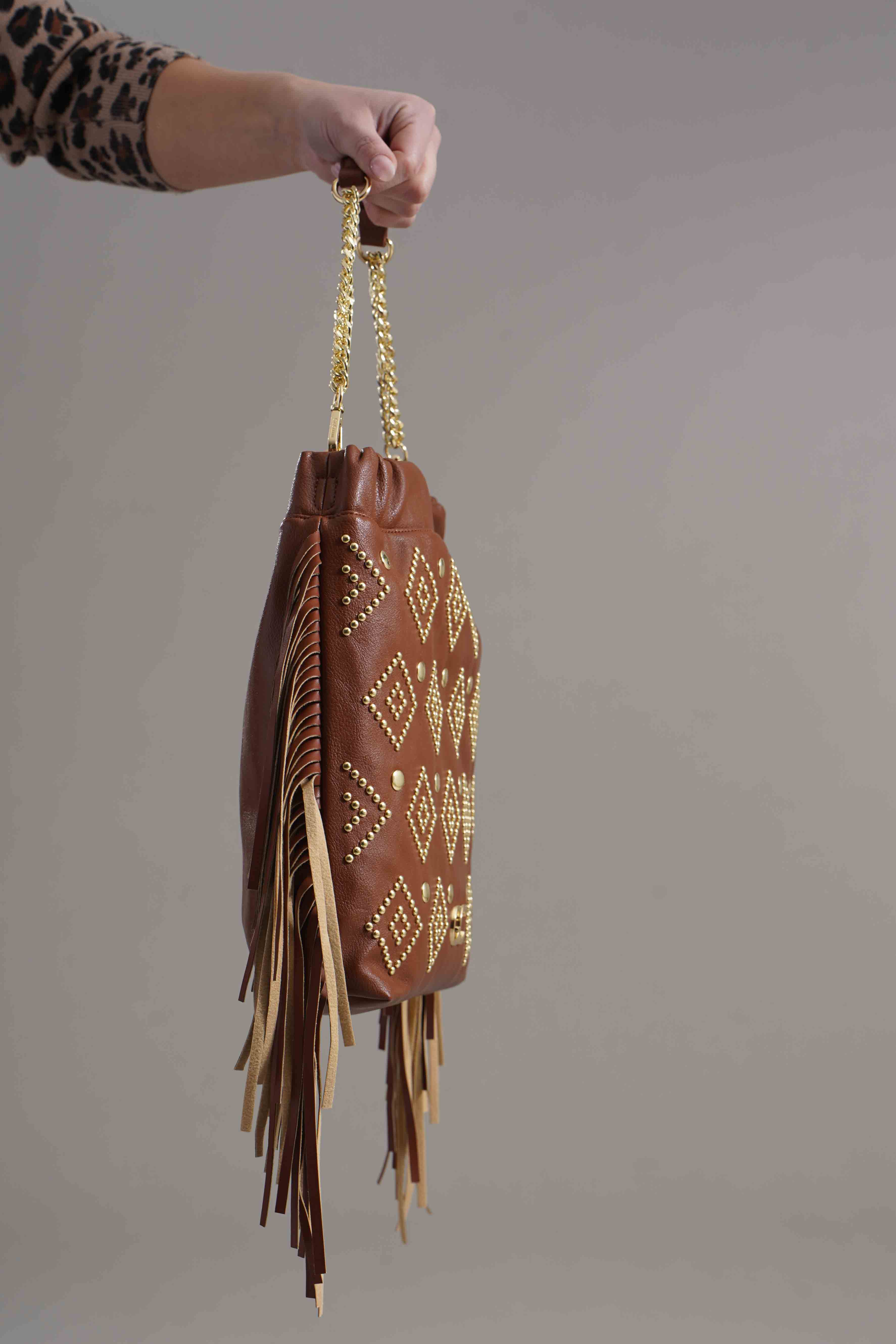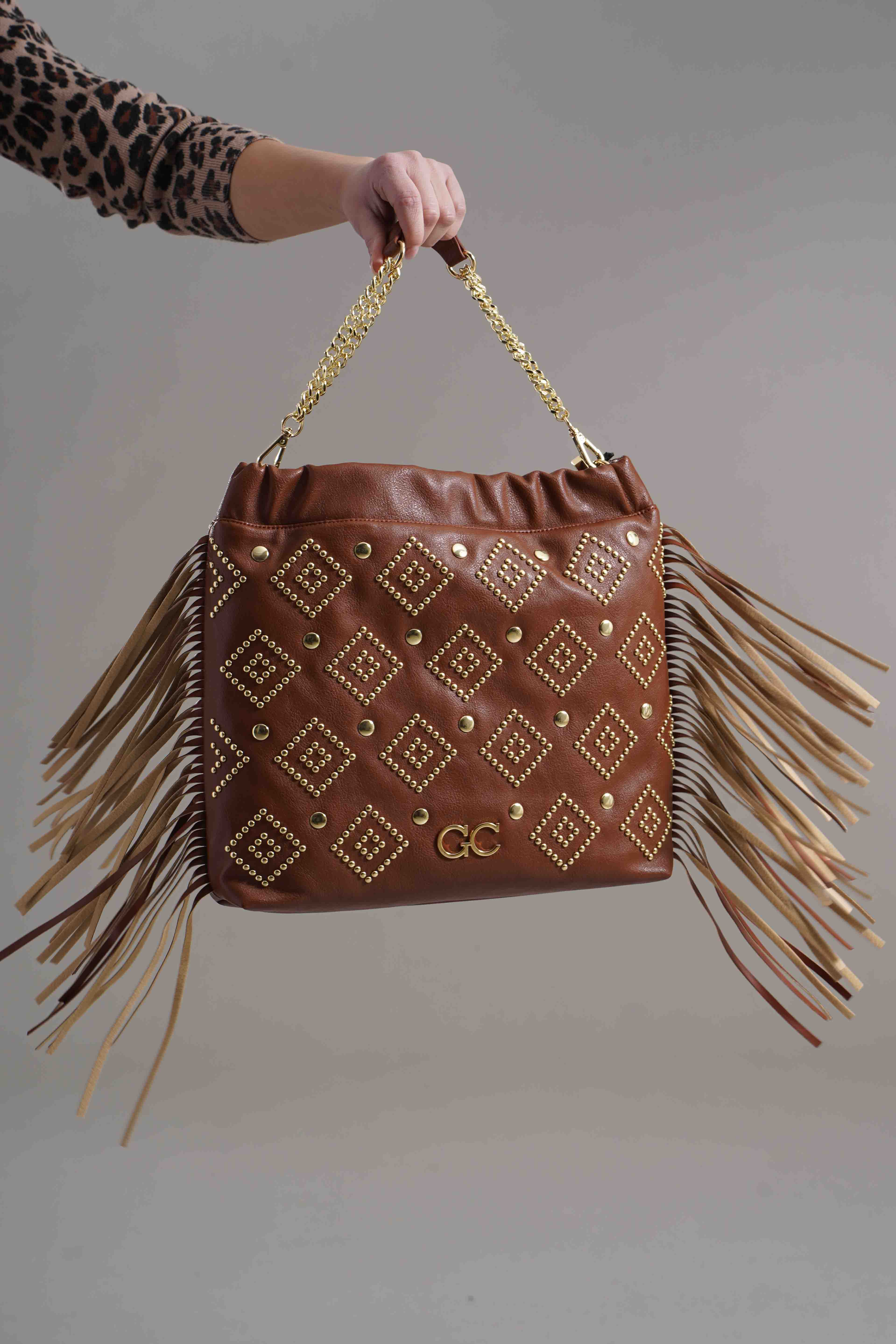Chiusyra con zip piu' scompartimenti.. Tracolla a mano removibile piu' tracolla a spalla removibile. Dettaglio di frange e borchie. Misure: A cm 32, P cm 9, L cm 35. Brand Gio Cellini