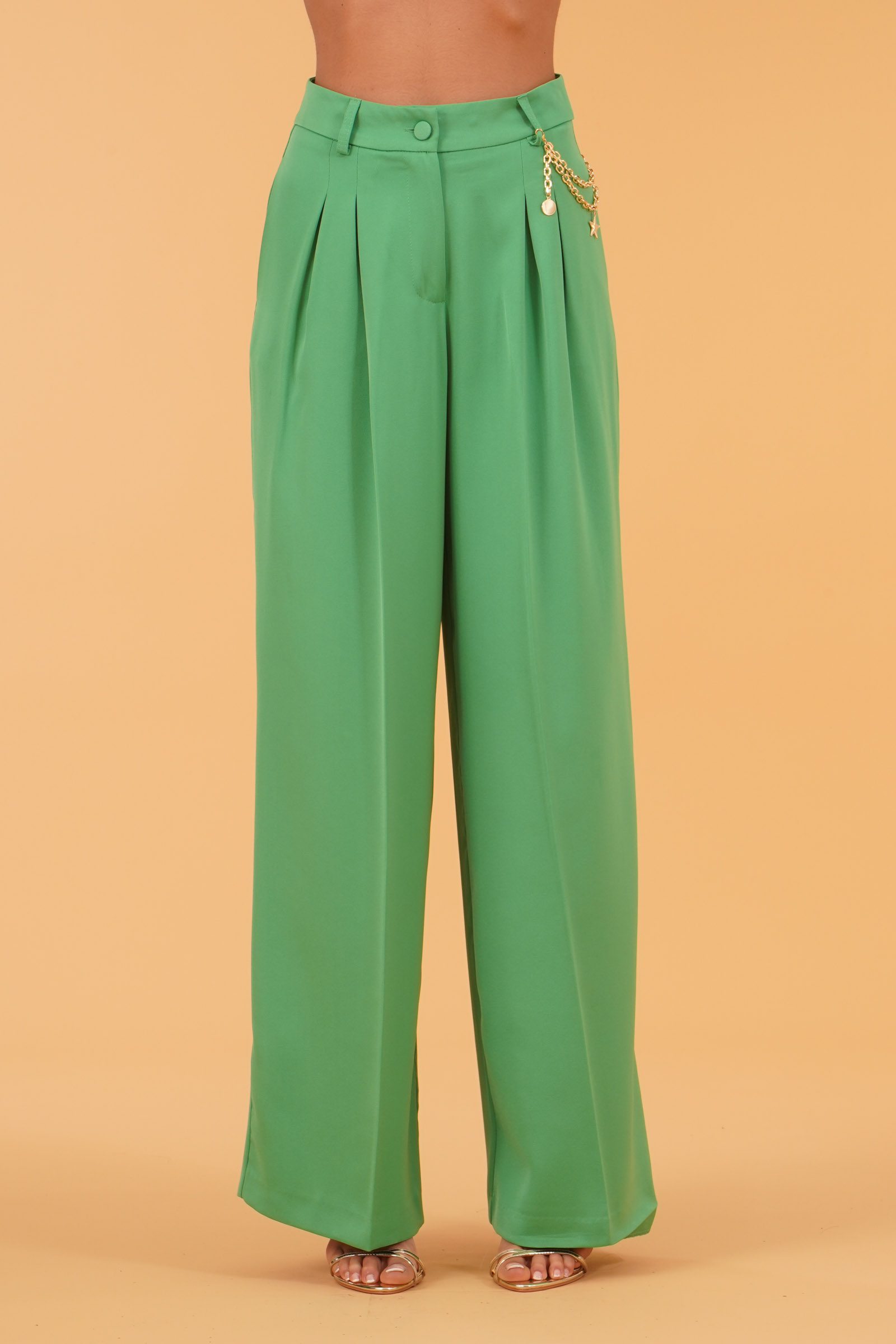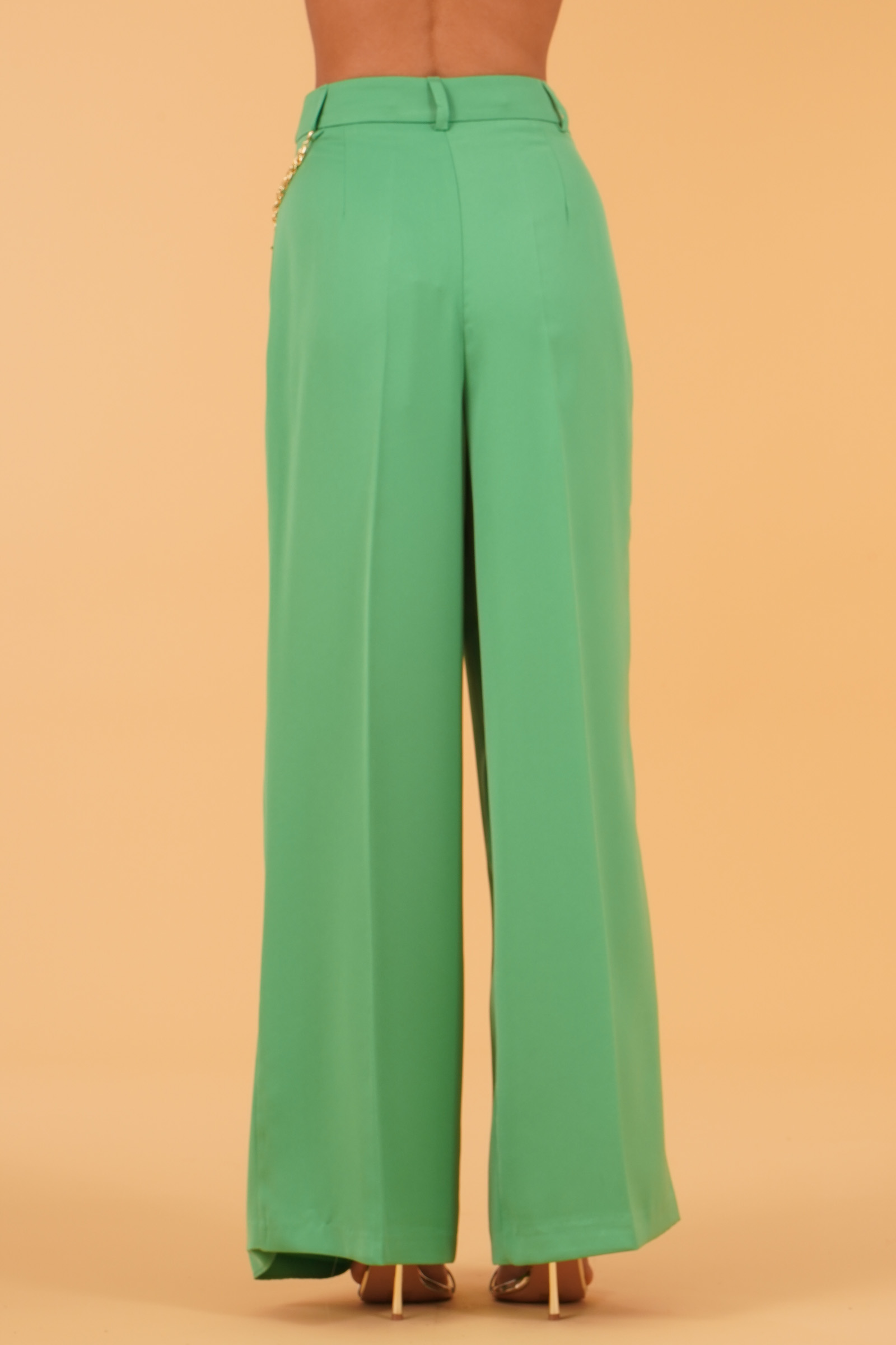 Vestibila' regolare. Vita alta- Tasche a filo. Dettaglio di catenina removibele. Altezza modella 1,80. Indossa taglia 40. Compoizione: 60% Poliestere, 40% Viscosa. Brand: Gm by Gai Mattiolo