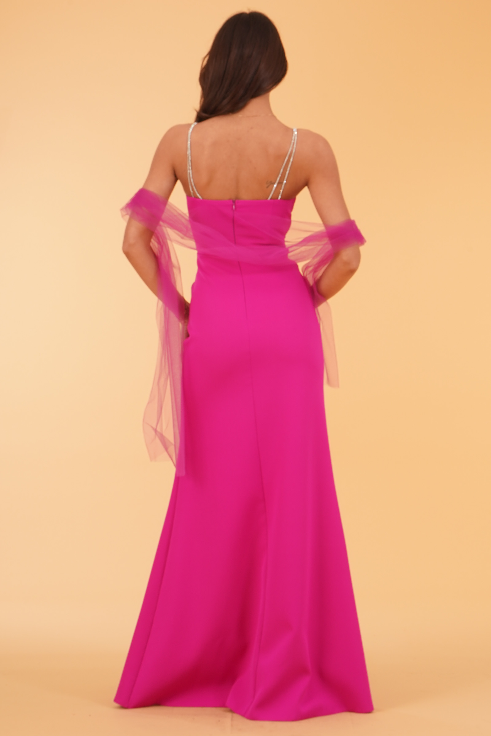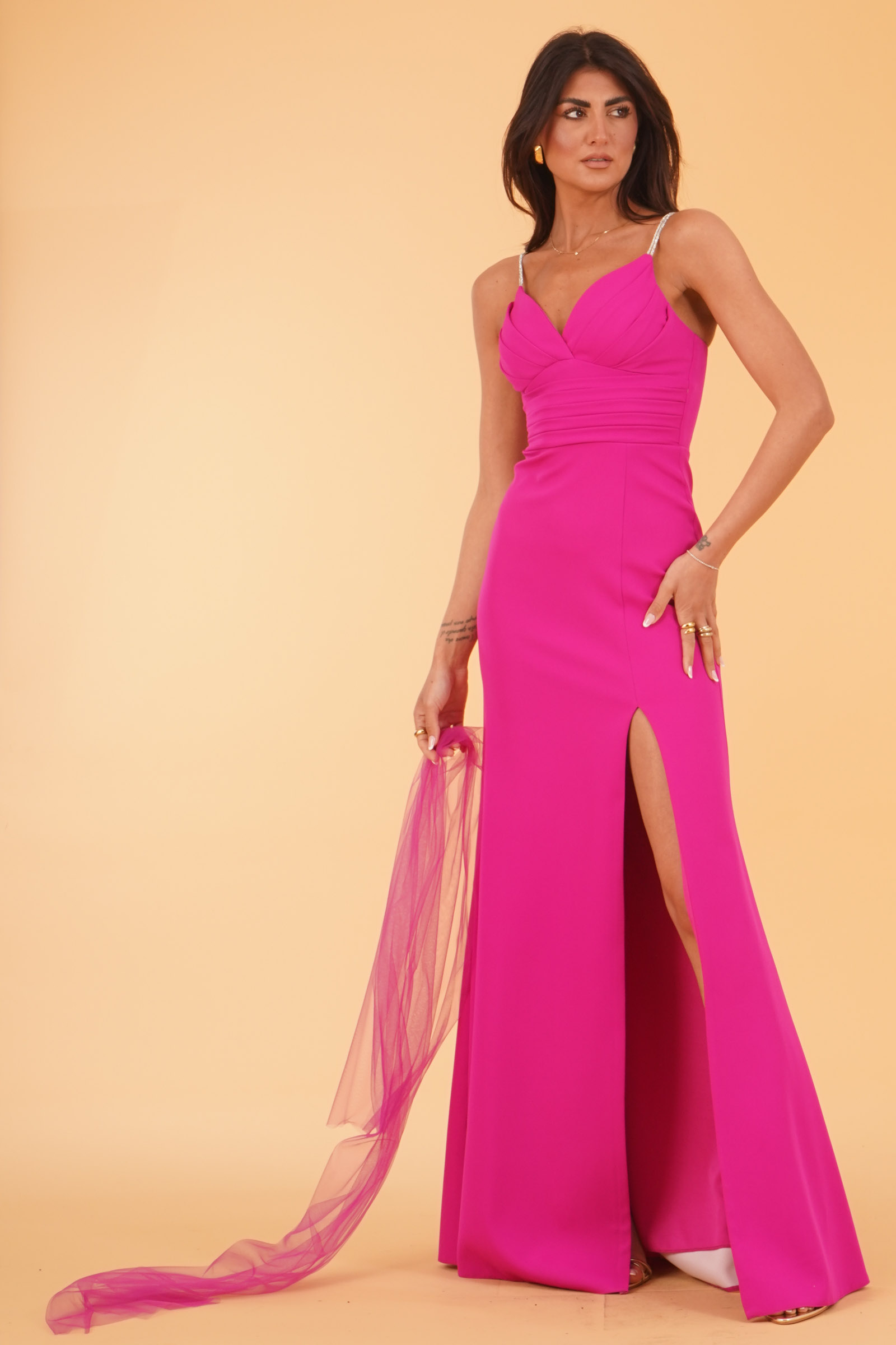 Vestibilita' regolare. Bustino strutturato con coppette inserite. Bretelline con strass. Gonna vita alta con spacco. Chiusura con zip invisibil. Stola inclusa. Altezza modella 1,80. Nella foto indossa la taglia 40. Composizione: 100% Poliestere. Brand: Kuea