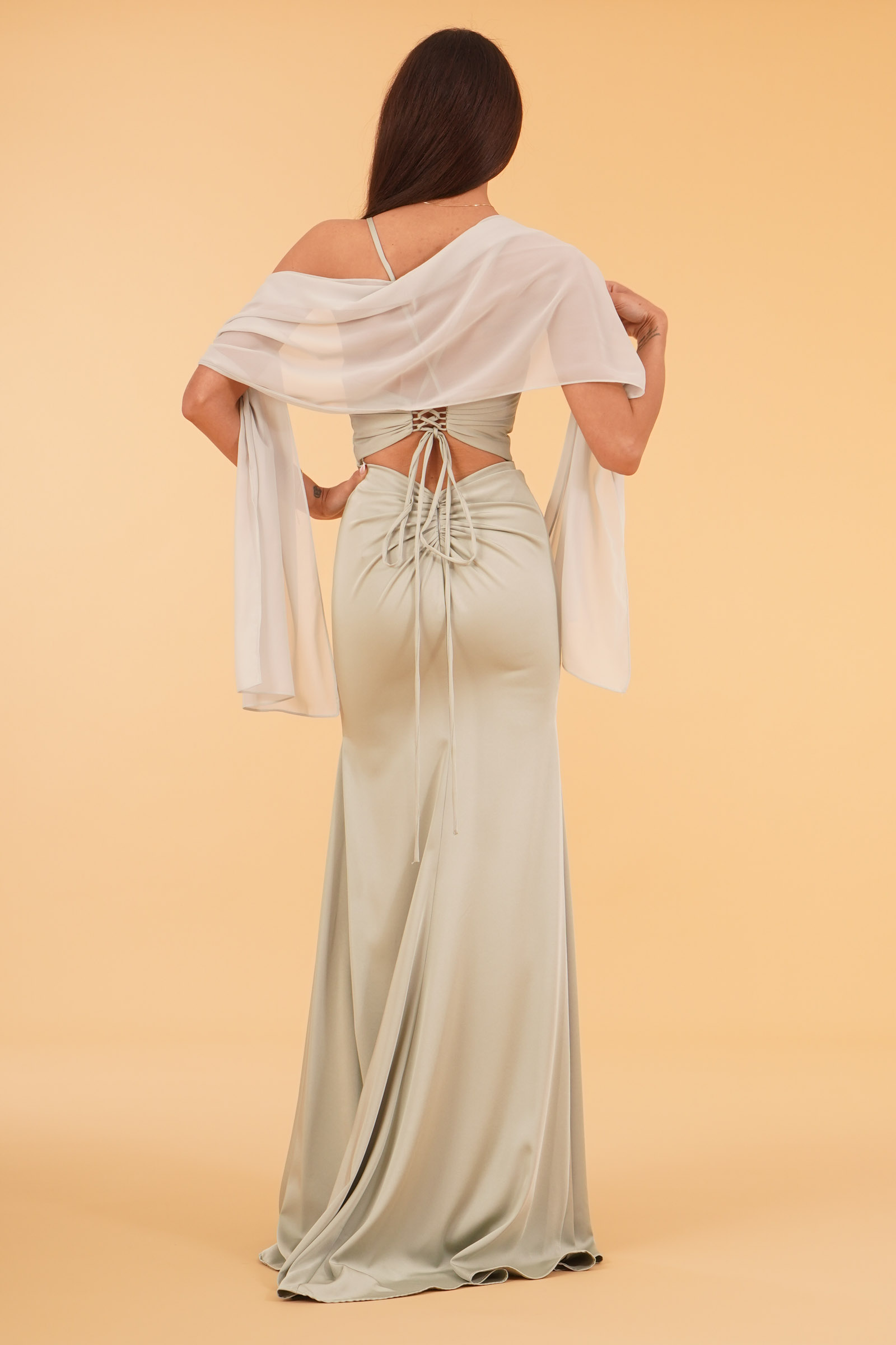 Vestibilita' regolare. Corpetto strutturato con coppe inserite. Scollatura piu' drappeggio e allacciatura posteriore. Chiusura con zip invisibile. Stola inclusa. Altezza modella 1,80. Indossa taglia 40. Compoizione: 100% Poliestere. Brand: Kuea