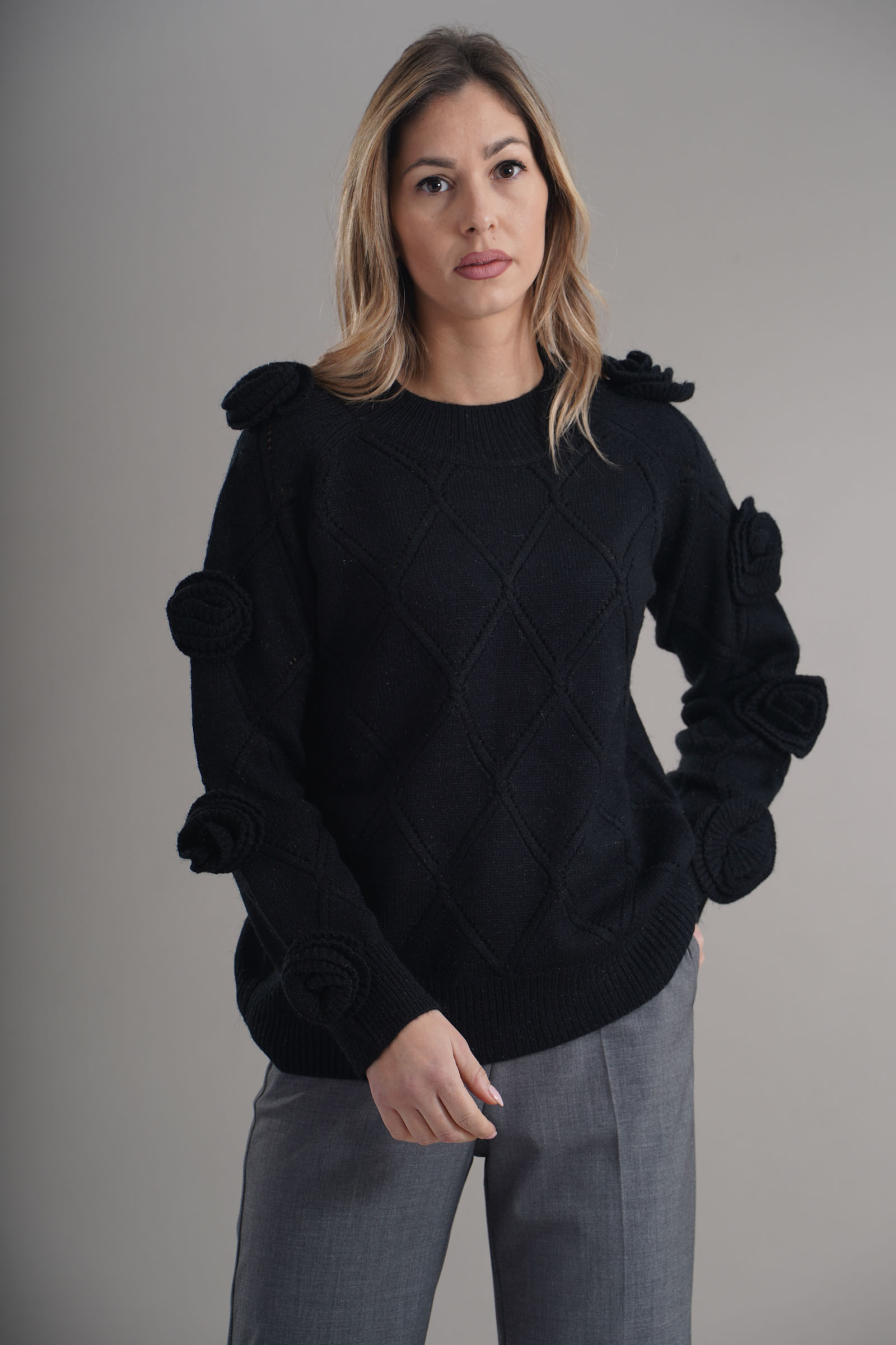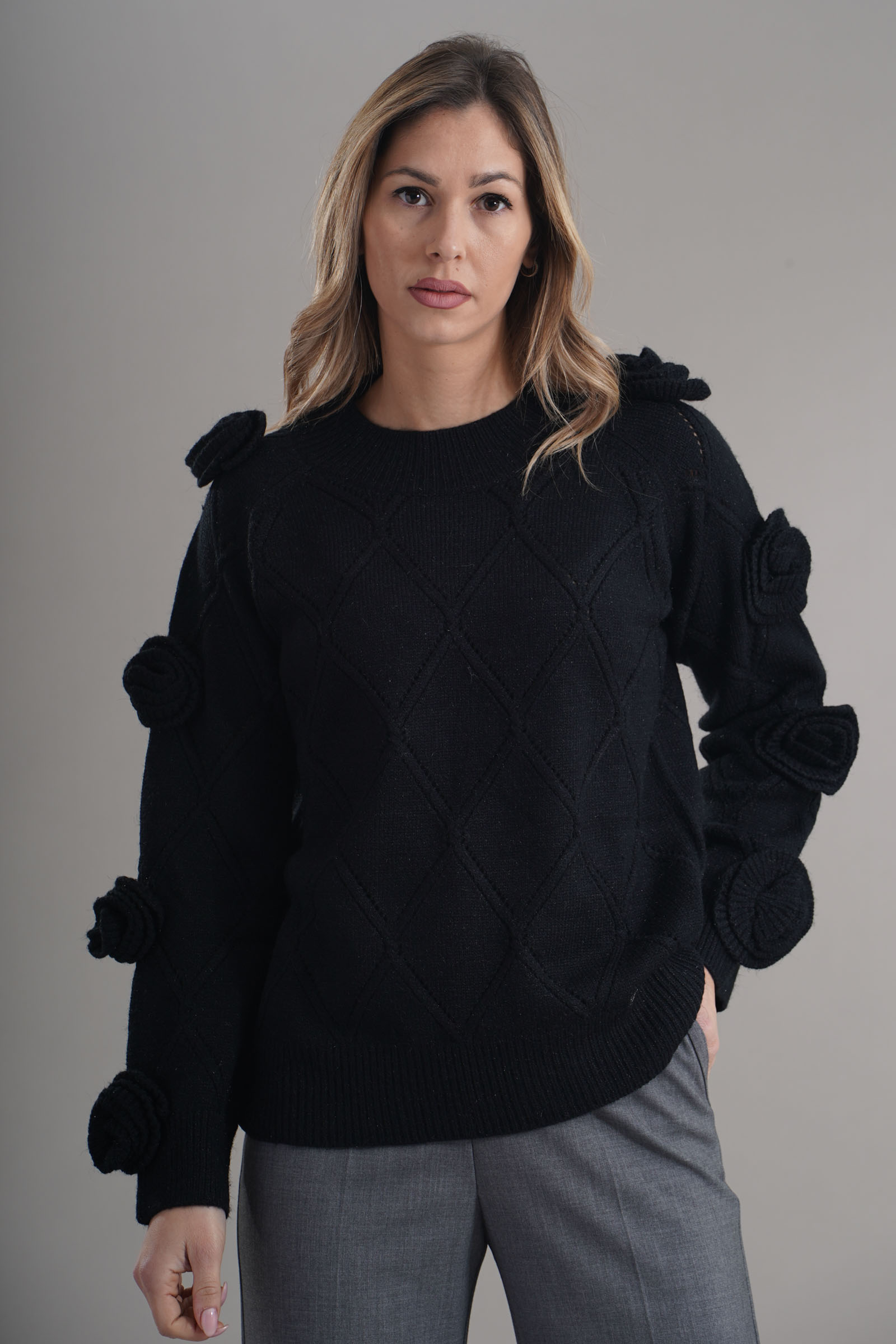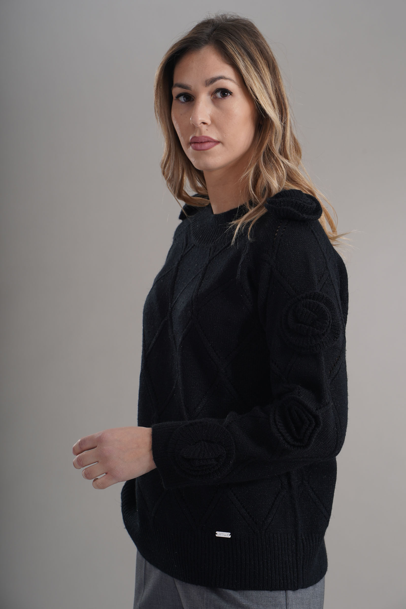 Vestibilita' regolare. Girocollo. Elastico sul fondo e sui polsini. Dettaglioi di fiori sulle maniche. Altezza modella 1,79. Nella foto indossa la taglia 42. Composizione: 65% Acrilico, 32% Poliestere, 3% Elastane. Brand: Lafty.Lie