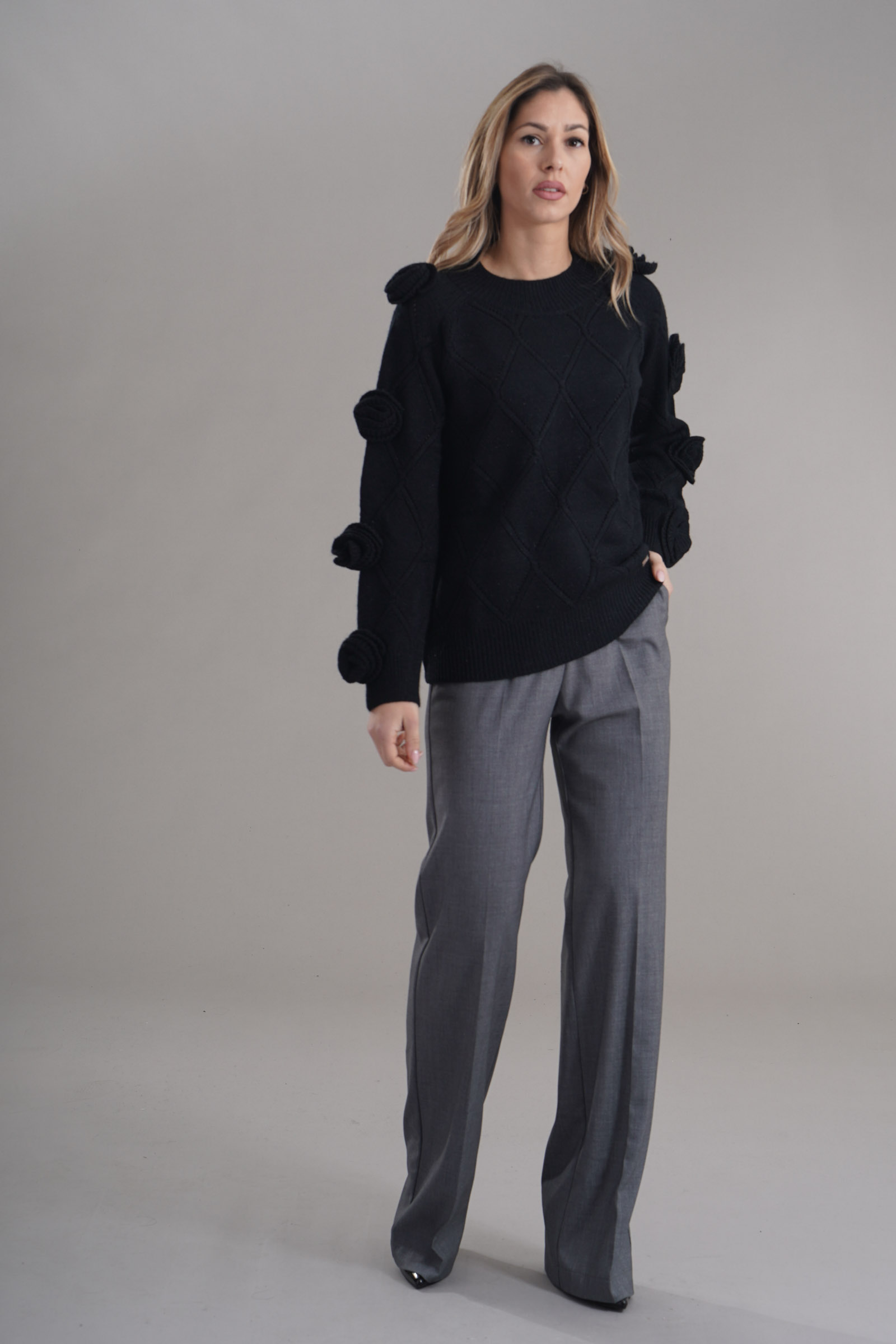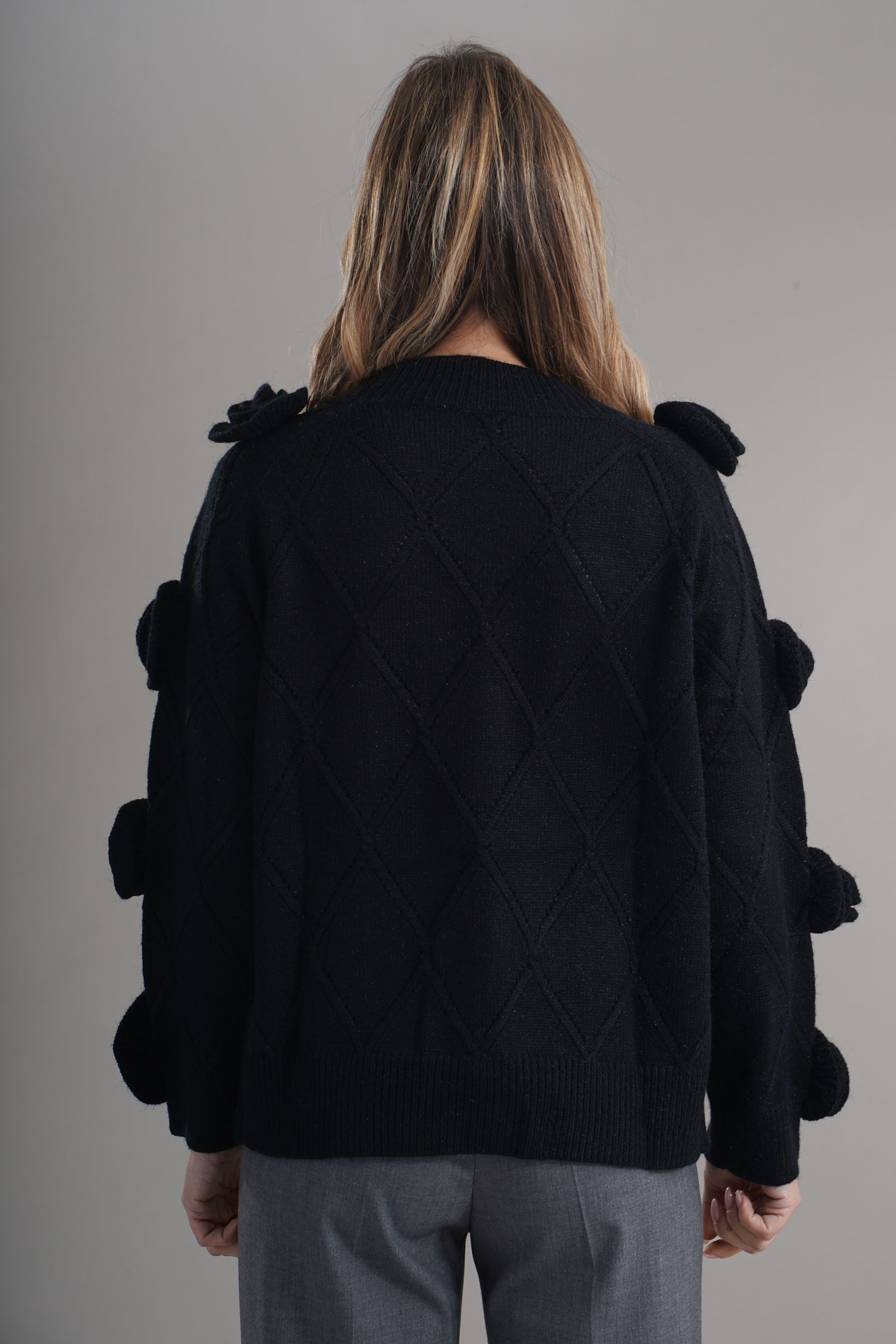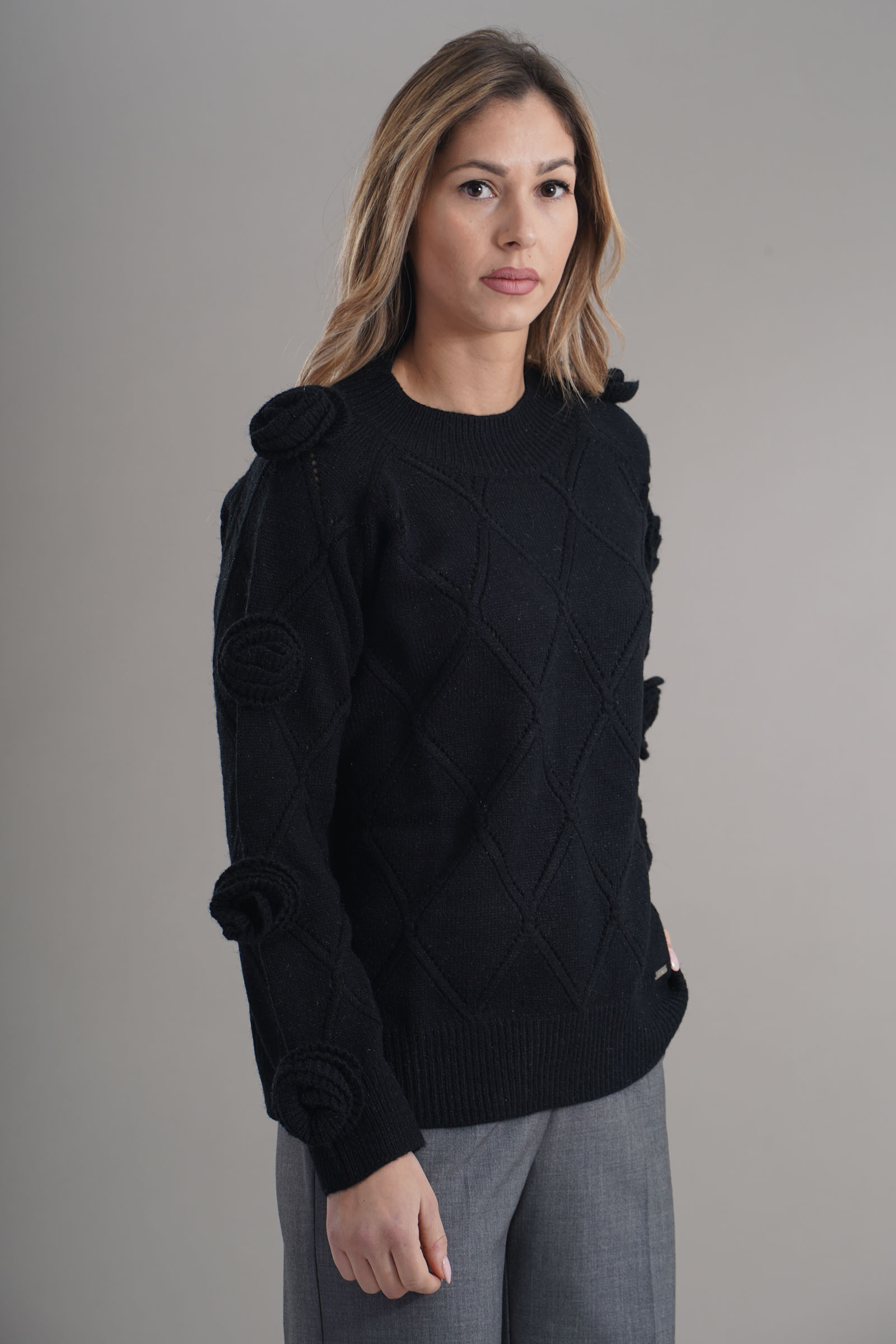 Vestibilita' regolare. Girocollo. Elastico sul fondo e sui polsini. Dettaglioi di fiori sulle maniche. Altezza modella 1,79. Nella foto indossa la taglia 42. Composizione: 65% Acrilico, 32% Poliestere, 3% Elastane. Brand: Lafty.Lie