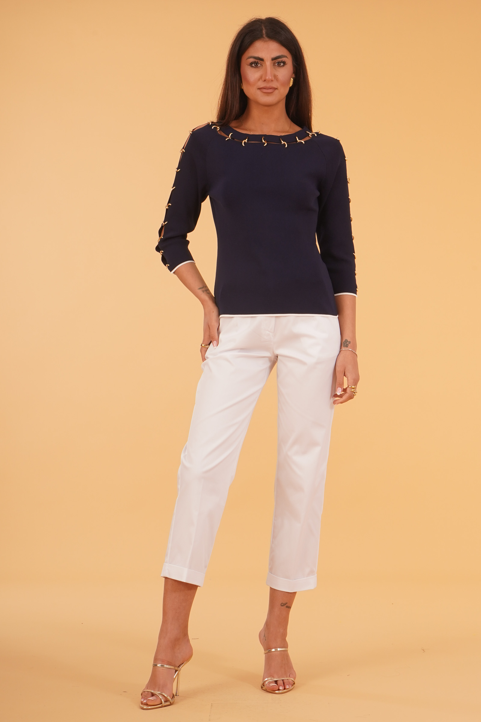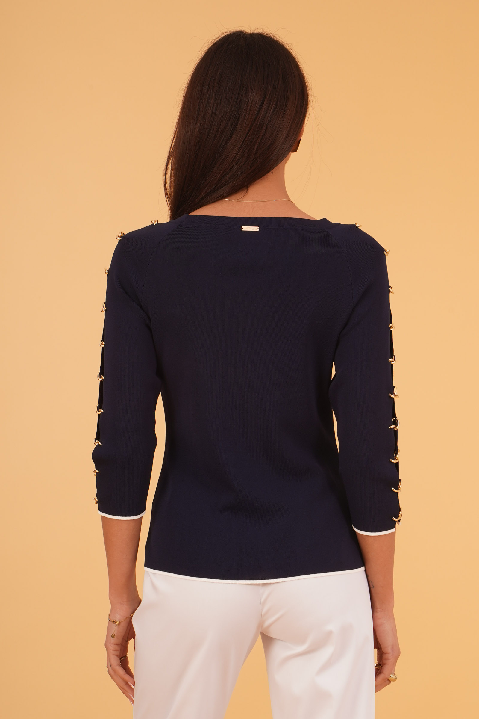 Vestibilita' regolare. Maniche 3/4 con dettagli di aperture piu' catene. Altezza modella 1,80. Indossa la taglia 40. Composizione: 65% Viscosa, 35% Poliammide. Brand: Lafty. Lie