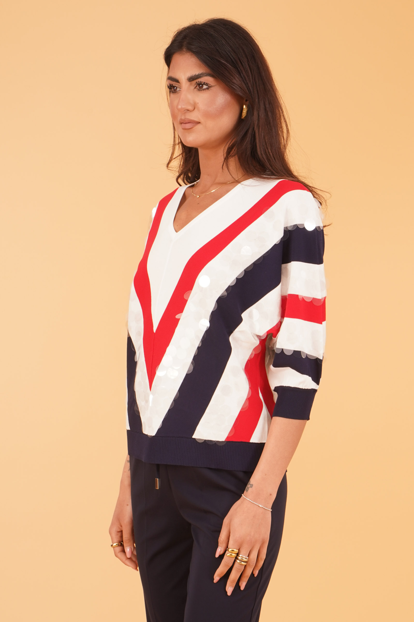 Vestibilita' comoda. Scolloa punta. Maniche 3/4. Dettaglio di paillettes trasparenti cucite. Altezza modella 1,80. Indossa taglia 40. Composizione: 55% Viscosa, 45% Poliammide. Brand: Lafty.Lie