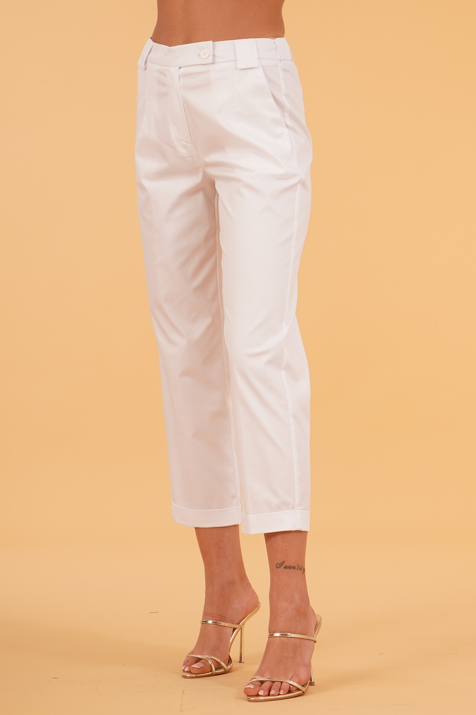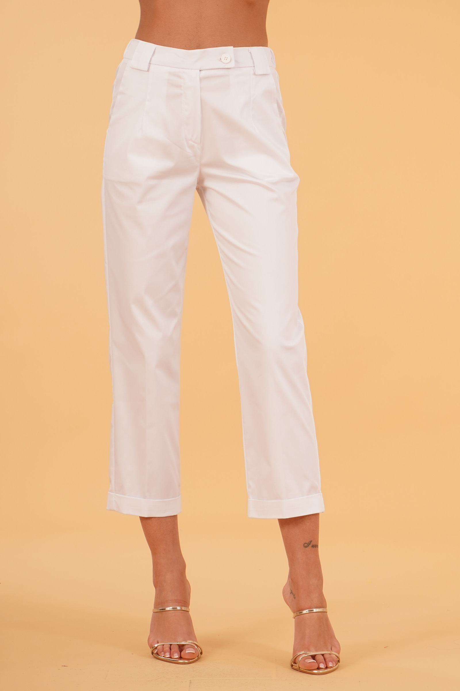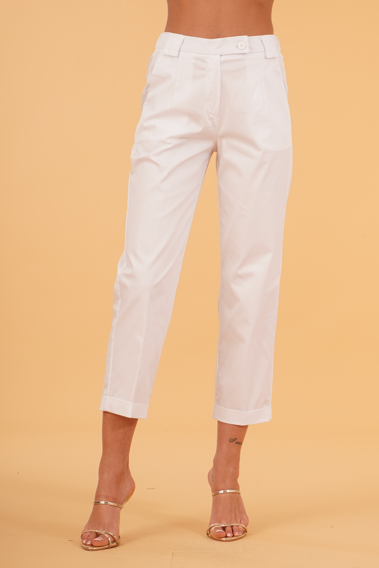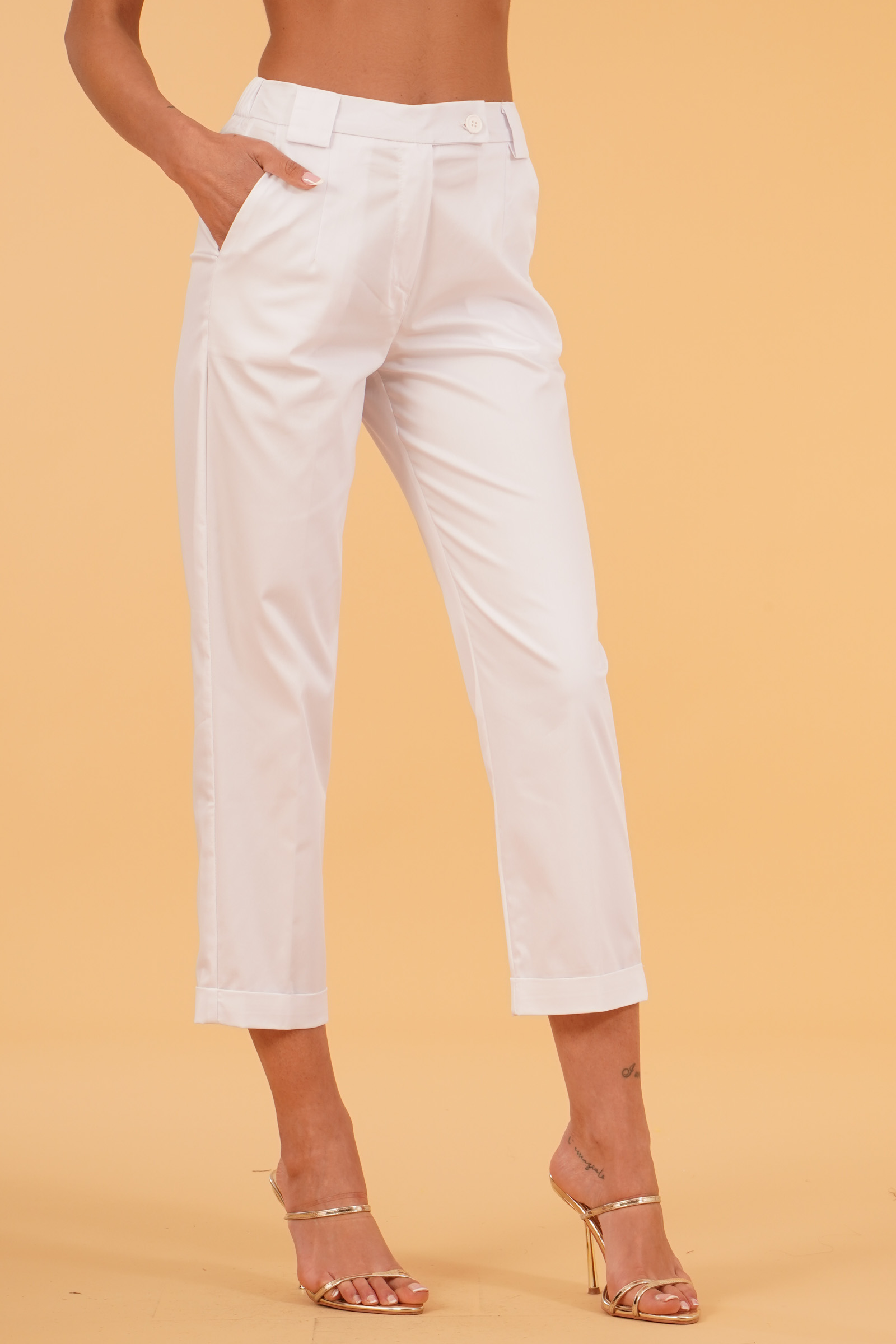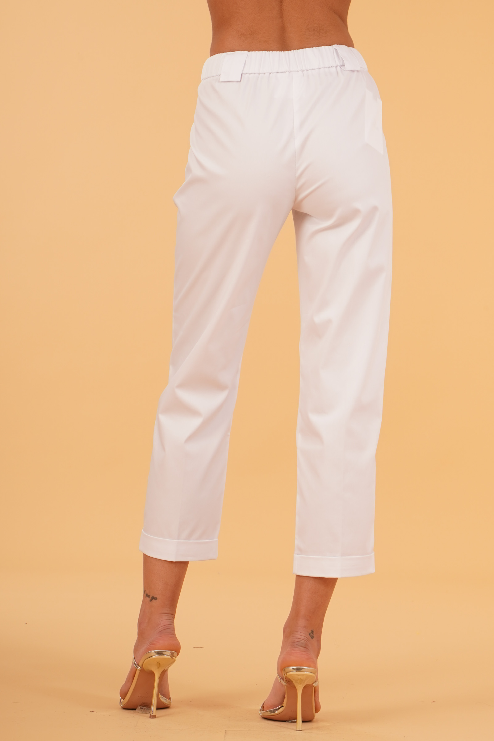 Vestibilita' regolare. Vita alta. Bustino con elastico posteriore. Chiusura con zip piu' bottoni. Tasche america. Risvolto sul fondo. Altezza modella 1,80. Indossa la taglia 40. Composizione: 71% Cotone, 26% Nylon. Brand: Lafty. Lie