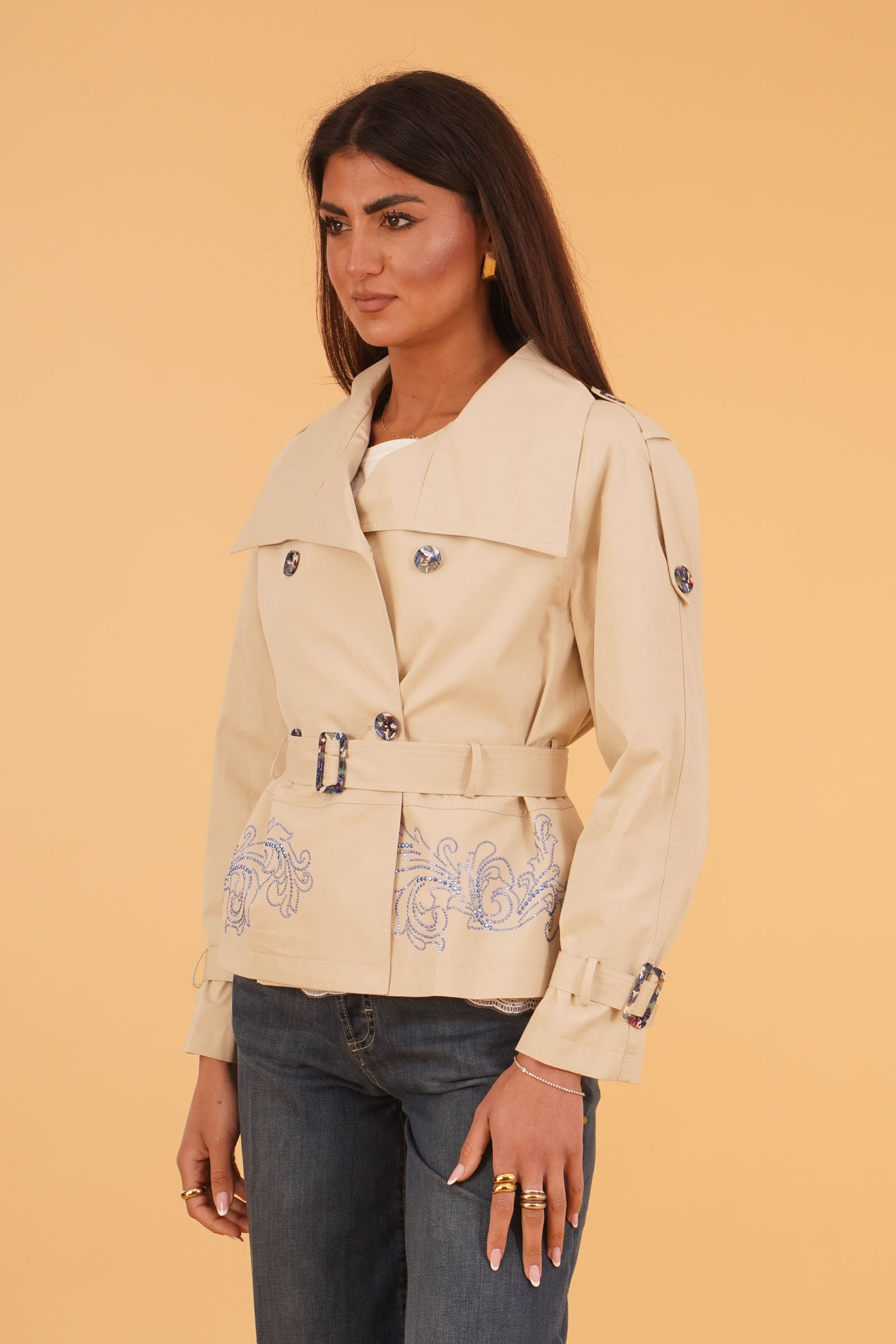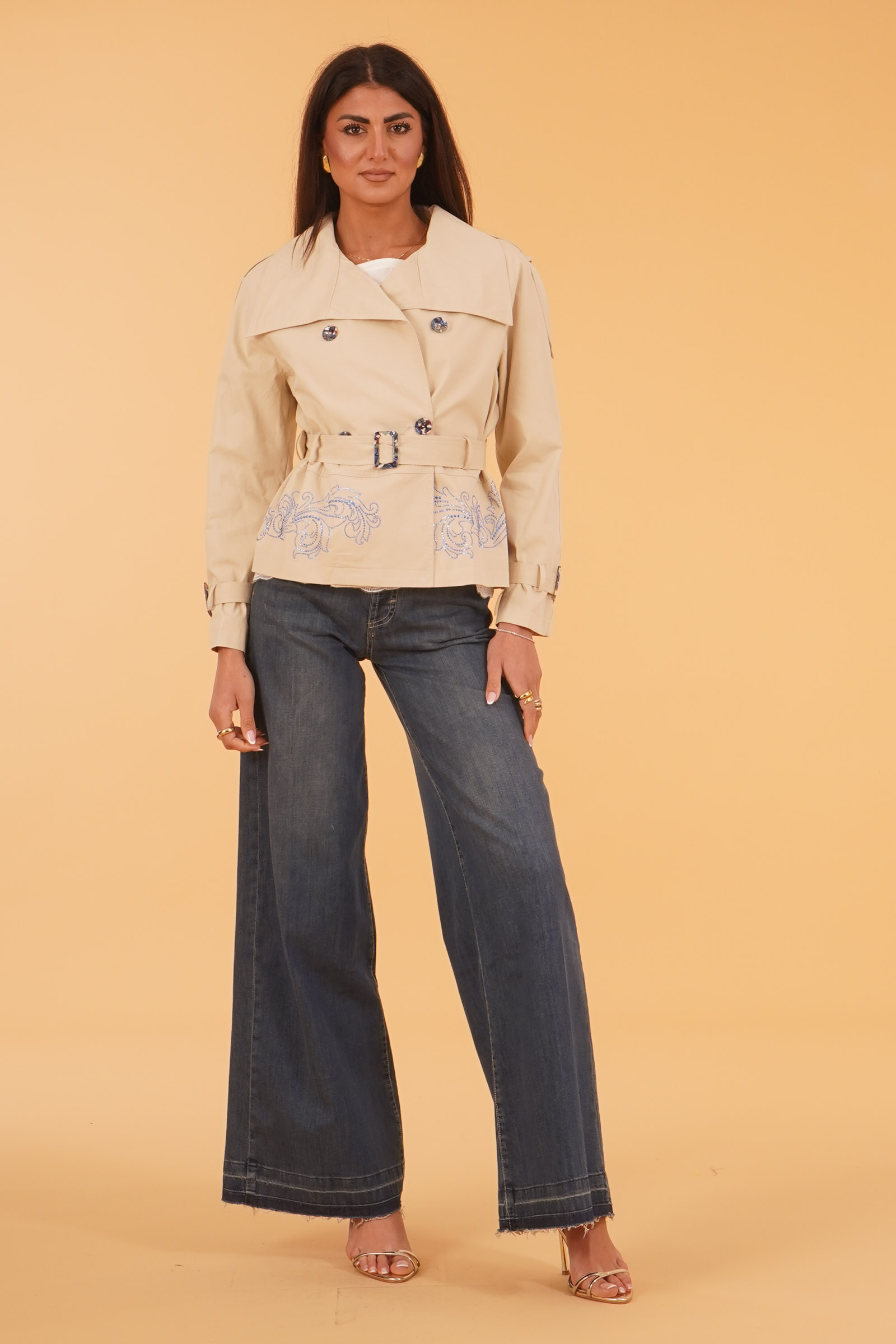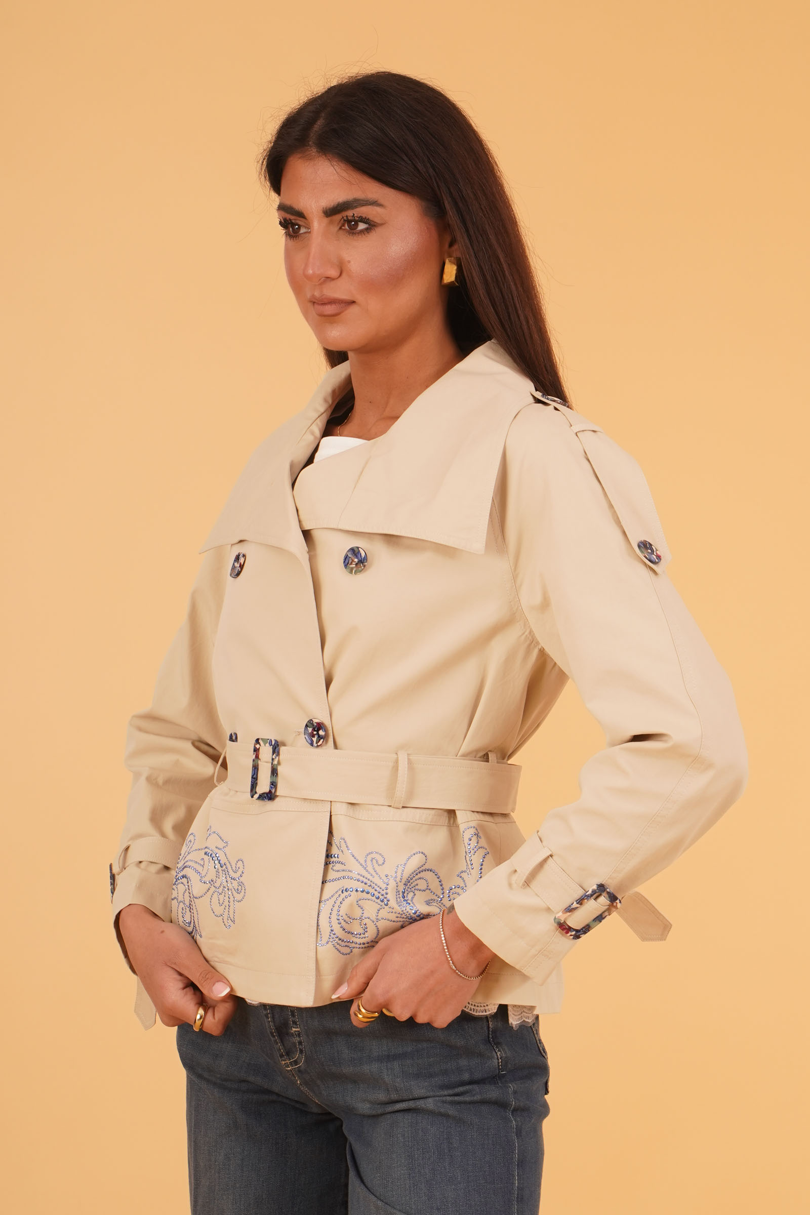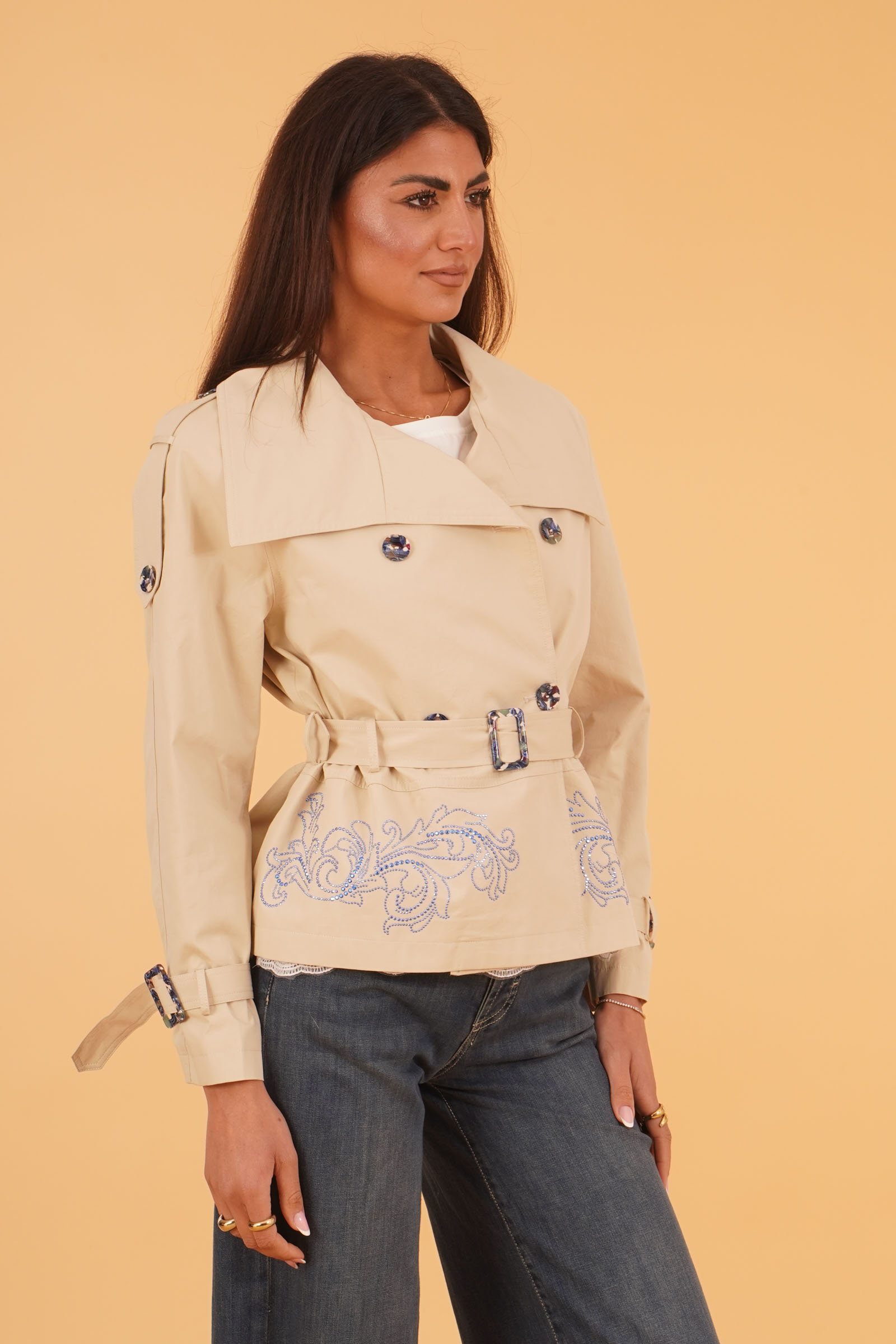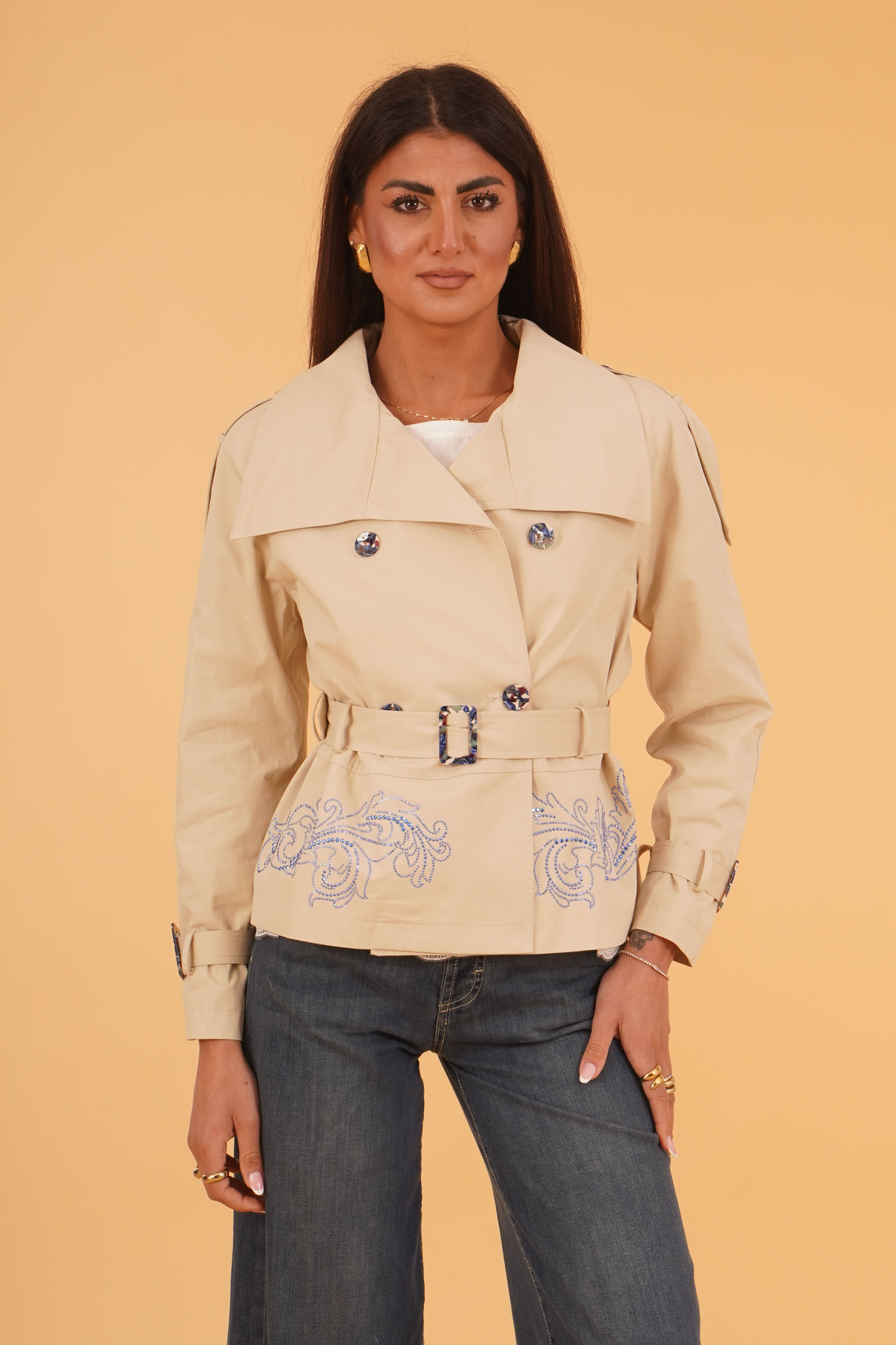Vestibilita' regolare. Chiusura doppio petto. Cintura removibile. Dettagli di cristalli blu sul fondo. Altezza modella 1,80. Indossa la taglia 40. Composizione: 100% Cotone. Brand: Lanacaprina