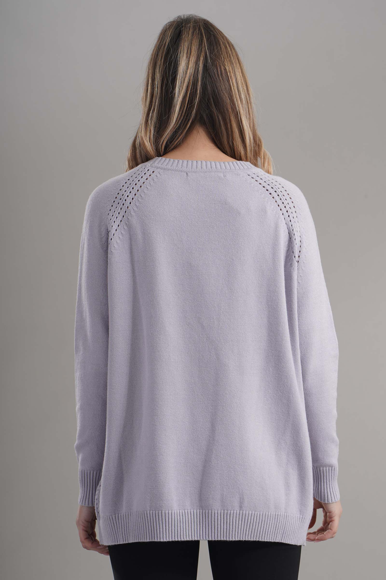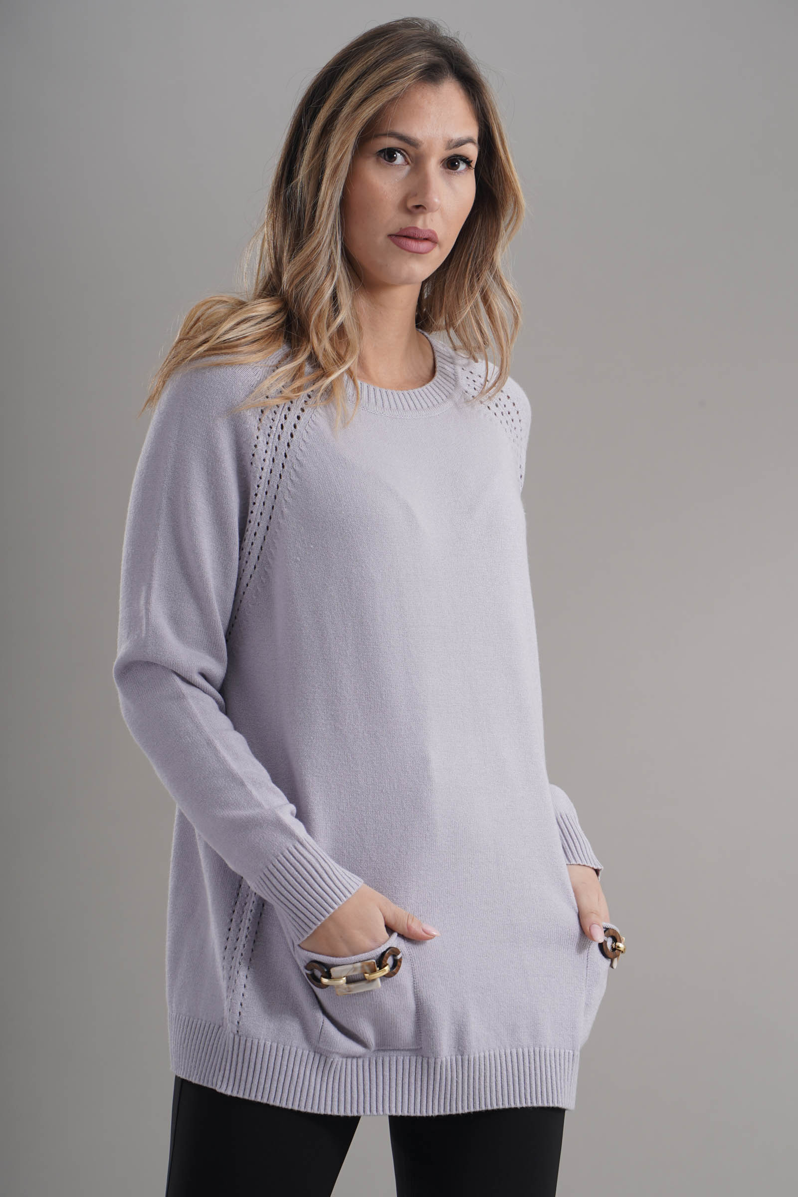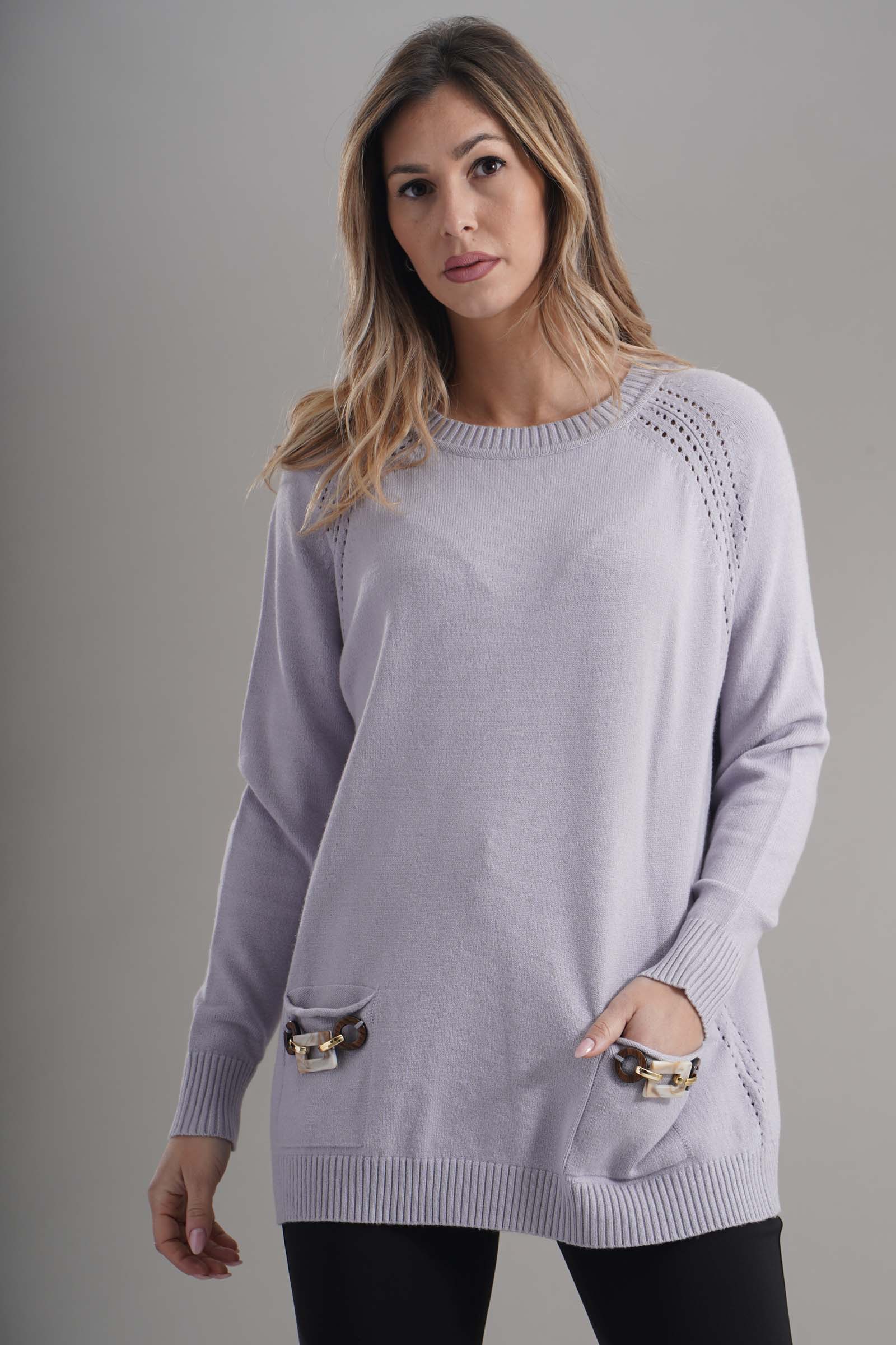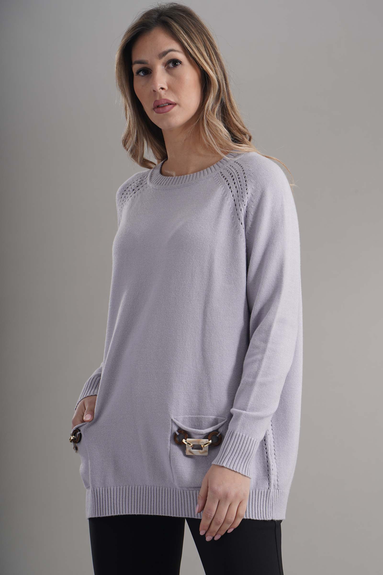 Vestibilita' comoda. Girocollo. Elastico sul fondo e sui polsini. Dettaglio di tasche anteriori con gioiello applicato. Altezza modella 1,79. Nella foto indossa la taglia S. Composizione: 55% Viscosa, 29% Poliestere, 16% Nylon. Brand: Lana Caprina