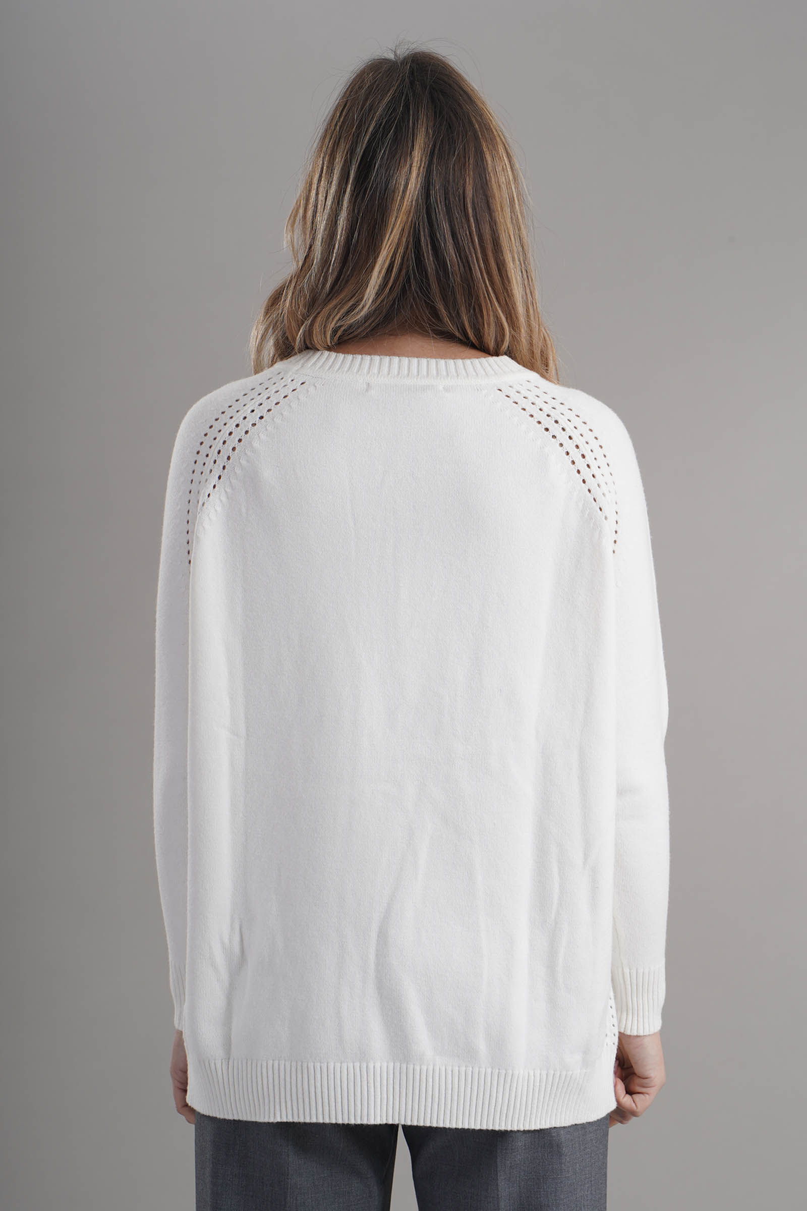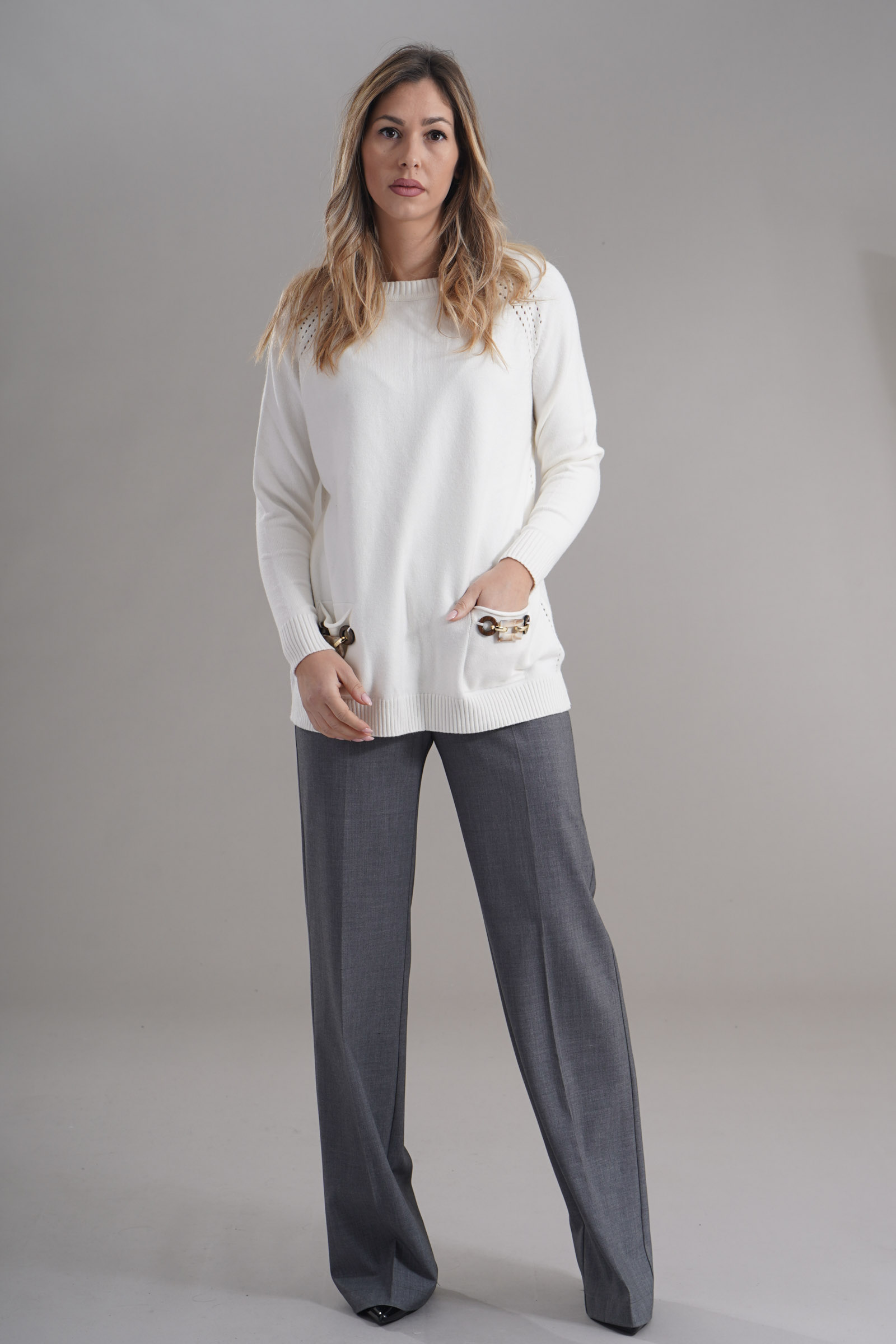 Vestibilita' comoda. Girocollo. Elastico sul fondo e sui polsini. Dettaglio di tasche anteriori con gioiello applicato. Altezza modella 1,79. Nella foto indossa la taglia S. Composizione: 55% Viscosa, 29% Poliestere, 16% Nylon. Brand: Lana Caprina