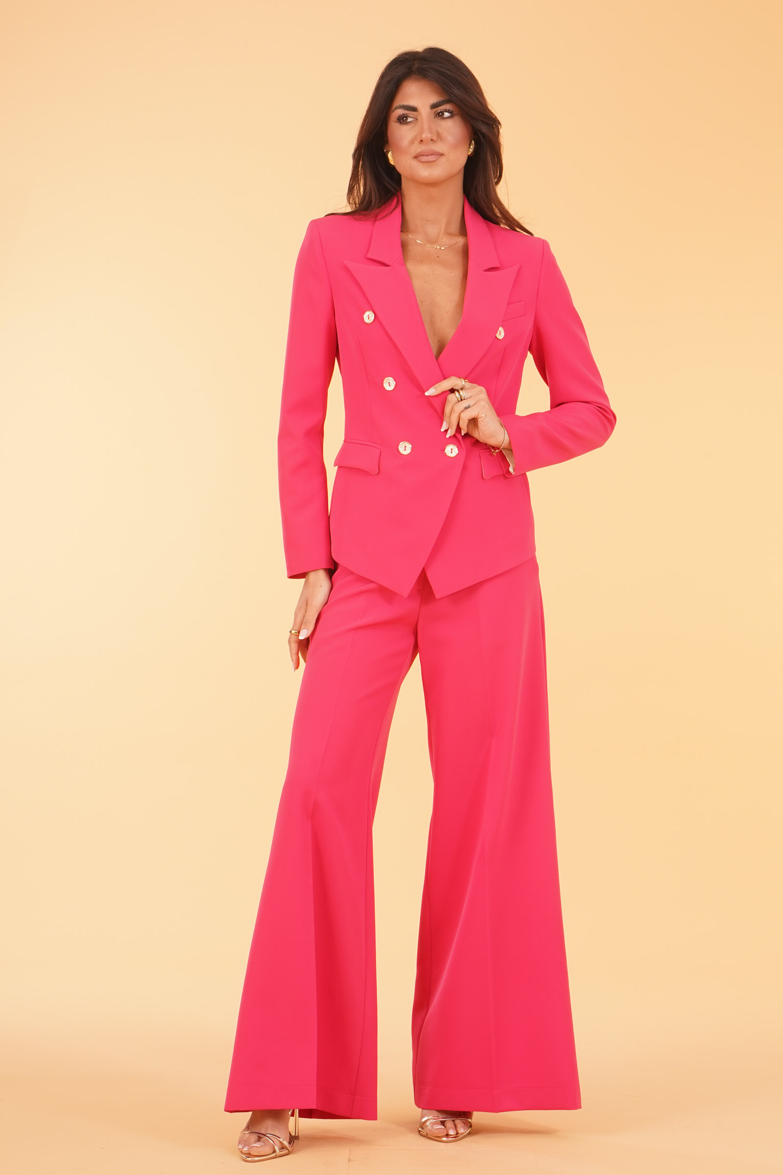 Vestibilita' regolare. Giacca doppiopetto con bottoni color oro. Pantalone palazzo con tasche america. Altezza modella 1,80. Indossa la taglia 42. Composizione: 89% Poliestere, 11% Elastane. Brand: Lanacaprina