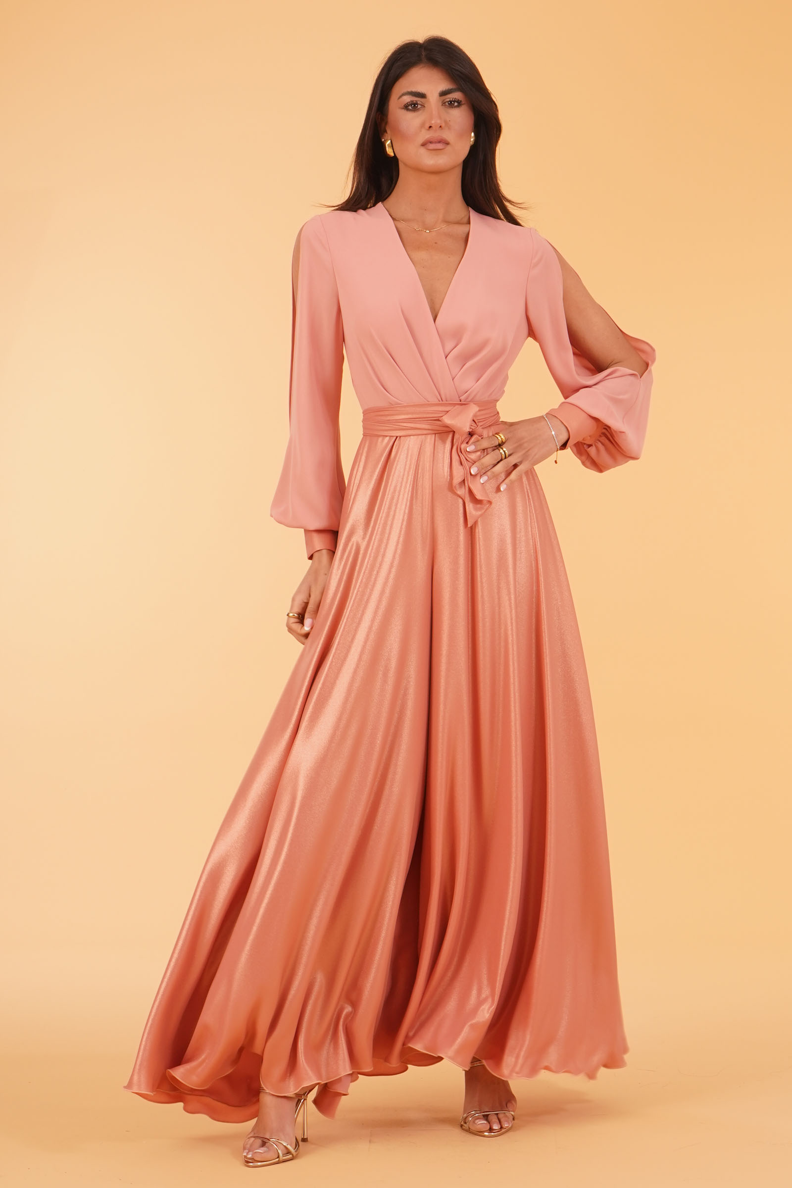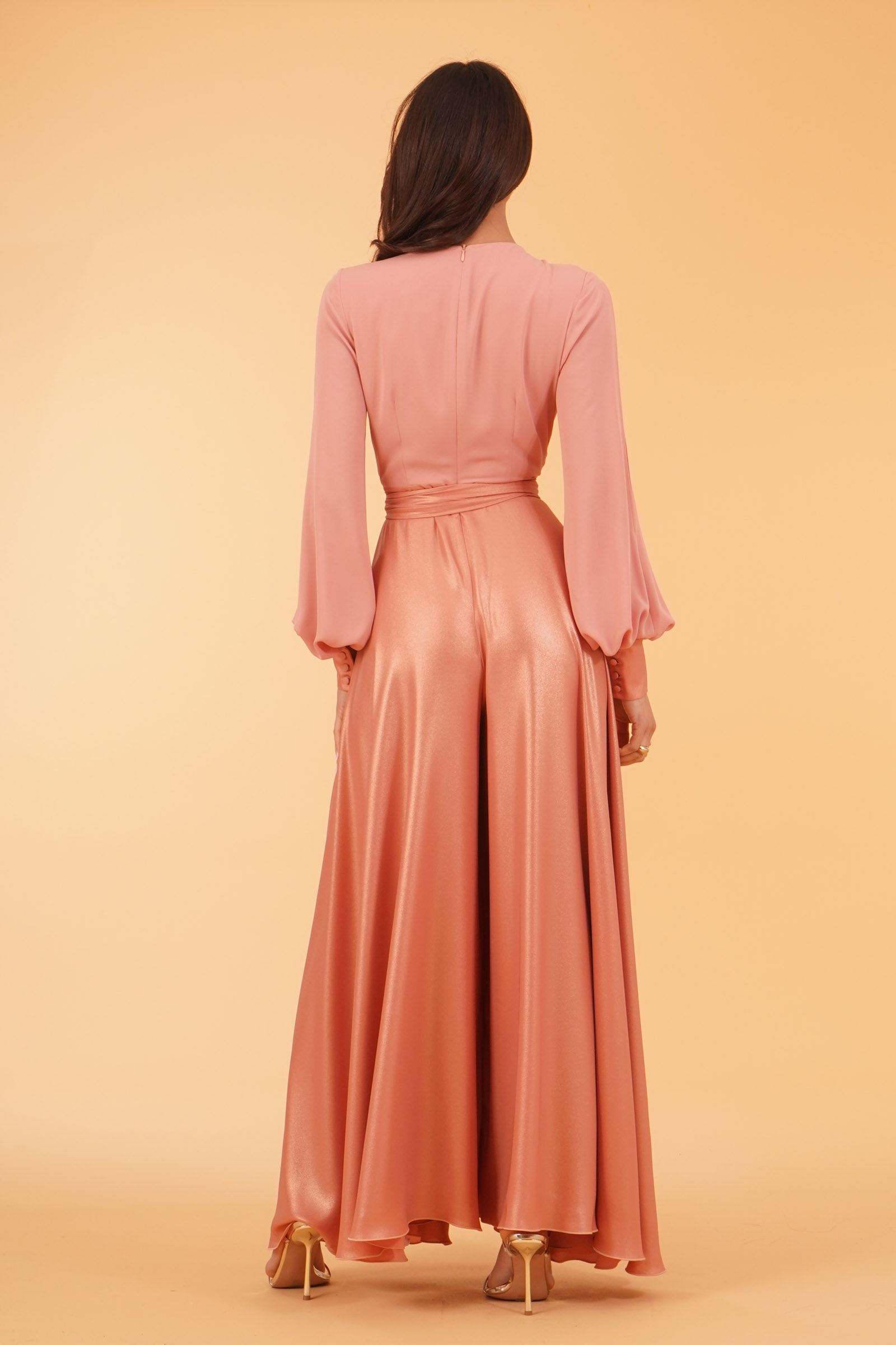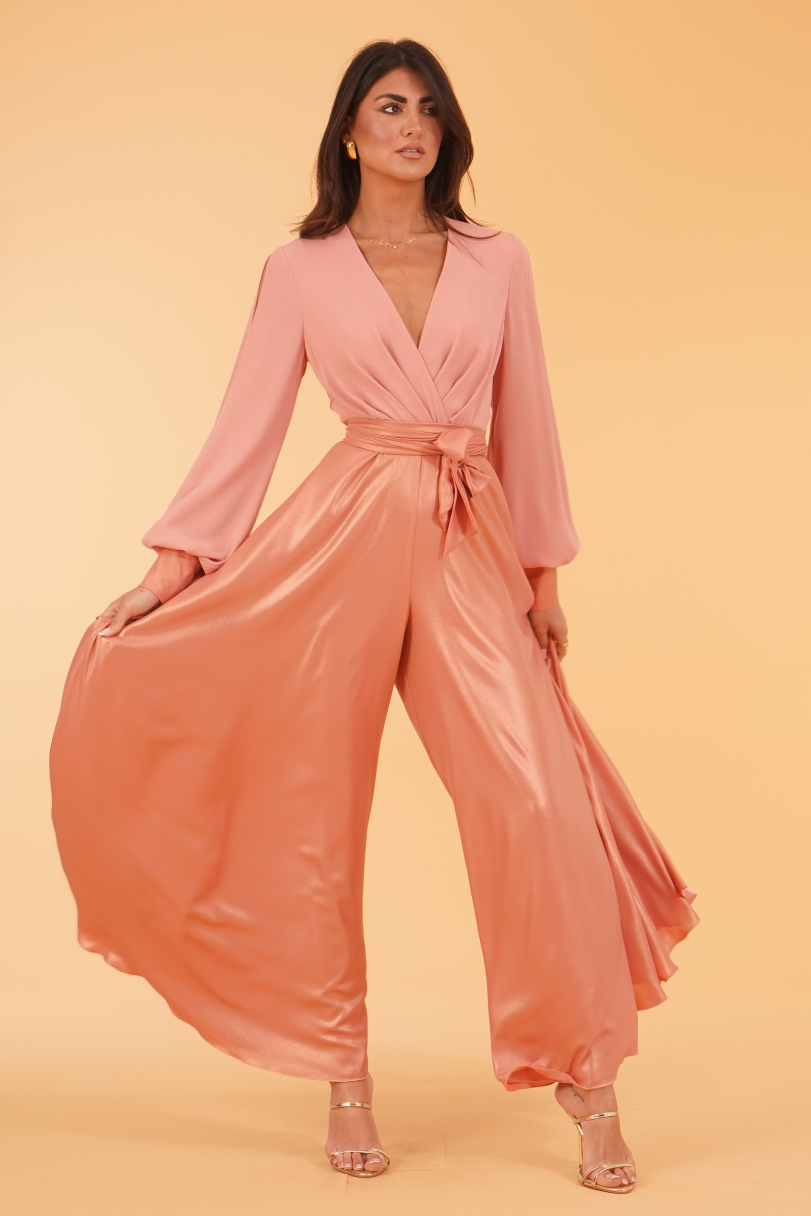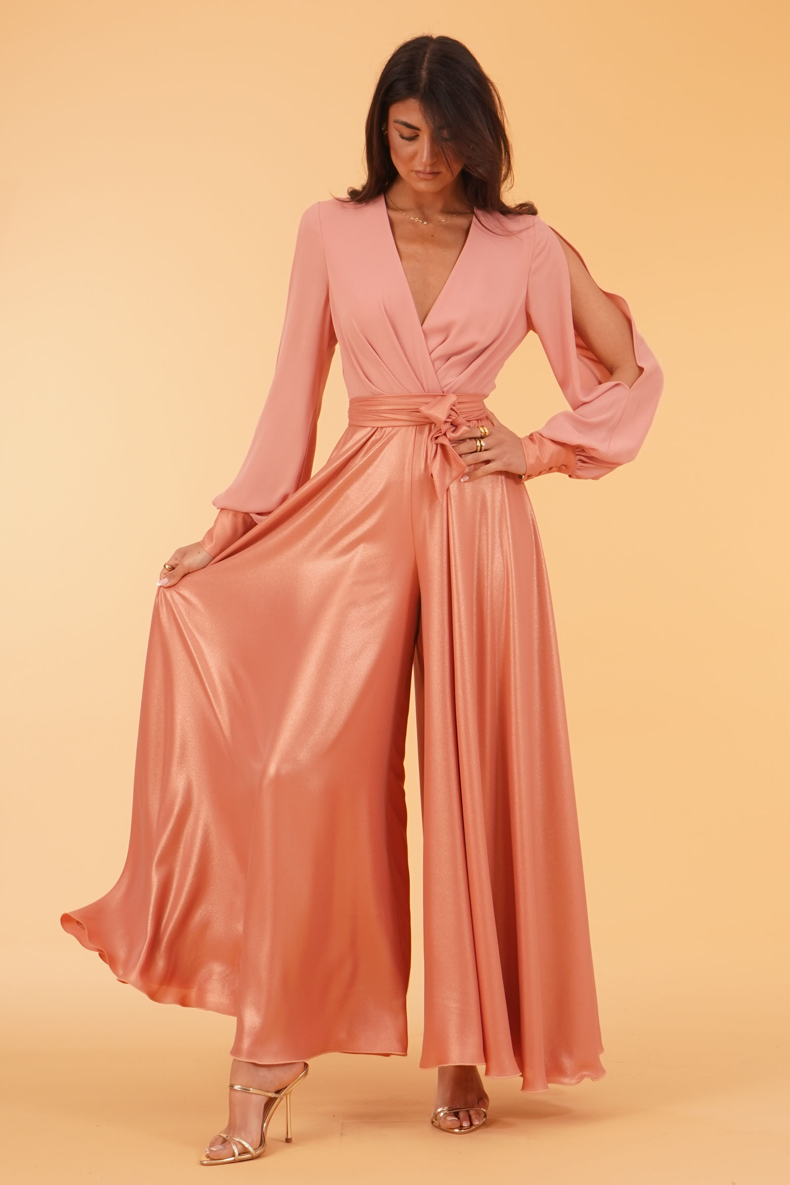 Vestibilita' regolare. Pantagonna vita alta in tessuto laminato. Cintura removibile. Casacca con manica a sbuffo piu' aperture sulle braccia. Scollo ad incrocio. Spilla non inclusa. Altezza modella 1,80. Indossa taglia 40. Composizione: 100% Poliestere. Brand: Le Rjtange