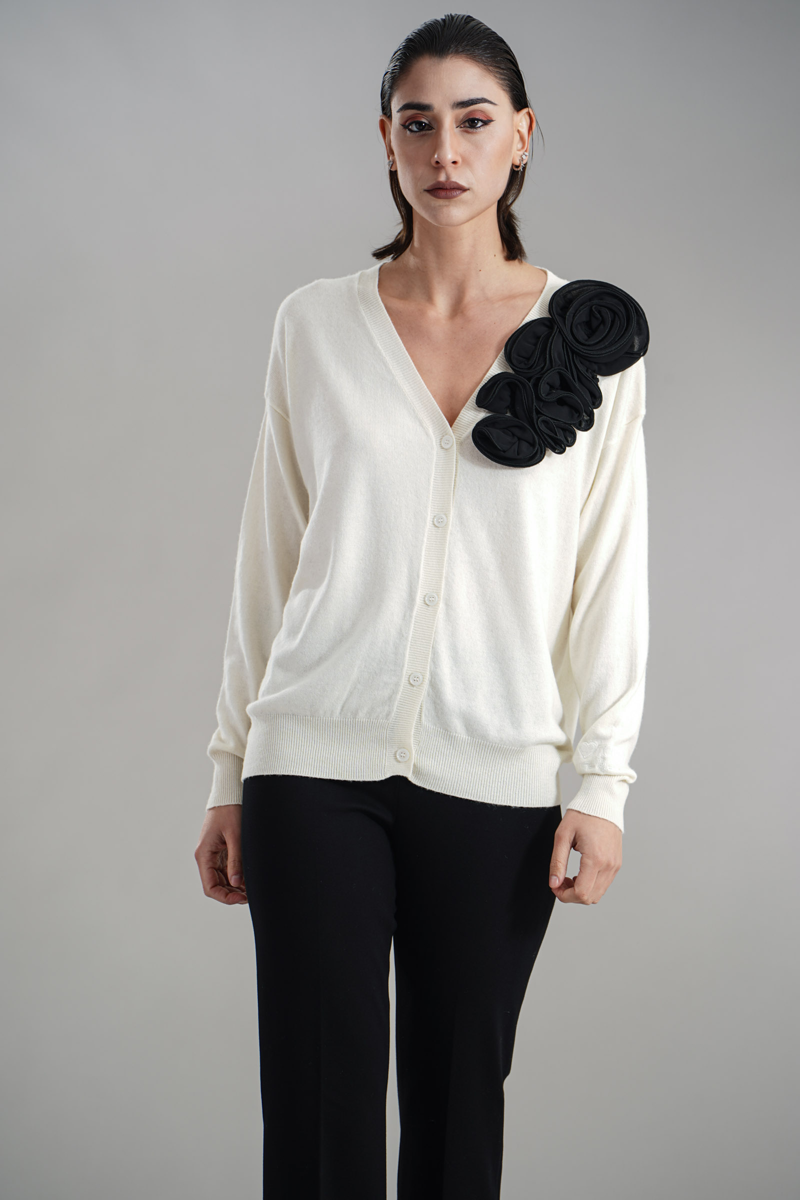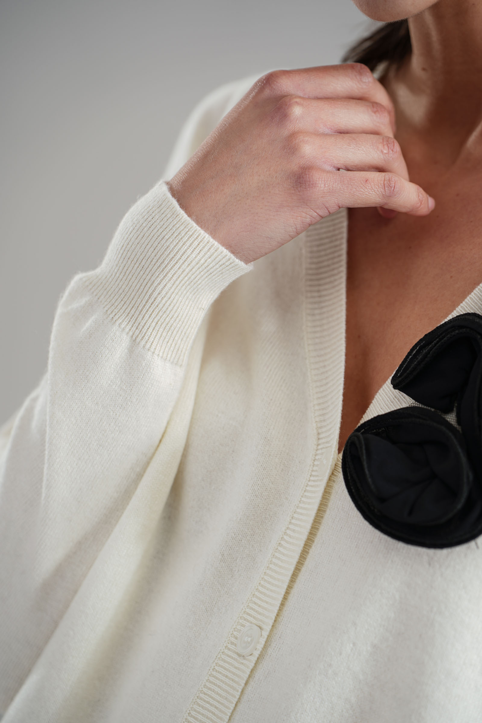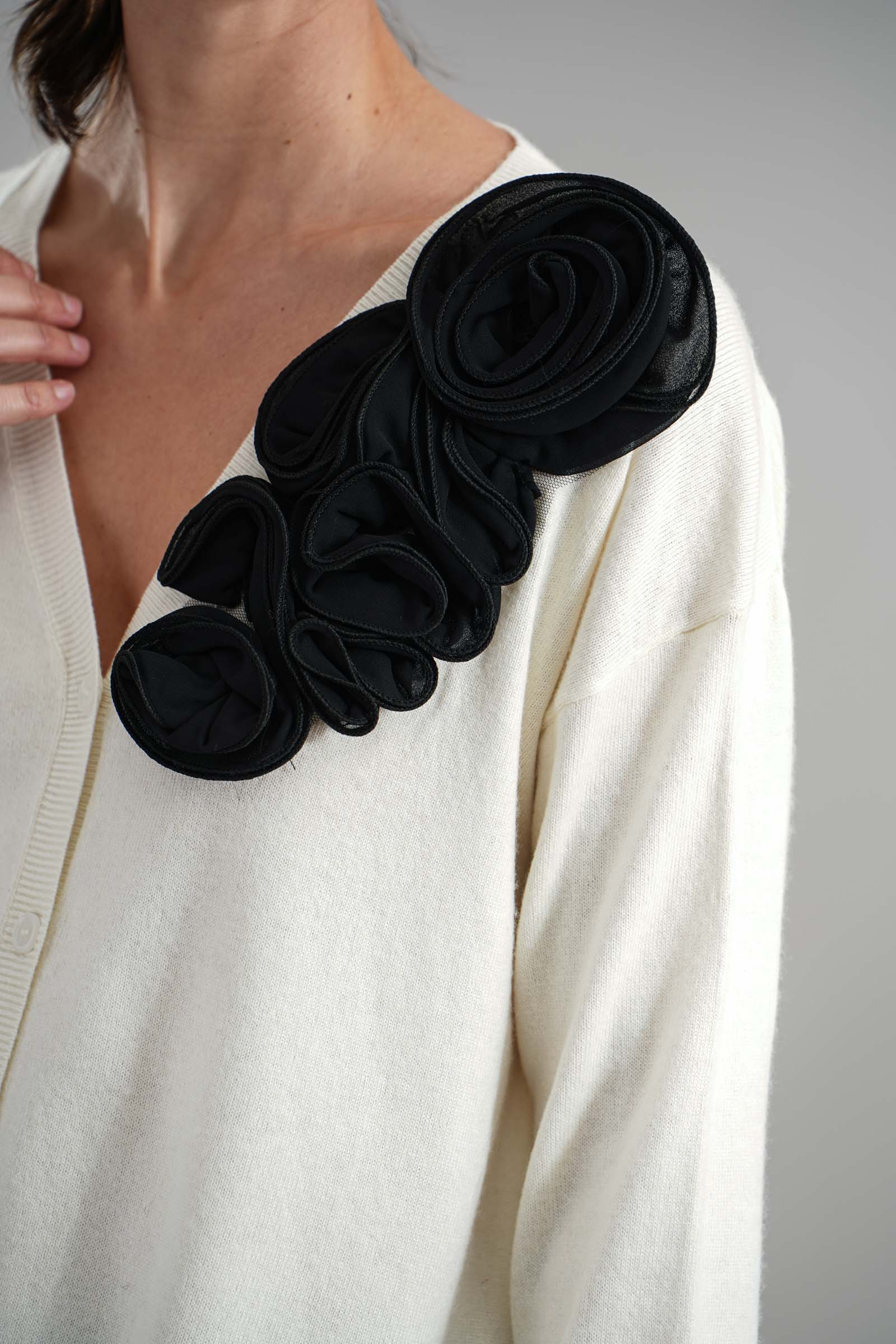Vestibilita' comoda. Chiusura con bottoni. Elastico sul fondo e sui polsini. Dettaglio di rouches applicati. Altezza modella 1,82. Nella foto indossa la taglia S. Composizione: 50% Nylon, 30% Viscosa, 20% Cashmere. Brand: Love to Love By Gai Mattiolo