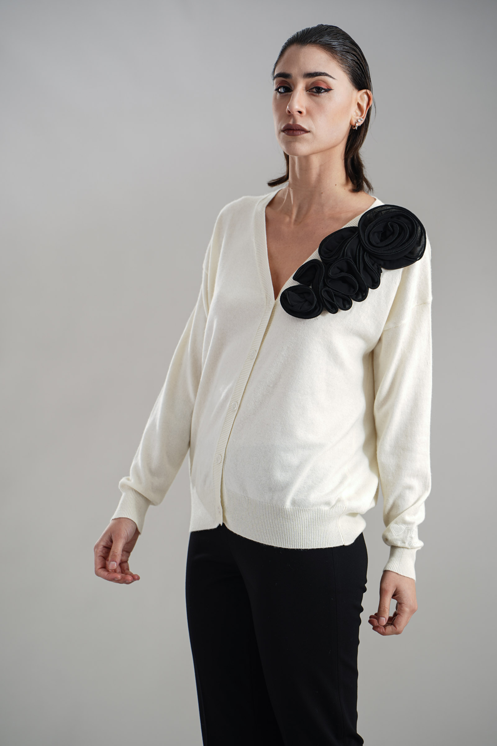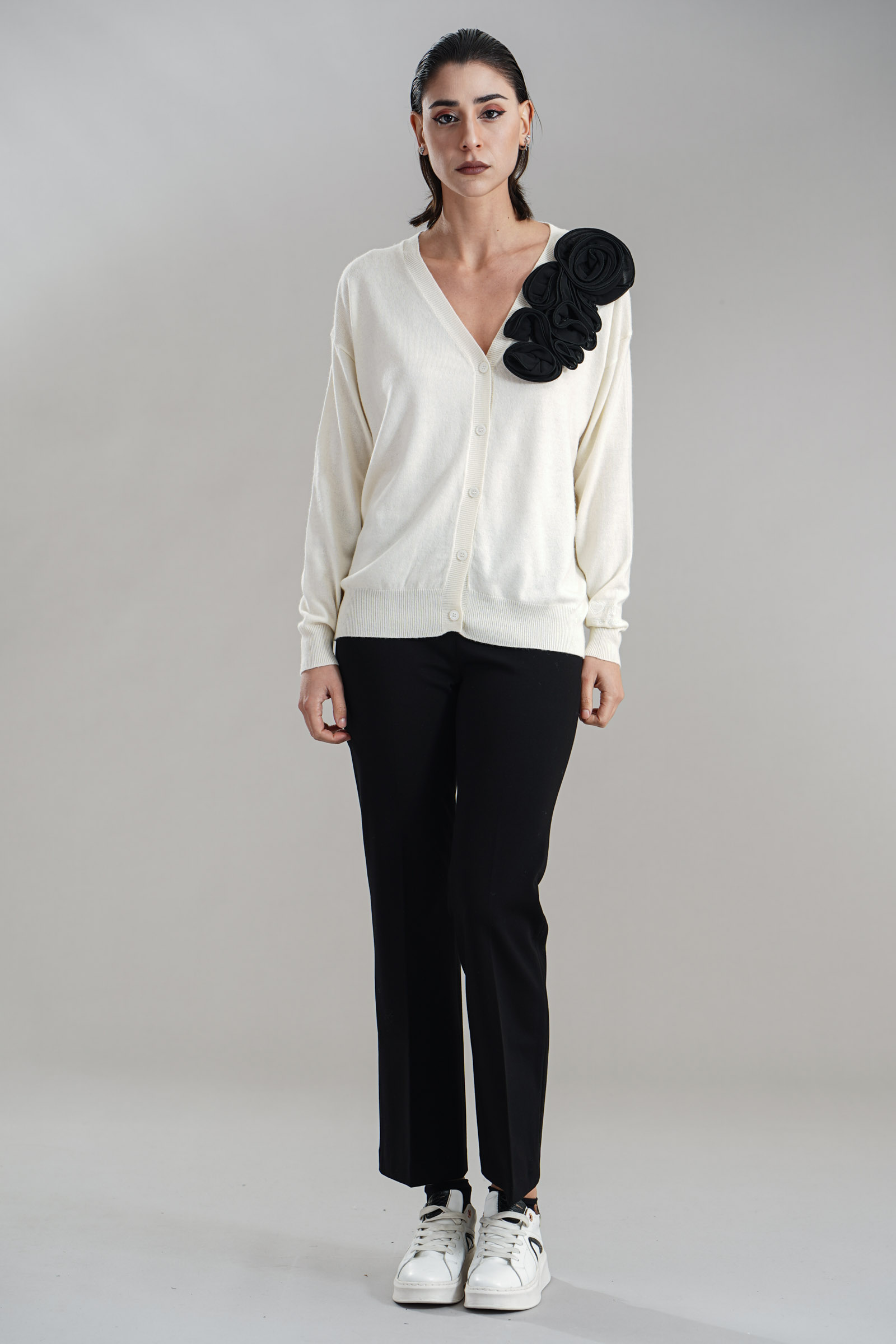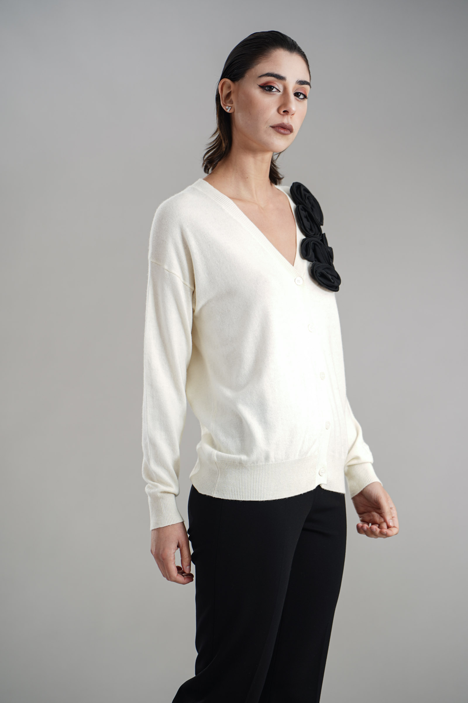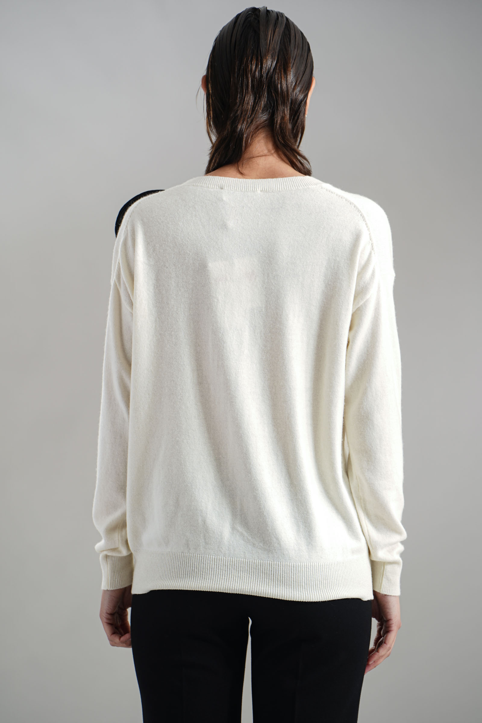 Vestibilita' comoda. Chiusura con bottoni. Elastico sul fondo e sui polsini. Dettaglio di rouches applicati. Altezza modella 1,82. Nella foto indossa la taglia S. Composizione: 50% Nylon, 30% Viscosa, 20% Cashmere. Brand: Love to Love By Gai Mattiolo