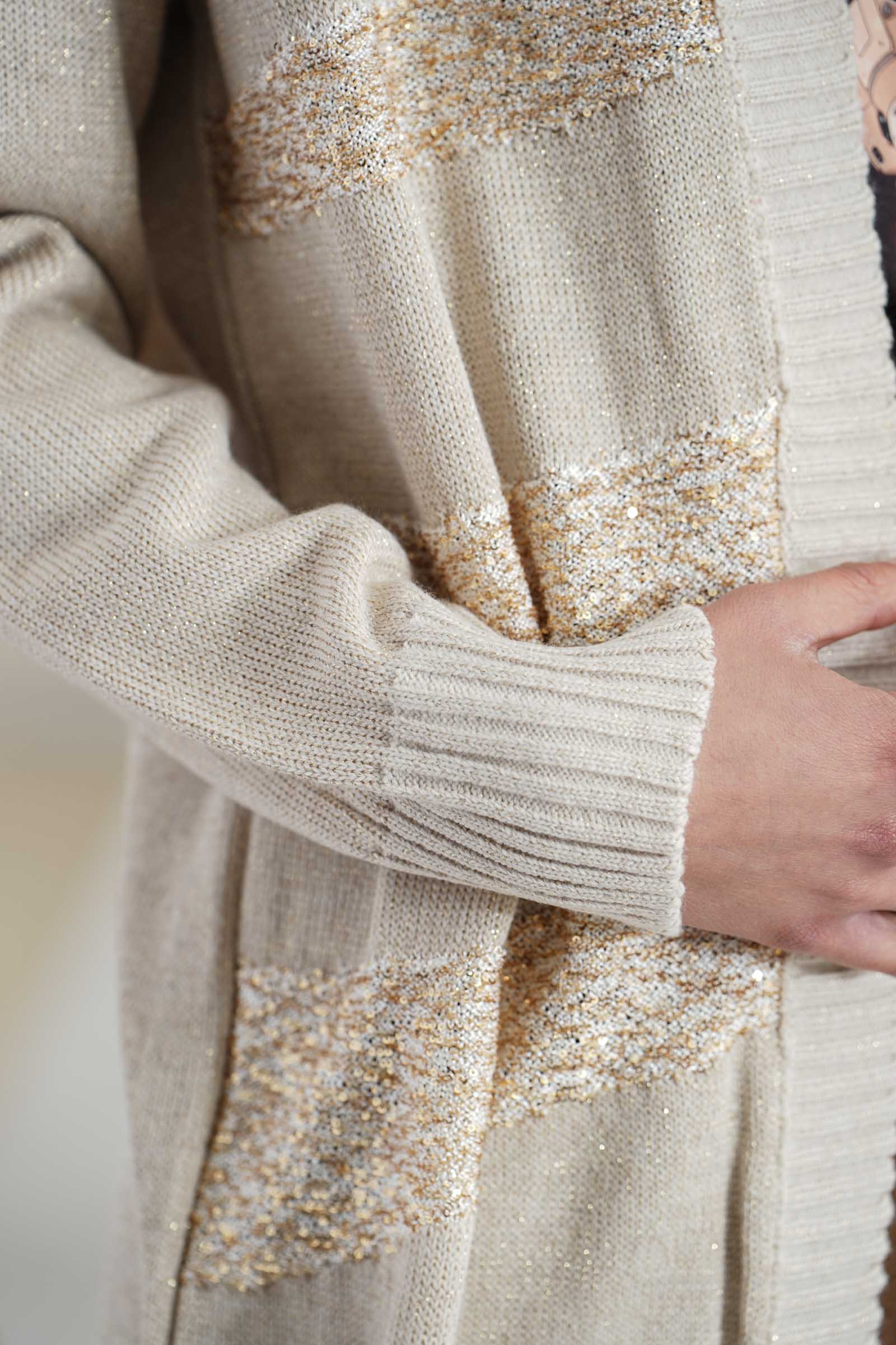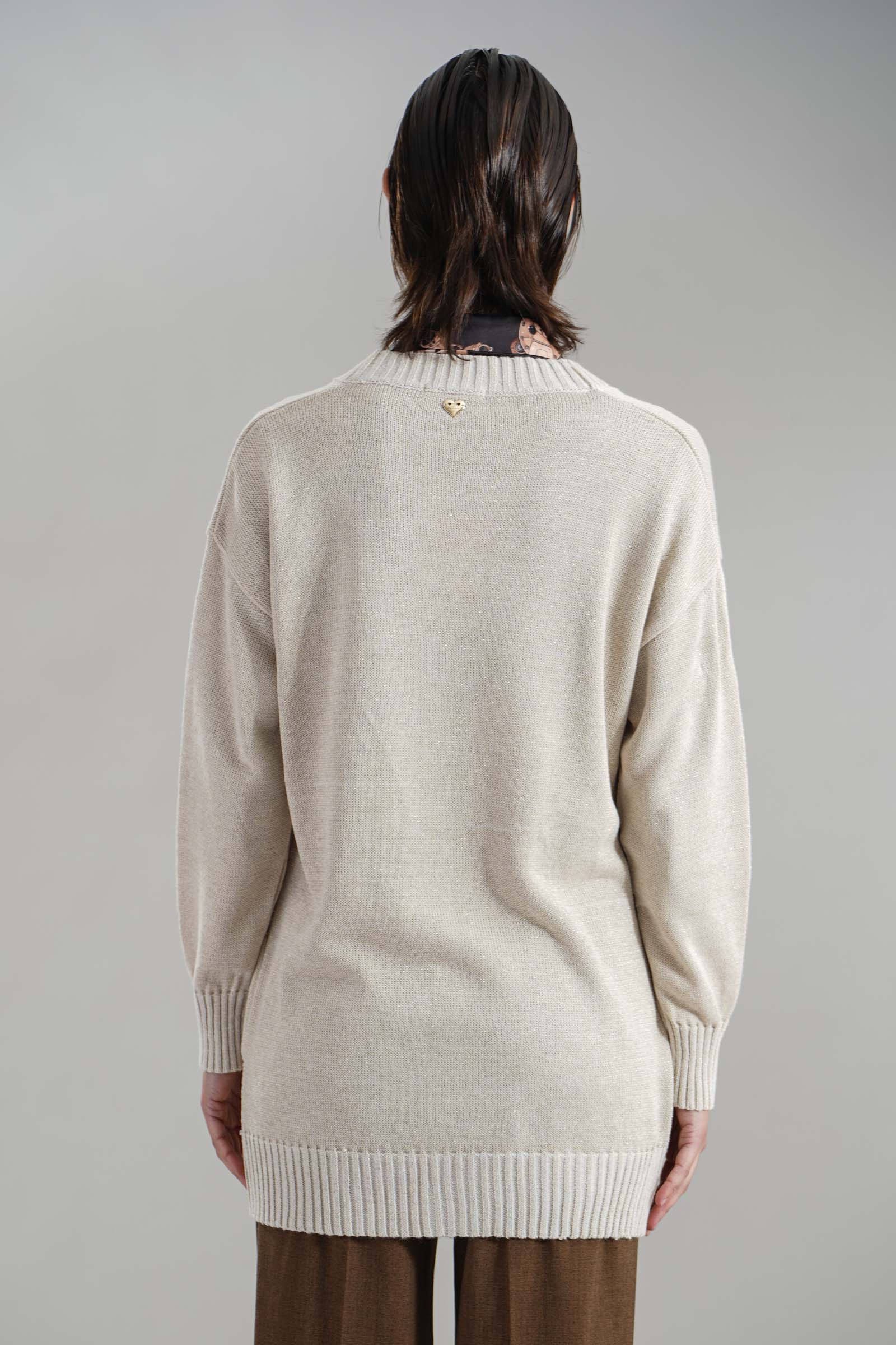 Vestibilita' comoda. Polsino elastico. Dettaglio di lurex piu' pailettes. Altezza modella 1,82. Nella foto ndossa la taglia 40. Composizione: 35% Lana, 35% Acrilico, 30% Pailettes. Brand: Love to Love By Gai Mattiolo