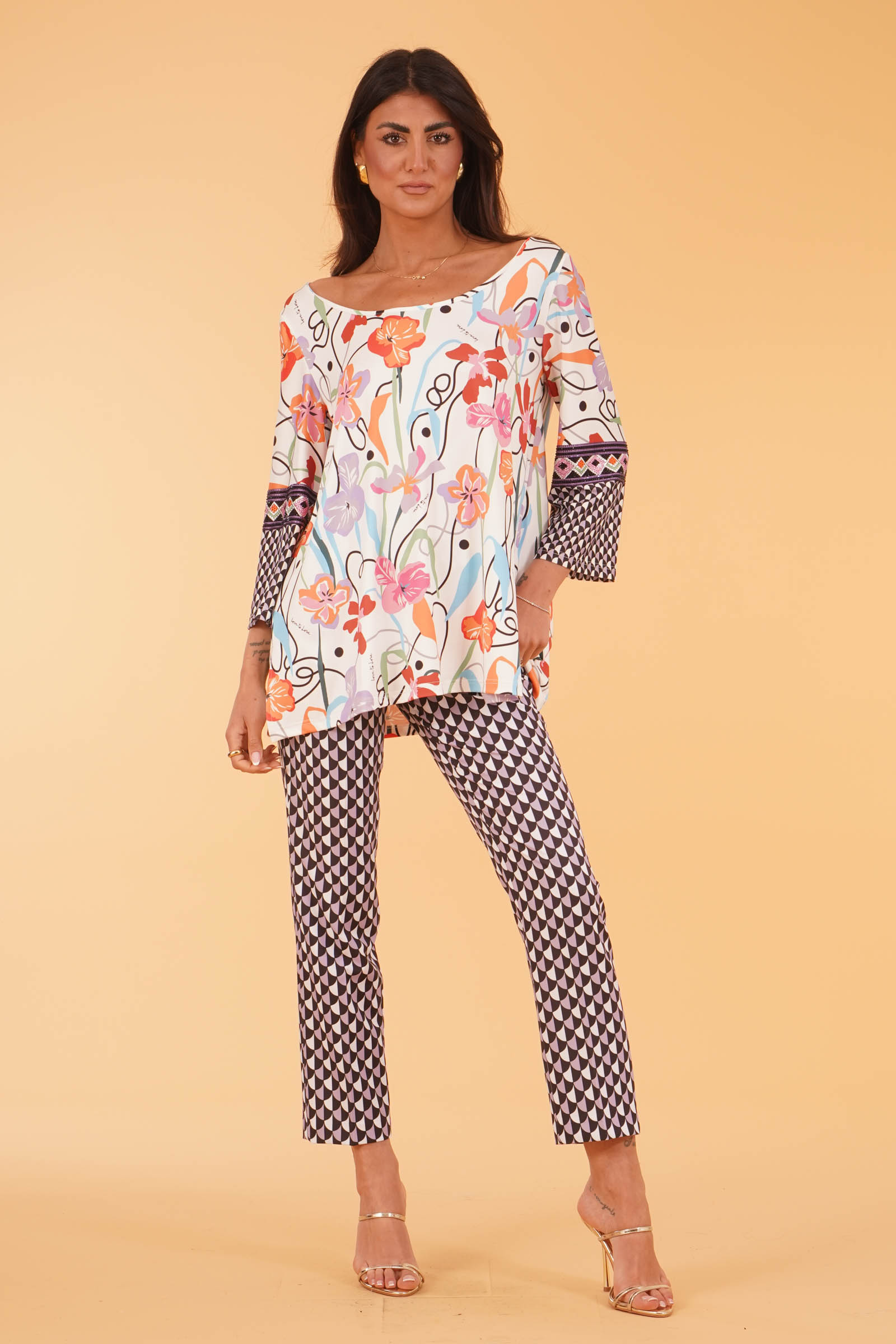 Vestibilita' comoda. Manica a 3/4 con dettagli di strass. Spacchetti laterali. Altezza modella 1,80. Indossa la taglia 42. Composizione: 65% Viscosa, 25% Poliestere, 10% Elastane. Brand: Love To Love by Gai Mattiolo