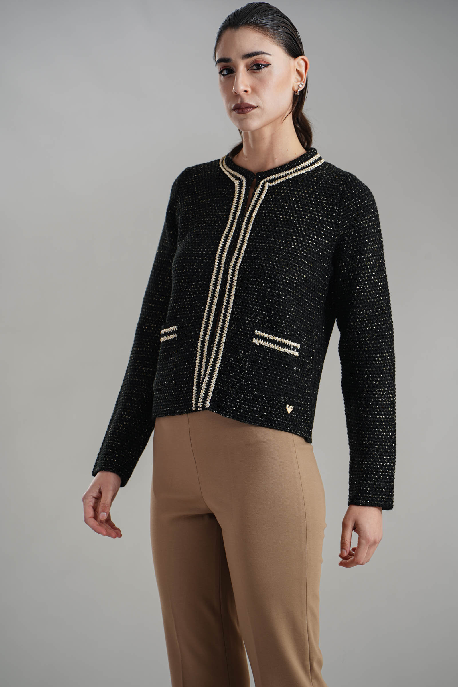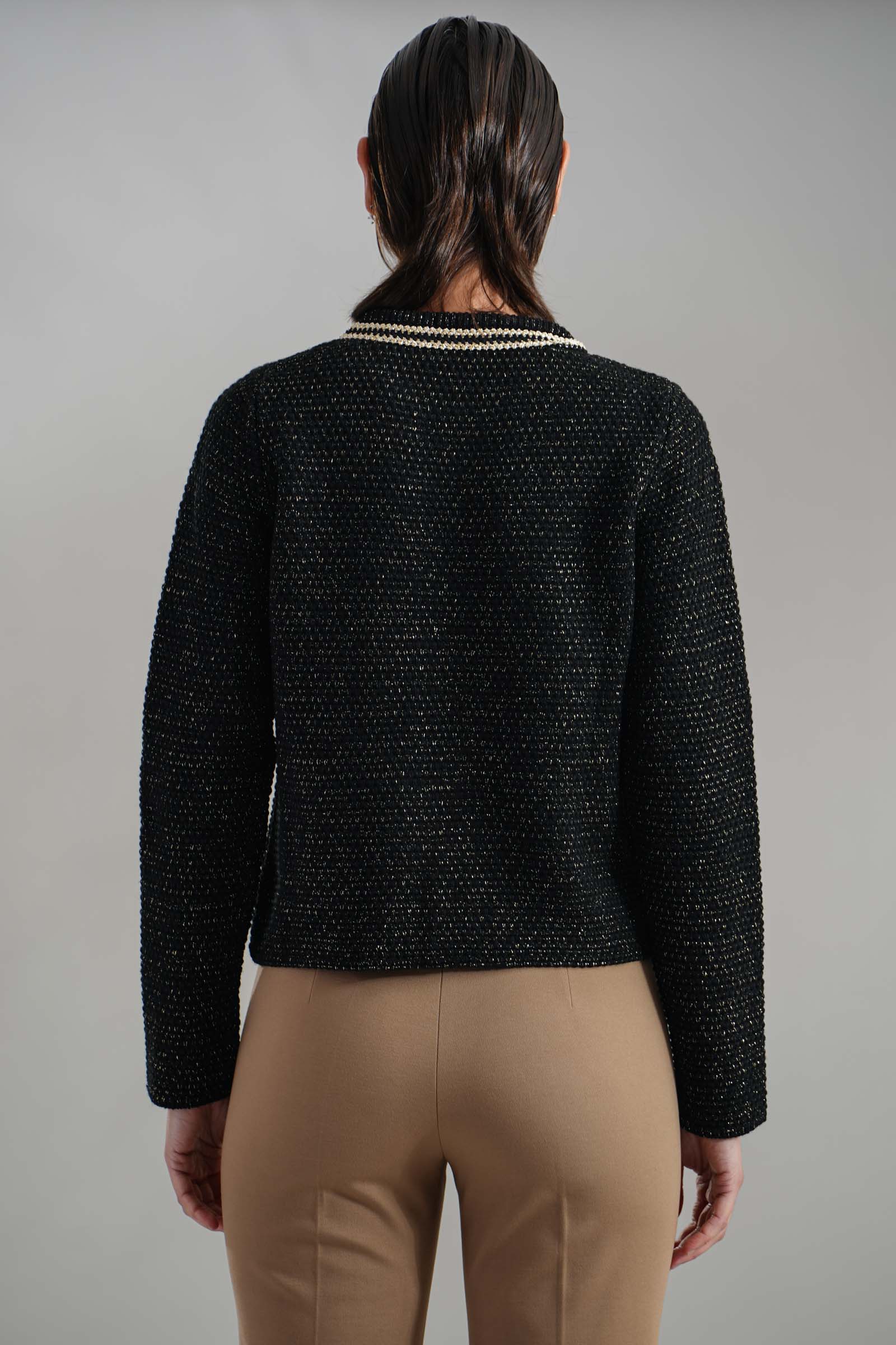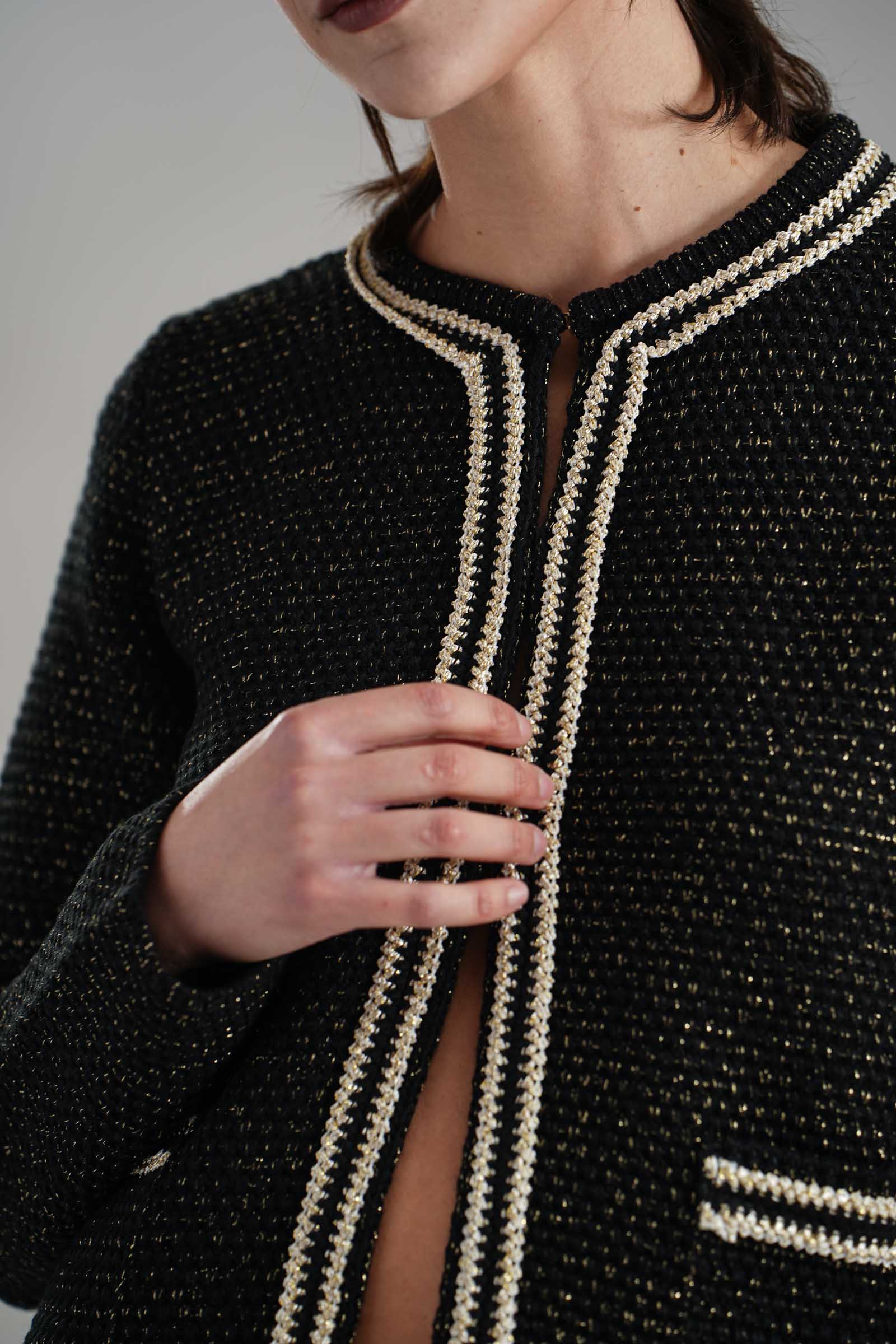 Vestibilita' regolare. Chiusura con ganci. Tasche anteriori. Dettaglio di filato laminato. Altezza modella 1,82. Nella foto indossa la taglia S. Composizione: 45% Lana, 45% Acrilico, 10% Fibra Metallizzata. Brand: Love To Love By Gai Mattiolo