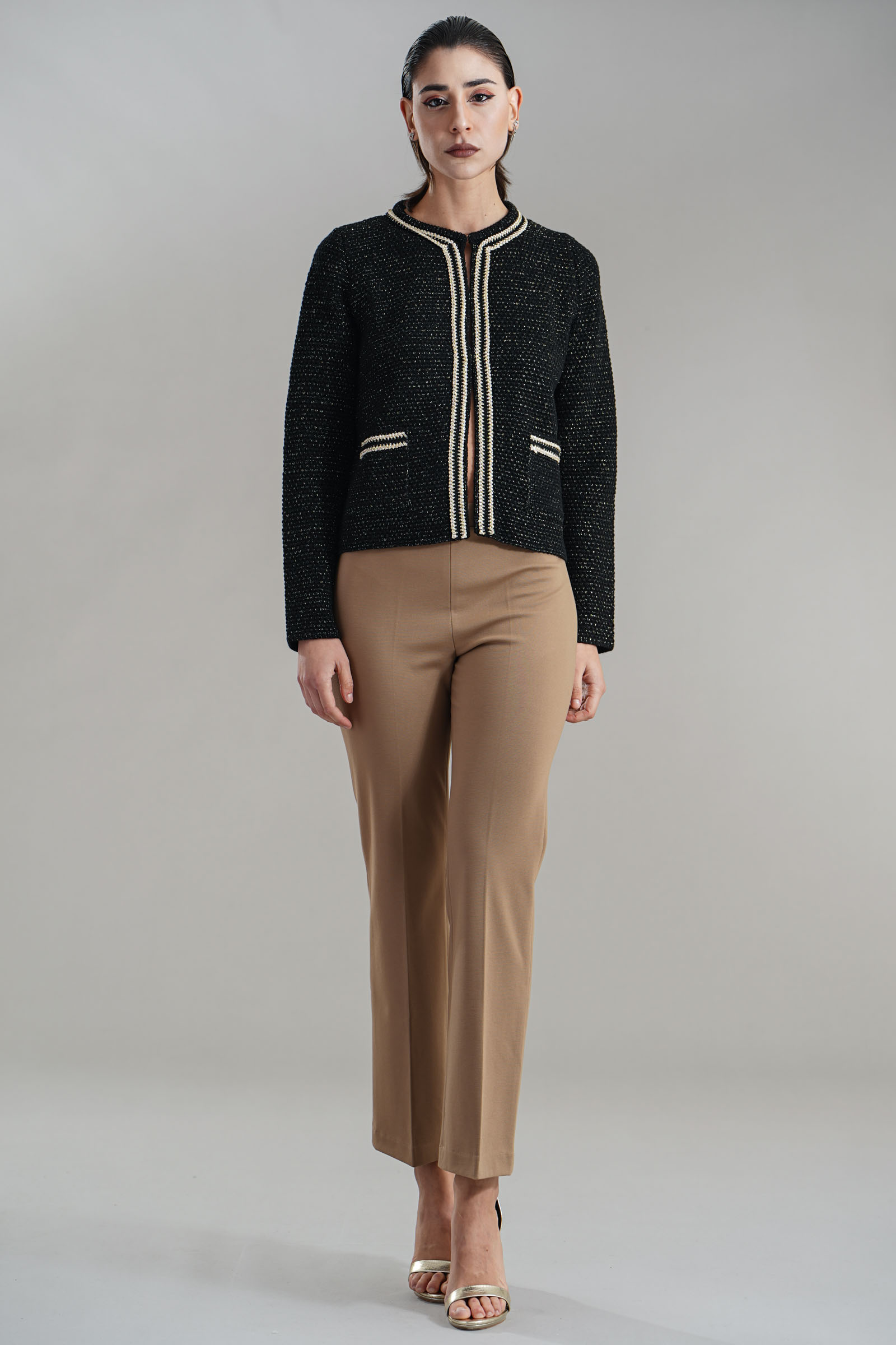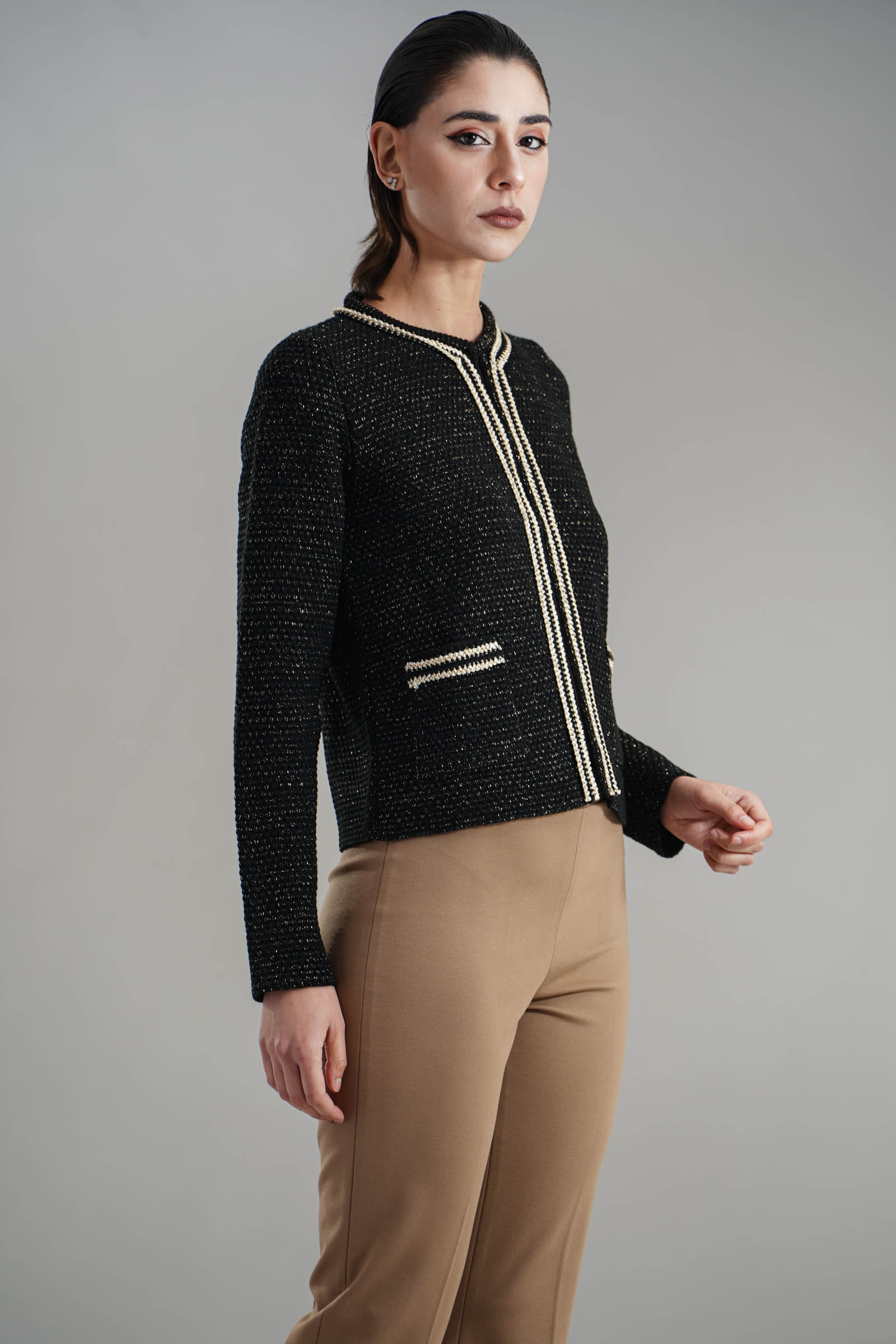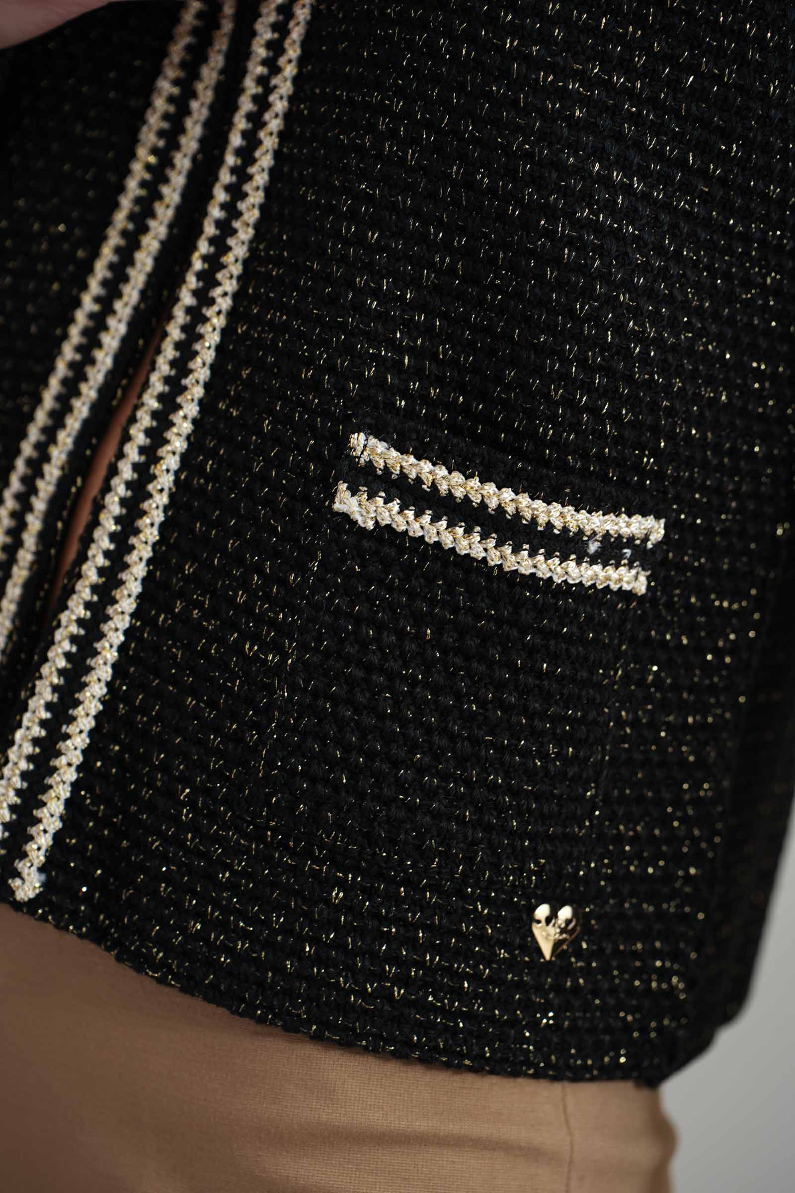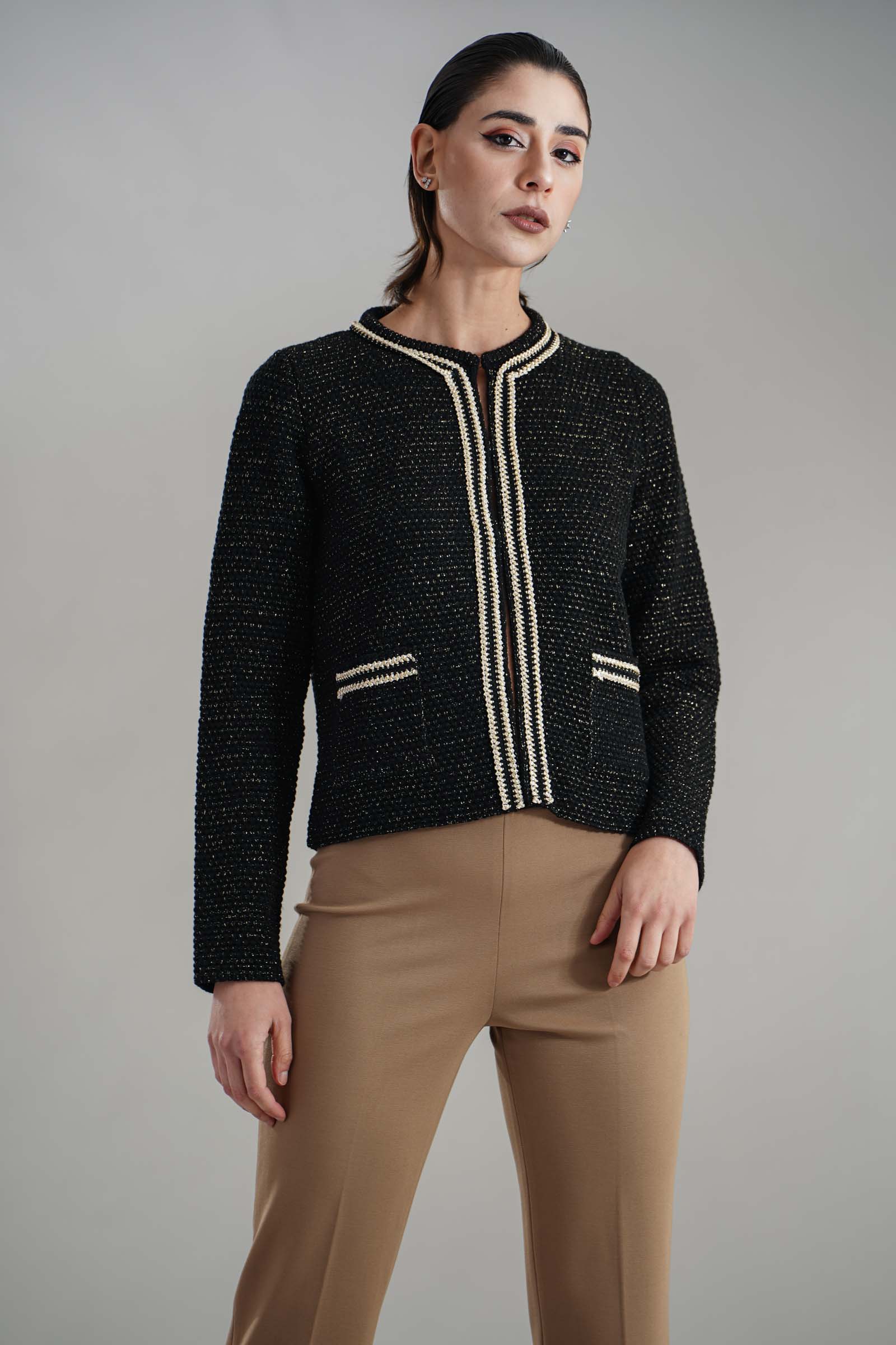 Vestibilita' regolare. Chiusura con ganci. Tasche anteriori. Dettaglio di filato laminato. Altezza modella 1,82. Nella foto indossa la taglia S. Composizione: 45% Lana, 45% Acrilico, 10% Fibra Metallizzata. Brand: Love To Love By Gai Mattiolo