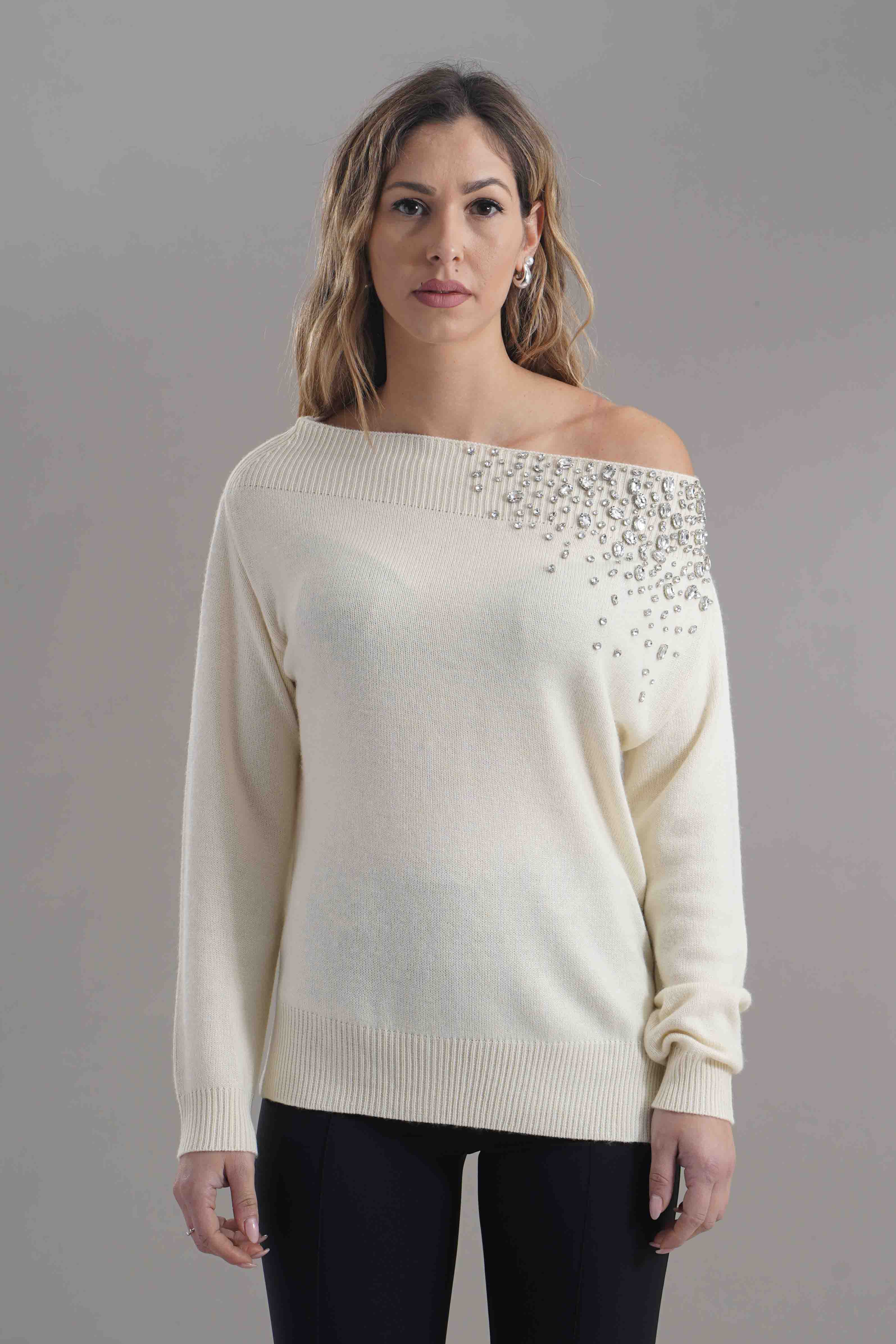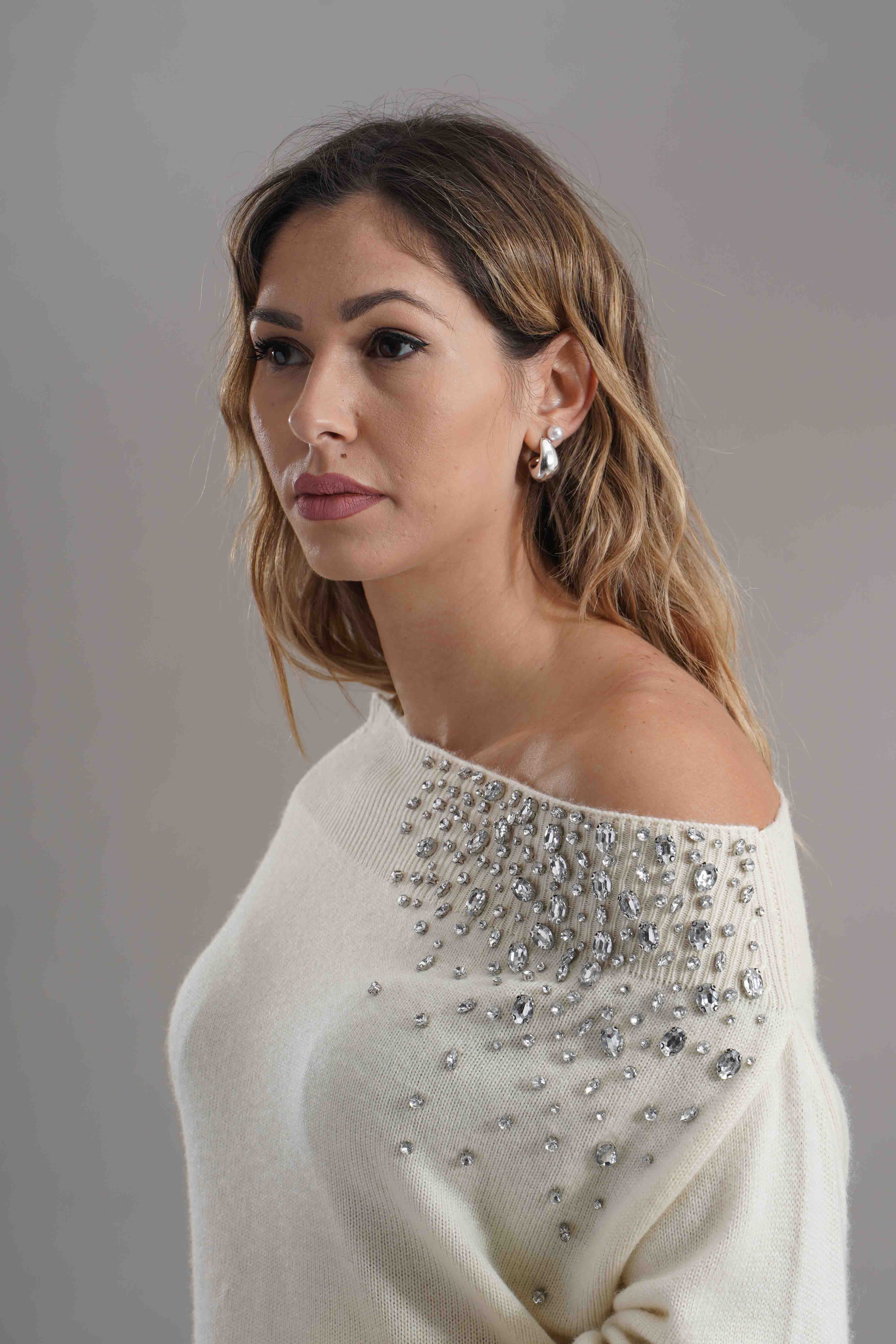 Vestibilita' regolare. Scollo a barca. Manica lunga. Spacchetti laterali sul fondo. Dettaglio di strass appicati sulla spalla.Altezza modella 1,72. Nella foto la modella indossa la taglia S. Composizione: 50% Nylon, 30% Viscosa, 20% Cashmere. Brand: Love To Love By Gai Mattiolo