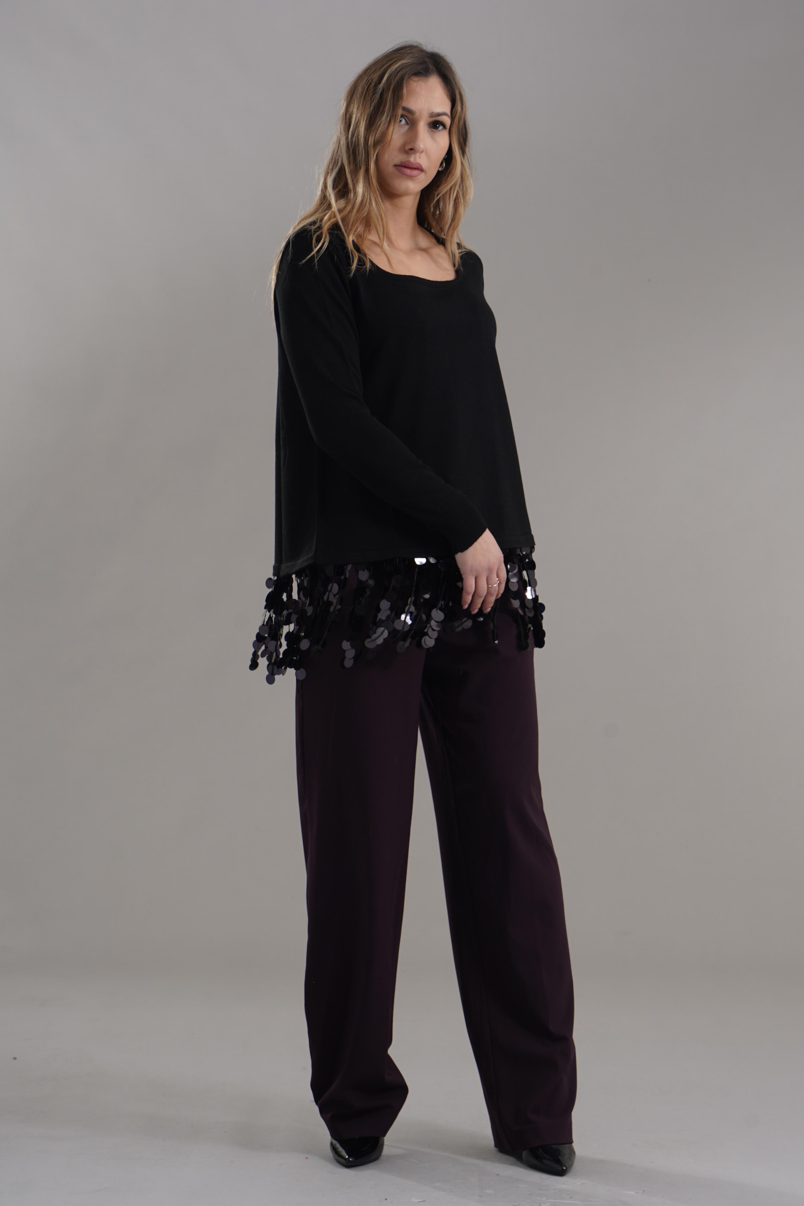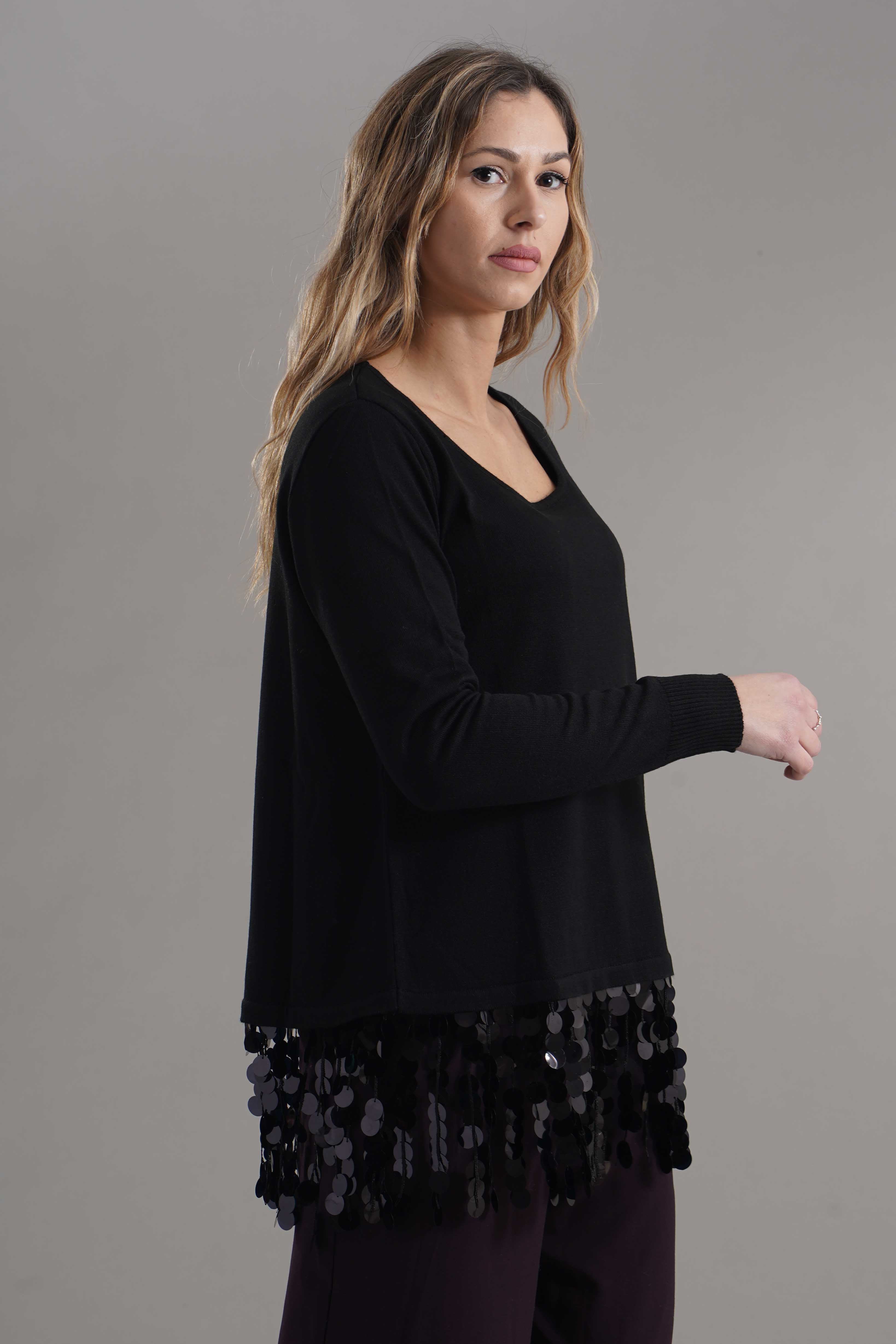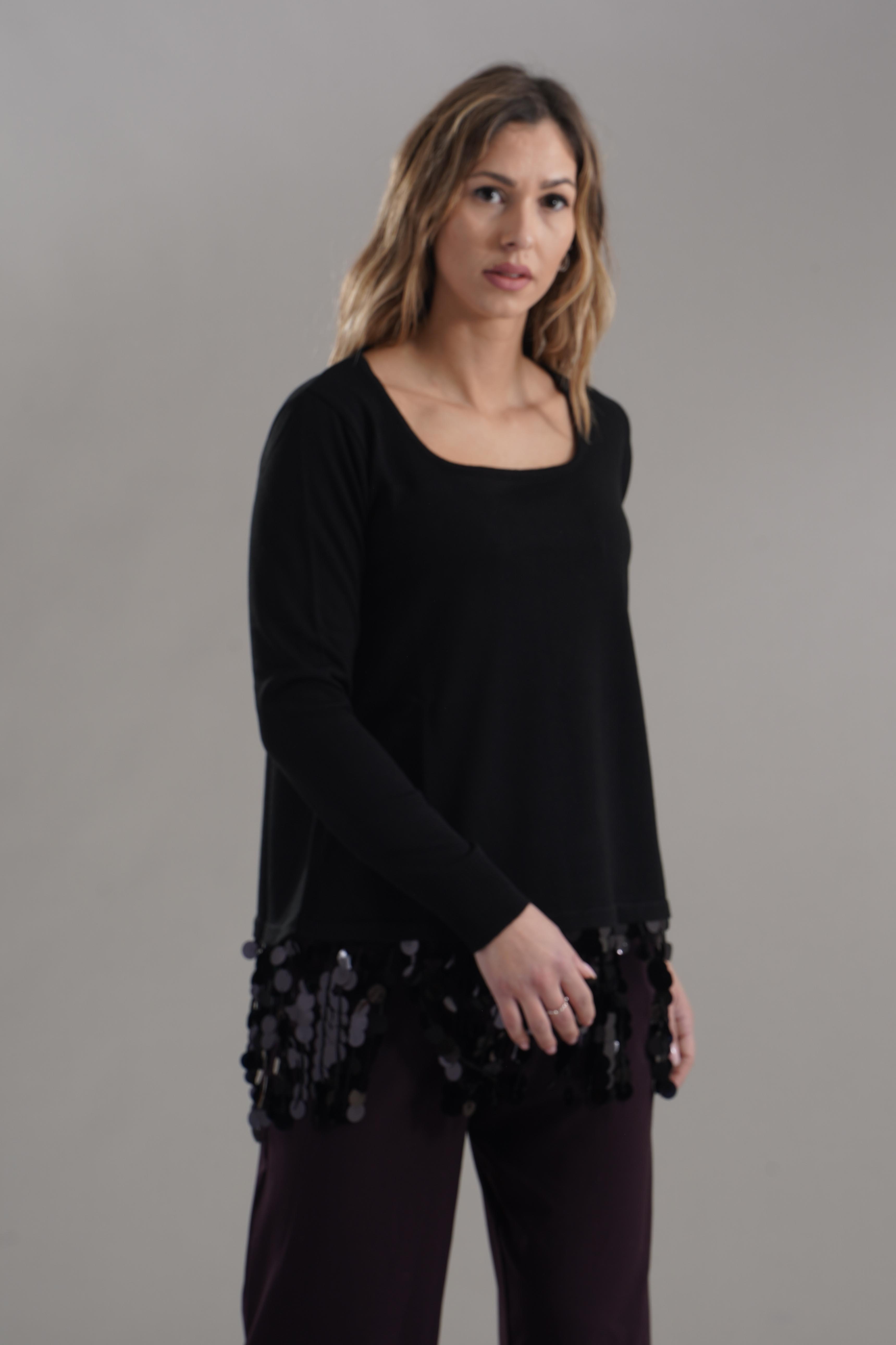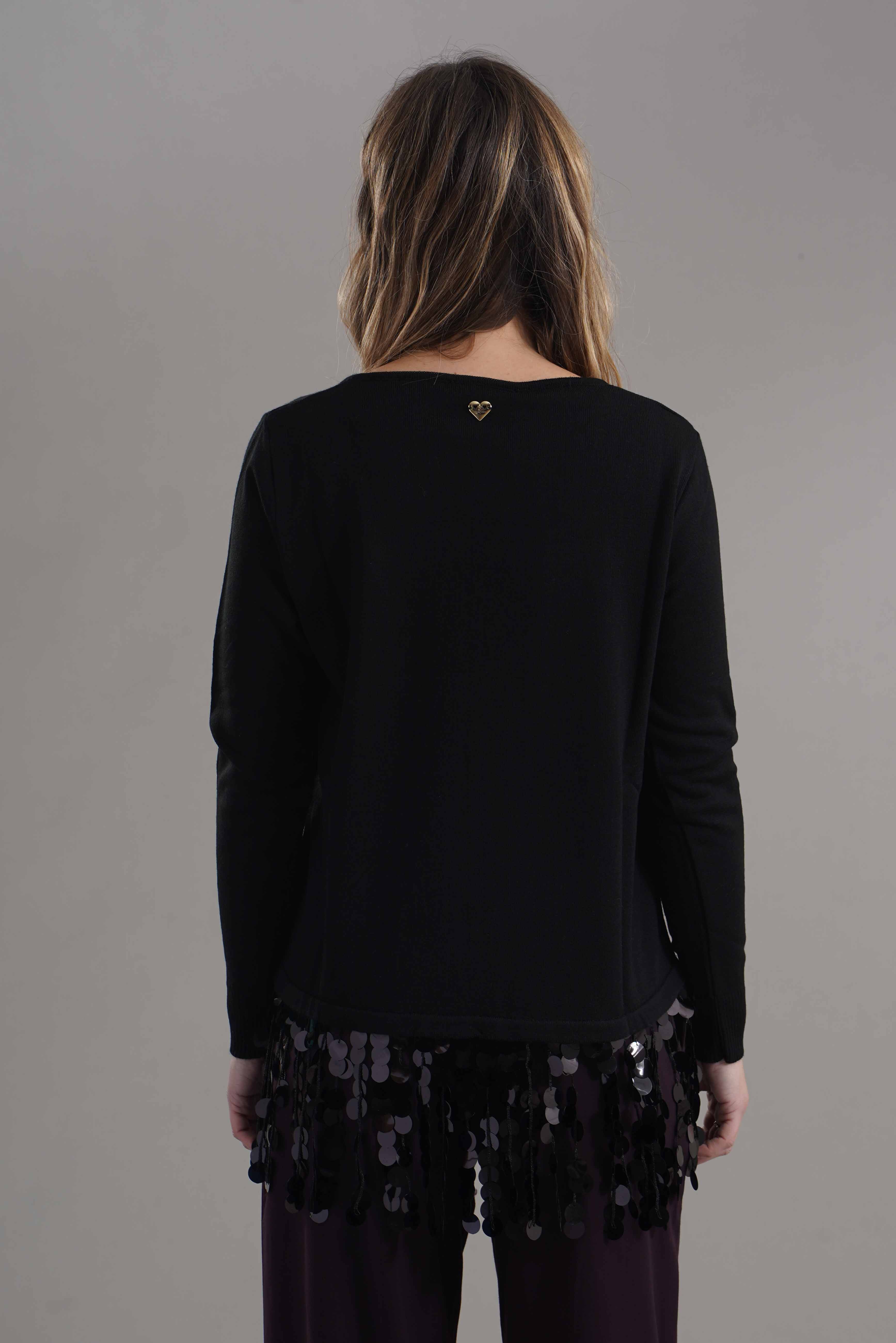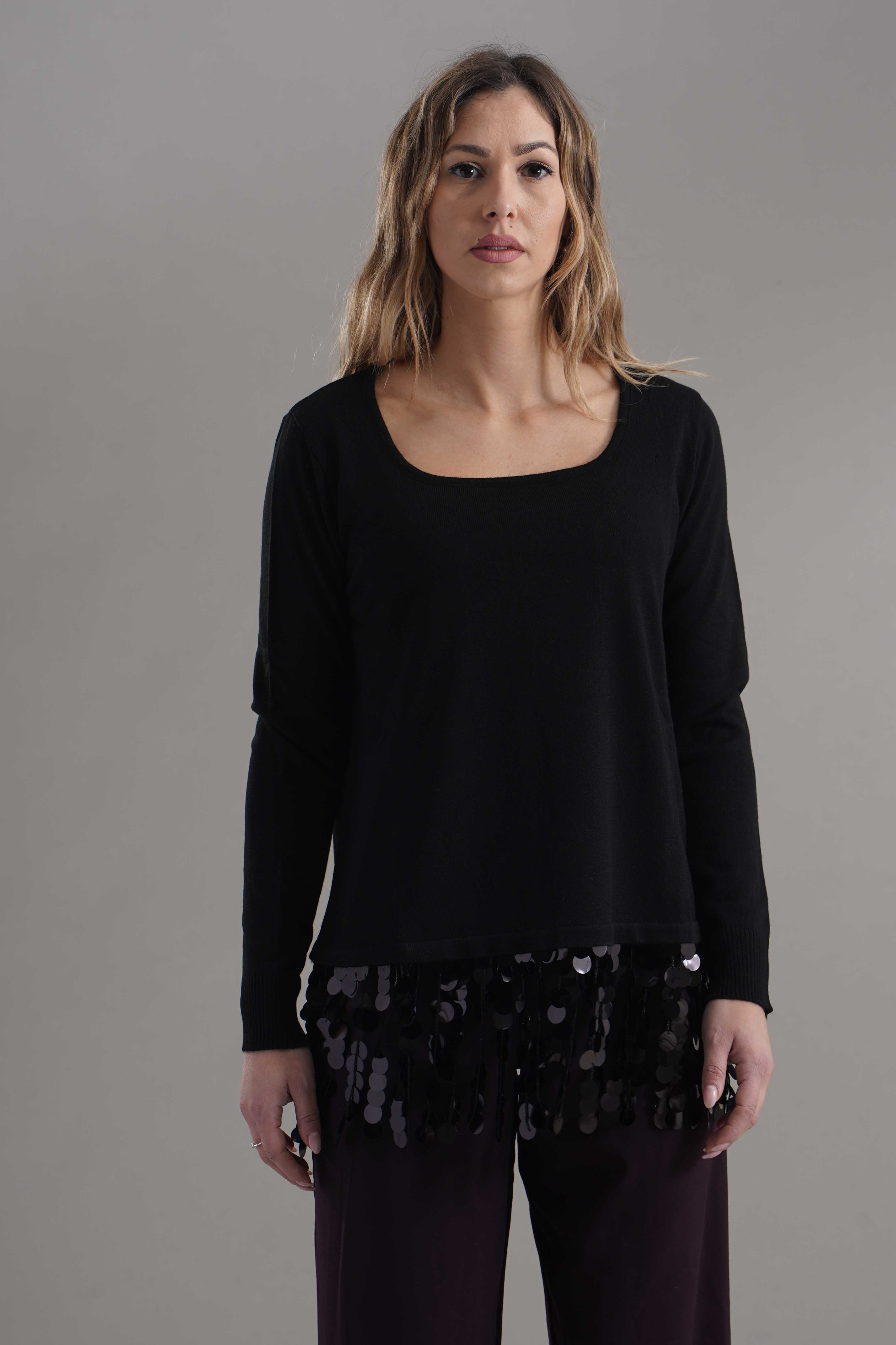 Vestibilita' regolare. Scollo quadrato. Manica lunga. Dettaglio di frange in paillettes. Altezza modella 1,72. Nella foto la modella indossa la taglia S. Composizione: 50% Lana, 50% Acrilico. Brand: Love To Love By Gai Mattiolo