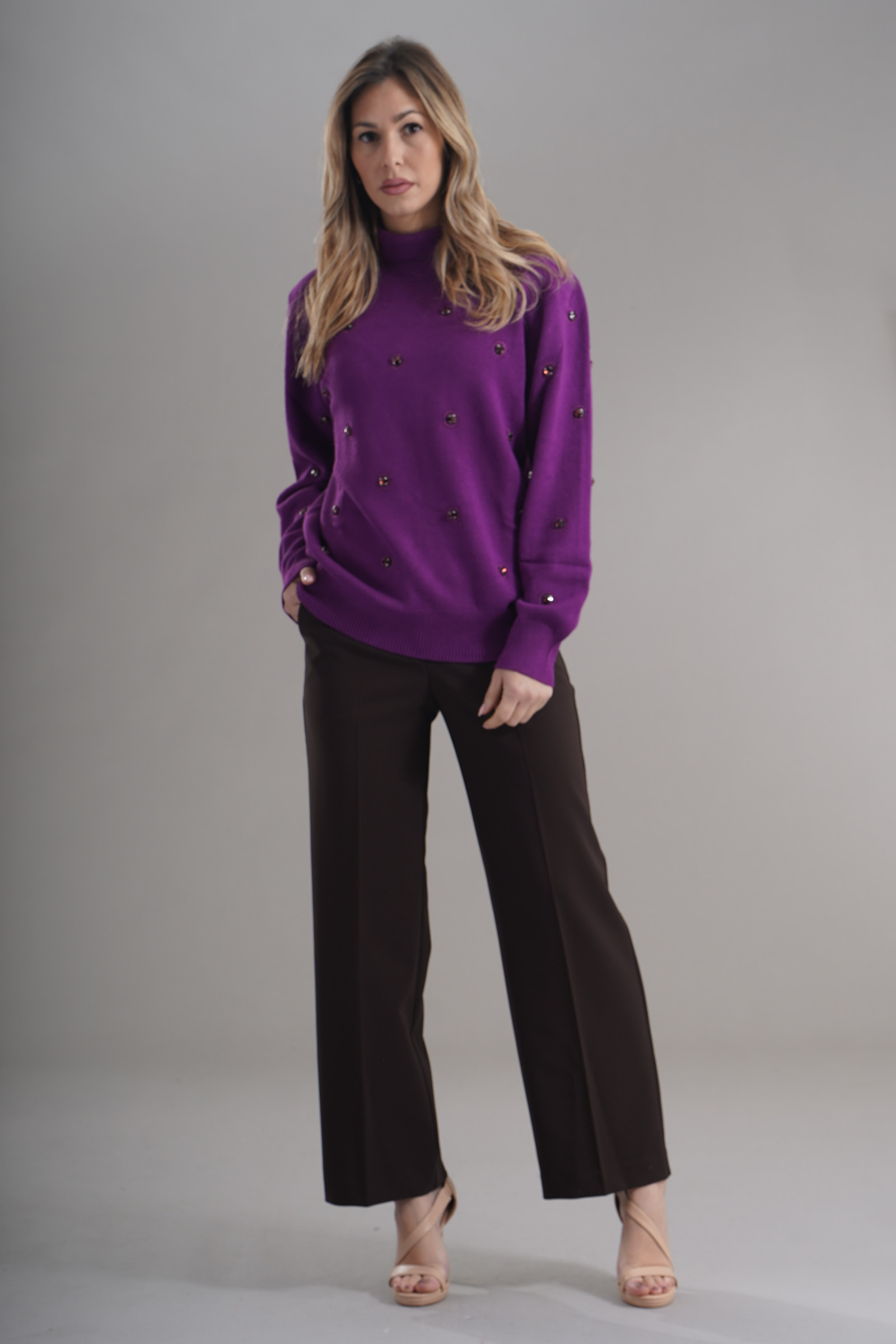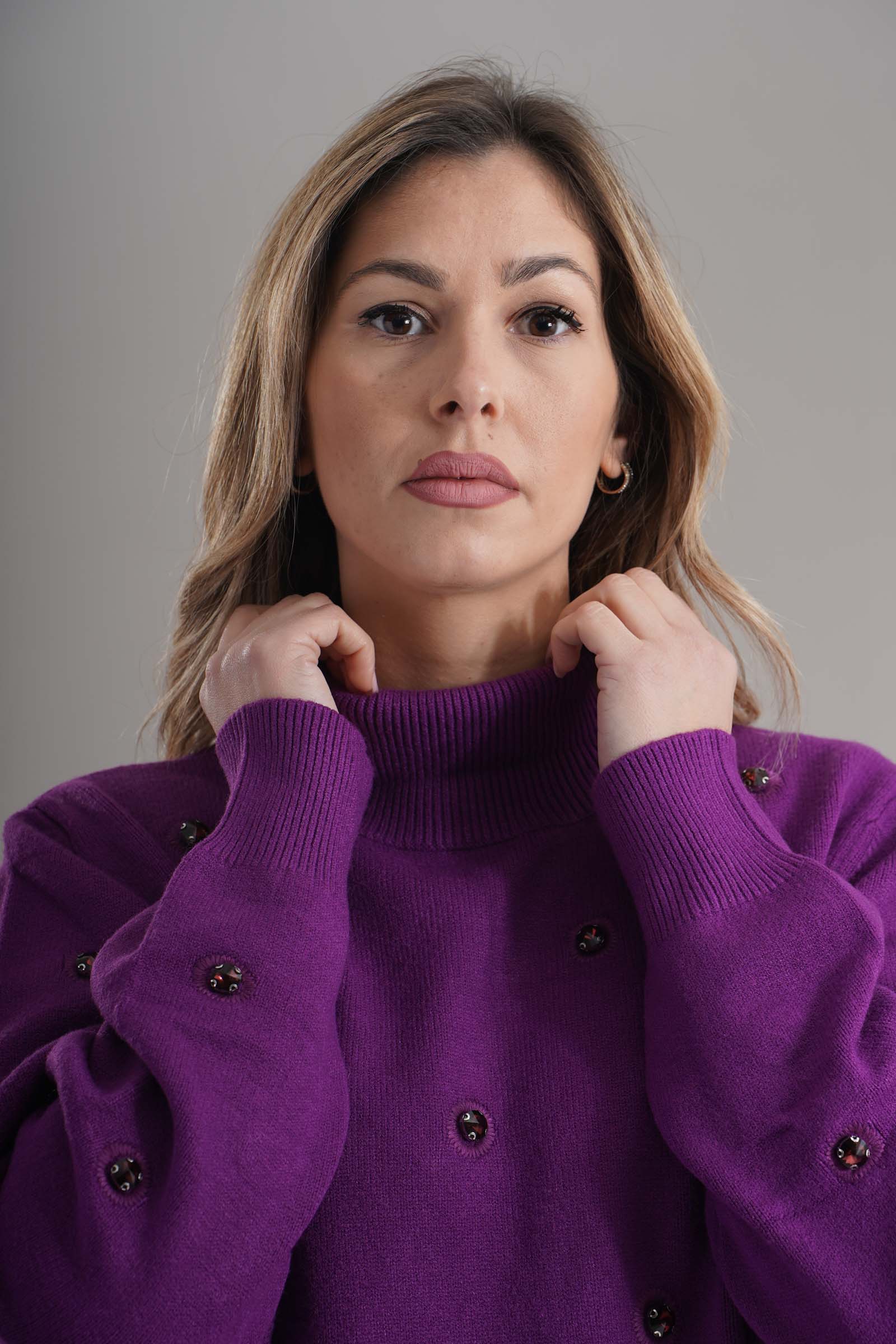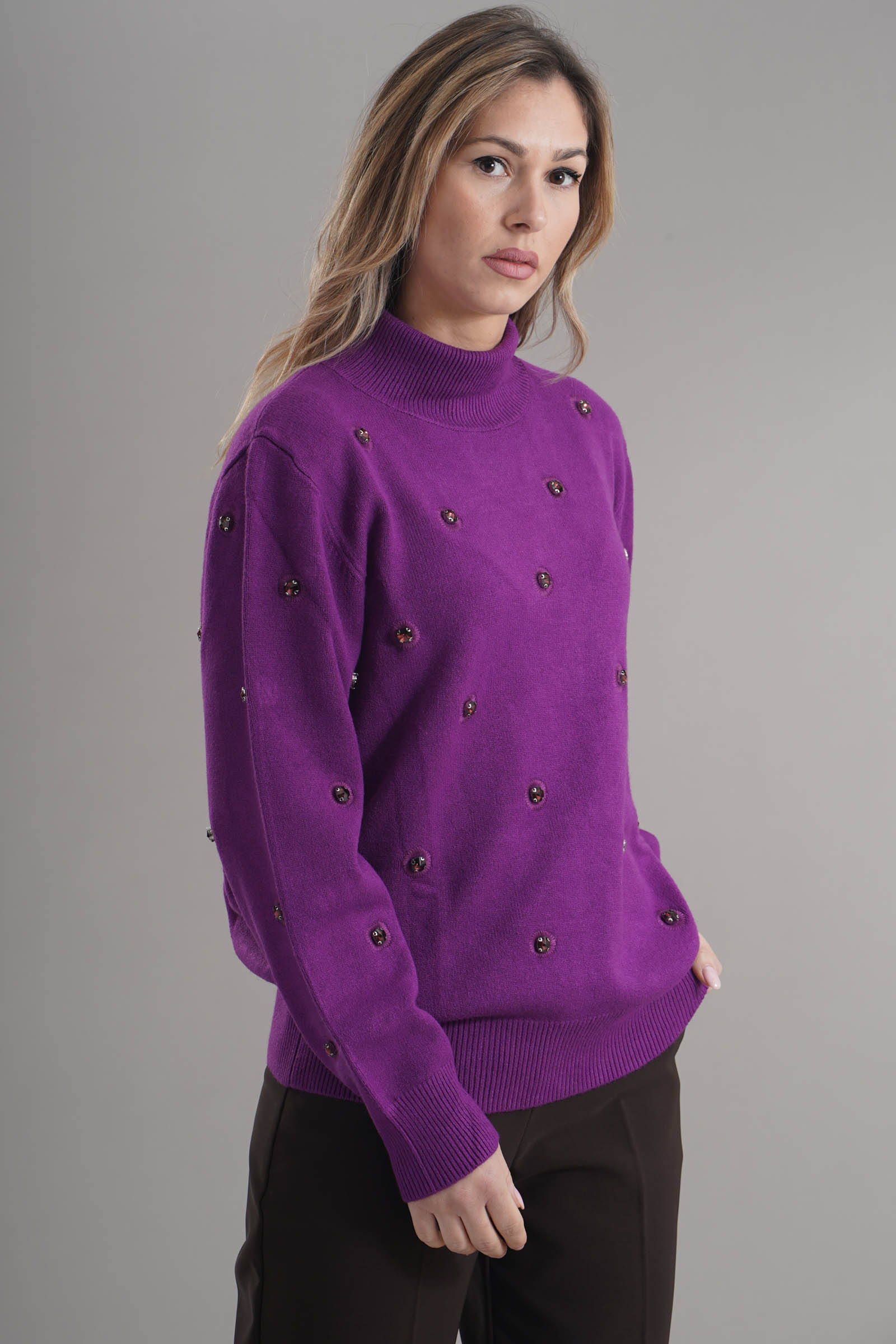 Vestibilita' regolare. Collo alto. Elastico sui polsini e sul fondo. Dettaglio di strass applicati. Altezza modella 1,79. Nella foto indossa la taglia S. Composizione: 56% Viscosa, 27% Poliestere, 17% Poliammide. Brand: Love To Love By Gai Mattiolo