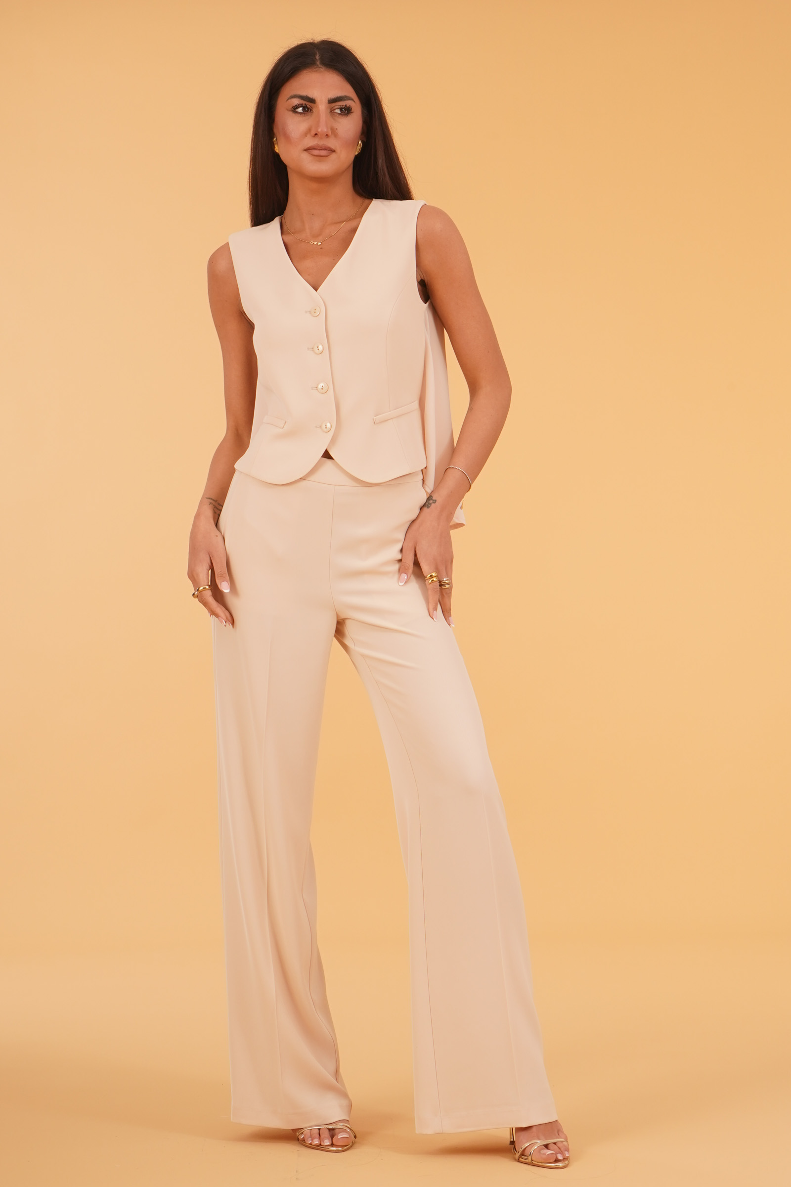 Vestibilita' regolare. Chiusura con bottone. Dettglio di pannello in georgette posteriore. Alezza modella 1,80. Indossa la taglia 40. Composizione: 97% Poliestere, 3% Elastane. Brand: Luckylu Milano