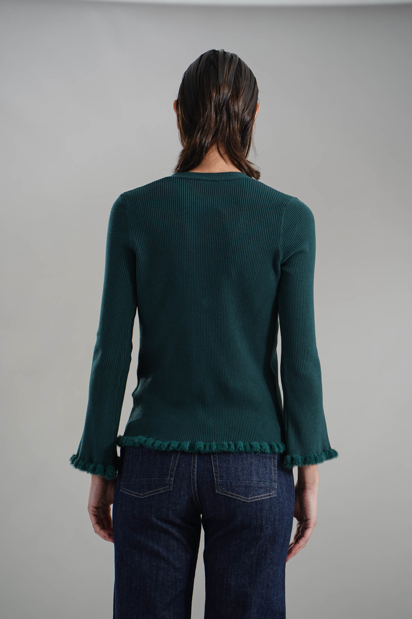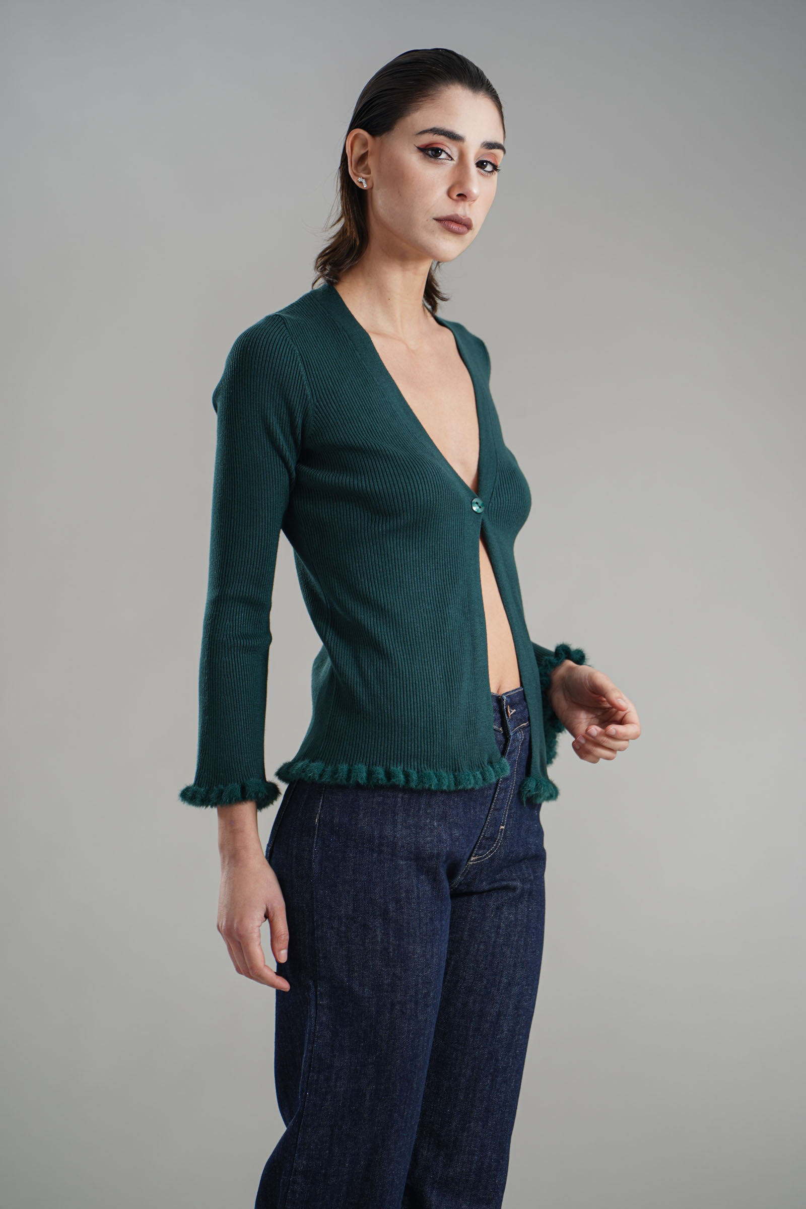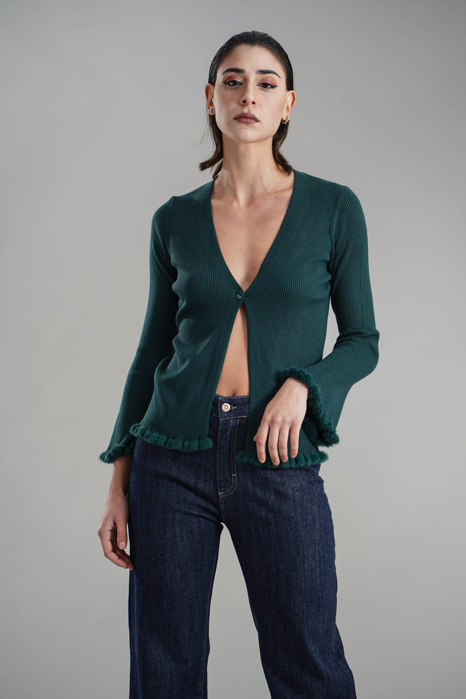 Vestibilita' regolare. Chiusura con bottone gioiello. Manica a campana. Dettaglio di ecopelliccia sul fondo e sui polsini. Altezza modella 1,82. Nella foto indossa la taglia XS/S. Composizione: 58% Viscosa, 28% Poliestere, 18% Poliammide. Brand: Nualy