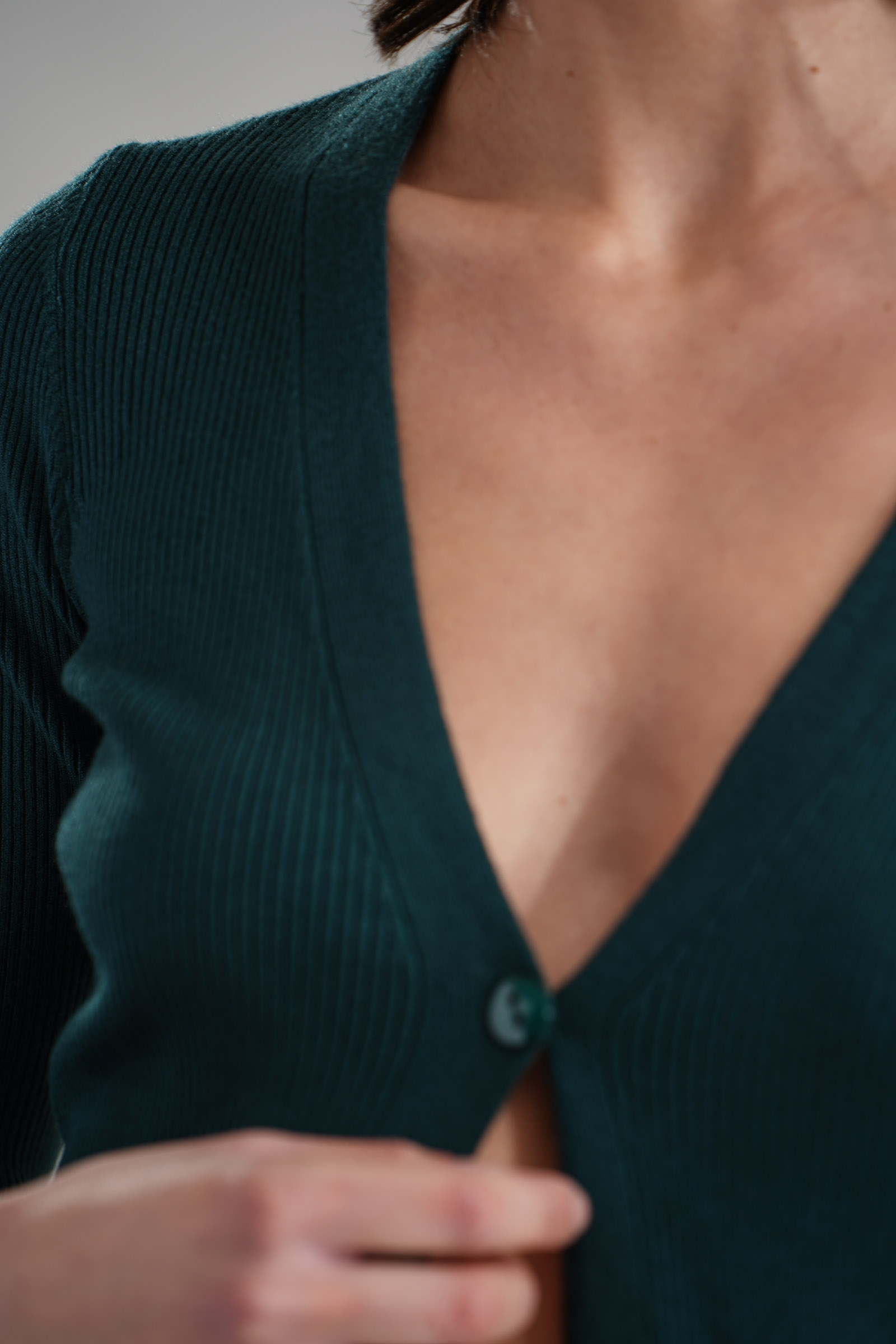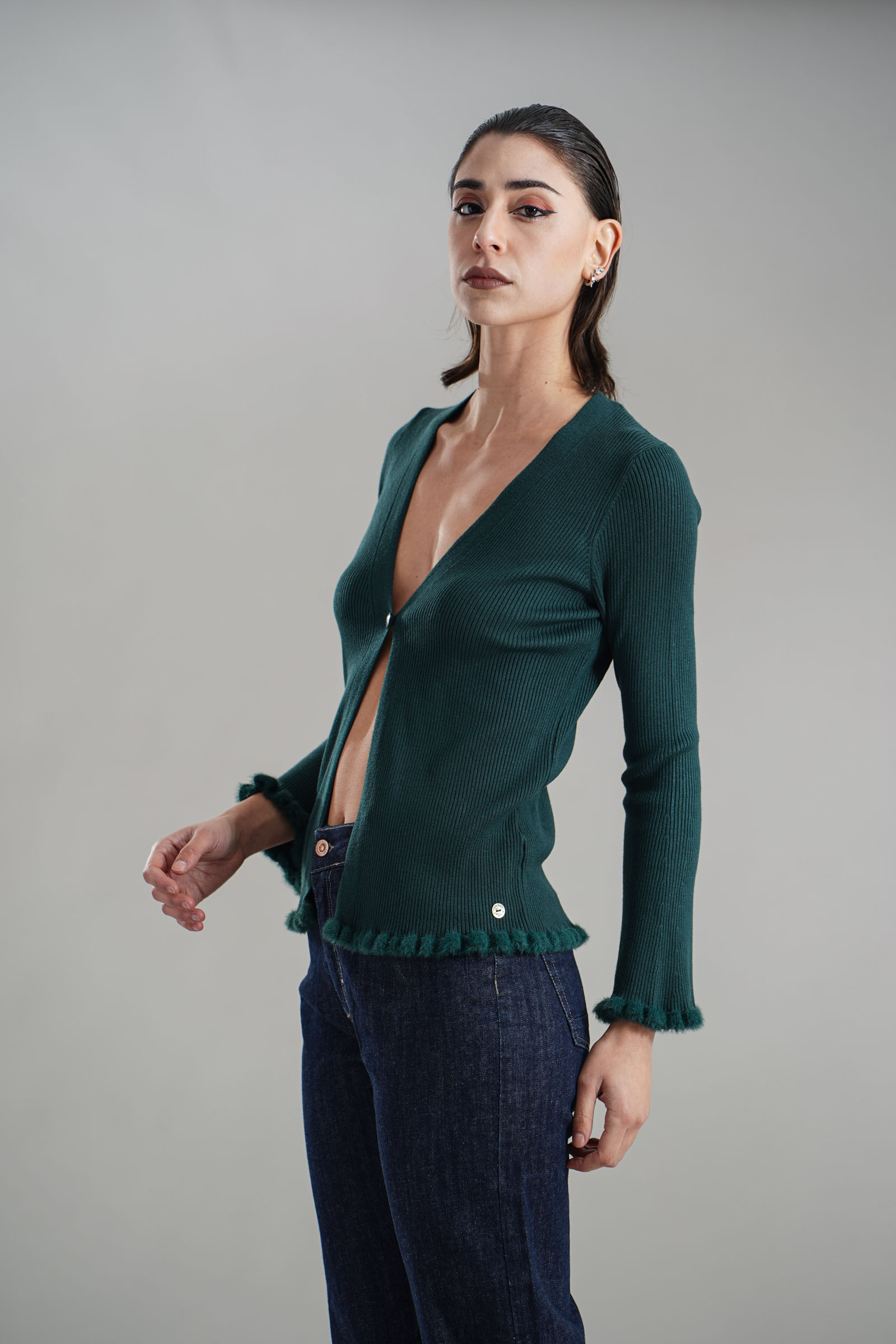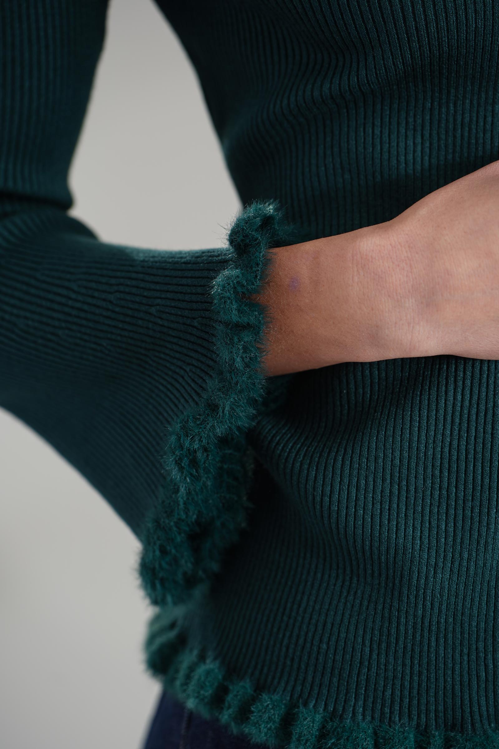 Vestibilita' regolare. Chiusura con bottone gioiello. Manica a campana. Dettaglio di ecopelliccia sul fondo e sui polsini. Altezza modella 1,82. Nella foto indossa la taglia XS/S. Composizione: 58% Viscosa, 28% Poliestere, 18% Poliammide. Brand: Nualy