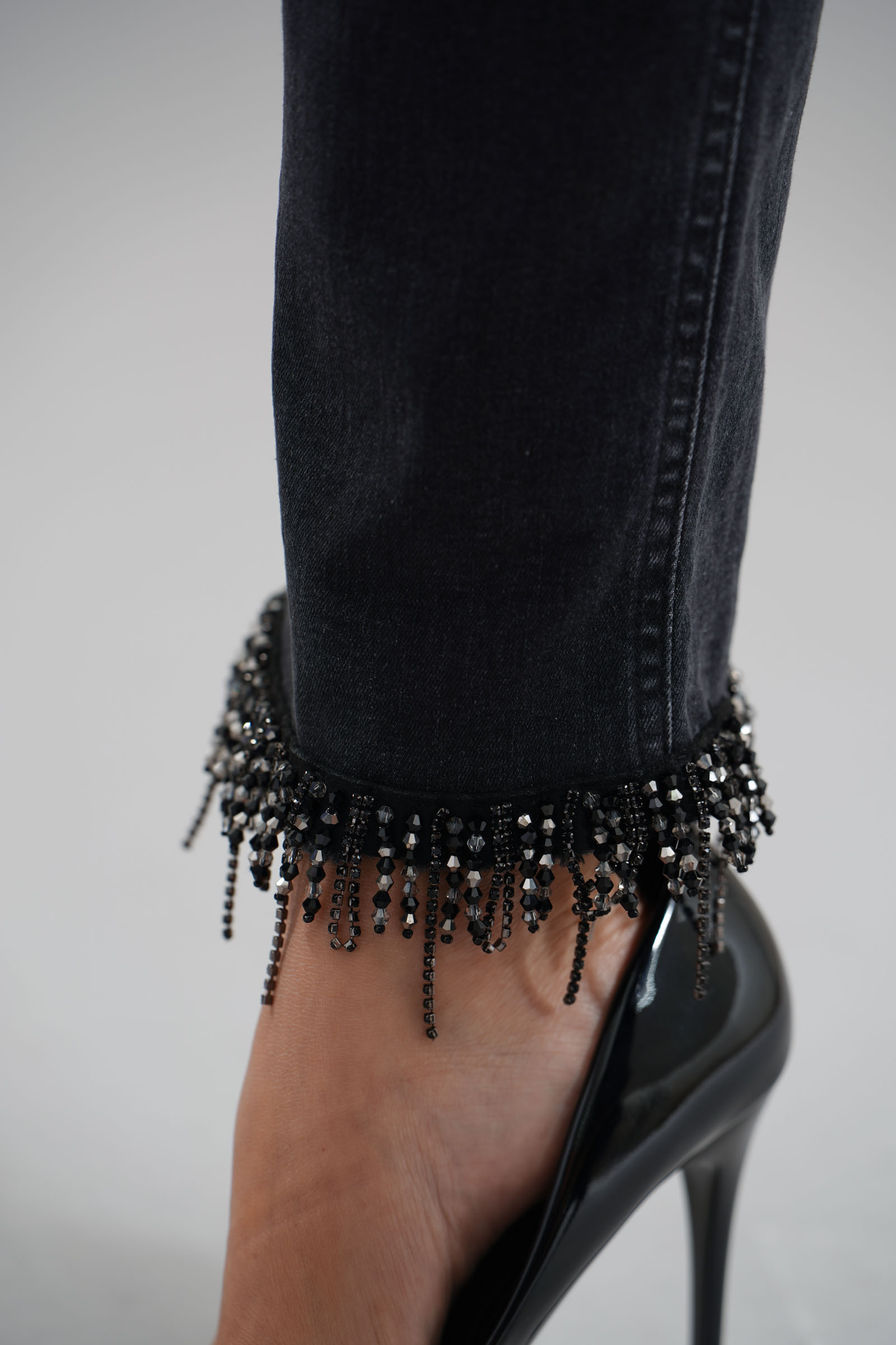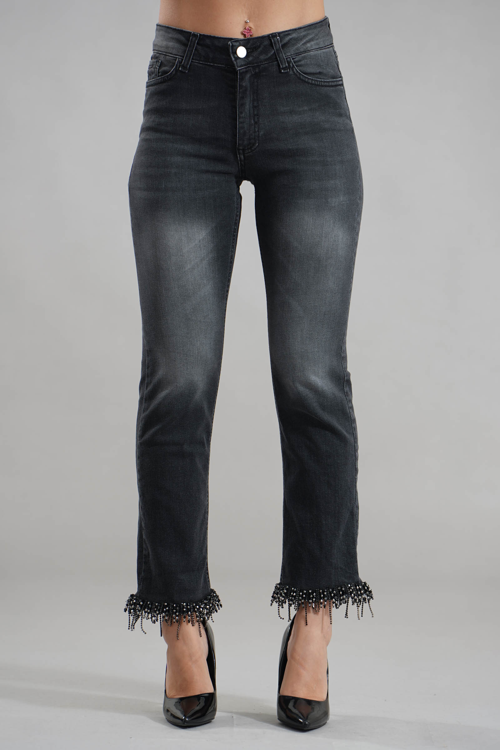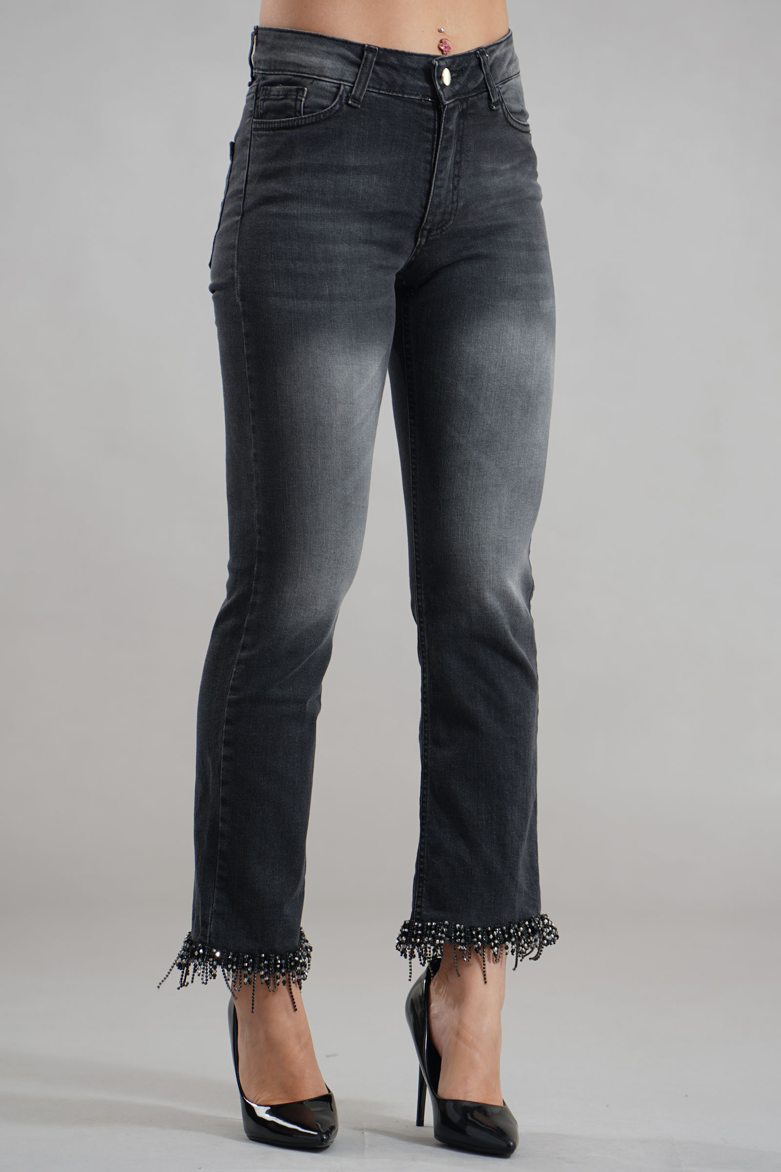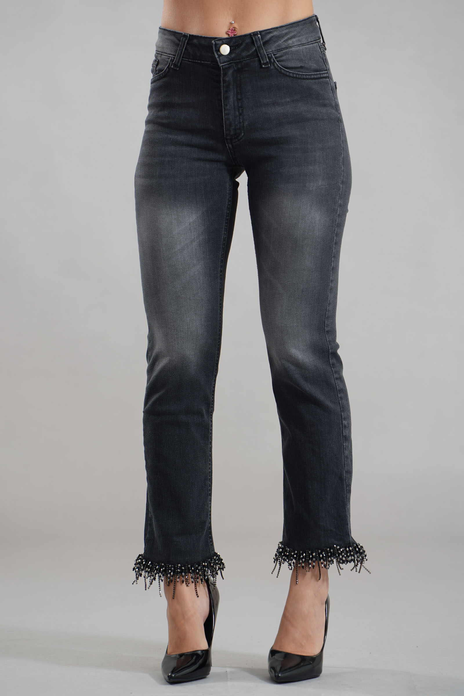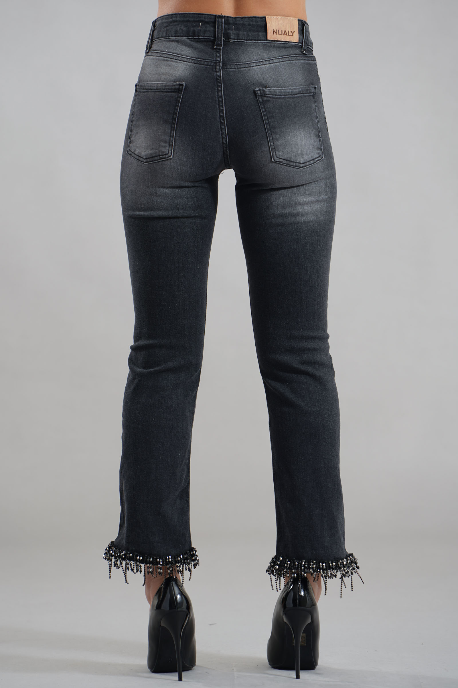 Vestibilita' regolare. Vita ata. 5 tasche. Denim effetto consumato. Dettaglio di corallini e strass sul fondo. Altezza modella 1,79. Nella foto indossa la taglia 40. Composizione: 99% Cotone, 1% Elastomero. Brand: Nualy