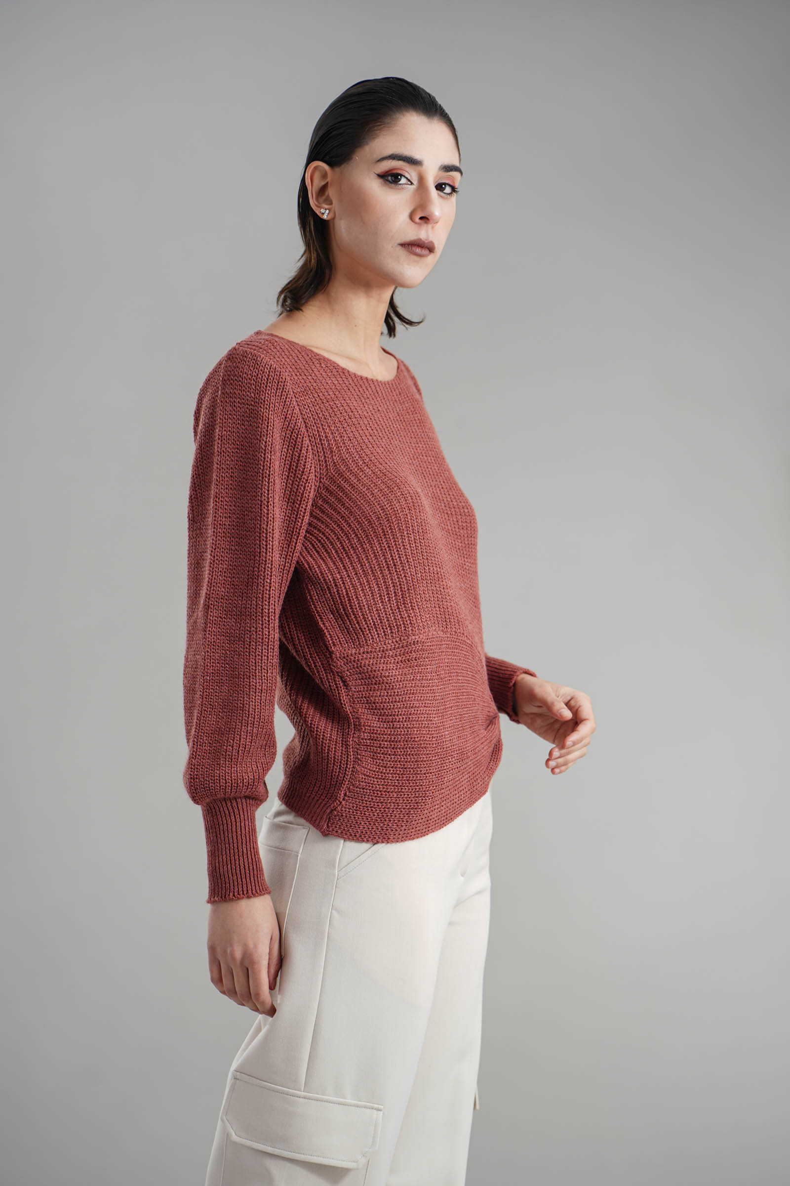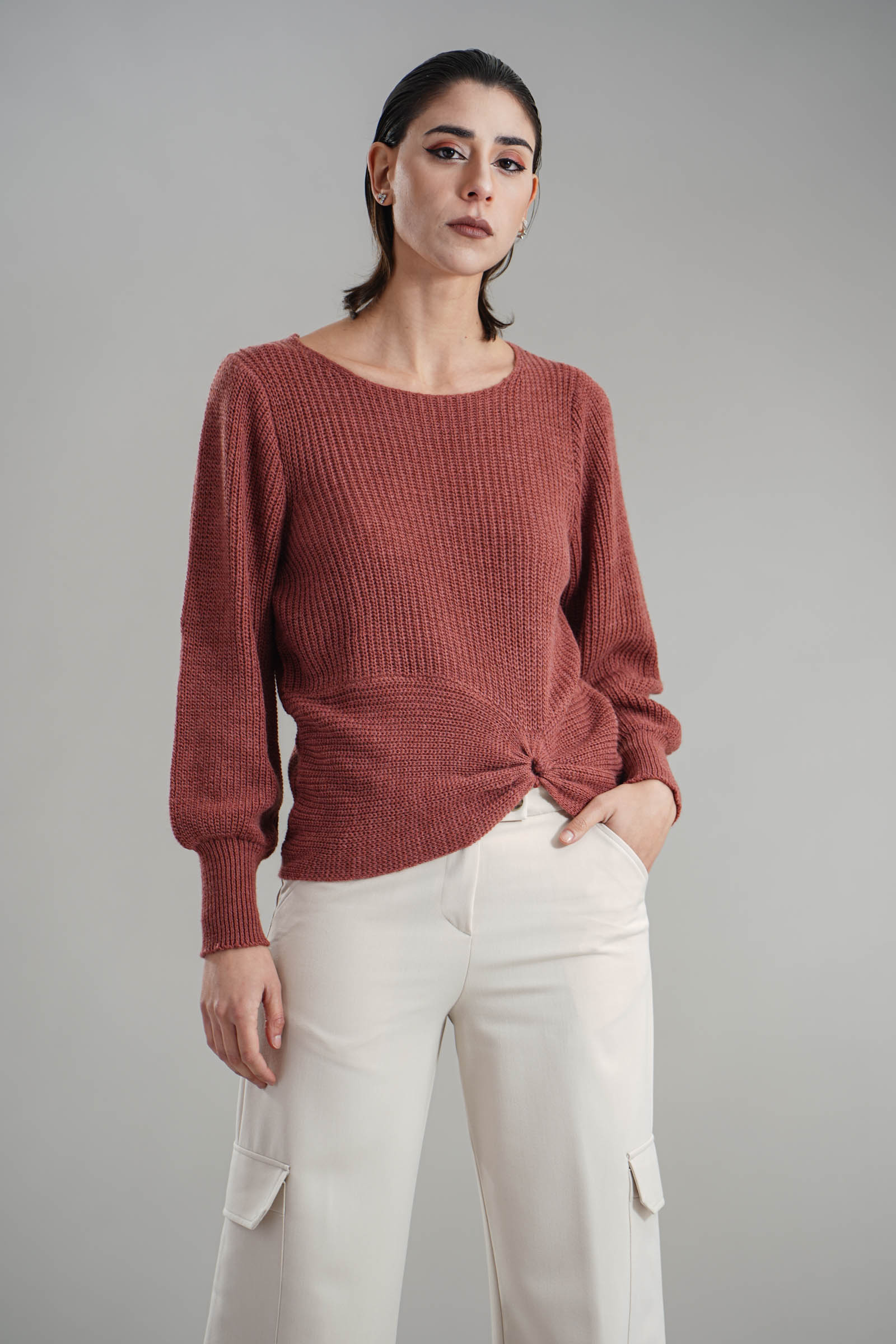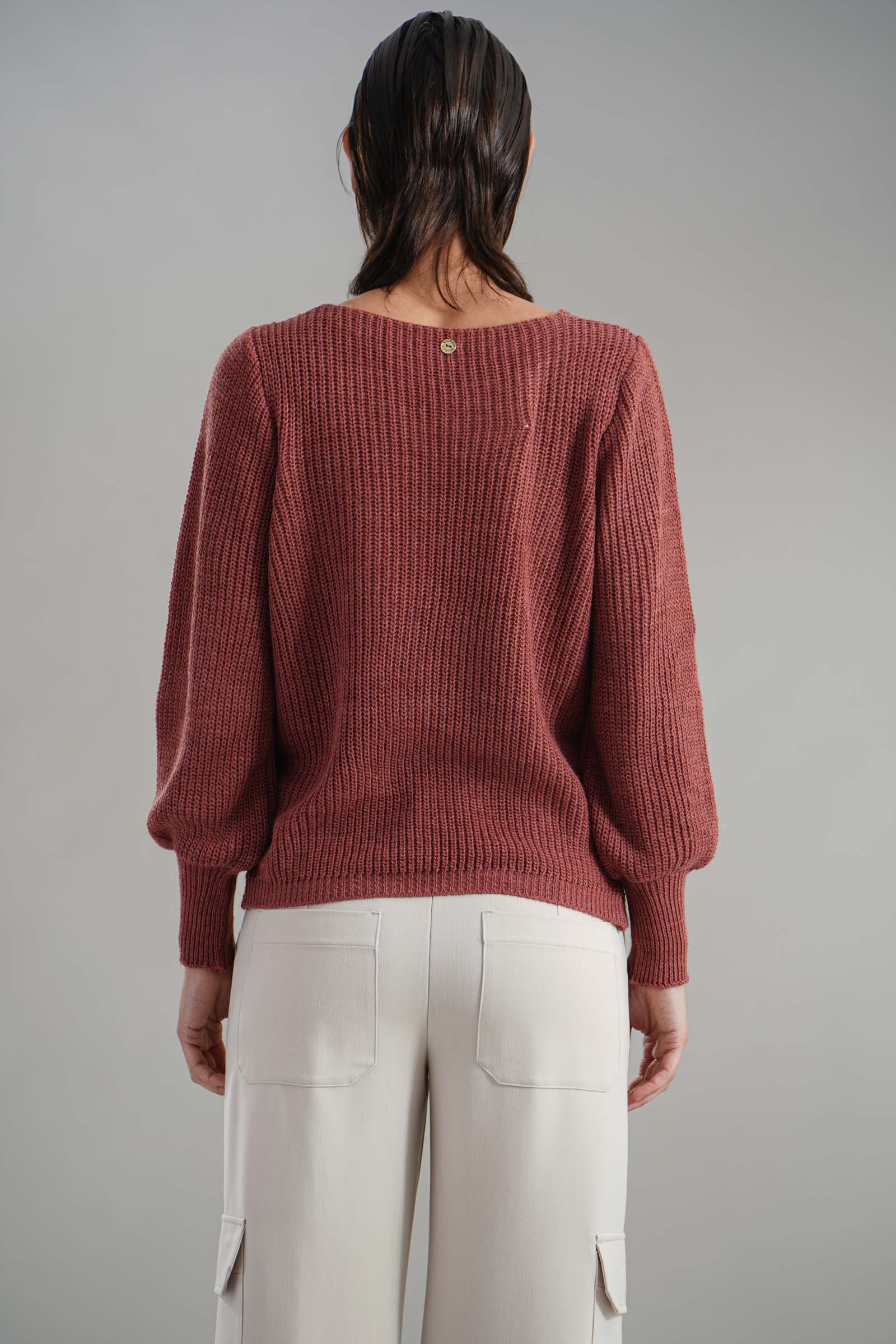 Vestibilita' regolare. Girocollo. Manica a sbuffo. Dettaglio di drappeggio anteriore. Altezza modella 1,82. Nella foto indossa la taglia XS/S. Composizione: 75% Acrilico, 10% Viscosa, 10% Lana, 5% Alpaca. Brand: Nualy