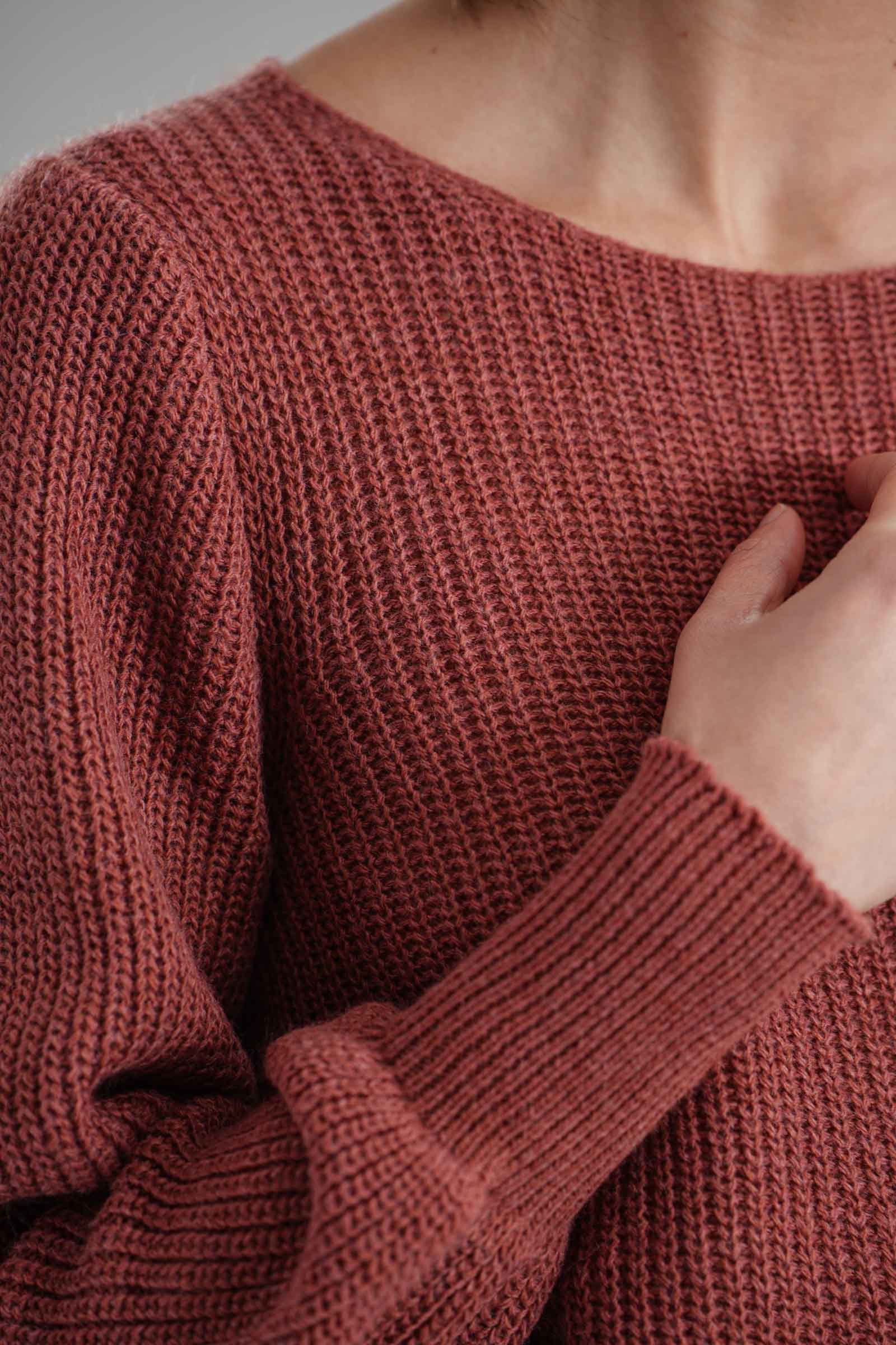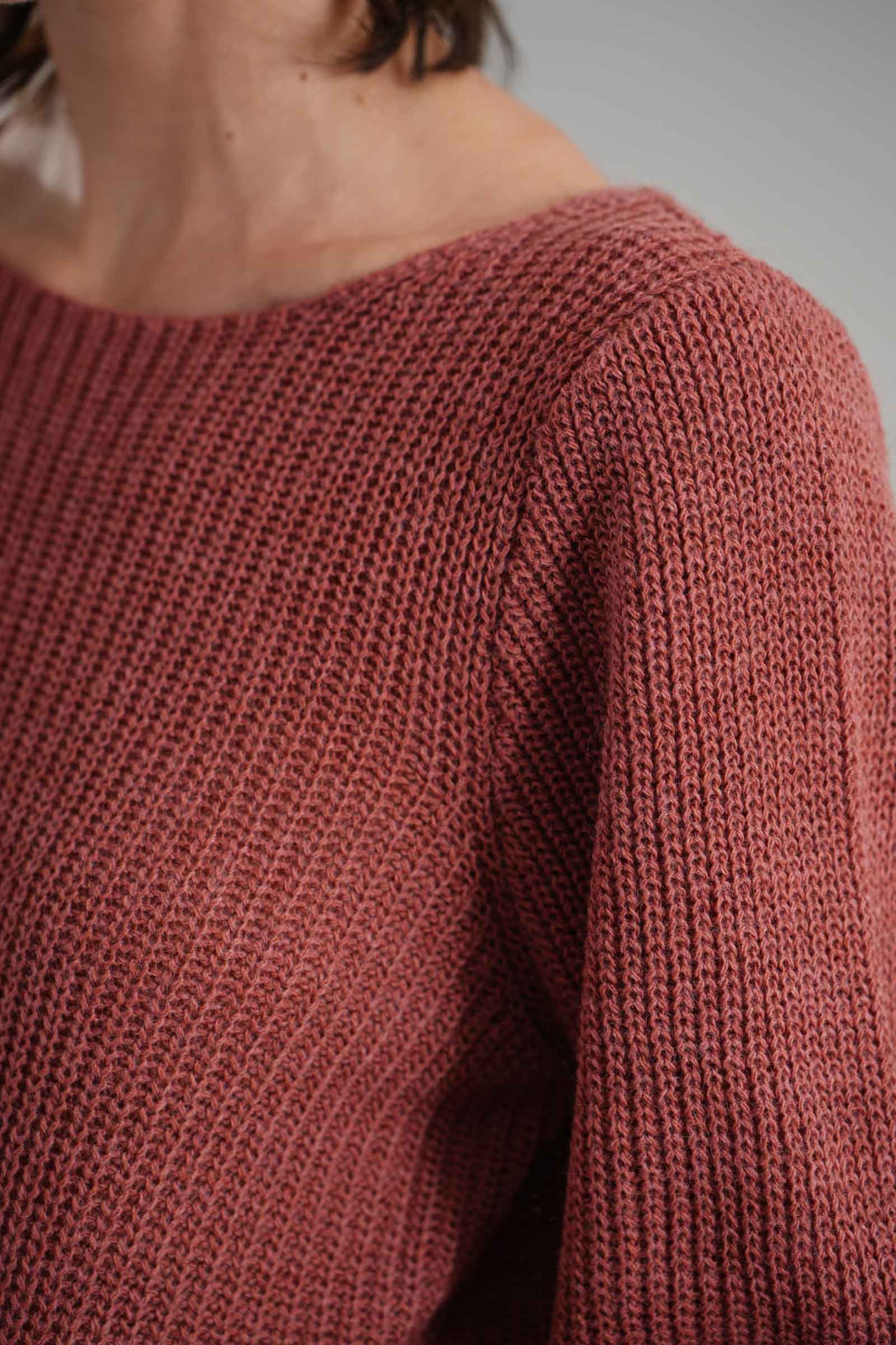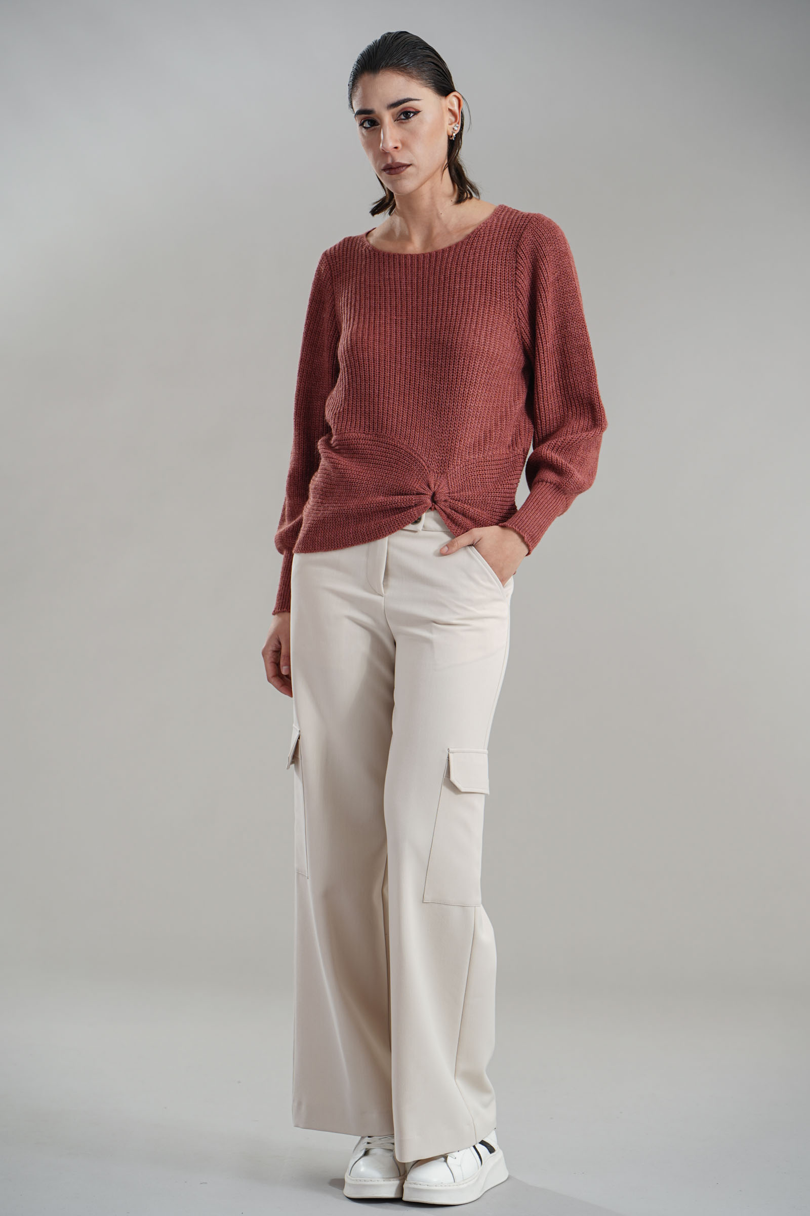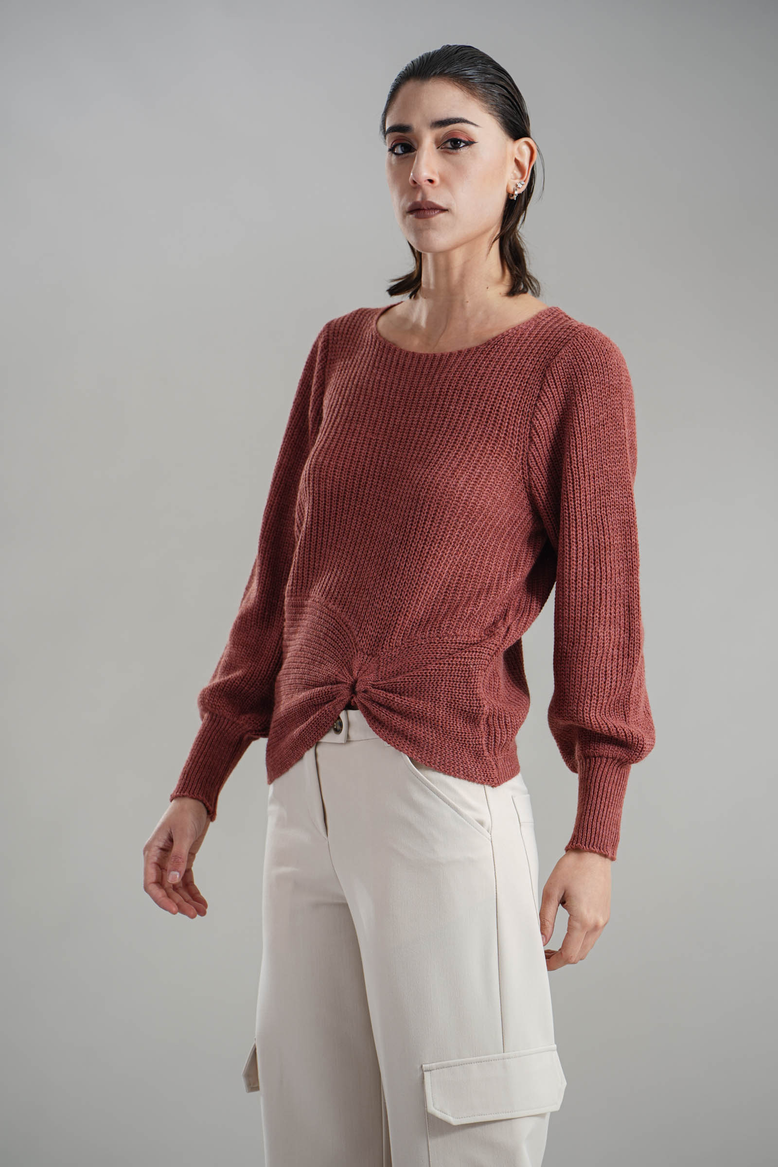 Vestibilita' regolare. Girocollo. Manica a sbuffo. Dettaglio di drappeggio anteriore. Altezza modella 1,82. Nella foto indossa la taglia XS/S. Composizione: 75% Acrilico, 10% Viscosa, 10% Lana, 5% Alpaca. Brand: Nualy