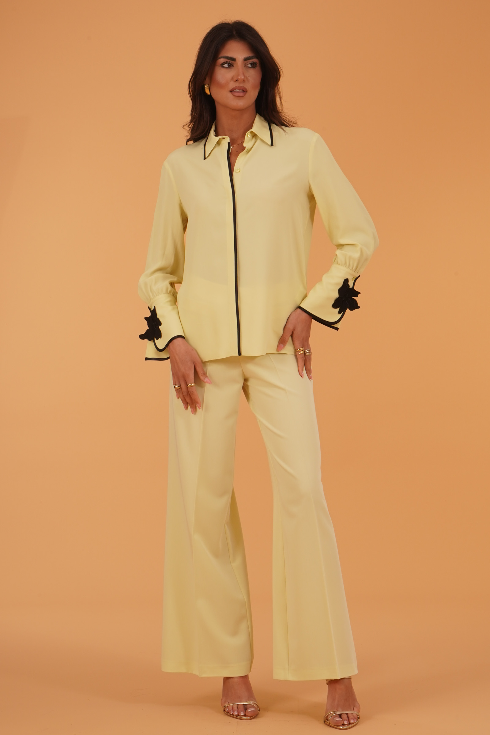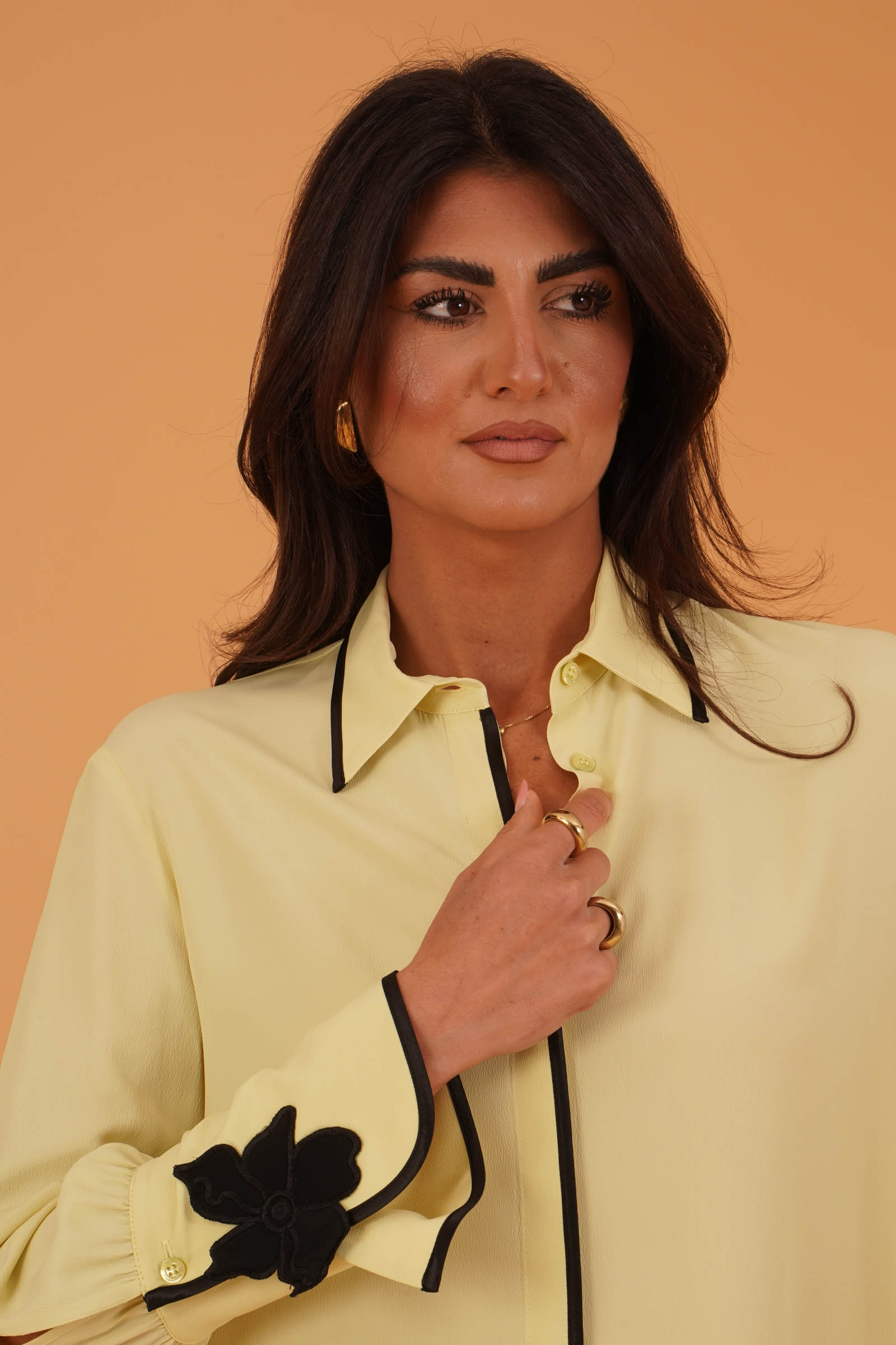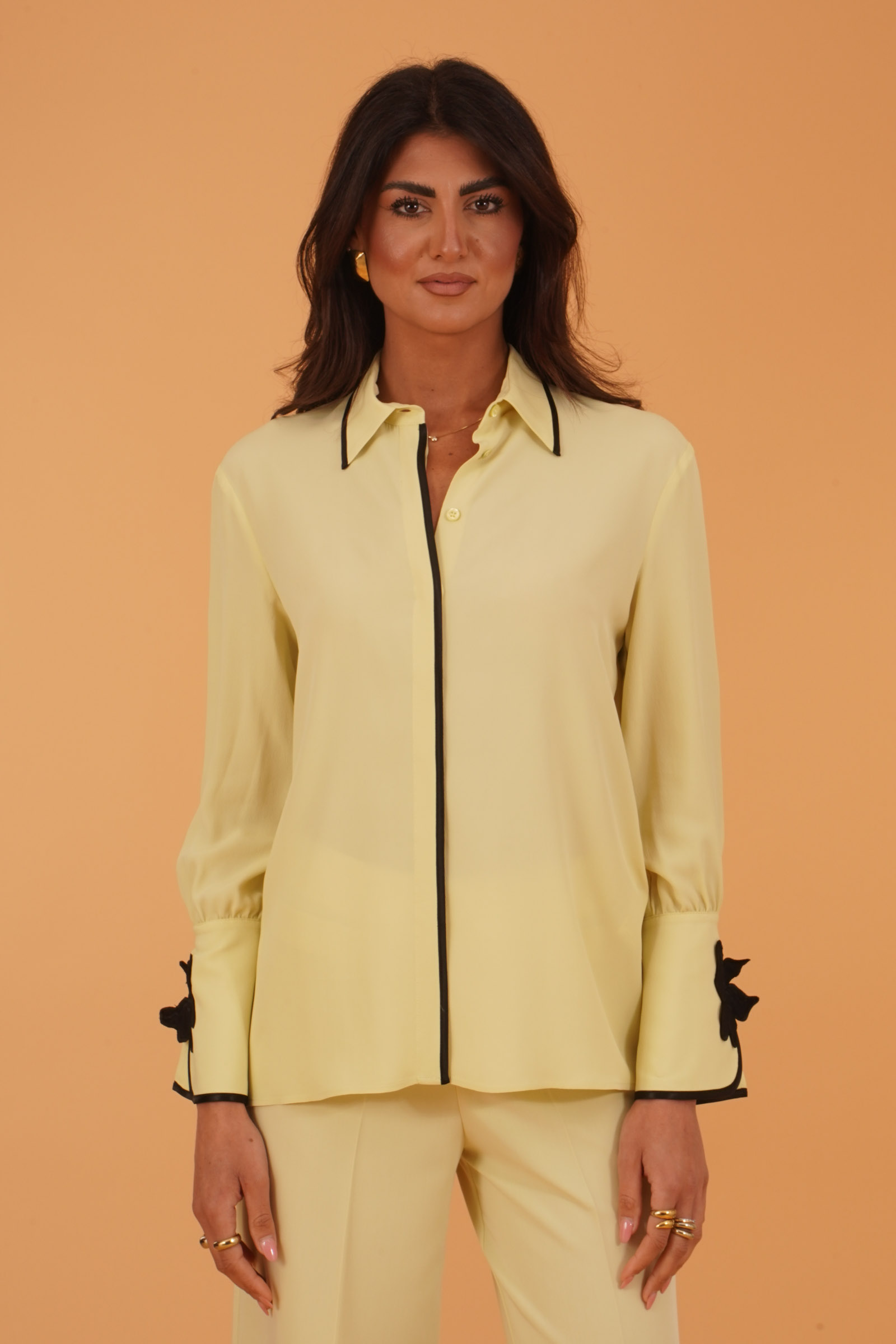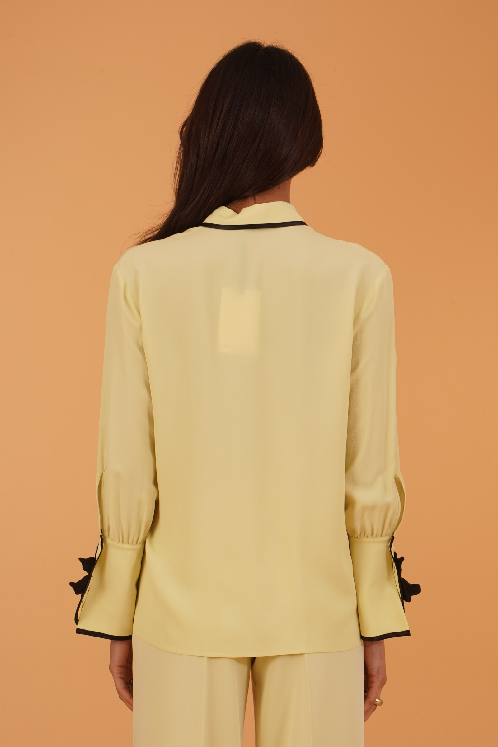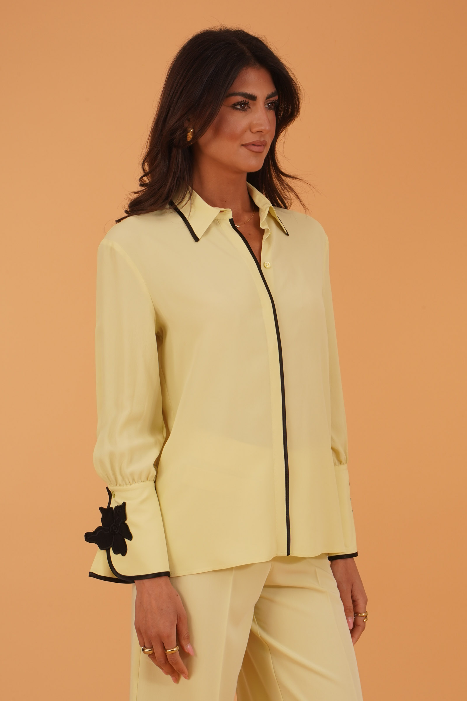 Vestibilita' regolare. Manica lunga. Ampi polsini con fiore applicato. Passamaneria nera a contrasto. Altezza modella 1,80.Indossa la taglia 40. Composizione: 83% Acetato, 17% Seta. Brand Simona Corsellini