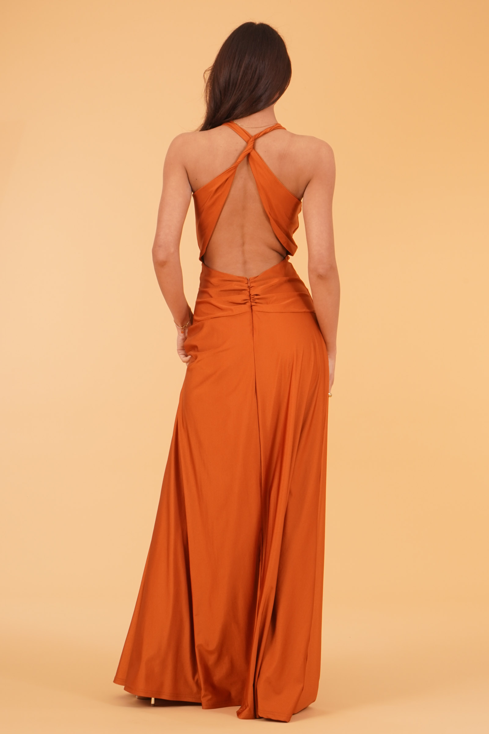 Vestibilita' regolre. Scollatura con nodo piu' coppette inserite. Scollatura ad incrocio anche sulla schiena. Drappeggio nteriore. Chiusura con zip invisibile. Altezza modella 1,80. Indossa la taglia 40. Composizione: 100% Poliestere. Brand: Twins Fantasy