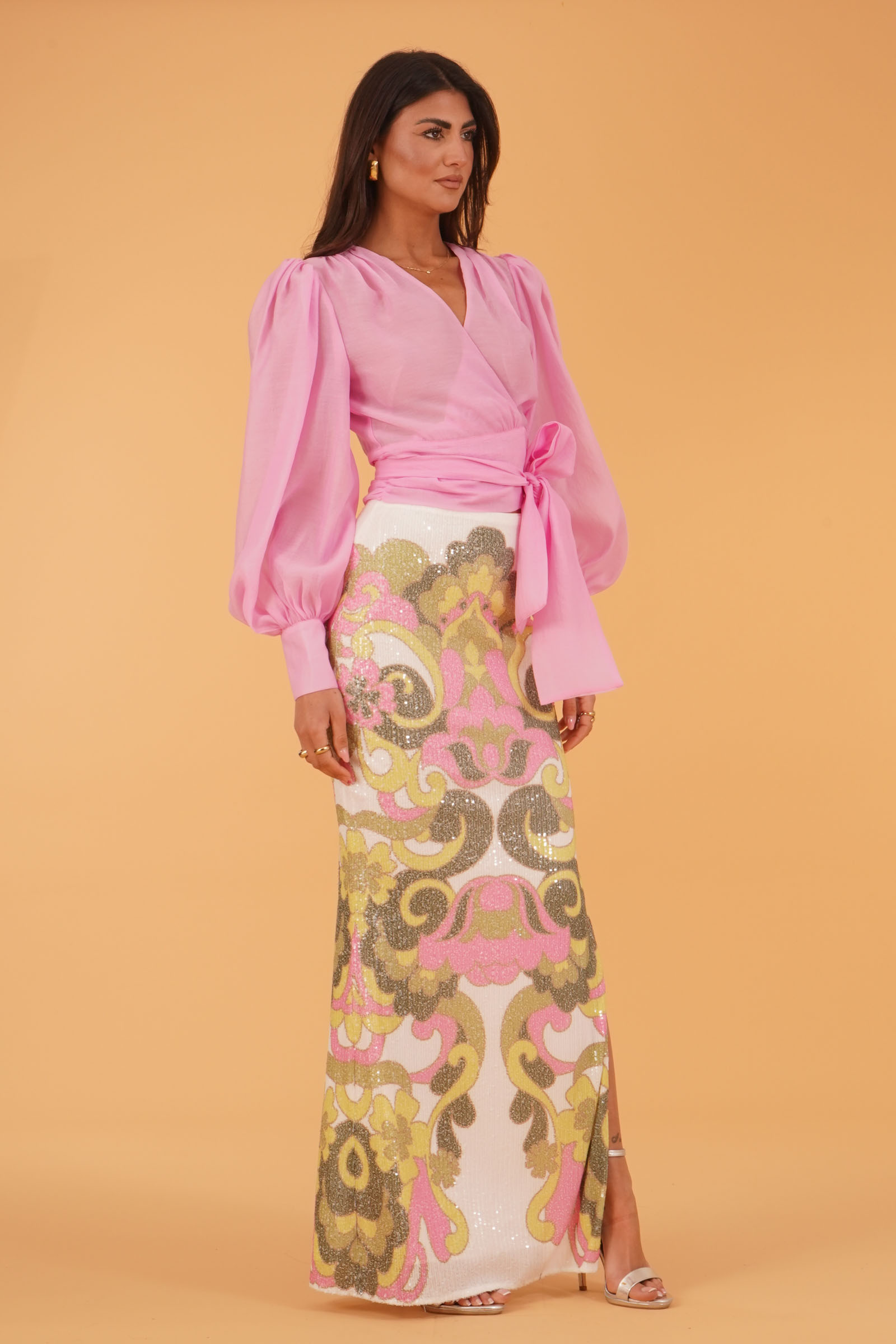 Vestibilita' regolare. Chiusura a portafoglio. maniche ampie a sbuffo. Scollo a V. Altezza modella 1,80. Nella foto indossa la taglia 40. Composizione: 100% Poliestere. Brand: Twins Fantasy