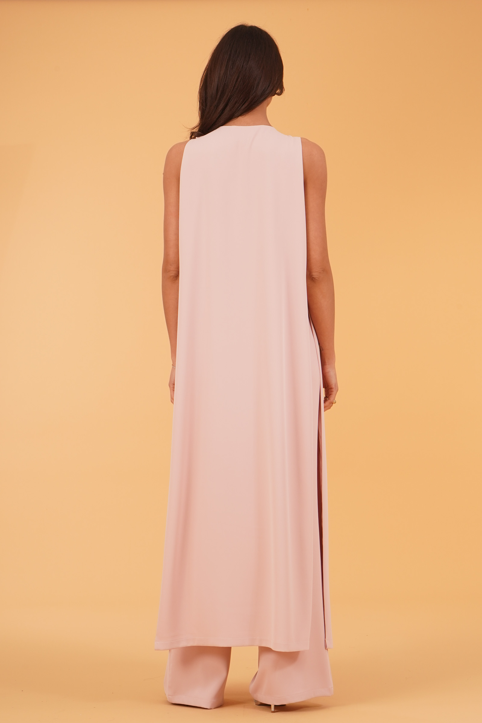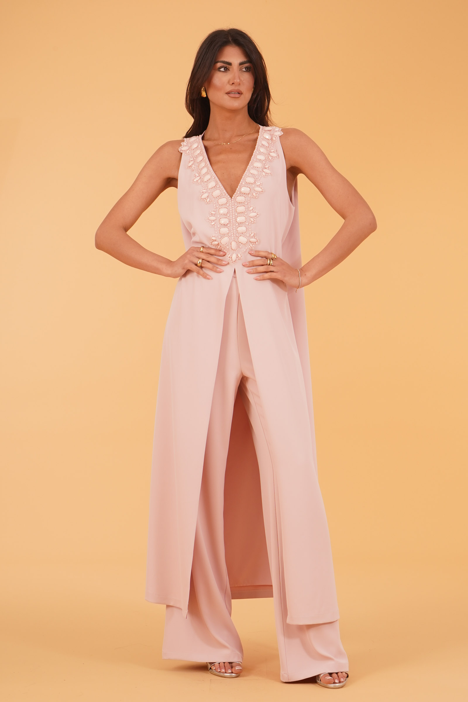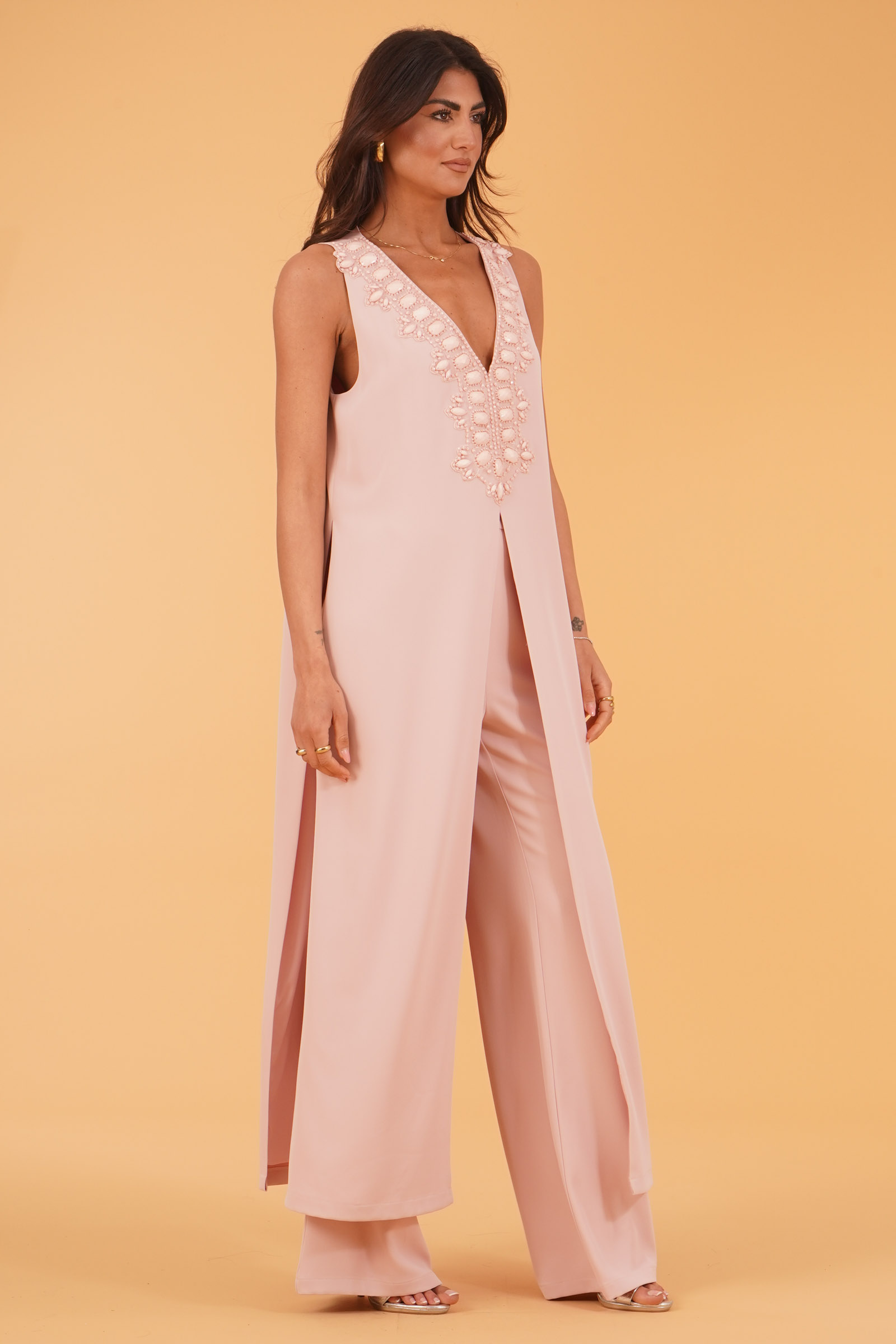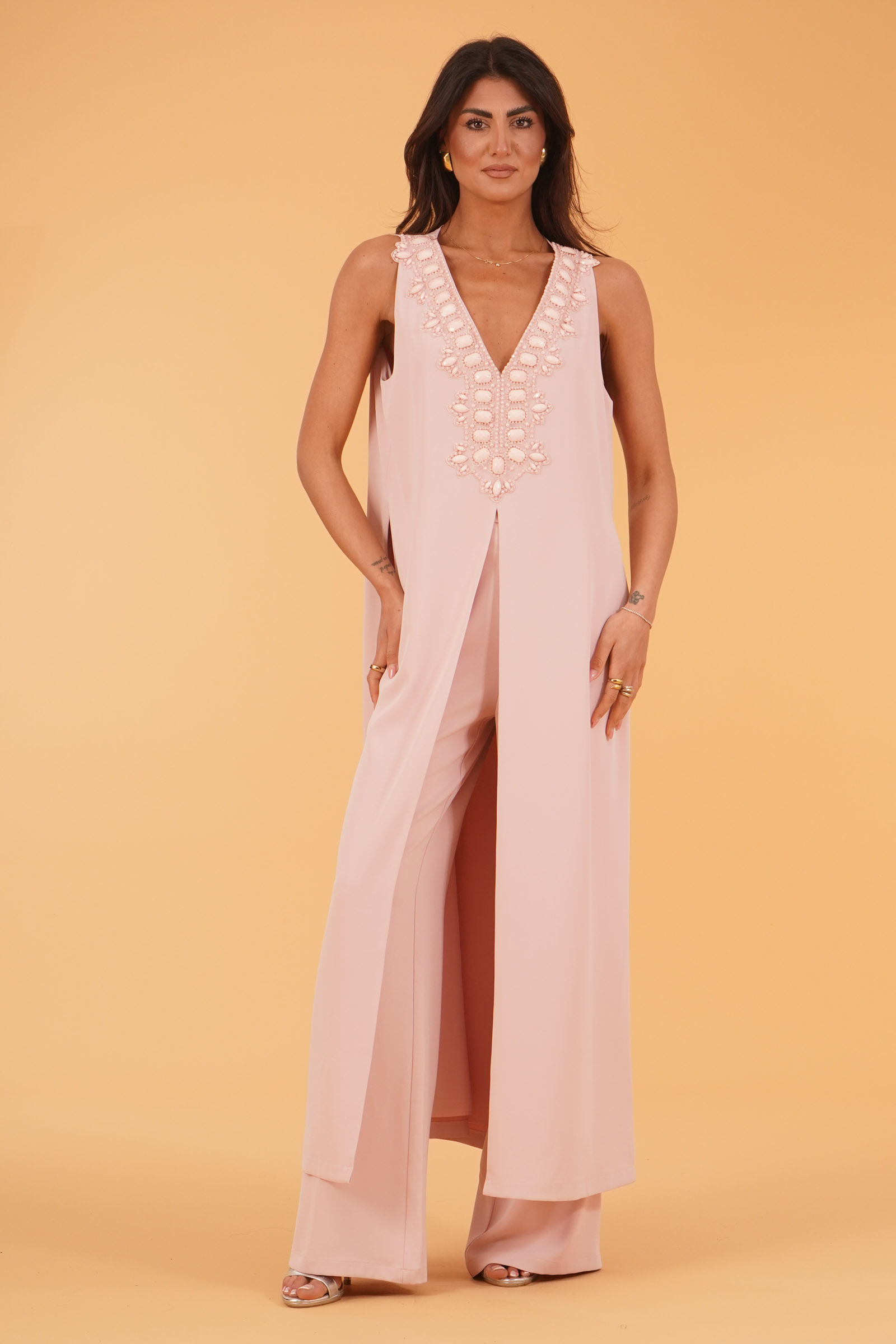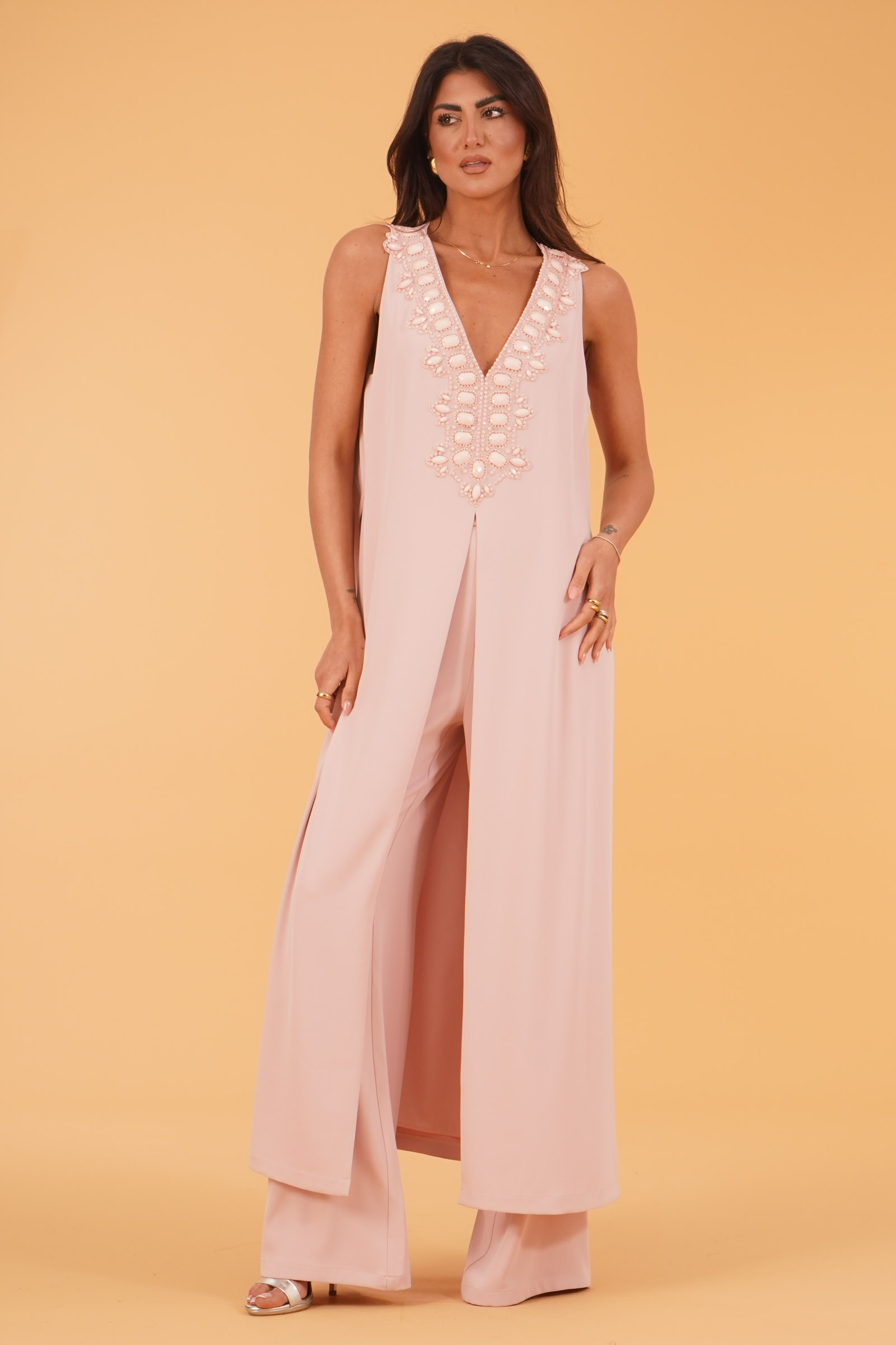 Vestibilita' regolare. Composto da tunica lunga con spaccho anteriore e nei lati. Dettagli di ricami gioiello. Pantaone vita alta a palazzo con chiusura con zip invisibile posteriore. Altezza modella 1,80. indossa la taglia 42. Coposizione: 100% Poliestere. Brand: Twins Fantasy