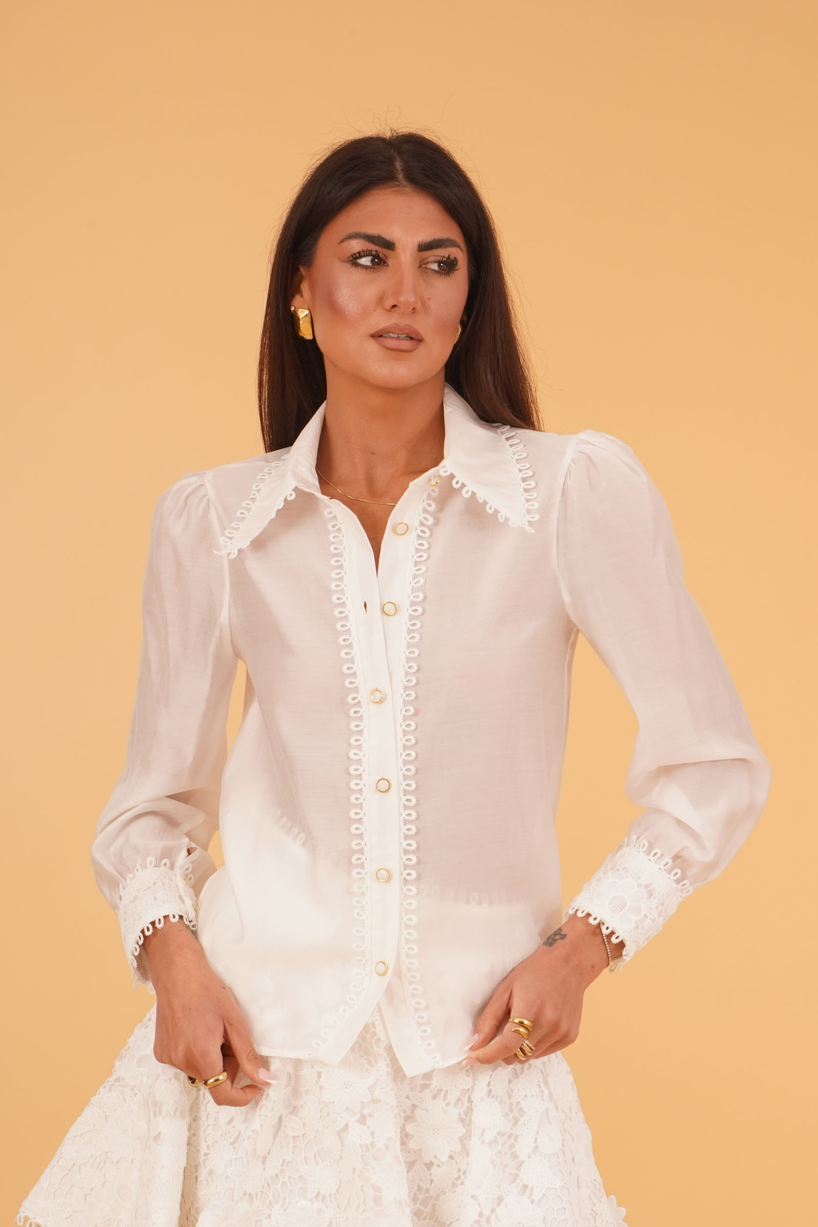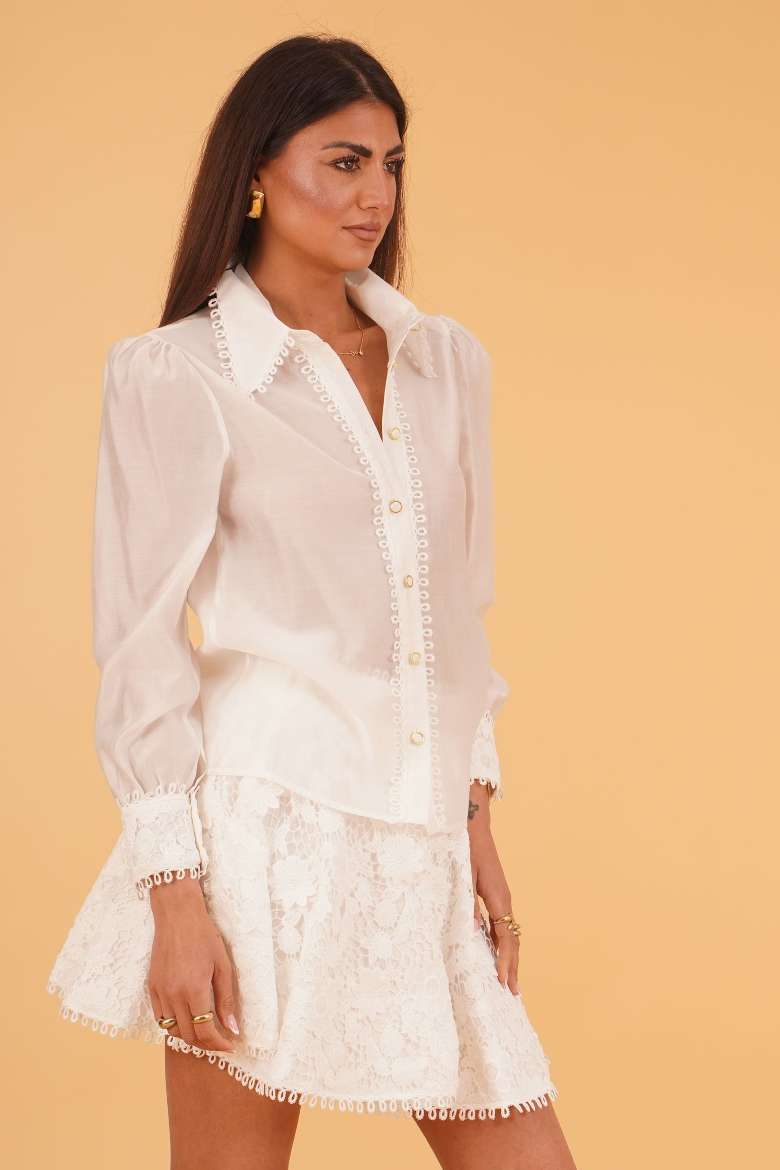 Vestibilita' regolare. Chiusura con bottoni. Maniche a sbuffo. con profili di pizzo macrame' sulla paramontura centrale e sulle maniche. Altezza modella 1,80. Nella foto indossa la taglia S. Composizione: 85% Tencel, 15% Poliestere. Brand: U R INK