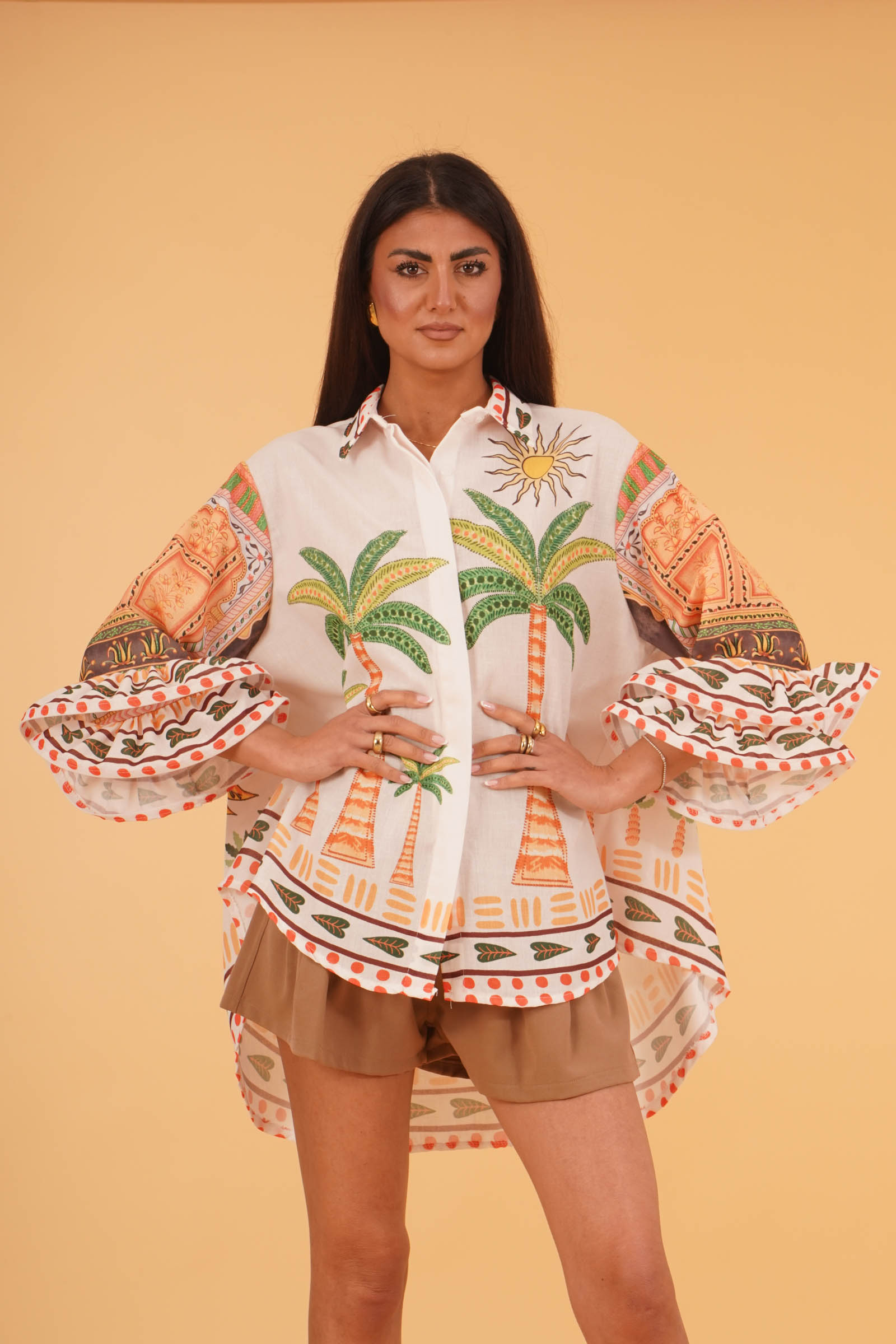 Vestibilita' comoda. Chiusura con bottoni. Maniche con particolari balze. Altezza modella 1,80. Indossa taglia XS. Composizione: 80% Cotone, 20% Poliestere. Brand: U R INK